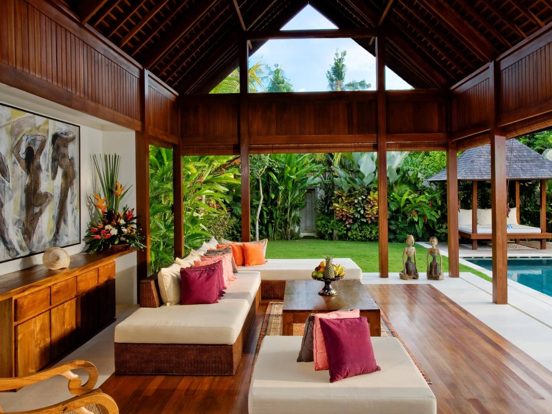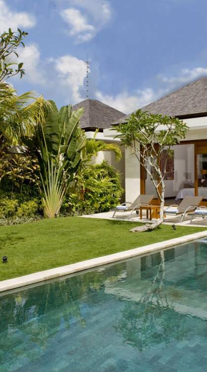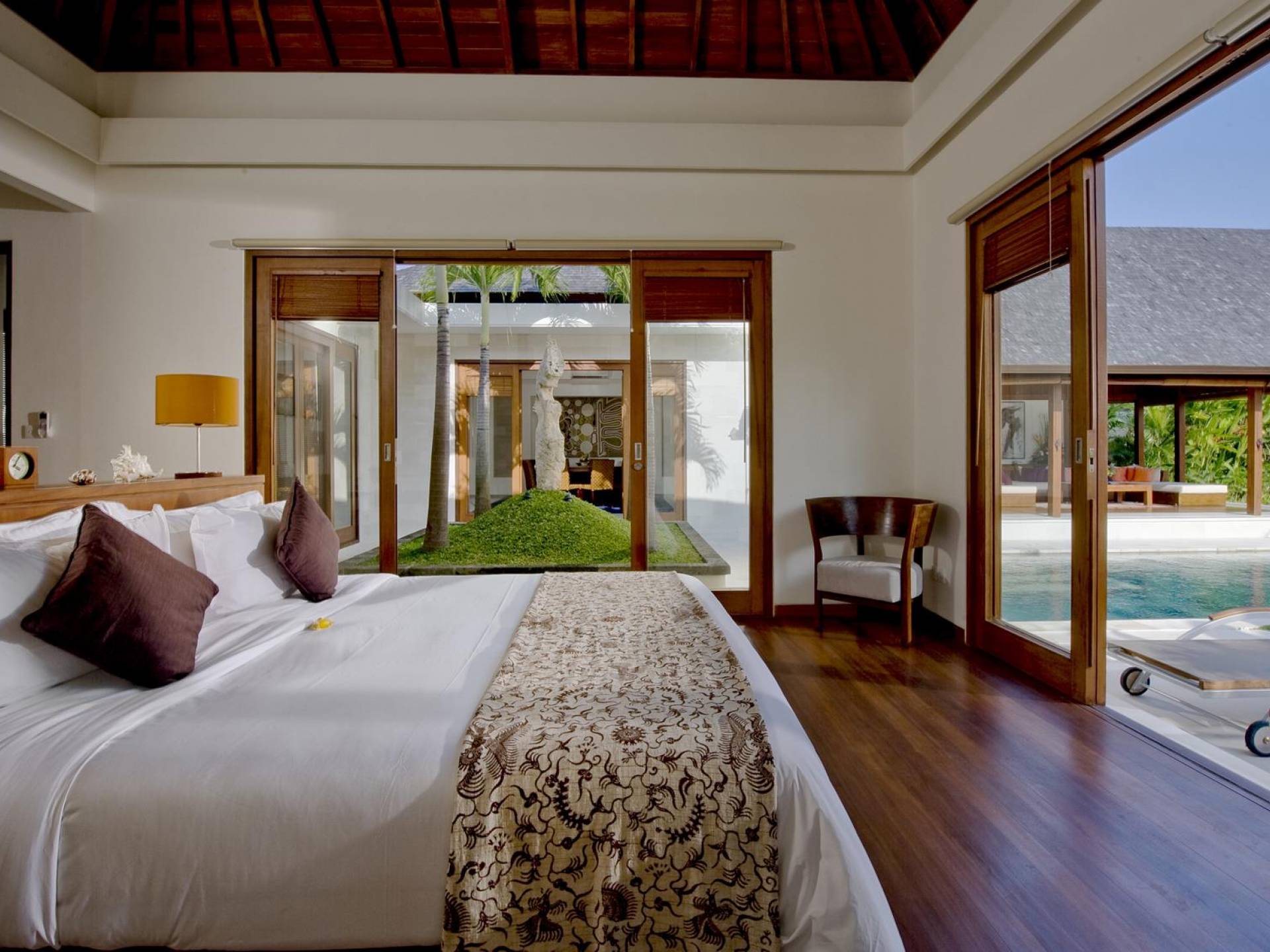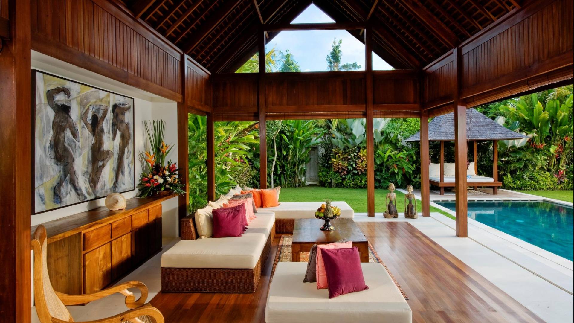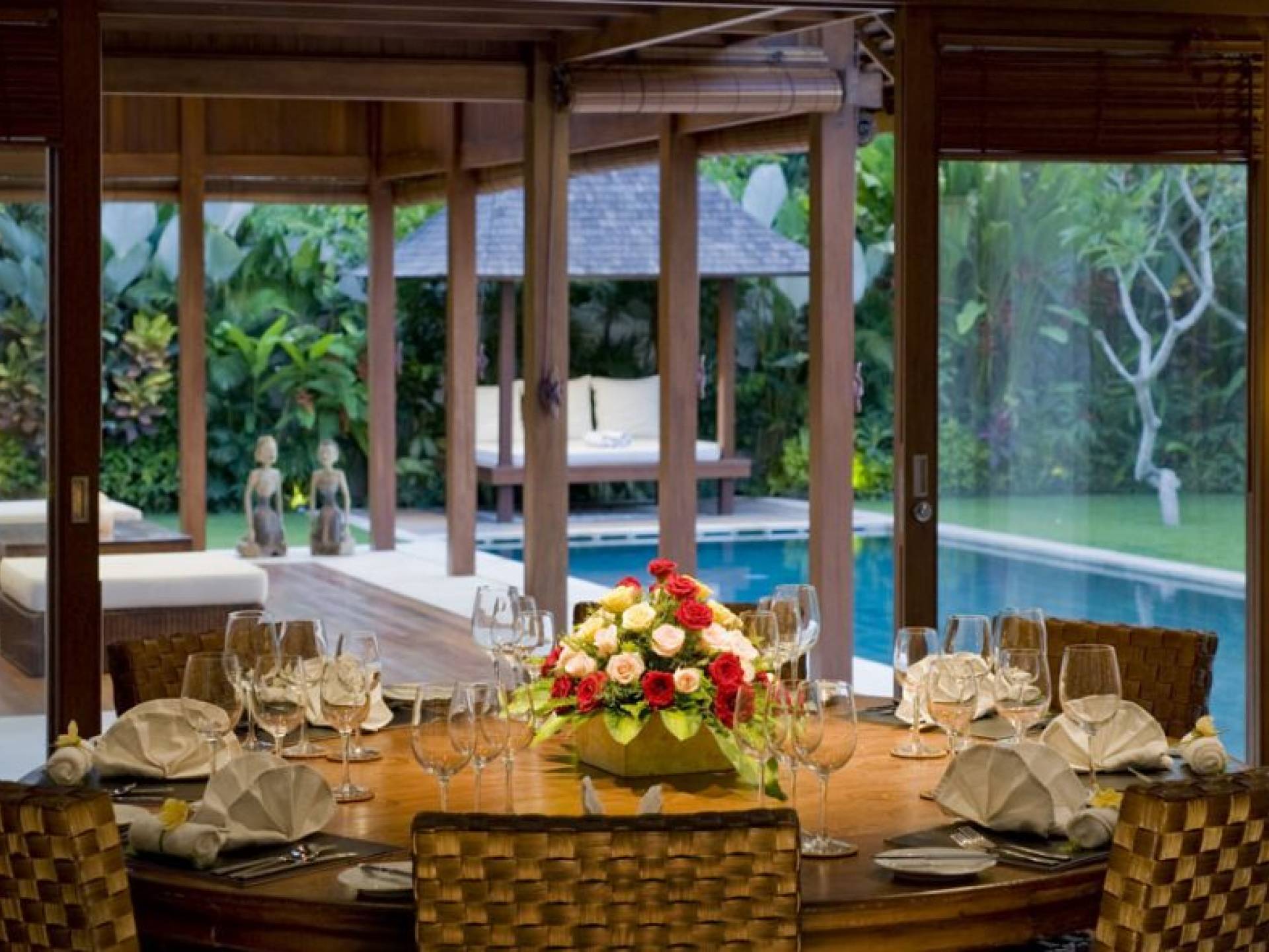 A large, sliding wall panel separates Bima from the other master villa, Yudhistira. Guests who book both villas can request the staff to open the wall panel to provide a huge garden area with two swimming pools – ideal for family groups requiring four bedrooms and plenty of space for the children to have fun. This open set-up also lends itself to weddings and birthday parties.