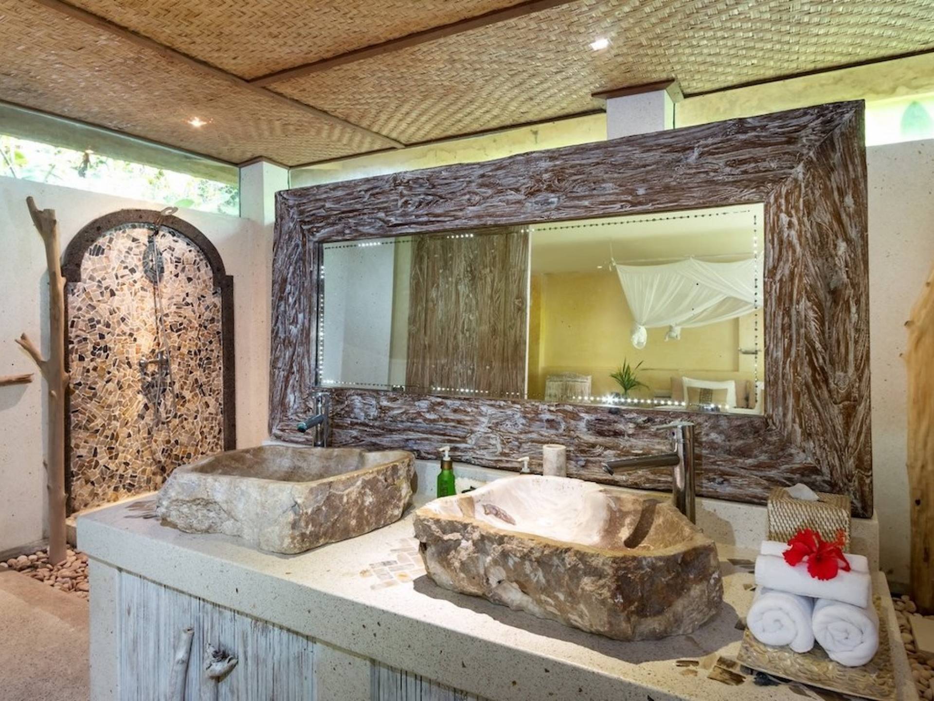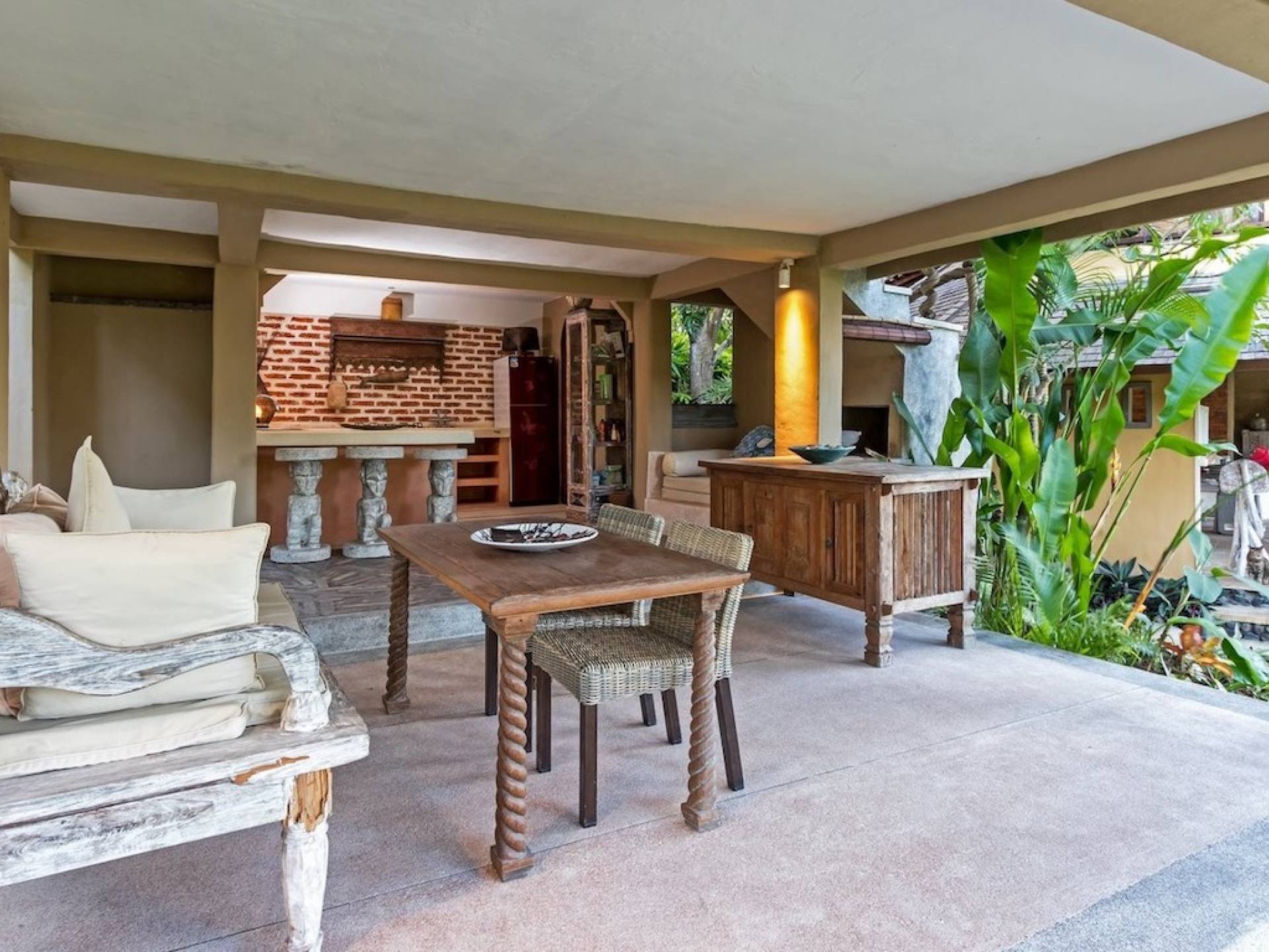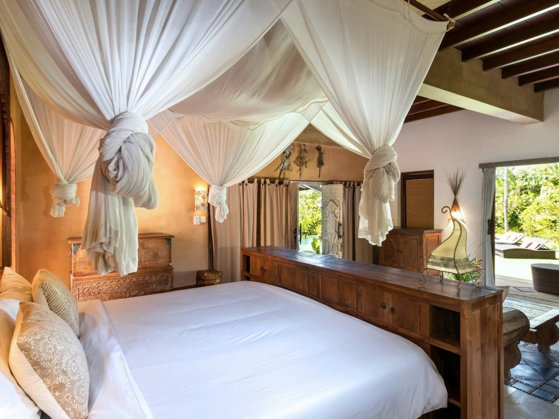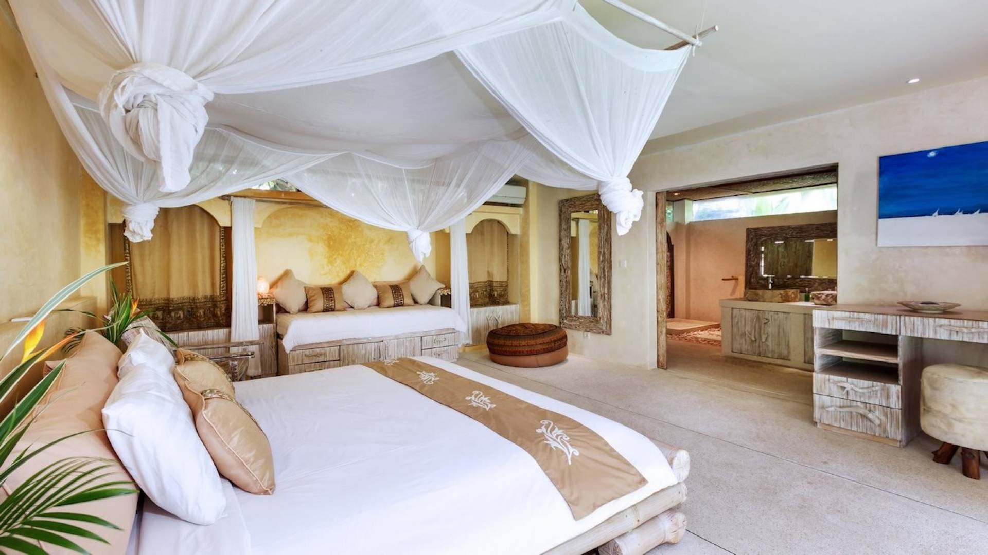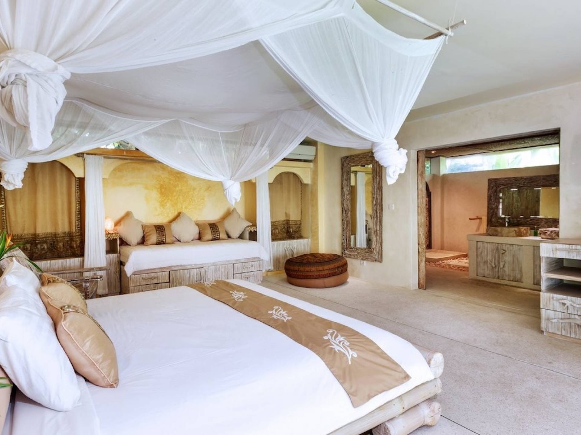 For those seeking shade, chill out in the garden bale or take your pick between sofas, hanging chairs, and armchairs in the tropical-styled, rustic, open-plan living pavilions. With two fully equipped living rooms, each with a sitting and dining area as well as a well-appointed kitchen, there is an abundance of space to hang out together with friends and family and yet there are also plenty of places to enjoy some solitude, peace, and quiet. You can dine indoors or out and why not get a chef cook in to prepare you a delicious meal or that BBQ feast you’ve been craving for?