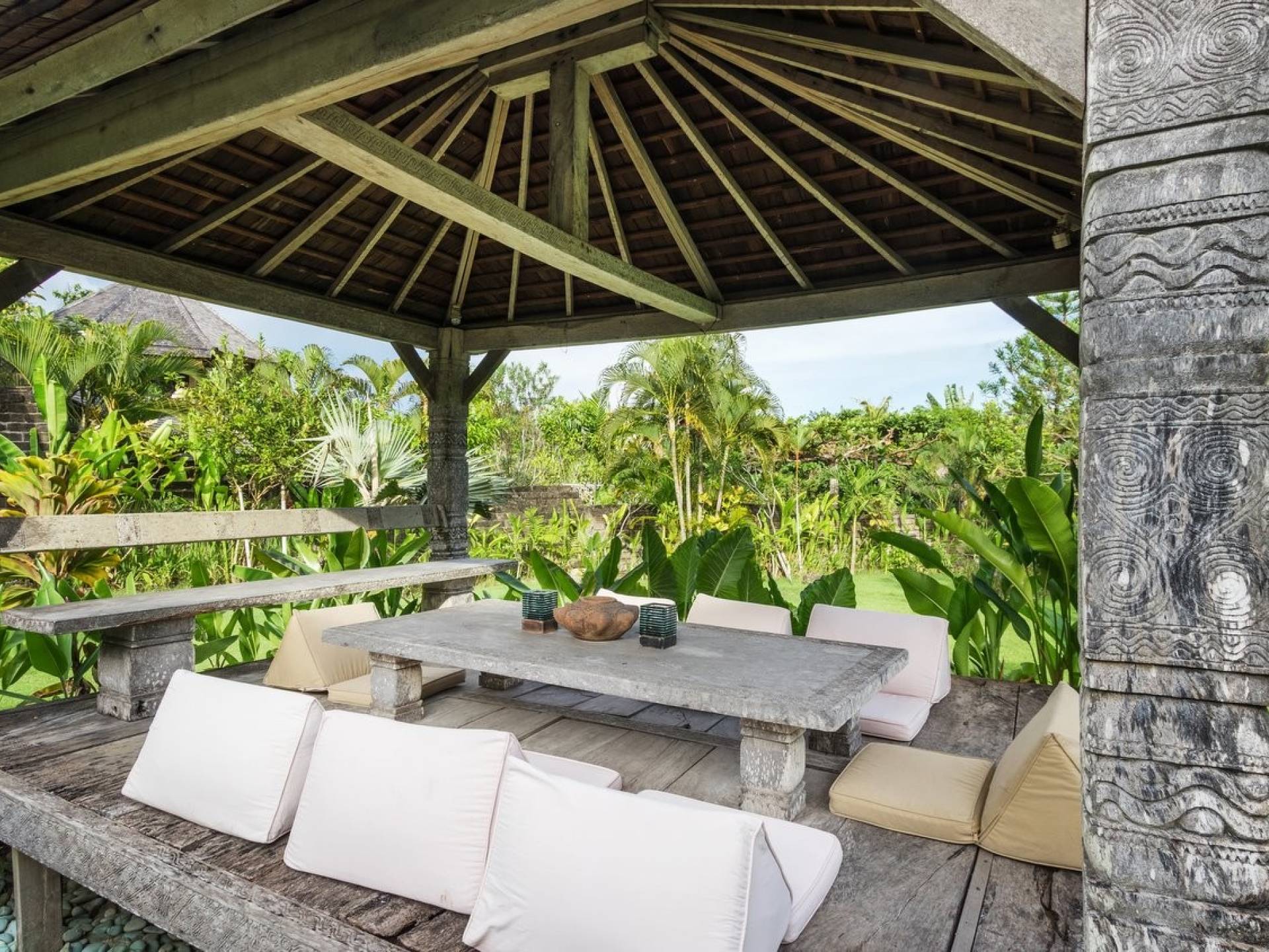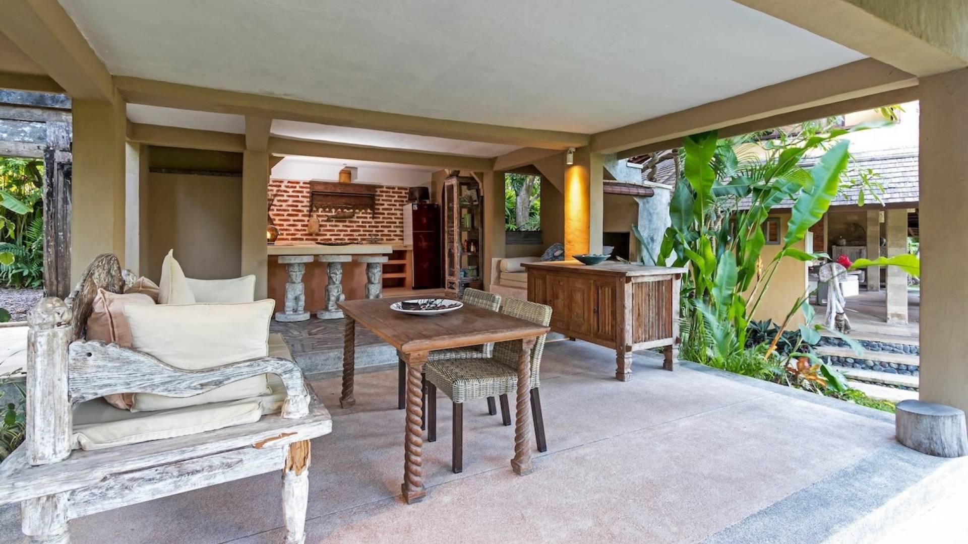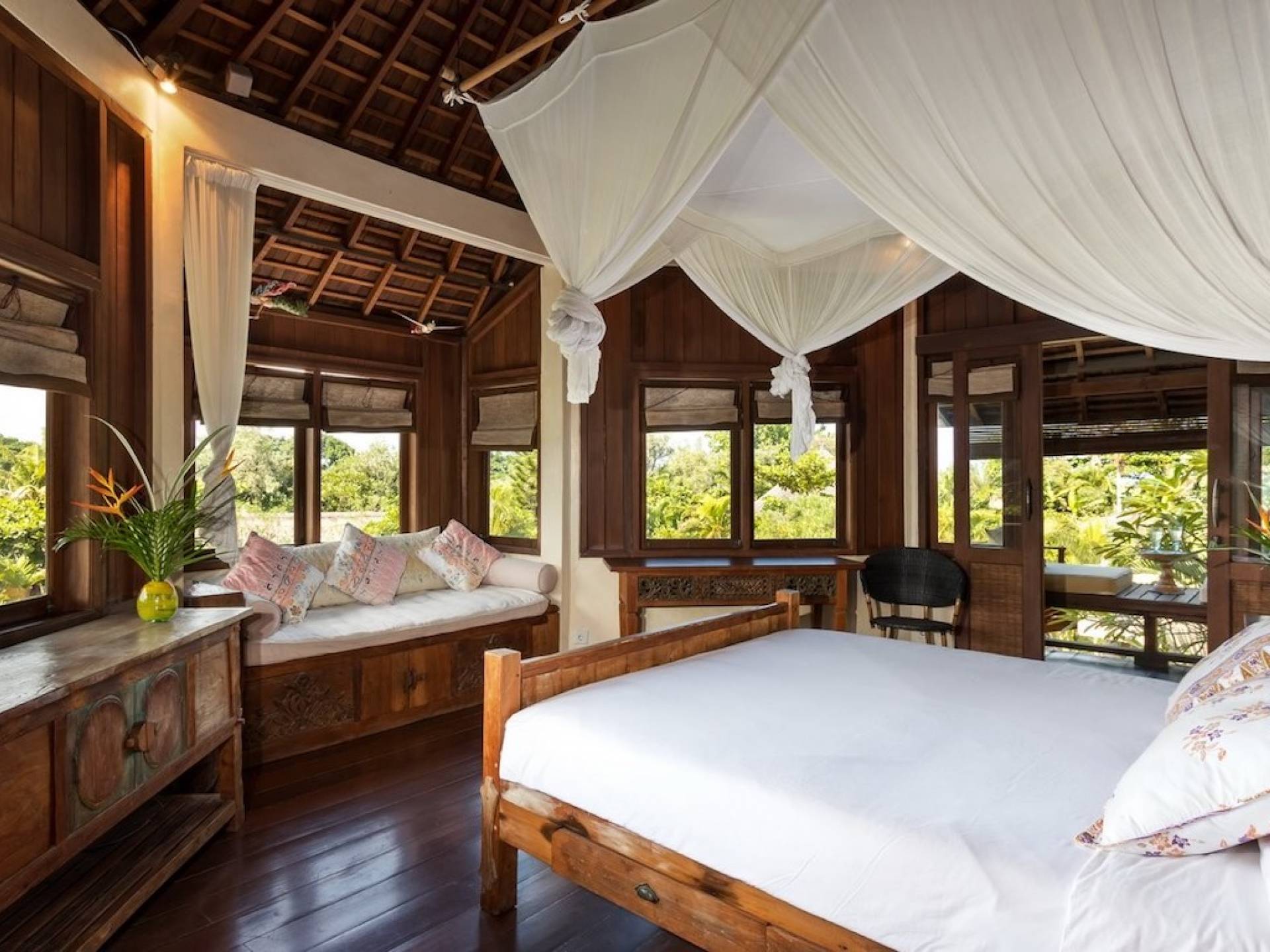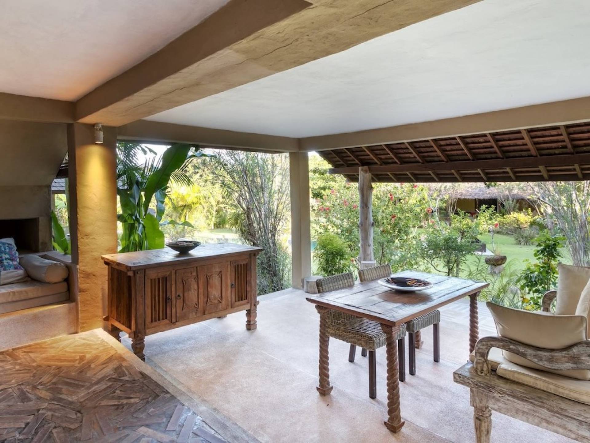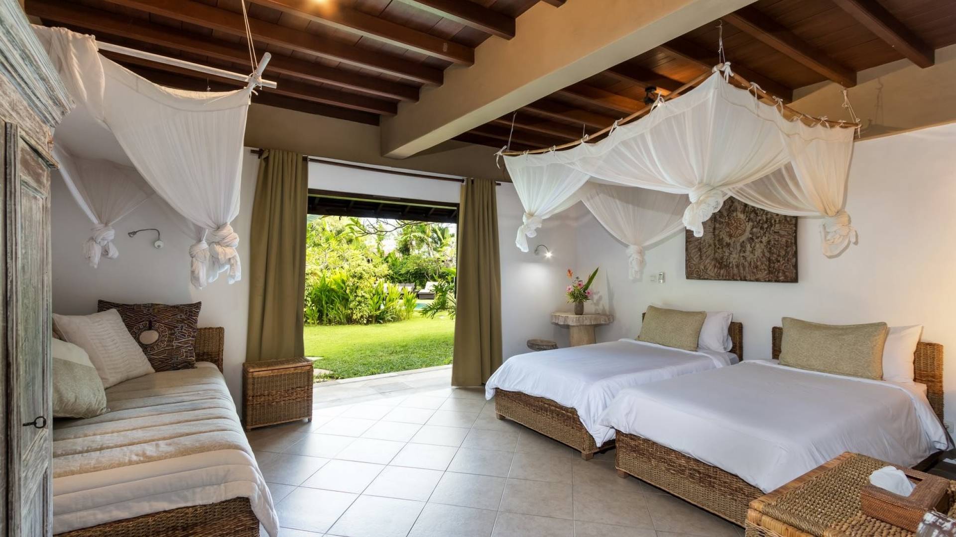 For those seeking shade, chill out in the garden bale or take your pick between sofas, hanging chairs, and armchairs in the tropical-styled, rustic, open-plan living pavilions. With two fully equipped living rooms, each with a sitting and dining area as well as a well-appointed kitchen, there is an abundance of space to hang out together with friends and family and yet there are also plenty of places to enjoy some solitude, peace, and quiet. You can dine indoors or out and why not get a chef cook in to prepare you a delicious meal or that BBQ feast you’ve been craving for?