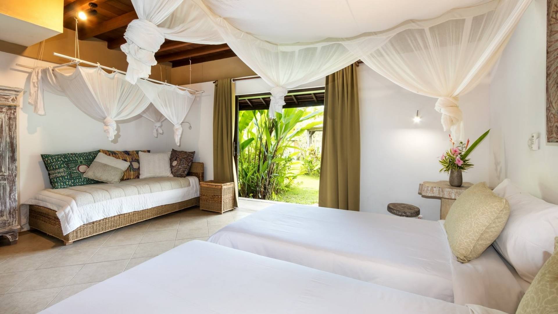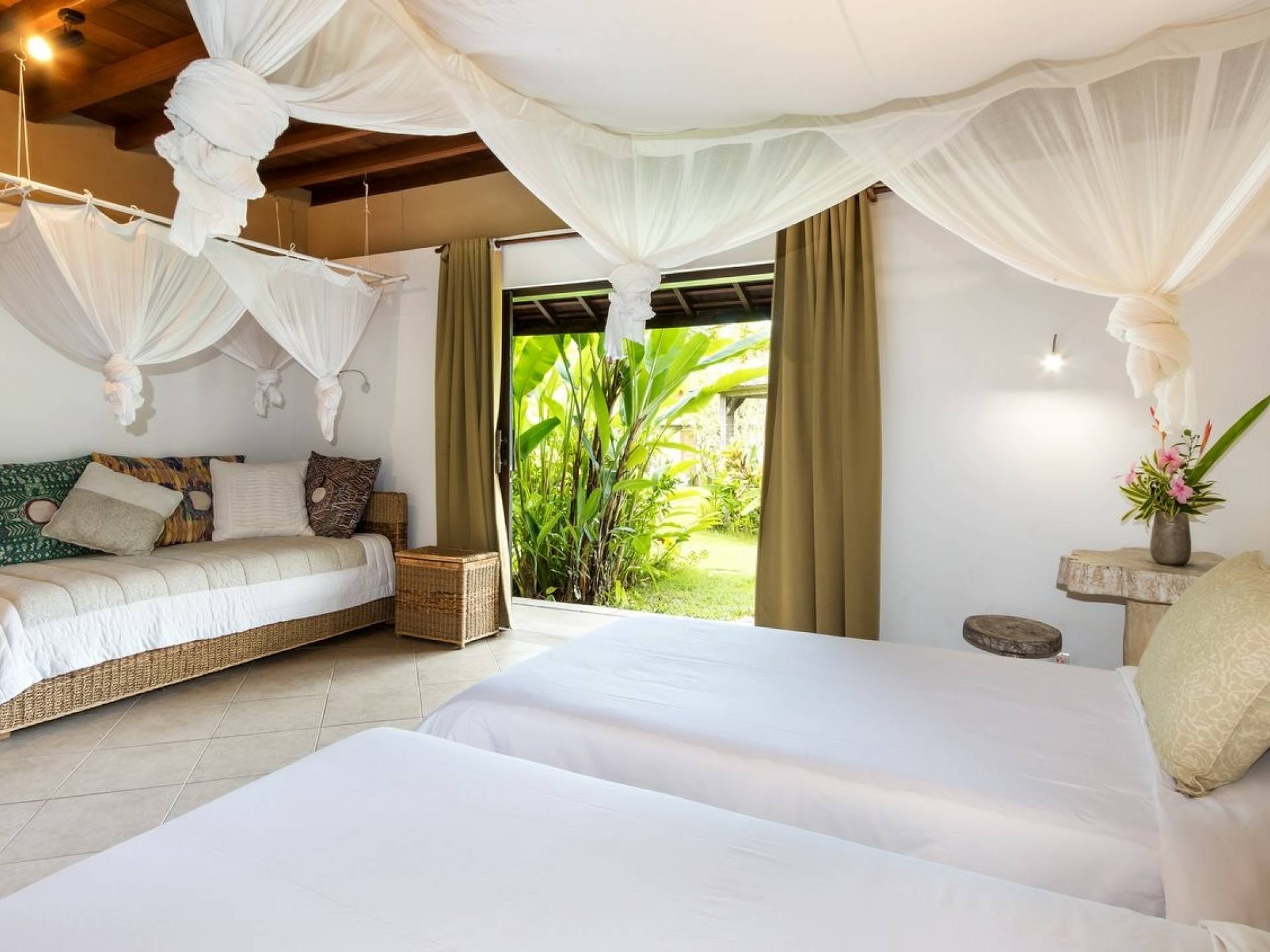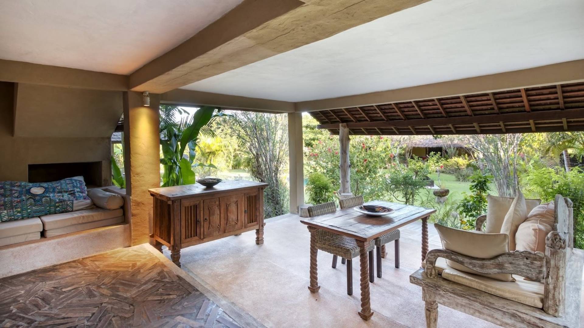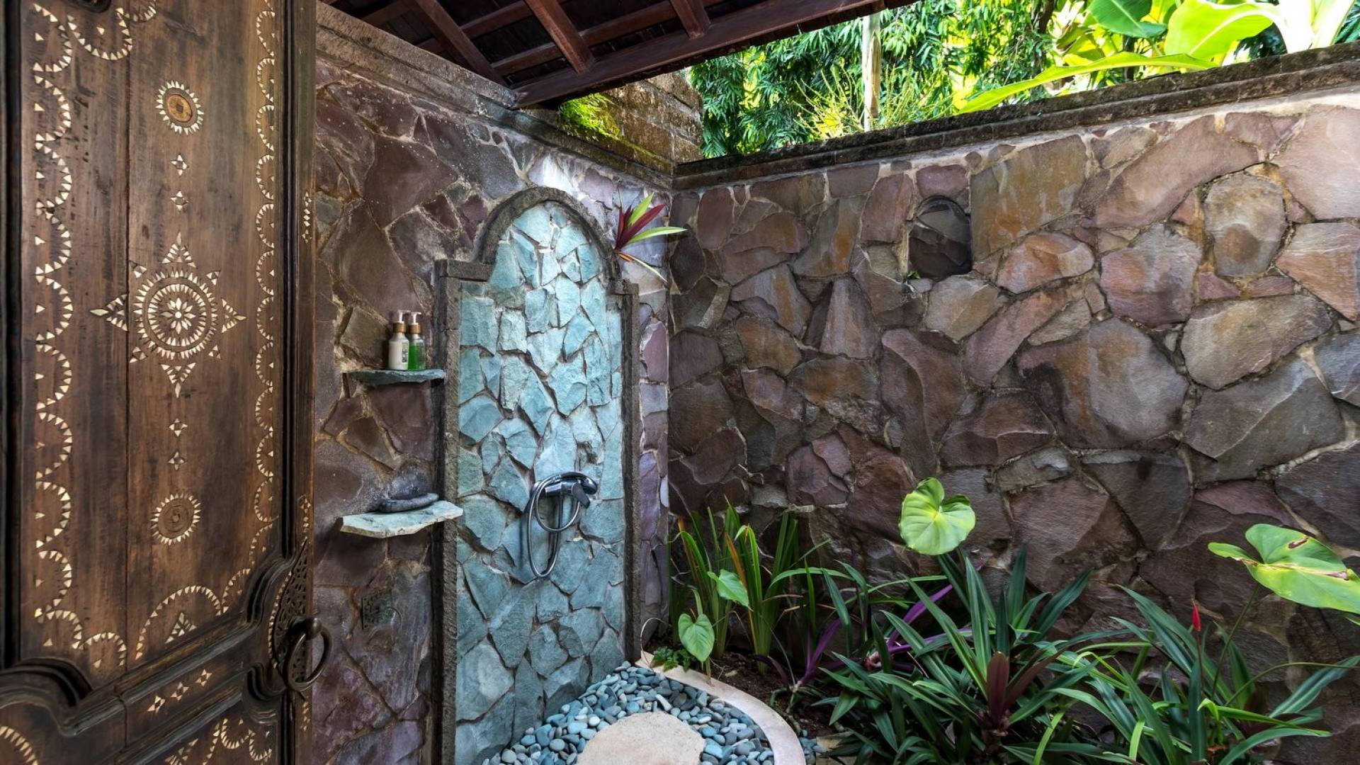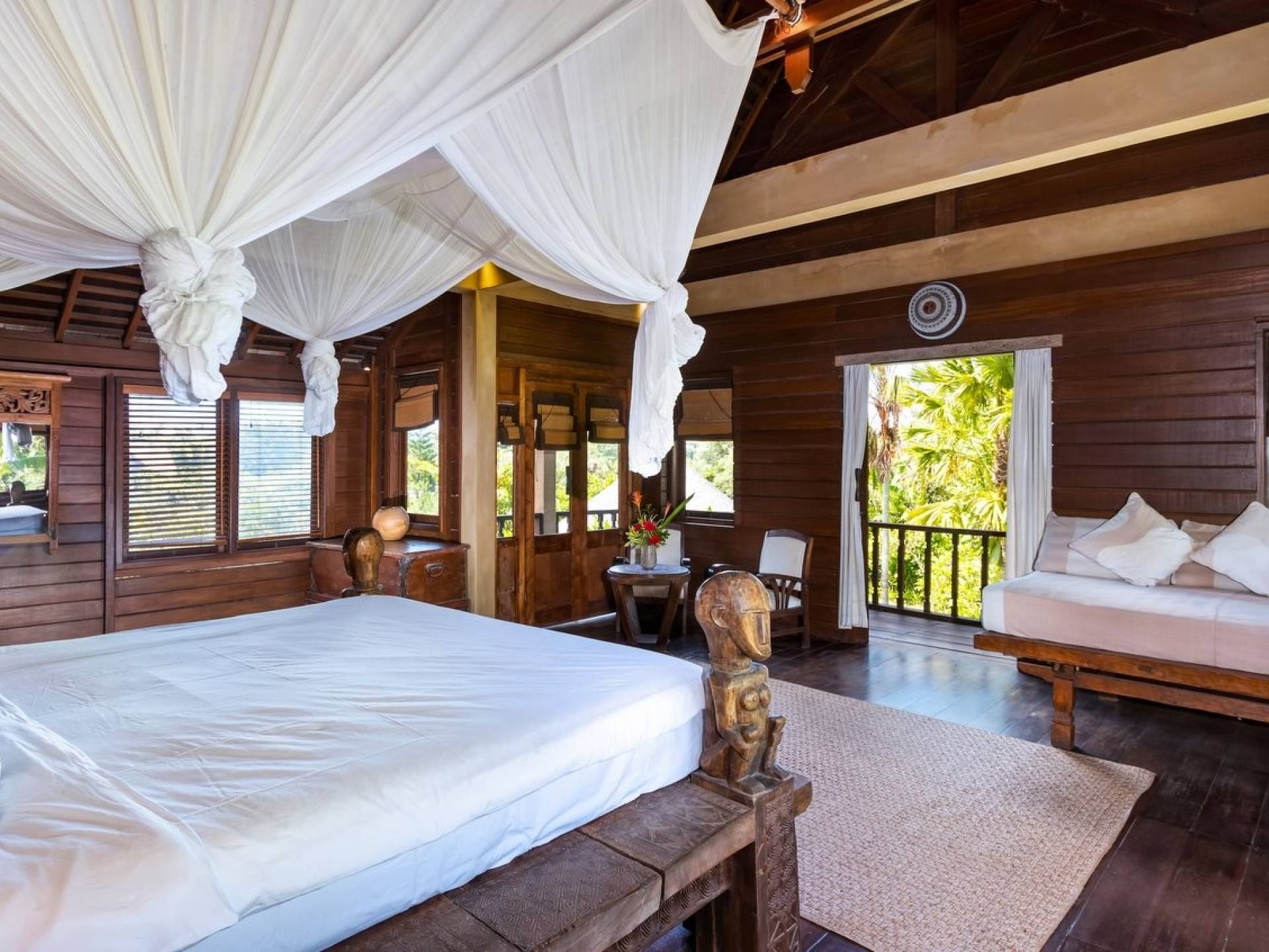 For those seeking shade, chill out in the garden bale or take your pick between sofas, hanging chairs, and armchairs in the tropical-styled, rustic, open-plan living pavilions. With two fully equipped living rooms, each with a sitting and dining area as well as a well-appointed kitchen, there is an abundance of space to hang out together with friends and family and yet there are also plenty of places to enjoy some solitude, peace, and quiet. You can dine indoors or out and why not get a chef cook in to prepare you a delicious meal or that BBQ feast you’ve been craving for?