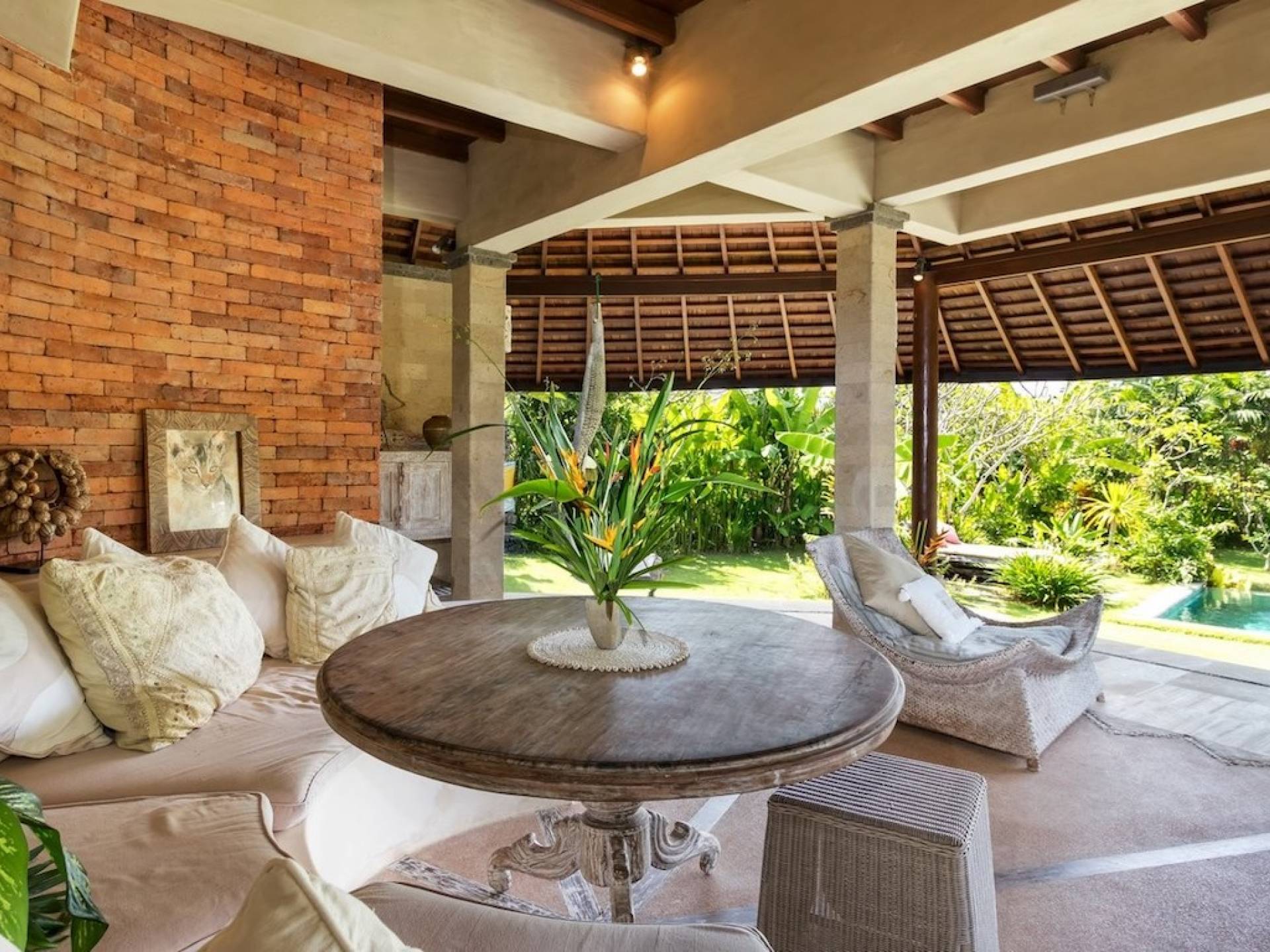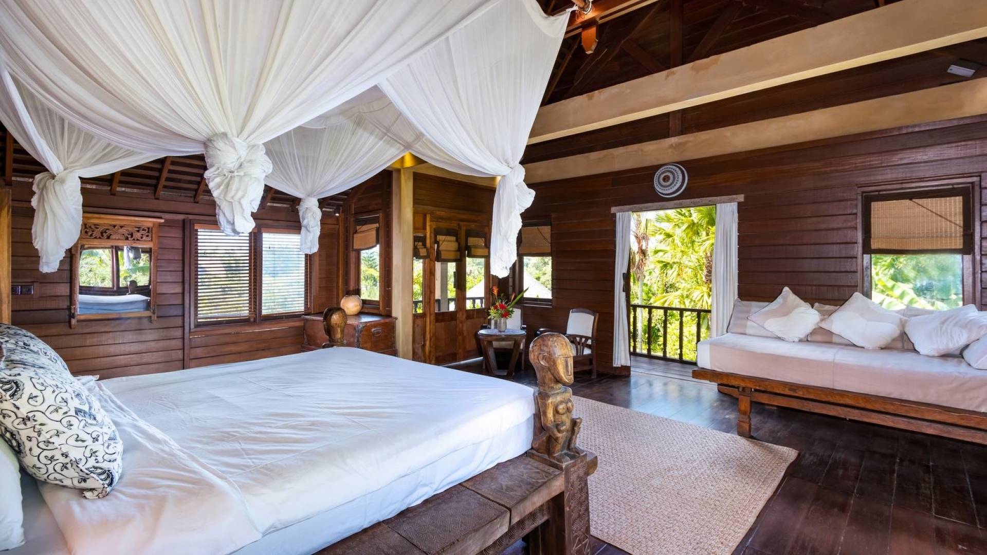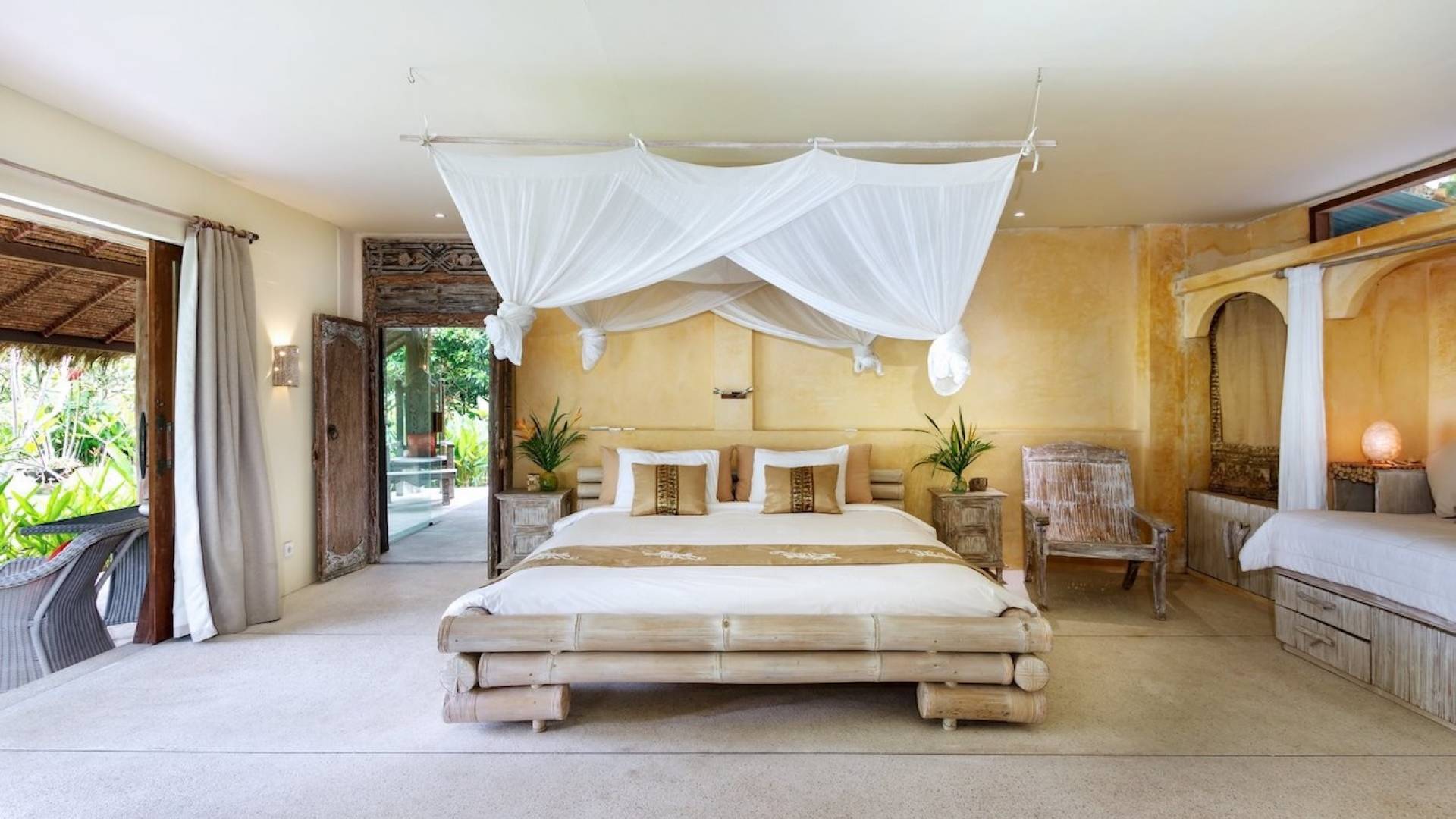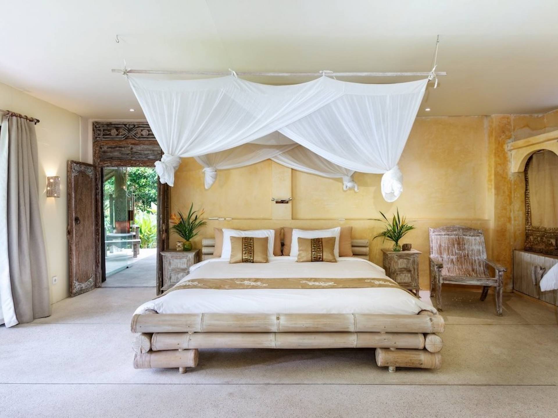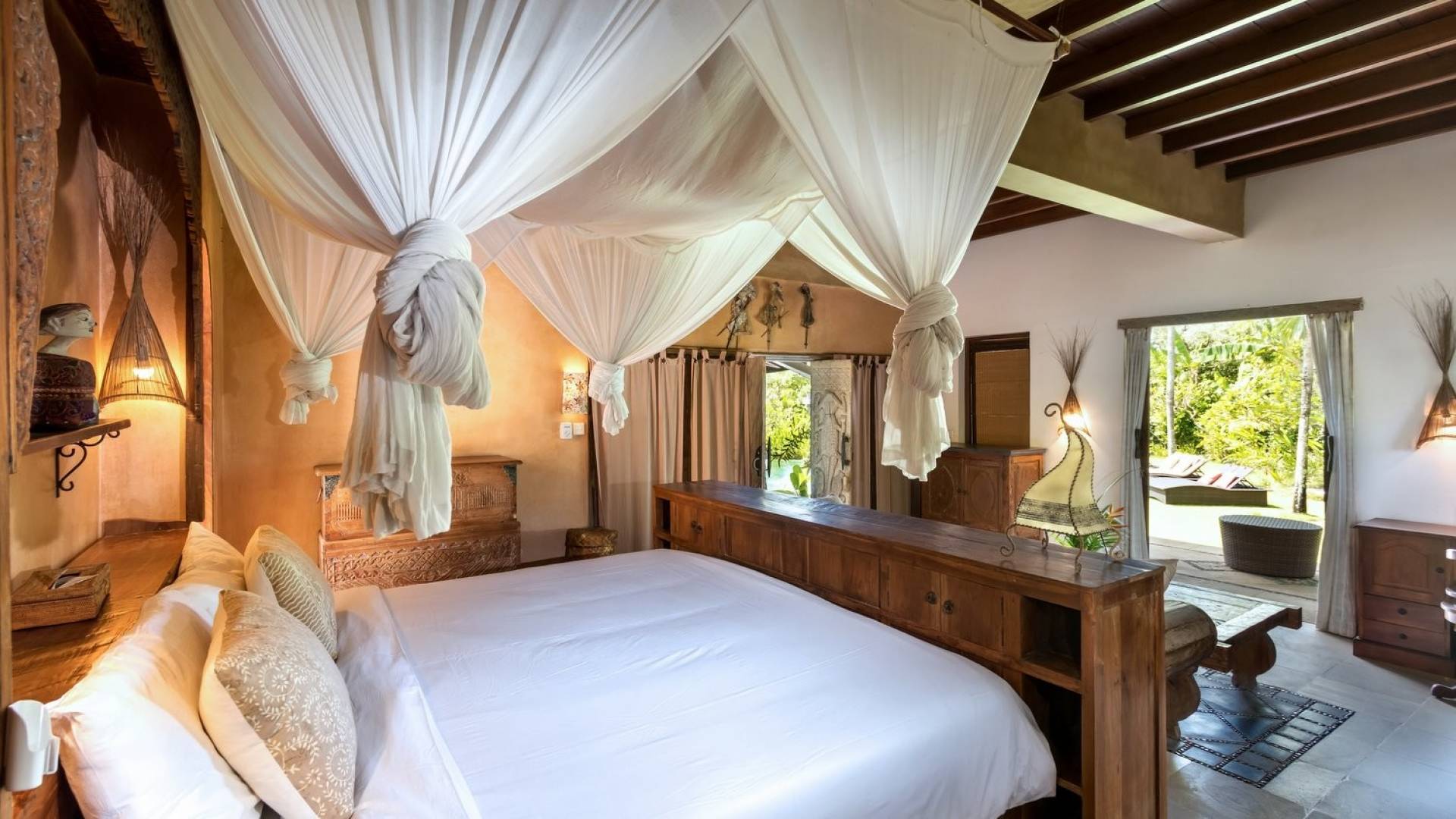 For those seeking shade, chill out in the garden bale or take your pick between sofas, hanging chairs, and armchairs in the tropical-styled, rustic, open-plan living pavilions. With two fully equipped living rooms, each with a sitting and dining area as well as a well-appointed kitchen, there is an abundance of space to hang out together with friends and family and yet there are also plenty of places to enjoy some solitude, peace, and quiet. You can dine indoors or out and why not get a chef cook in to prepare you a delicious meal or that BBQ feast you’ve been craving for?