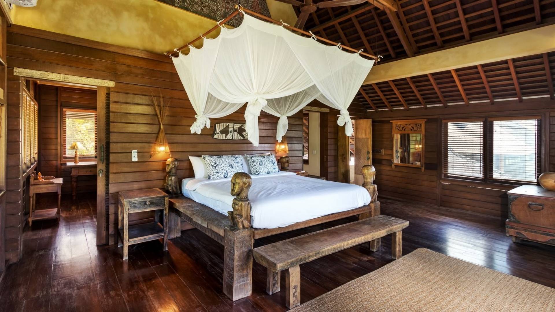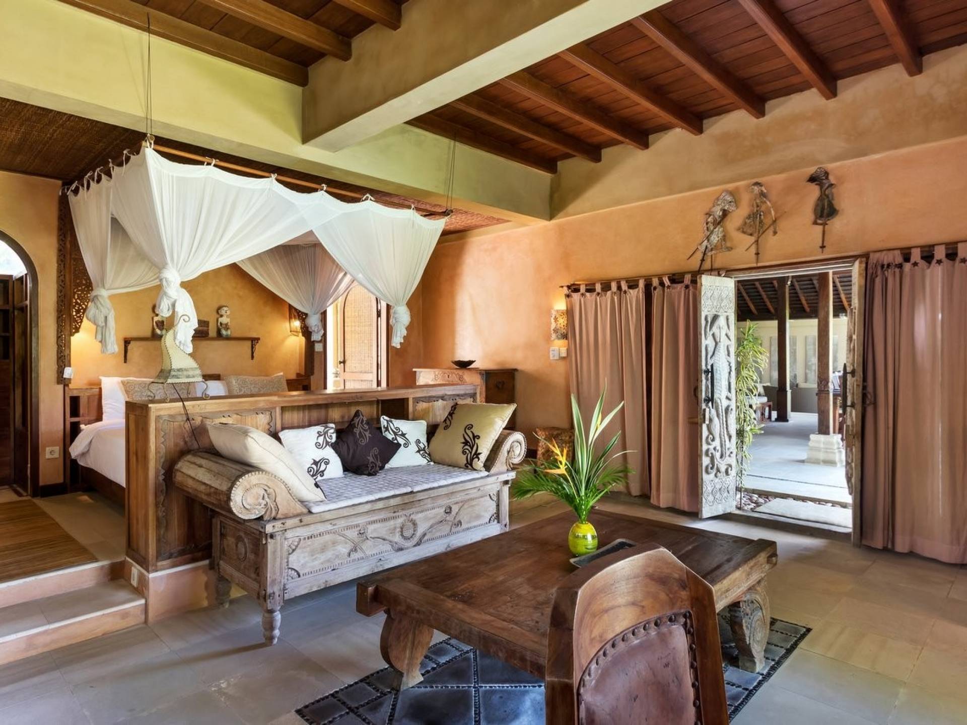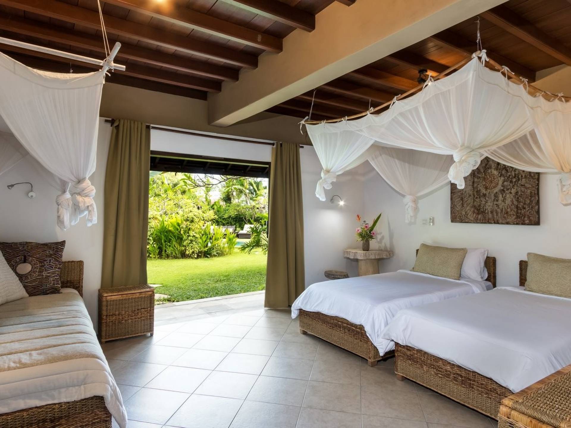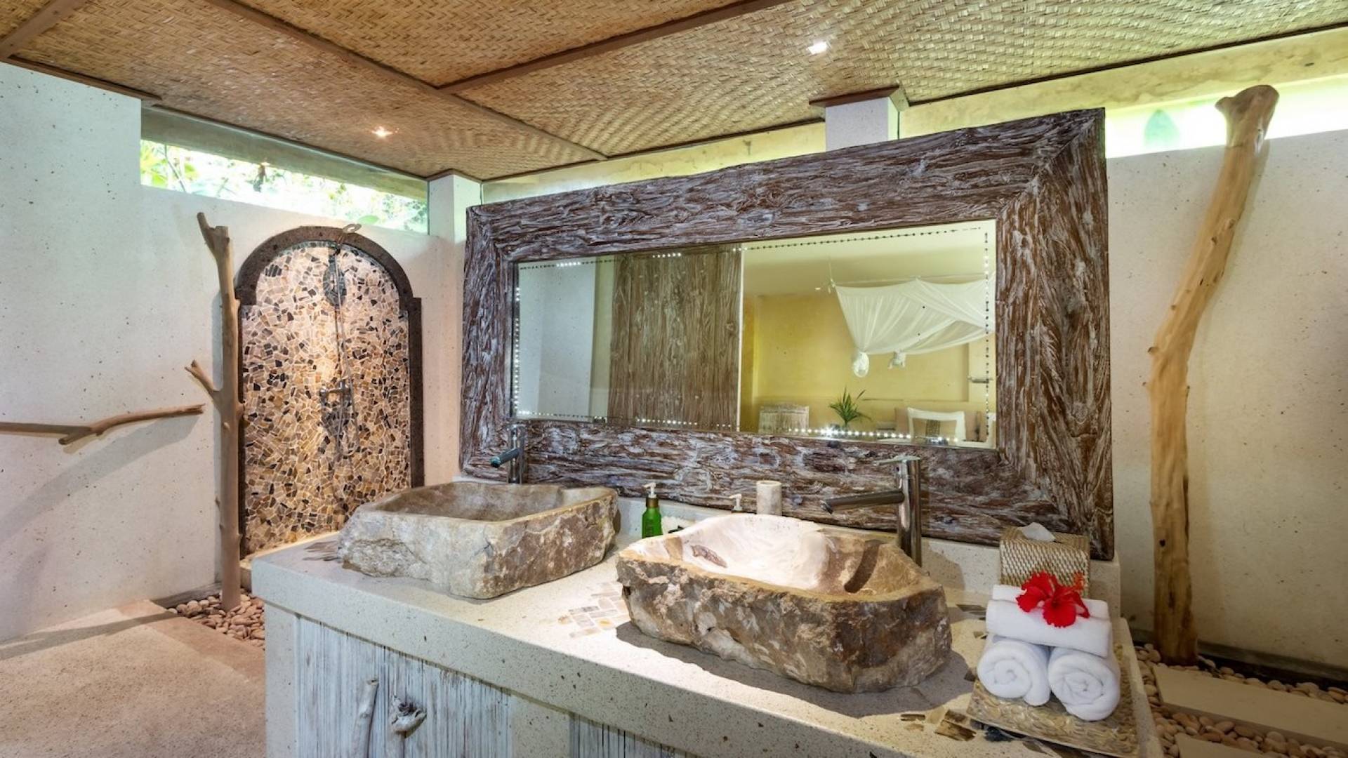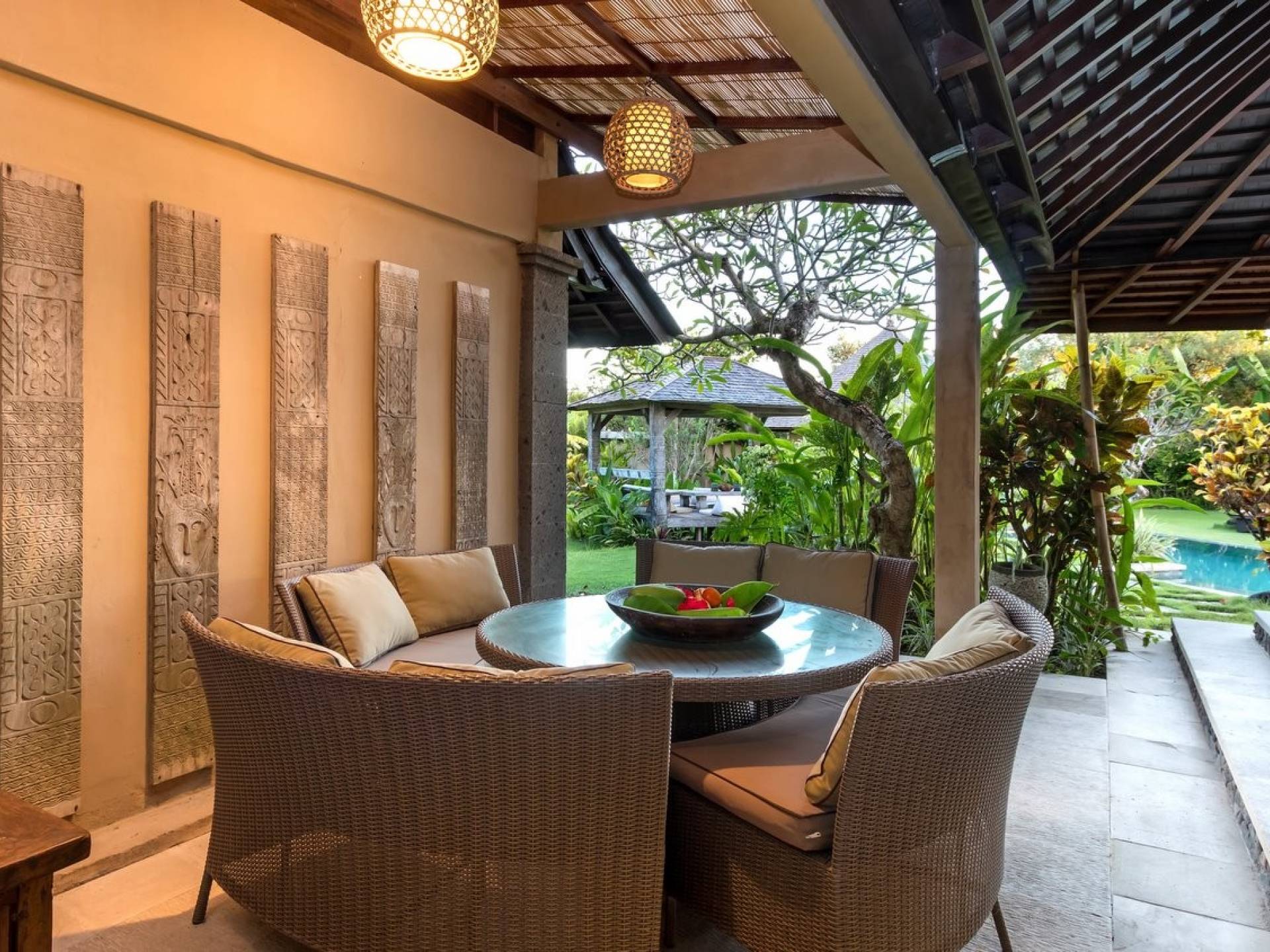 For those seeking shade, chill out in the garden bale or take your pick between sofas, hanging chairs, and armchairs in the tropical-styled, rustic, open-plan living pavilions. With two fully equipped living rooms, each with a sitting and dining area as well as a well-appointed kitchen, there is an abundance of space to hang out together with friends and family and yet there are also plenty of places to enjoy some solitude, peace, and quiet. You can dine indoors or out and why not get a chef cook in to prepare you a delicious meal or that BBQ feast you’ve been craving for?
