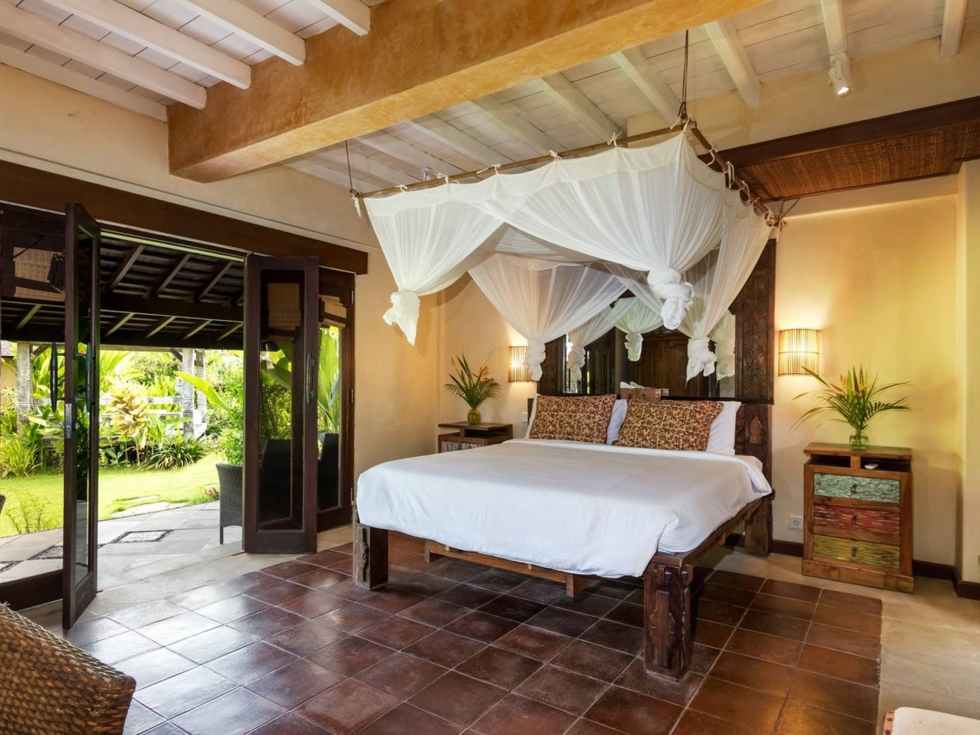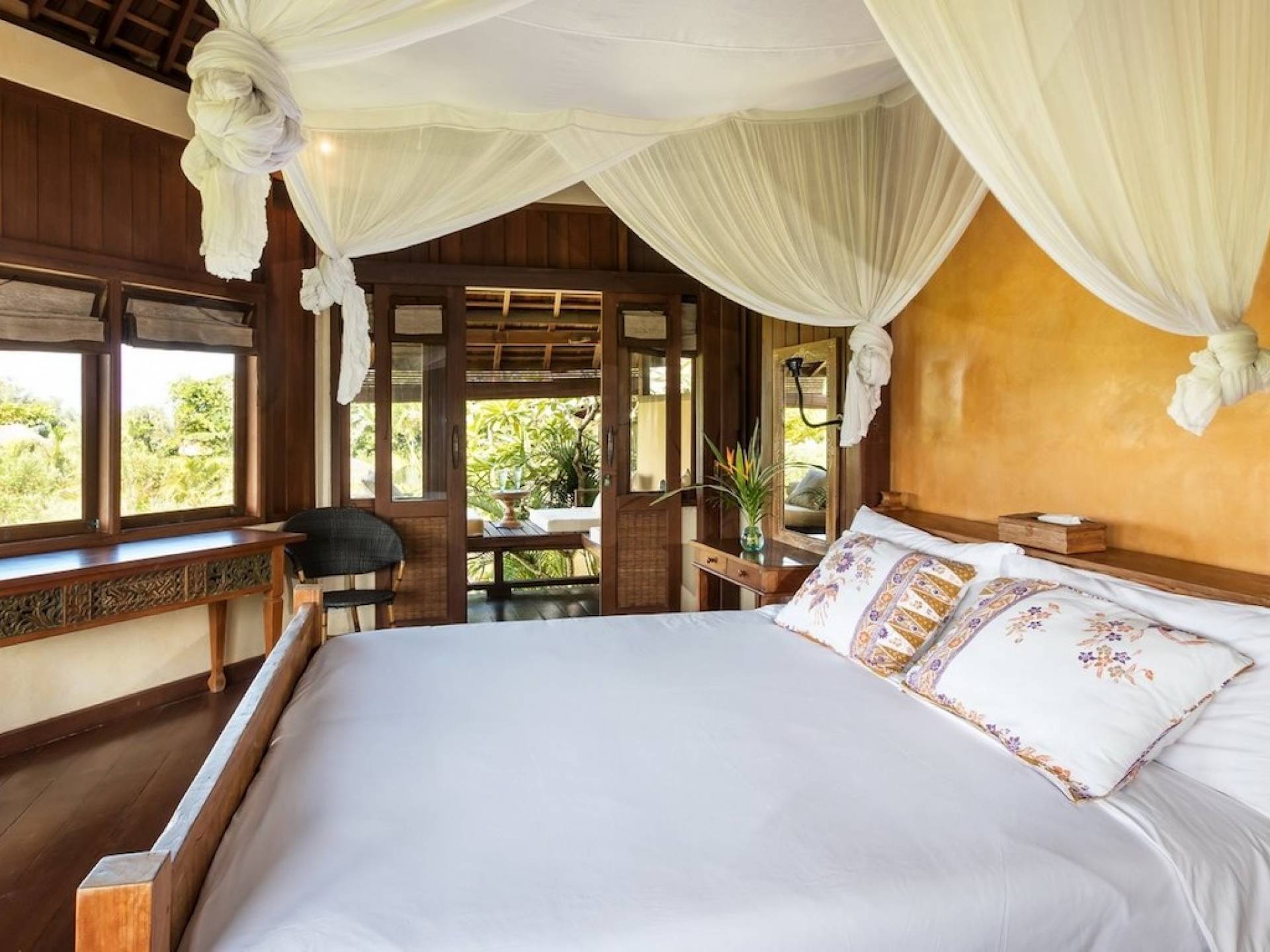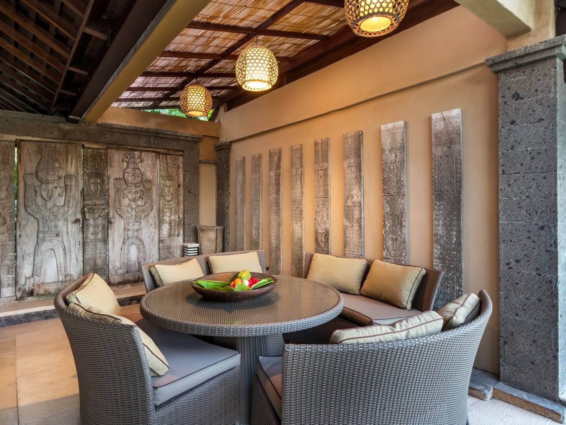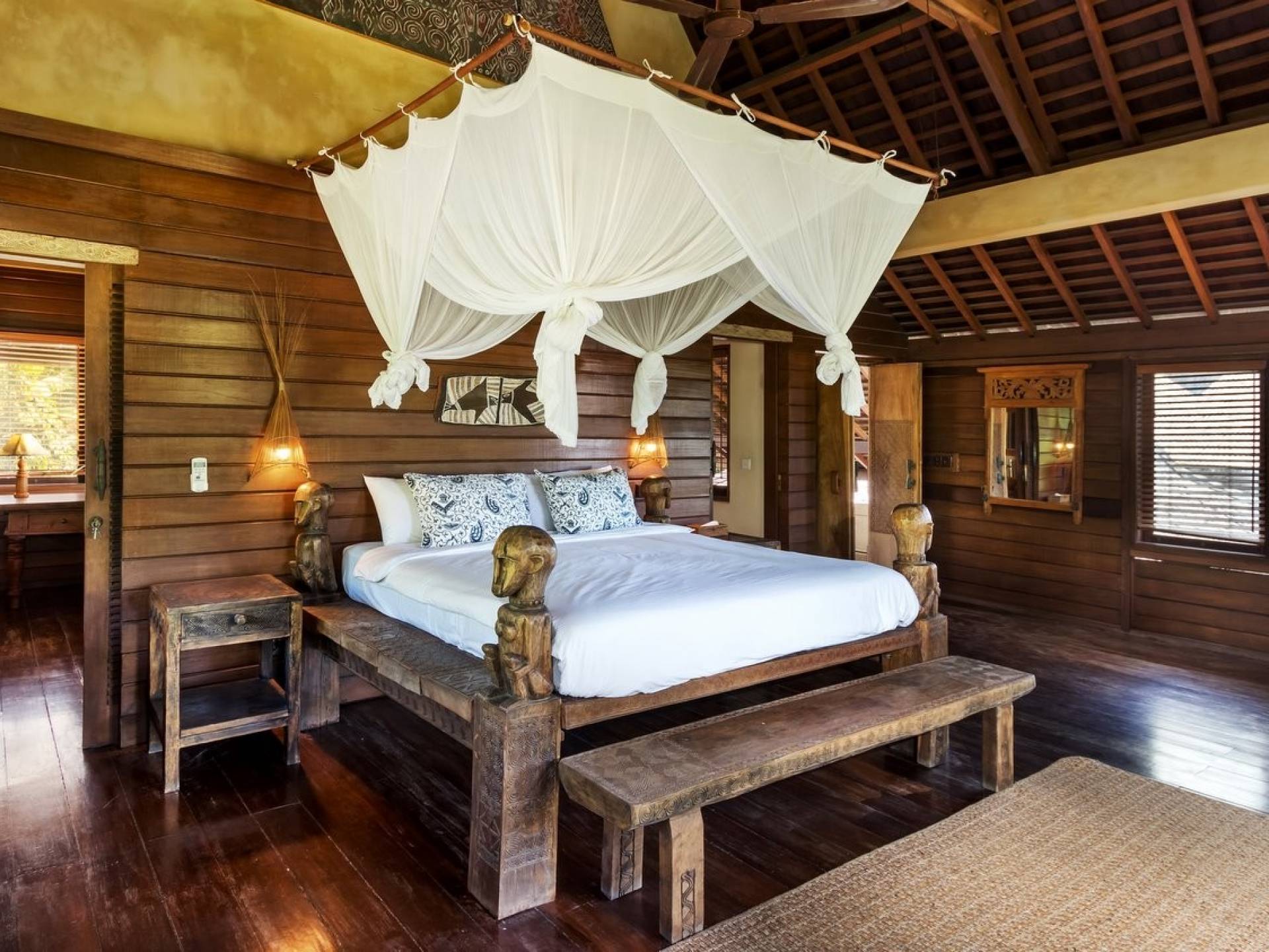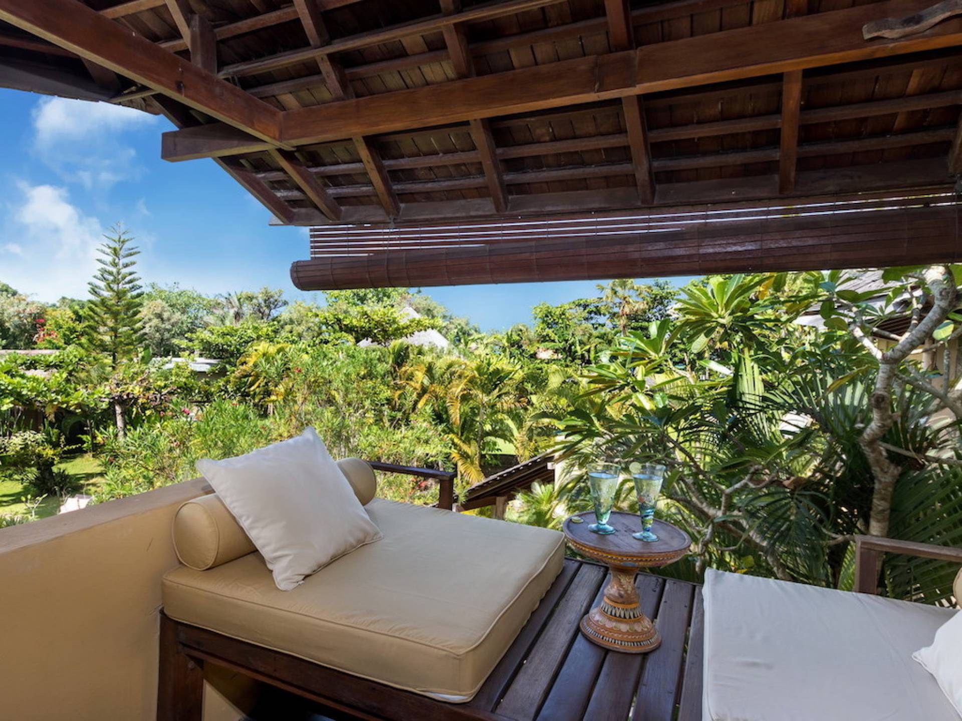For those seeking shade, chill out in the garden bale or take your pick between sofas, hanging chairs, and armchairs in the tropical-styled, rustic, open-plan living pavilions. With two fully equipped living rooms, each with a sitting and dining area as well as a well-appointed kitchen, there is an abundance of space to hang out together with friends and family and yet there are also plenty of places to enjoy some solitude, peace, and quiet. You can dine indoors or out and why not get a chef cook in to prepare you a delicious meal or that BBQ feast you’ve been craving for?
