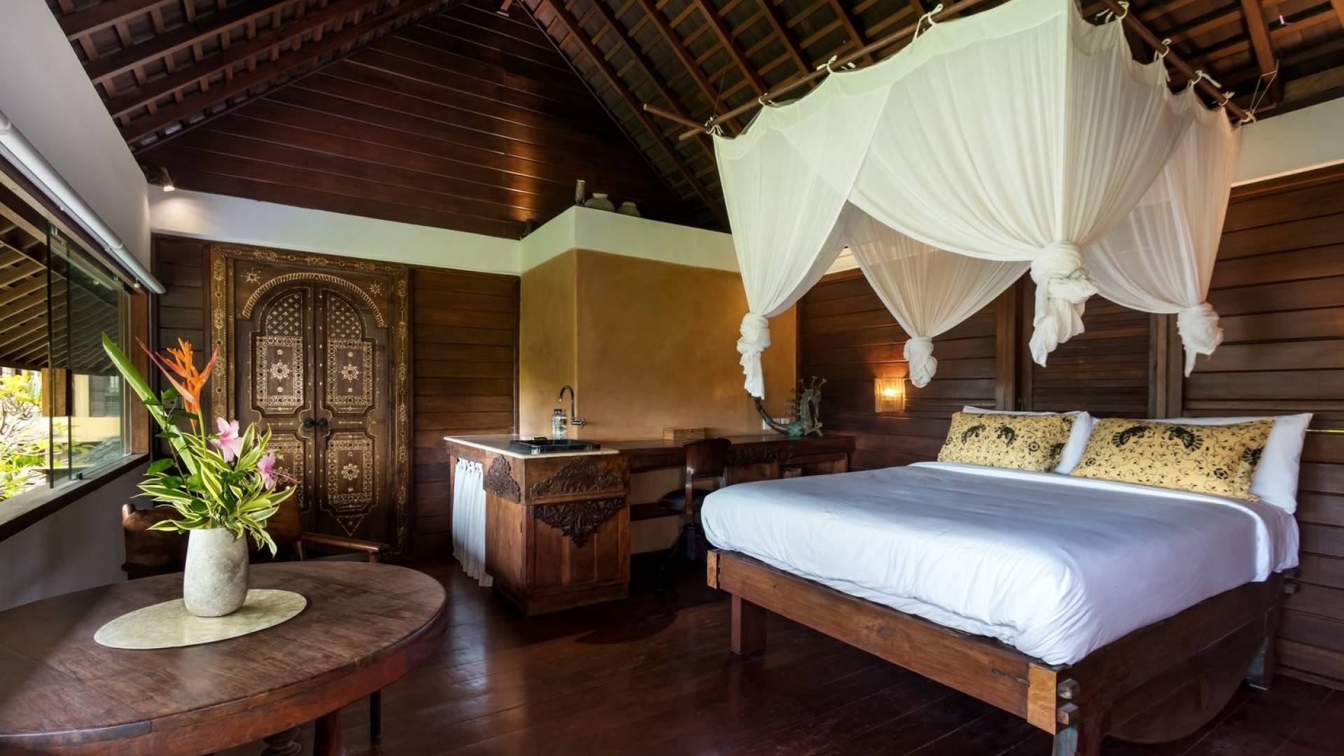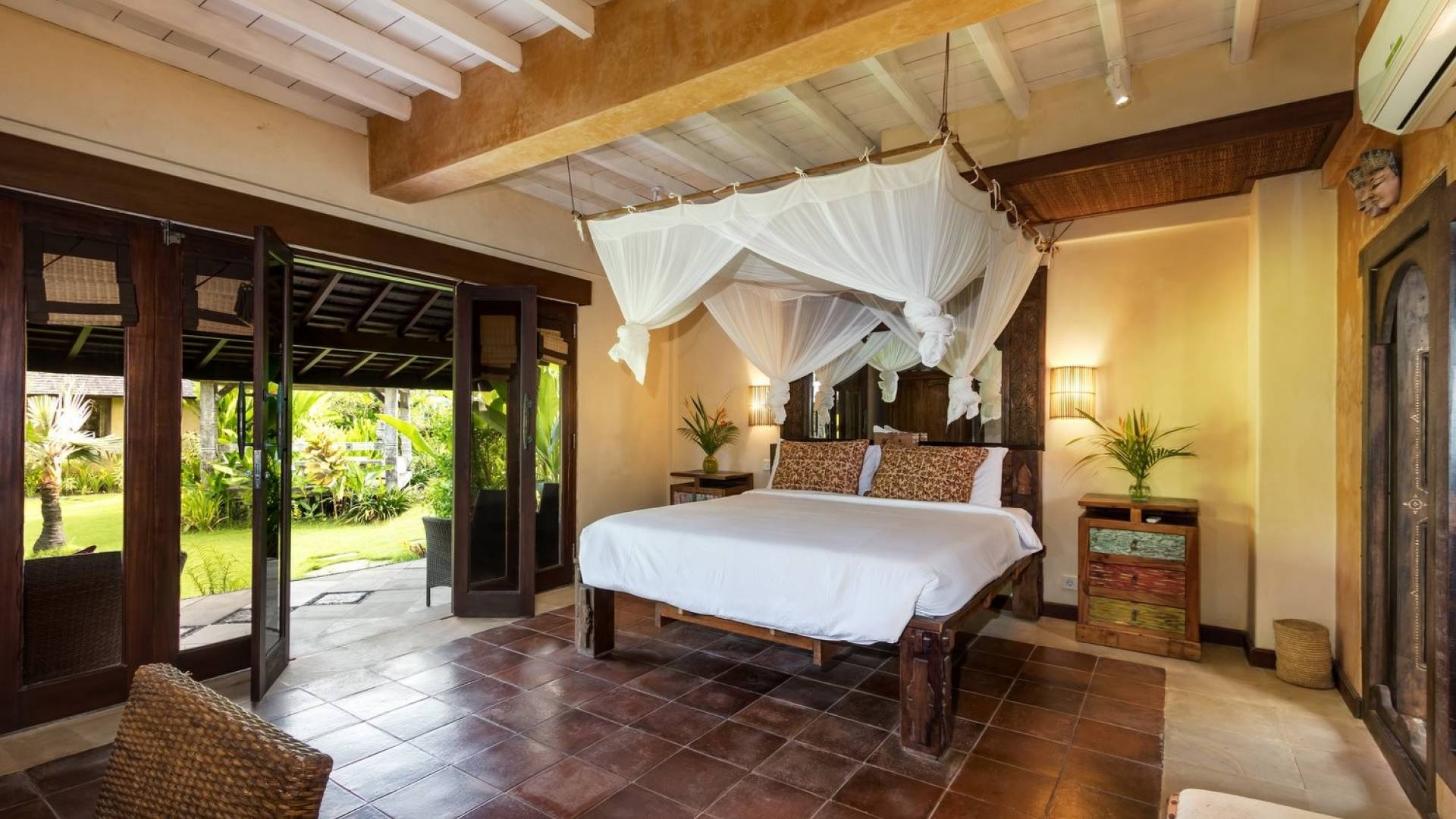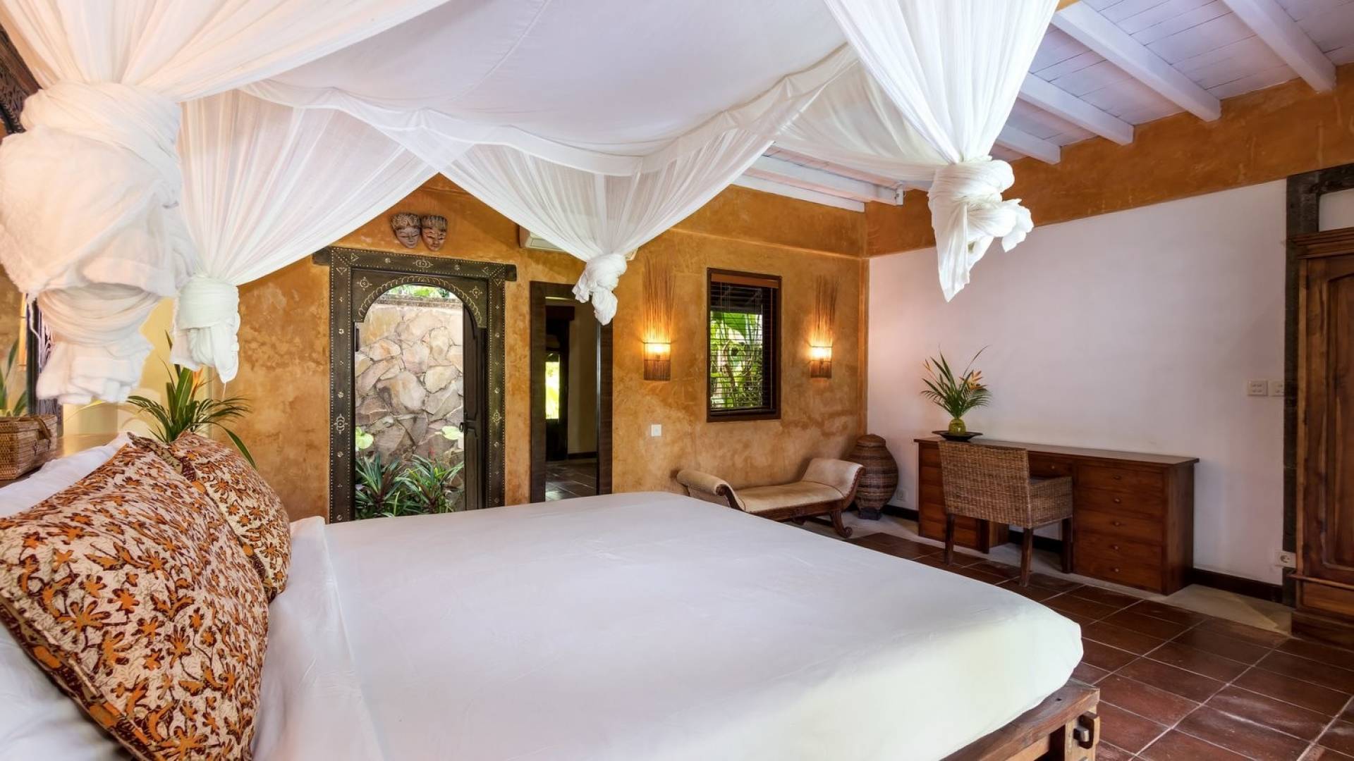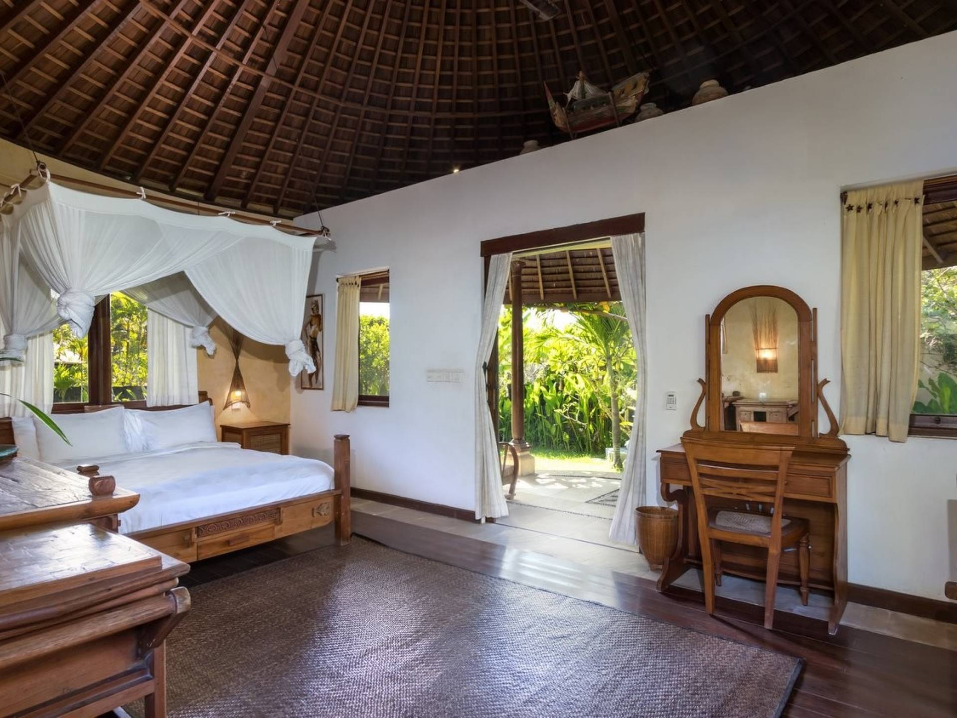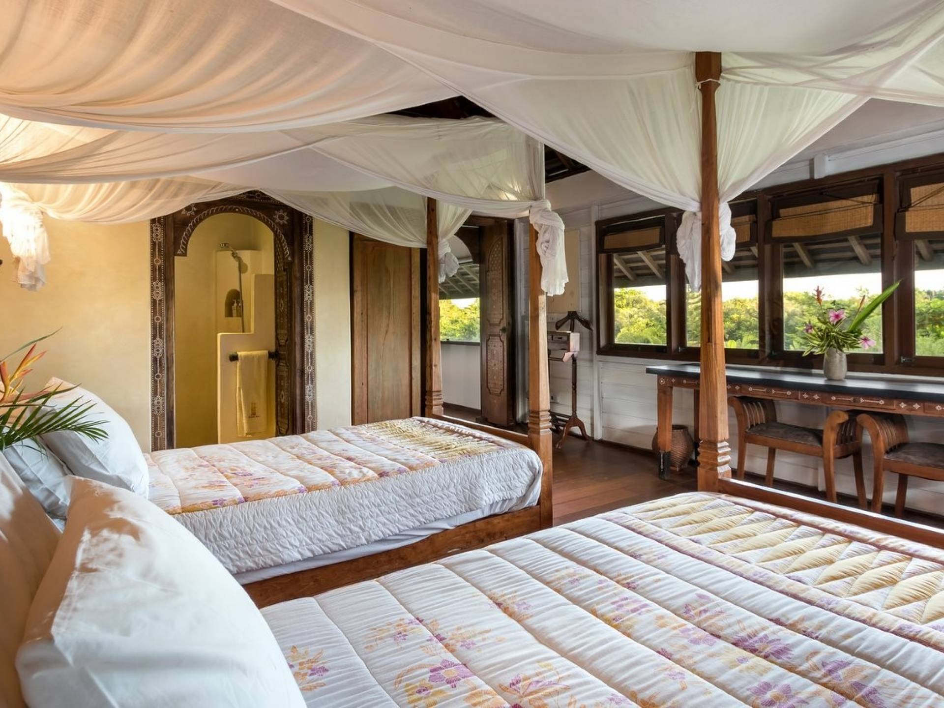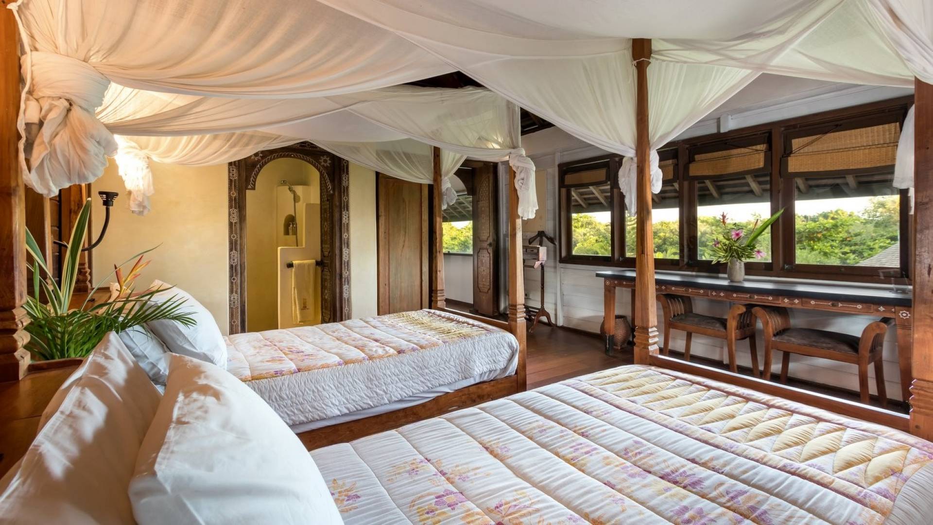 For those seeking shade, chill out in the garden bale or take your pick between sofas, hanging chairs, and armchairs in the tropical-styled, rustic, open-plan living pavilions. With two fully equipped living rooms, each with a sitting and dining area as well as a well-appointed kitchen, there is an abundance of space to hang out together with friends and family and yet there are also plenty of places to enjoy some solitude, peace, and quiet. You can dine indoors or out and why not get a chef cook in to prepare you a delicious meal or that BBQ feast you’ve been craving for?