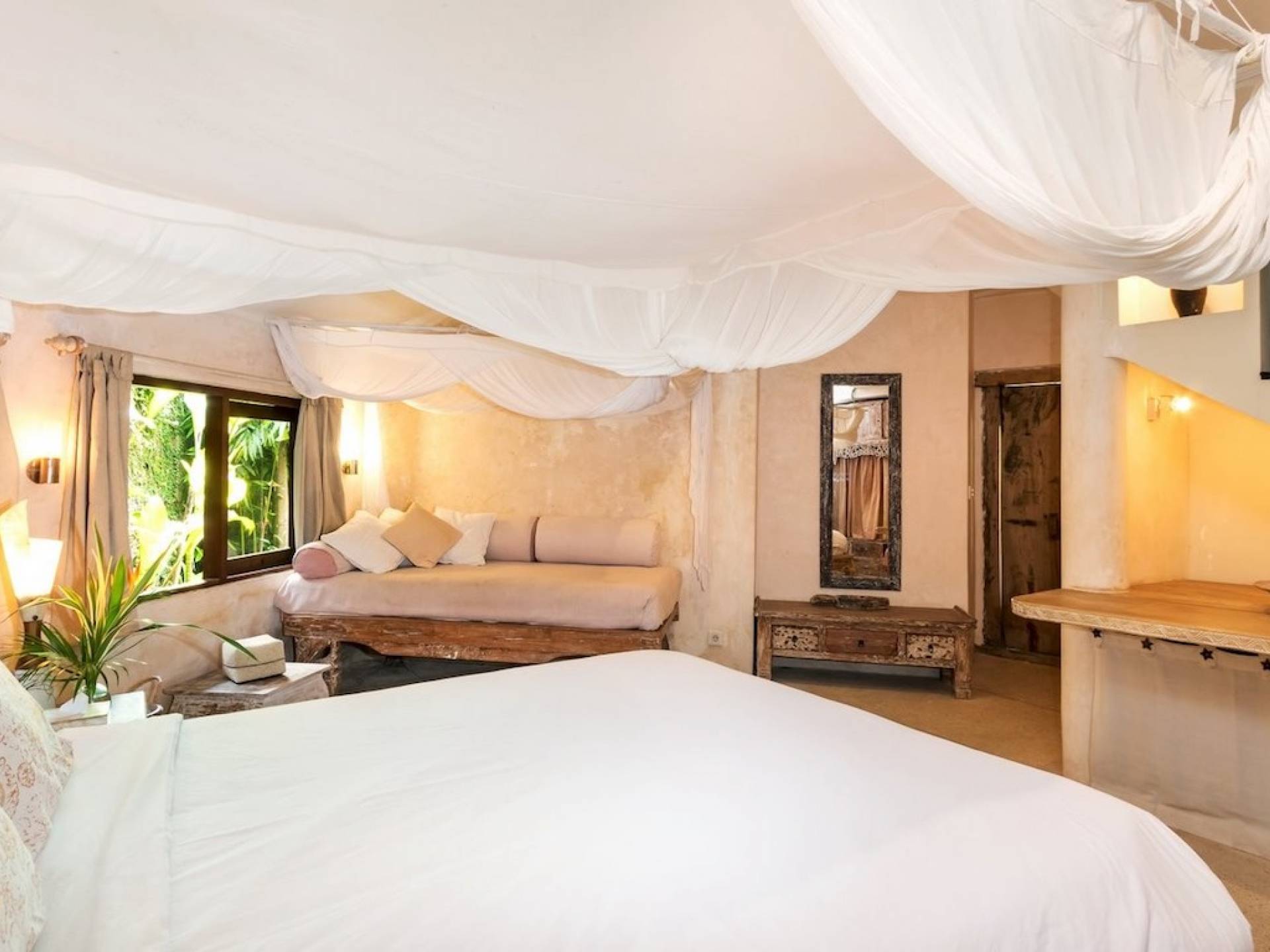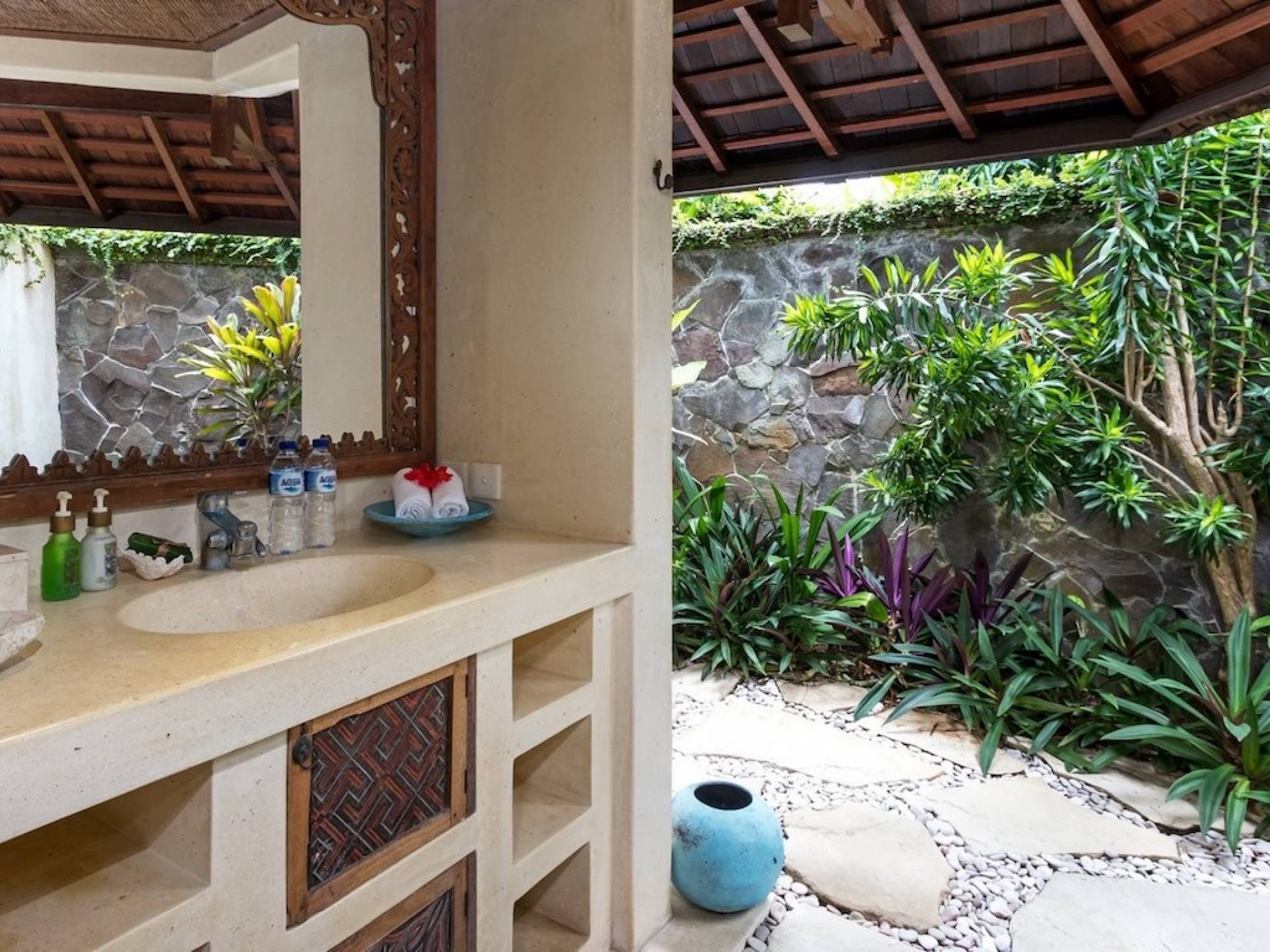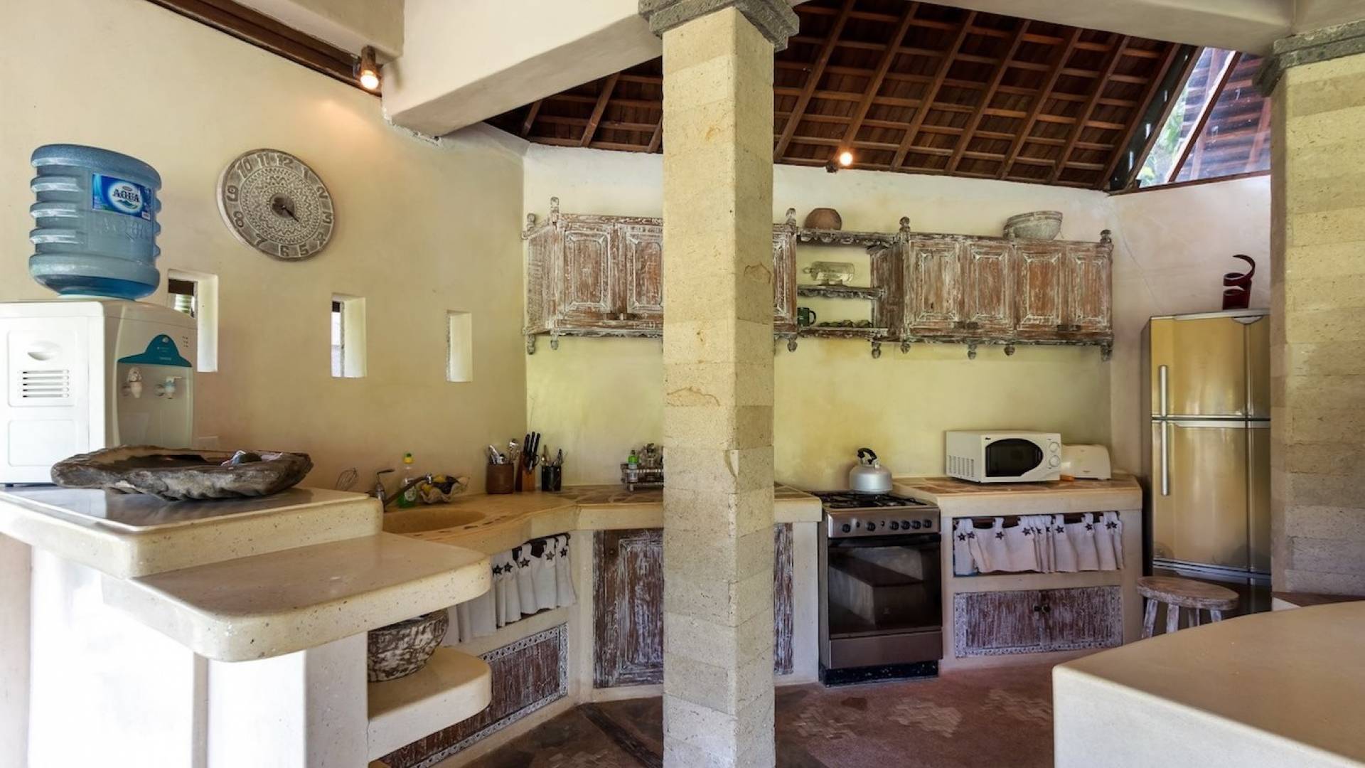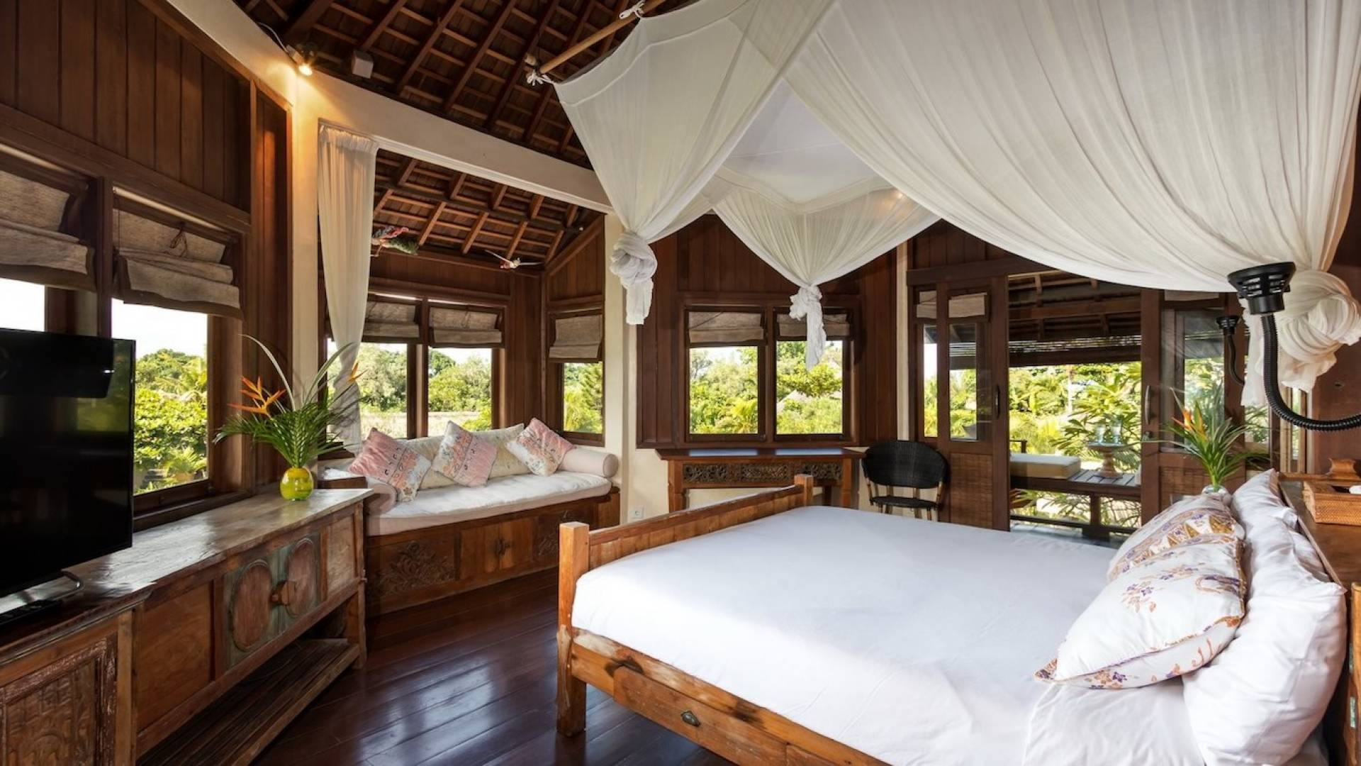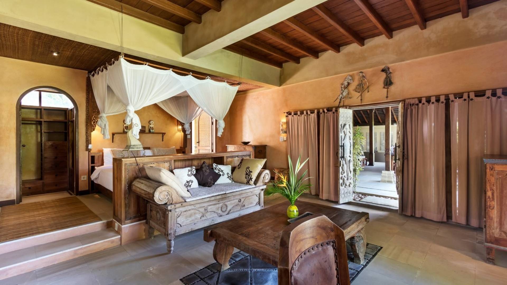 For those seeking shade, chill out in the garden bale or take your pick between sofas, hanging chairs, and armchairs in the tropical-styled, rustic, open-plan living pavilions. With two fully equipped living rooms, each with a sitting and dining area as well as a well-appointed kitchen, there is an abundance of space to hang out together with friends and family and yet there are also plenty of places to enjoy some solitude, peace, and quiet. You can dine indoors or out and why not get a chef cook in to prepare you a delicious meal or that BBQ feast you’ve been craving for?
