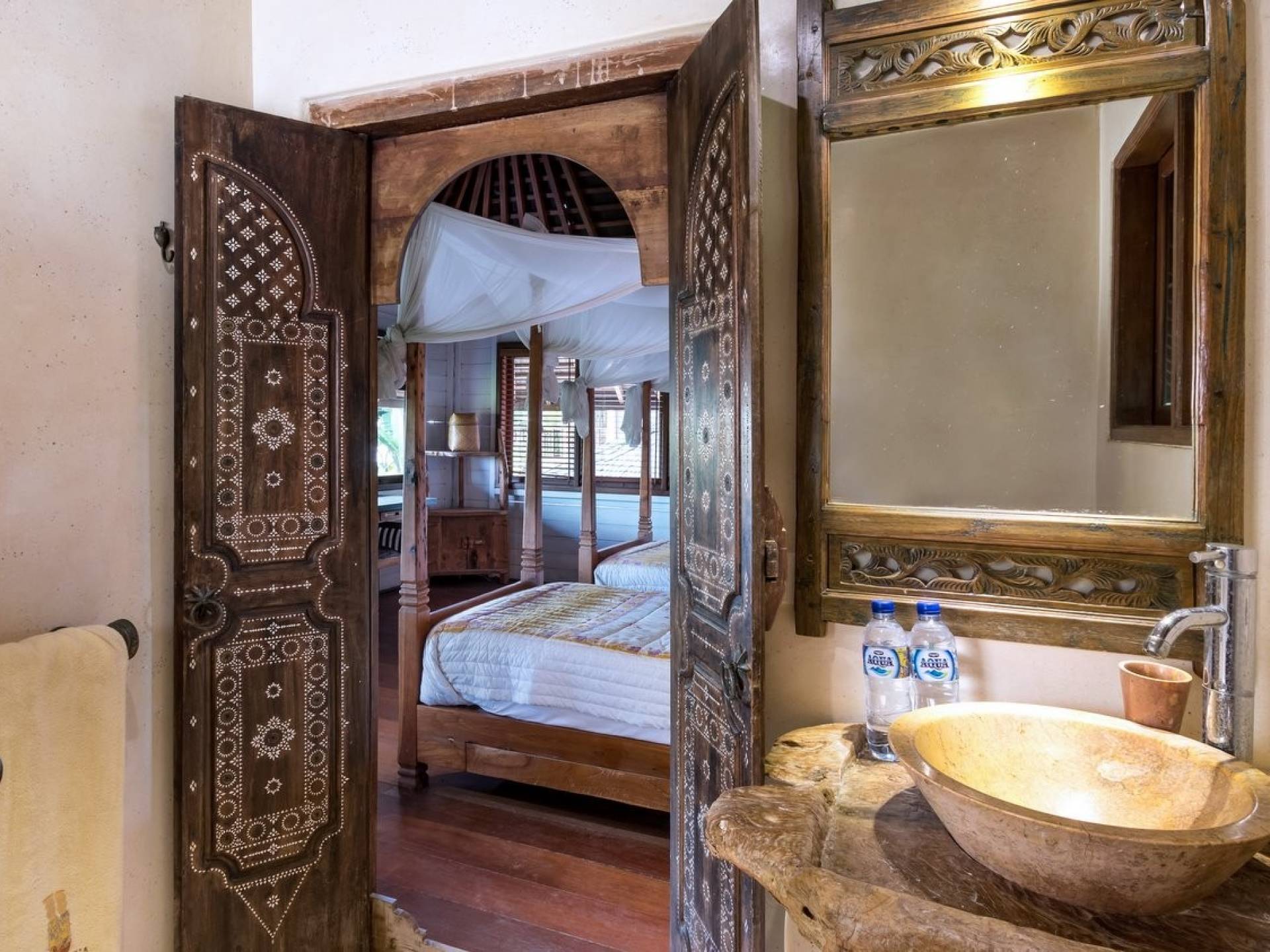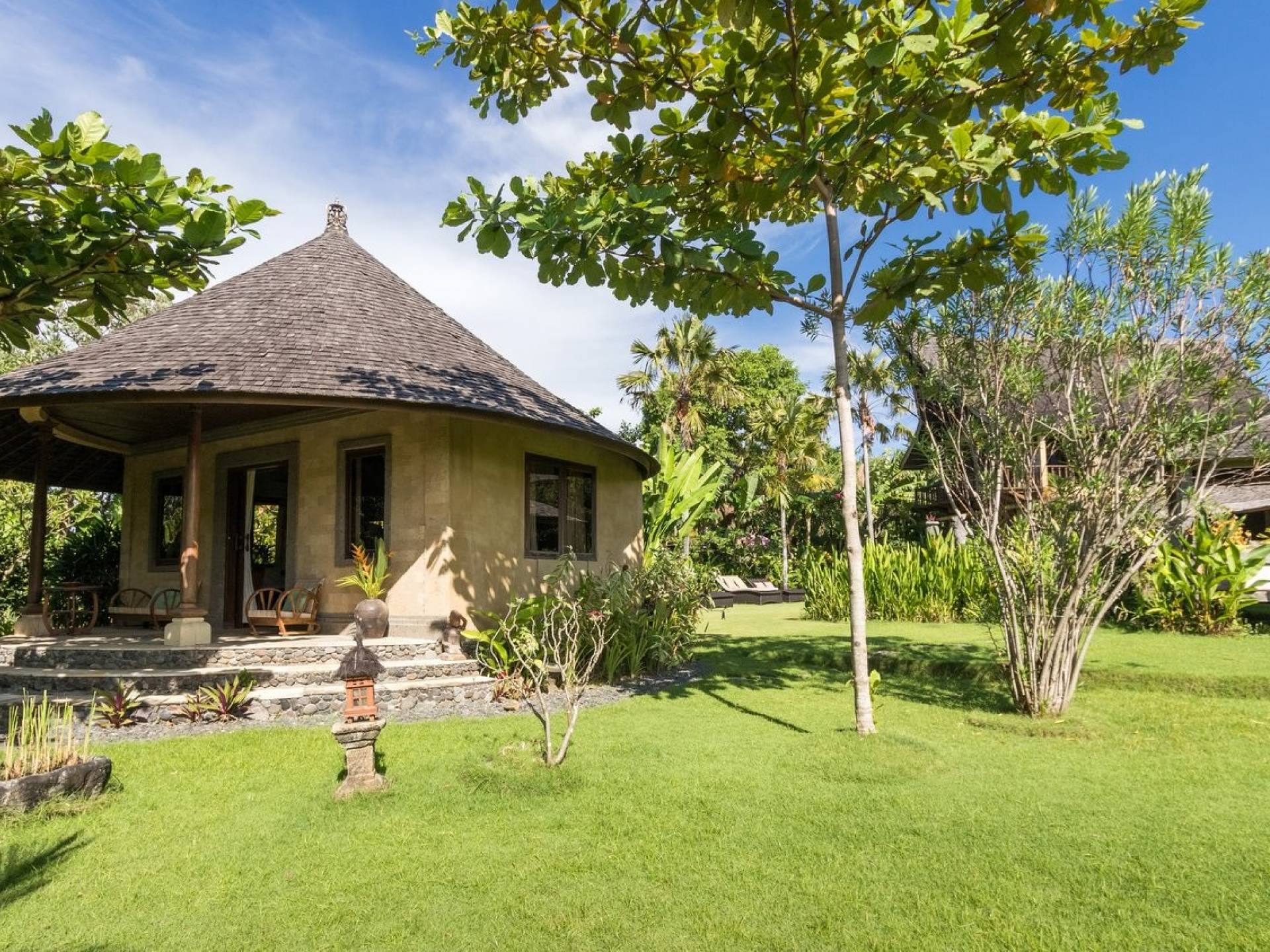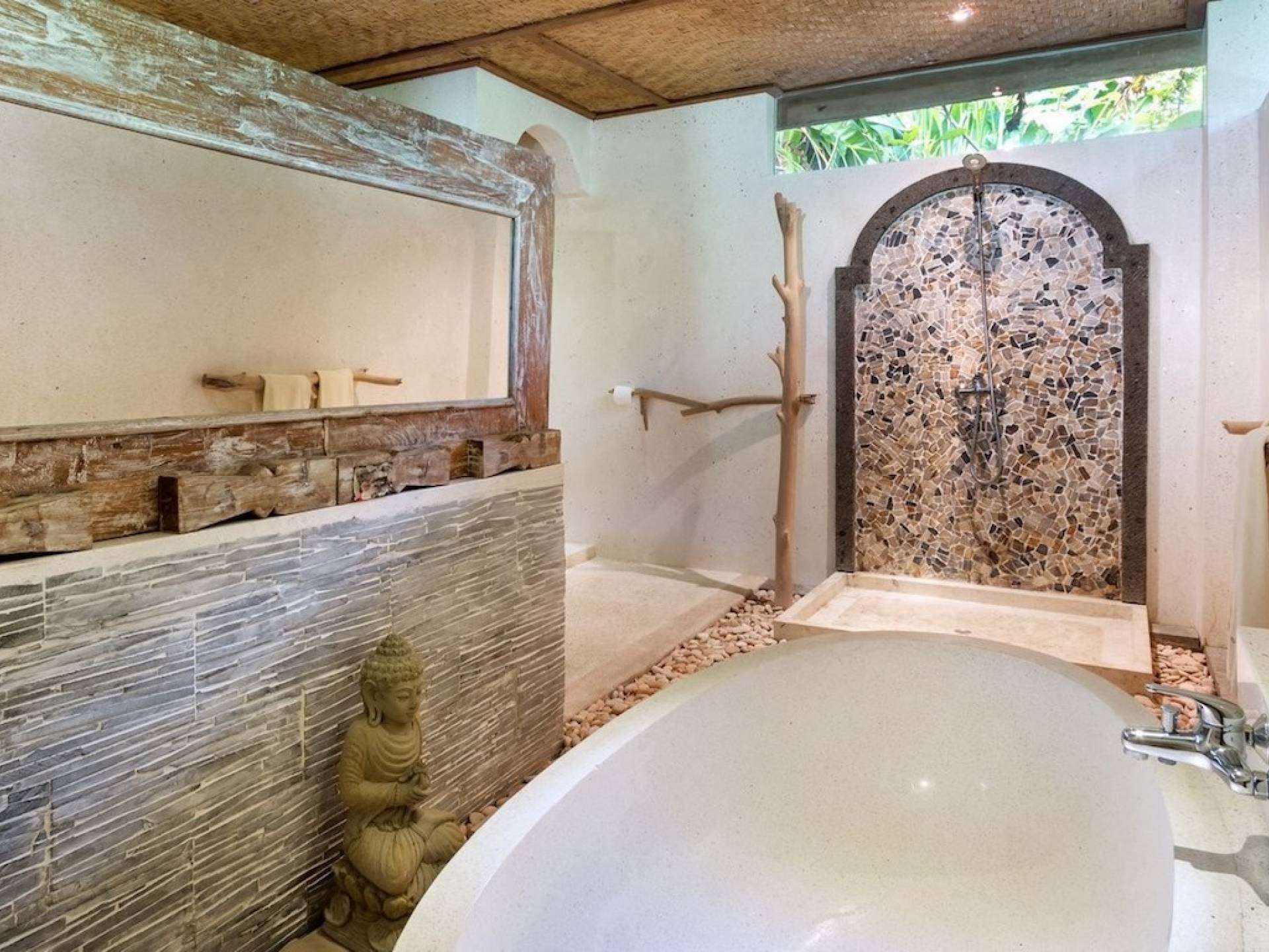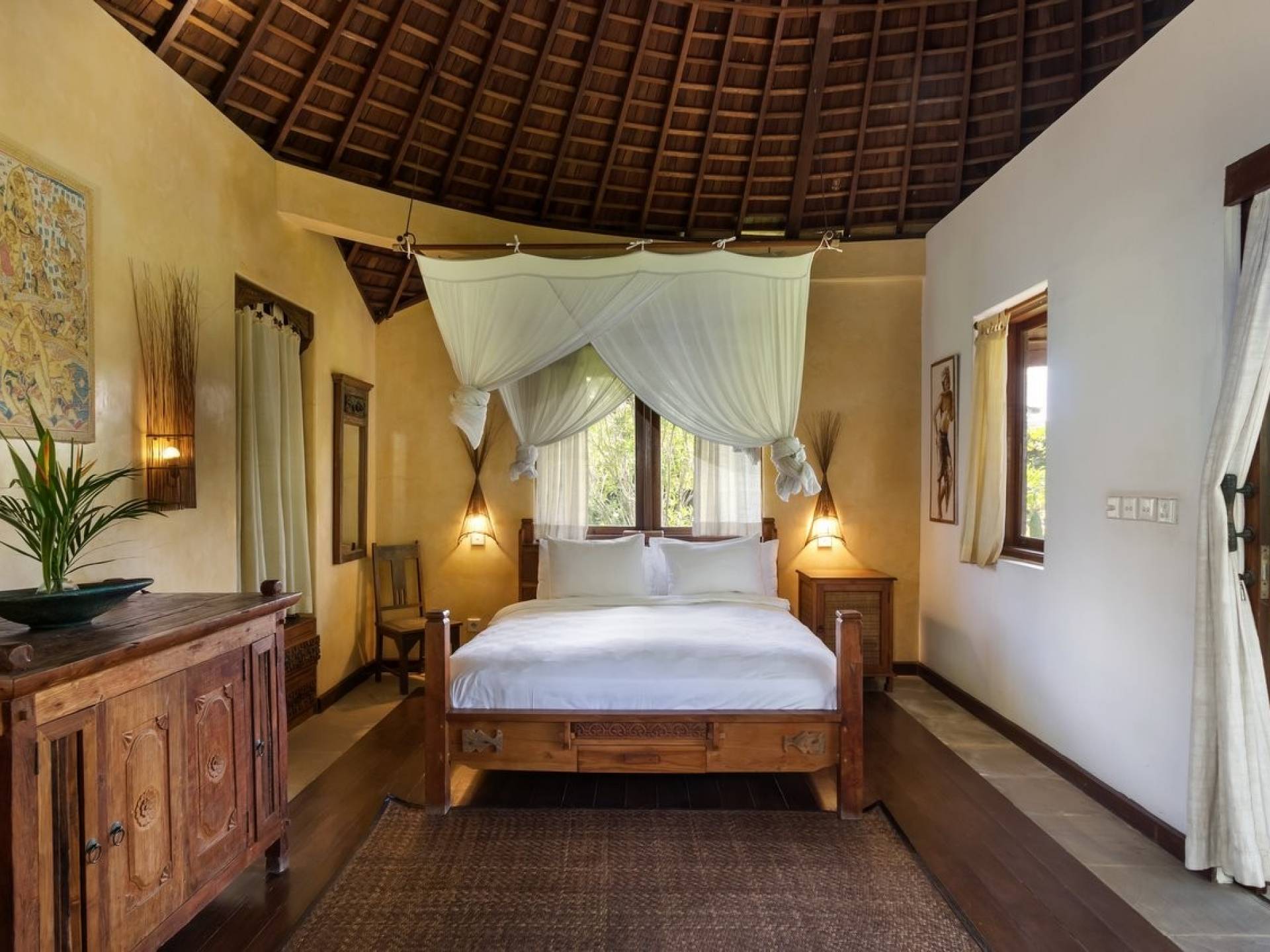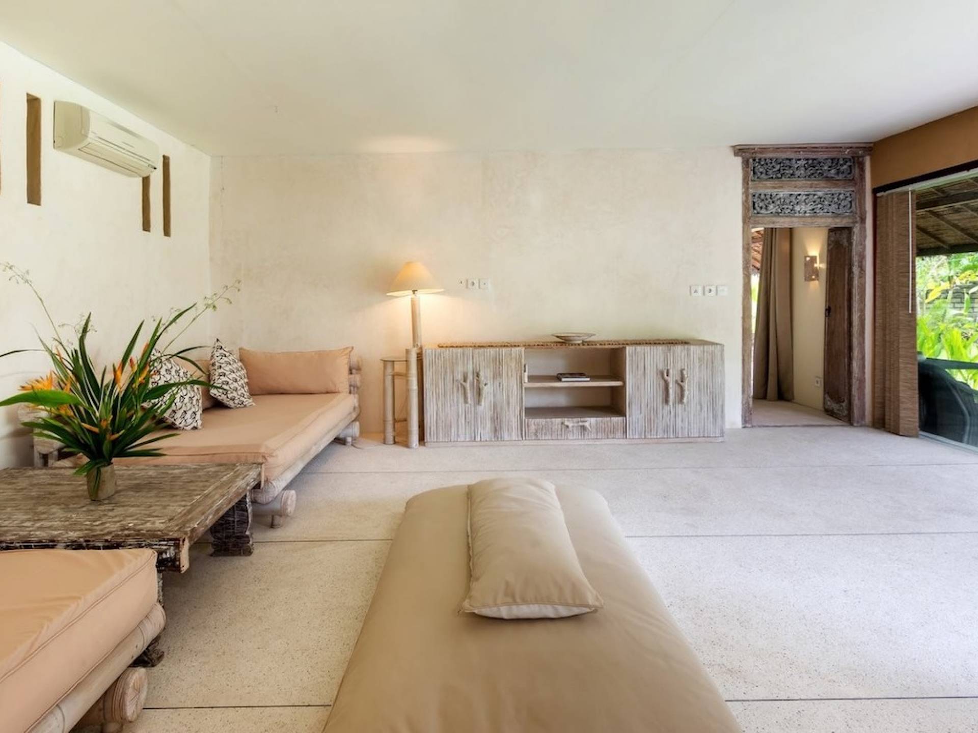 For those seeking shade, chill out in the garden bale or take your pick between sofas, hanging chairs, and armchairs in the tropical-styled, rustic, open-plan living pavilions. With two fully equipped living rooms, each with a sitting and dining area as well as a well-appointed kitchen, there is an abundance of space to hang out together with friends and family and yet there are also plenty of places to enjoy some solitude, peace, and quiet. You can dine indoors or out and why not get a chef cook in to prepare you a delicious meal or that BBQ feast you’ve been craving for?