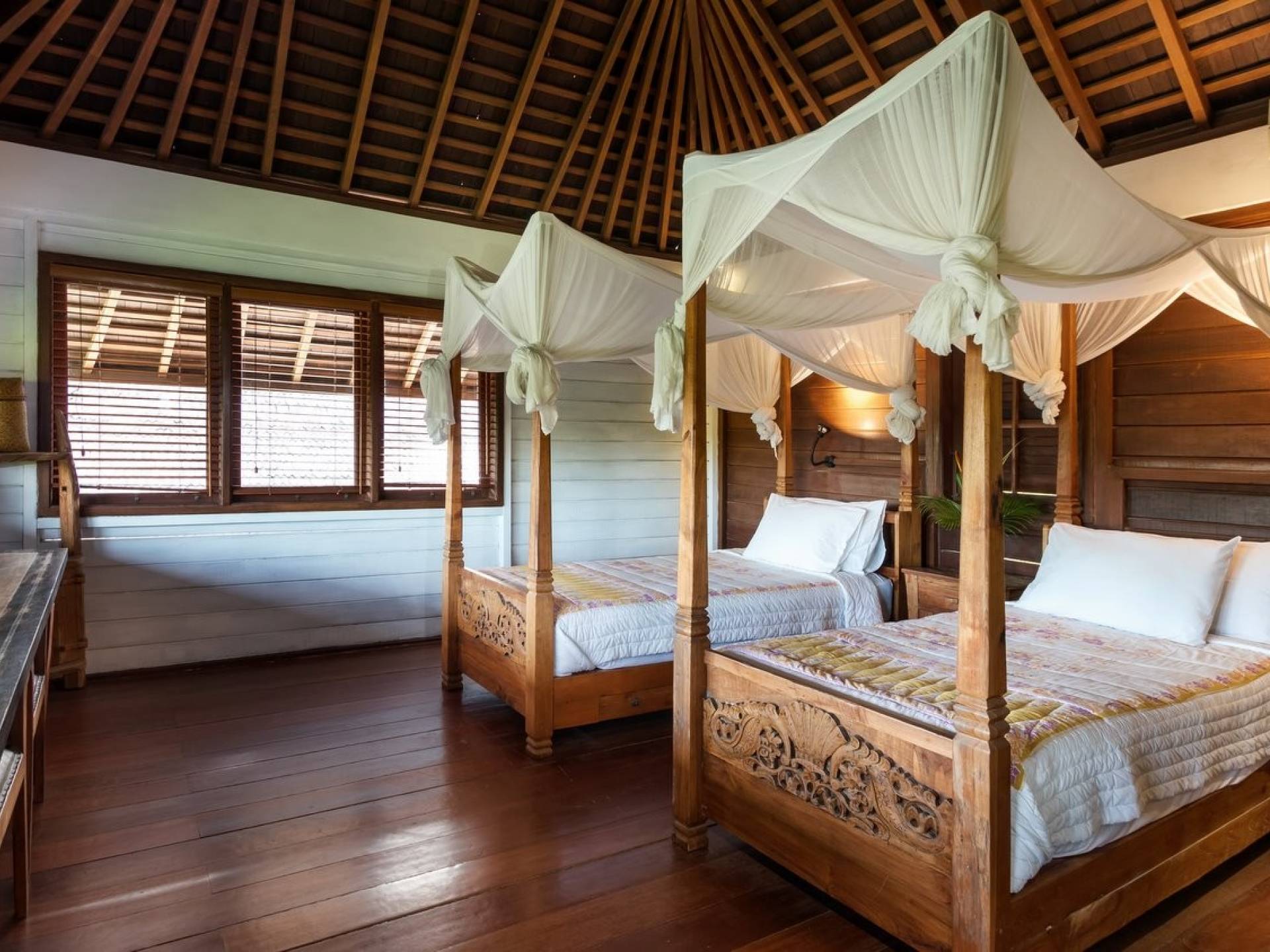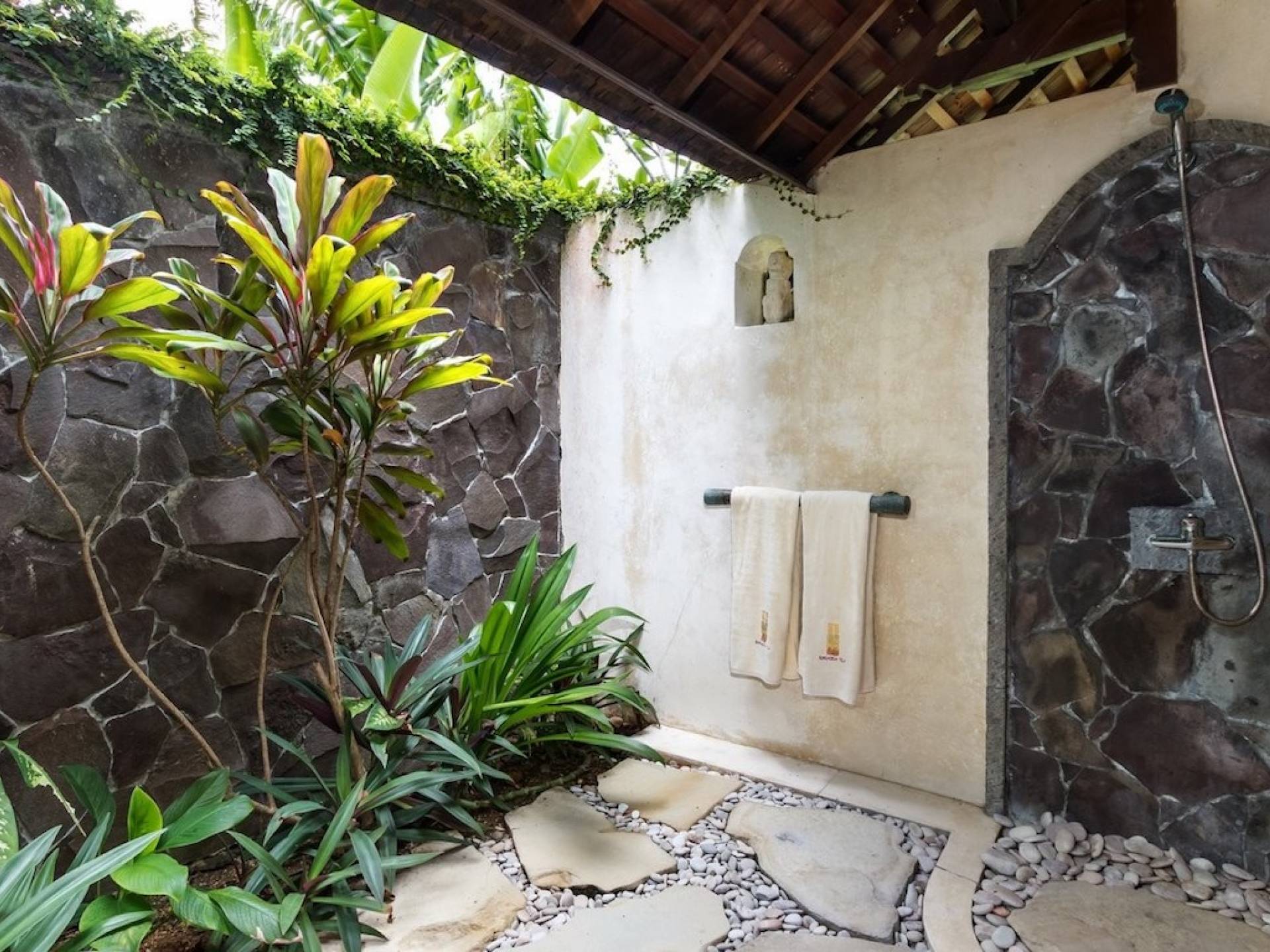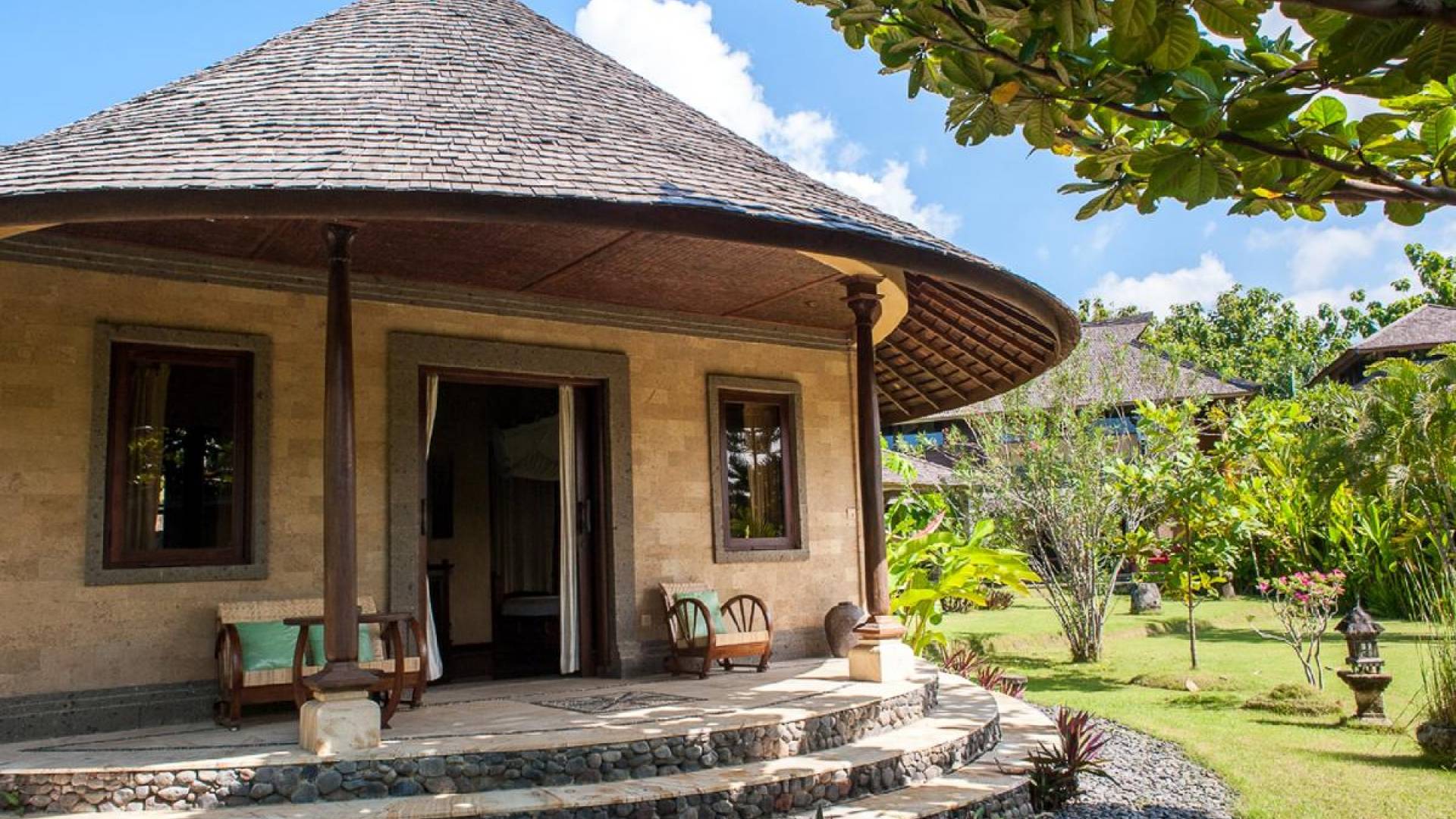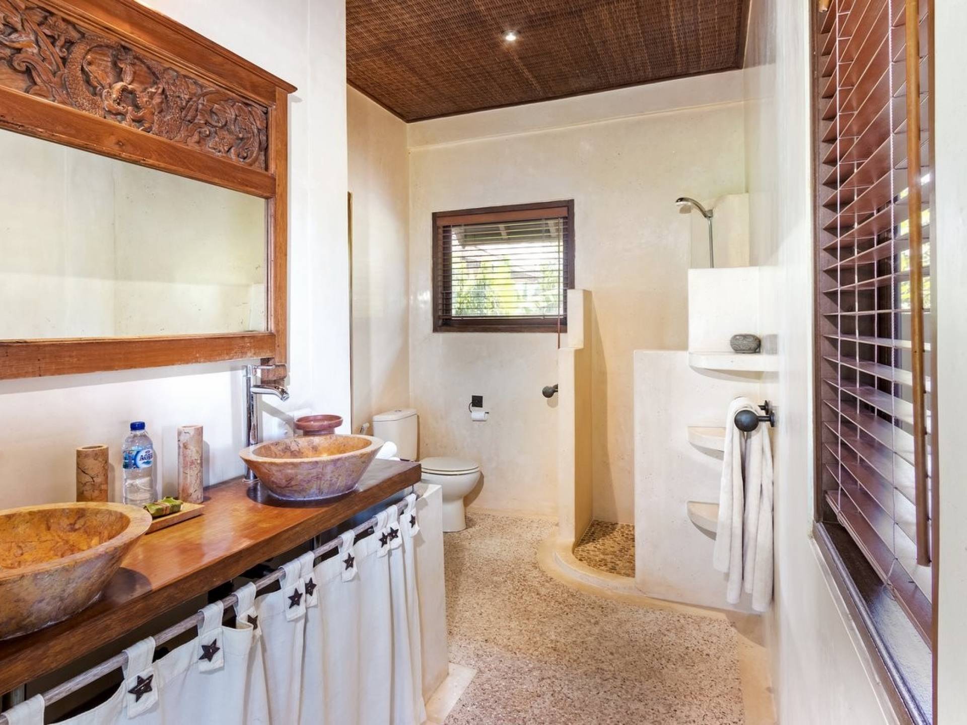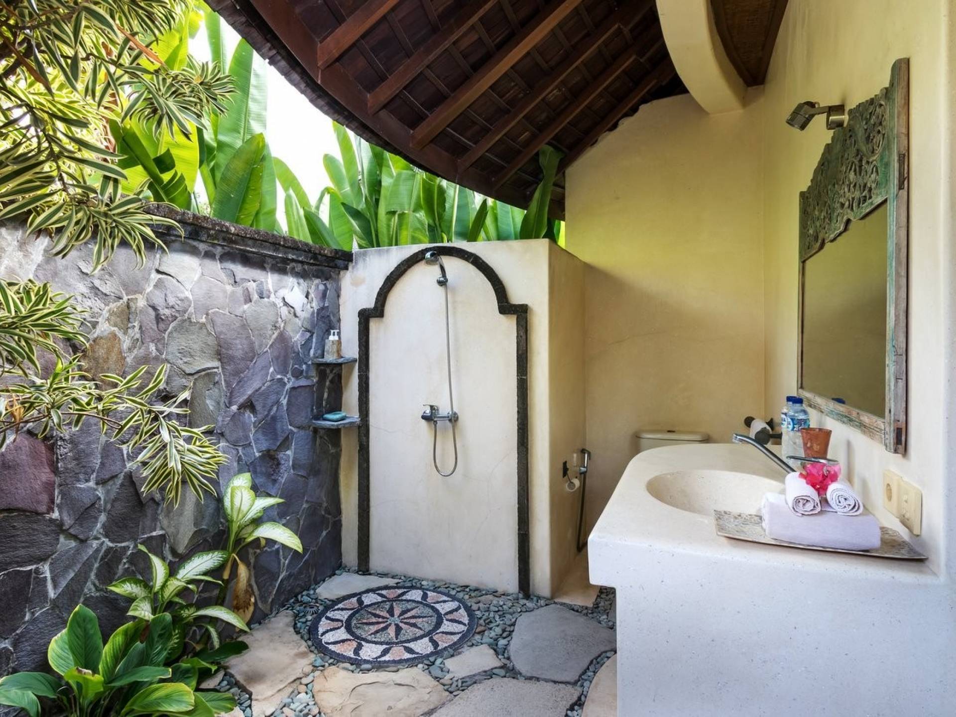 For those seeking shade, chill out in the garden bale or take your pick between sofas, hanging chairs, and armchairs in the tropical-styled, rustic, open-plan living pavilions. With two fully equipped living rooms, each with a sitting and dining area as well as a well-appointed kitchen, there is an abundance of space to hang out together with friends and family and yet there are also plenty of places to enjoy some solitude, peace, and quiet. You can dine indoors or out and why not get a chef cook in to prepare you a delicious meal or that BBQ feast you’ve been craving for?