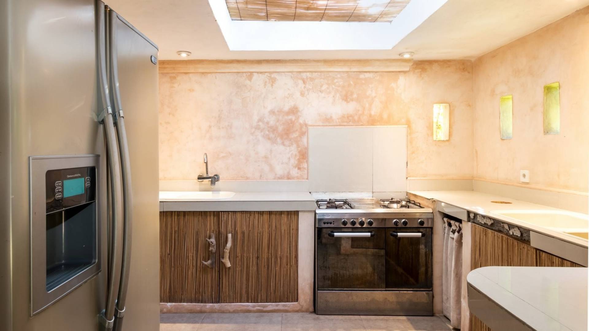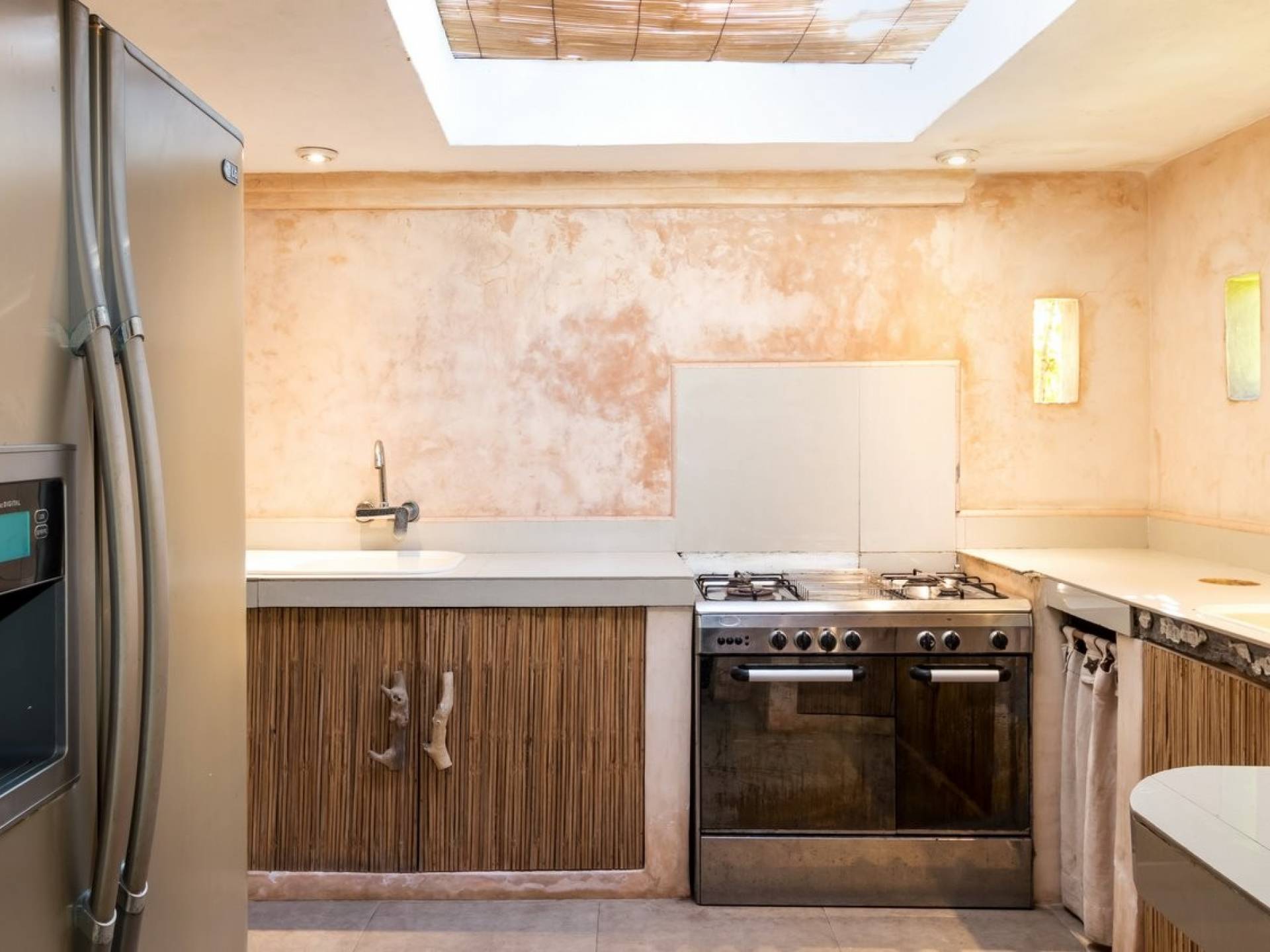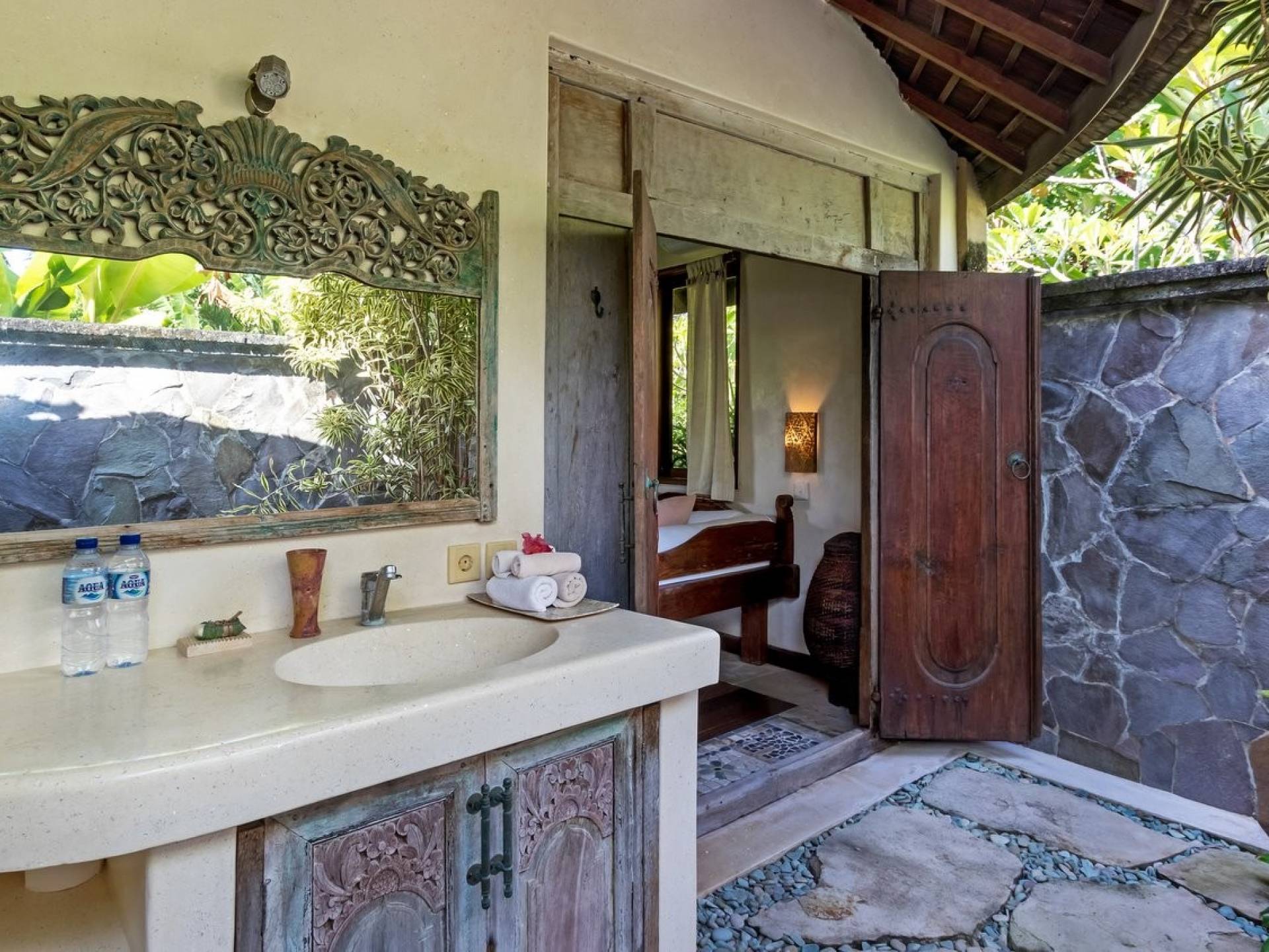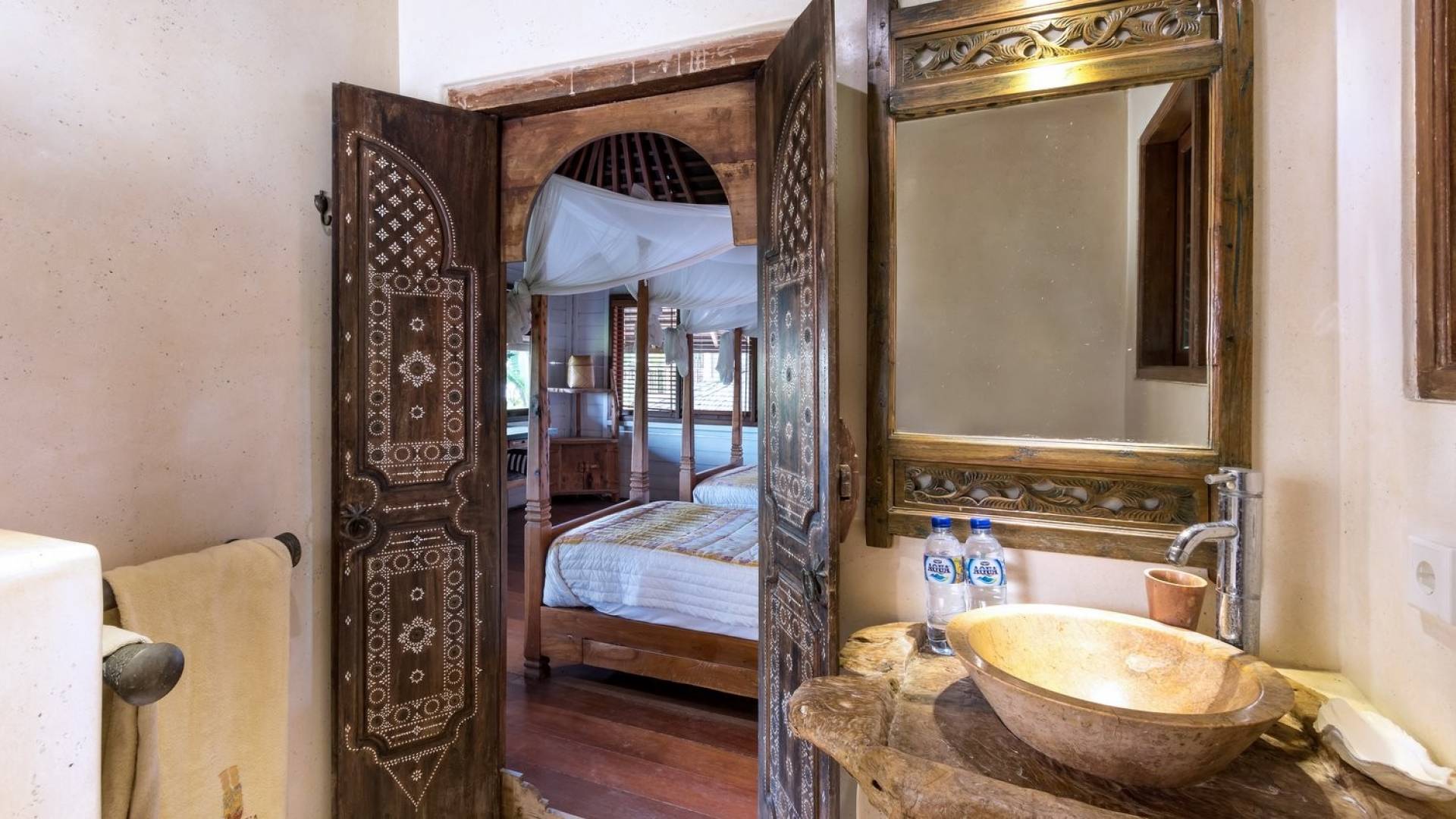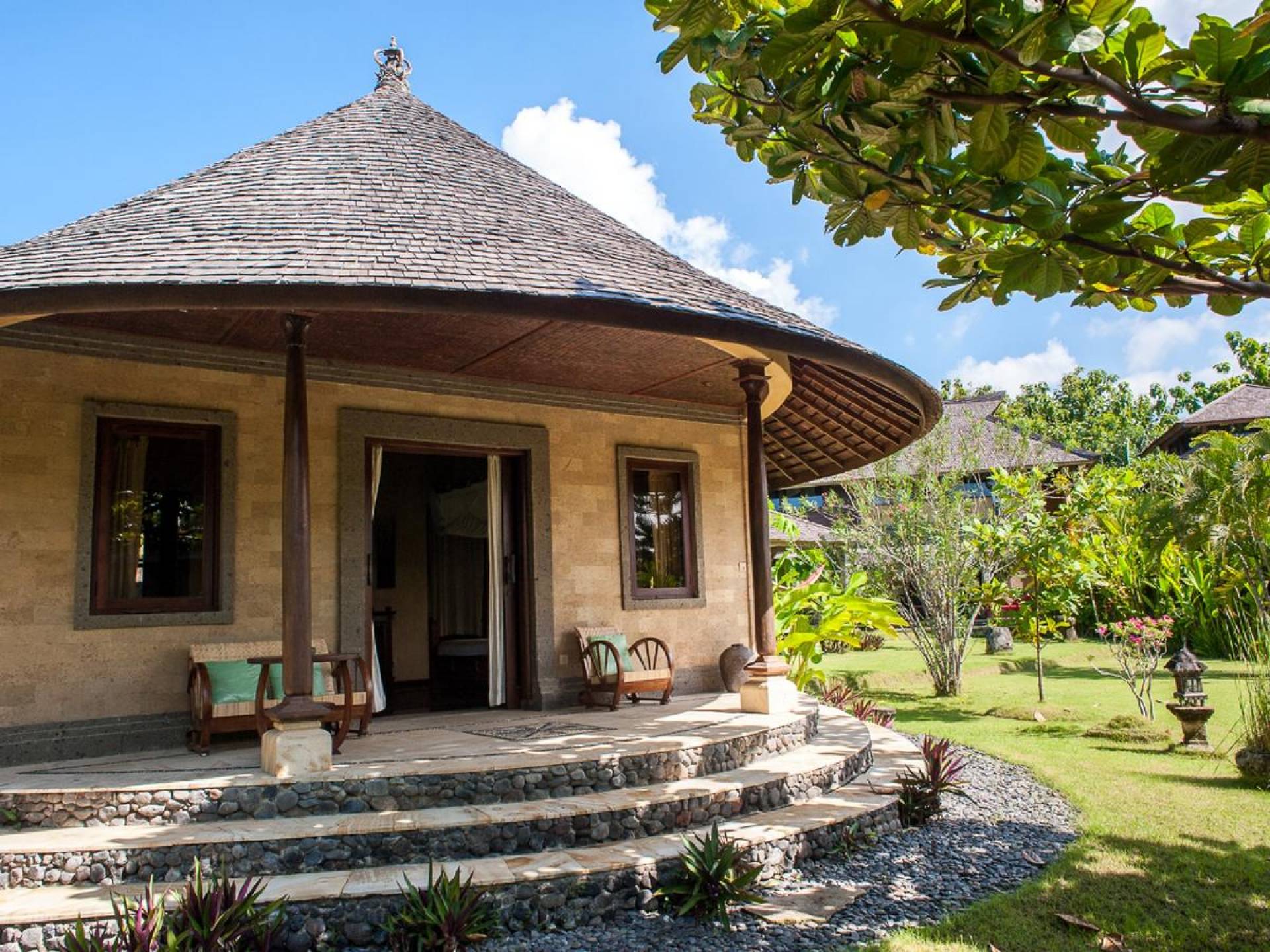For those seeking shade, chill out in the garden bale or take your pick between sofas, hanging chairs, and armchairs in the tropical-styled, rustic, open-plan living pavilions. With two fully equipped living rooms, each with a sitting and dining area as well as a well-appointed kitchen, there is an abundance of space to hang out together with friends and family and yet there are also plenty of places to enjoy some solitude, peace, and quiet. You can dine indoors or out and why not get a chef cook in to prepare you a delicious meal or that BBQ feast you’ve been craving for?