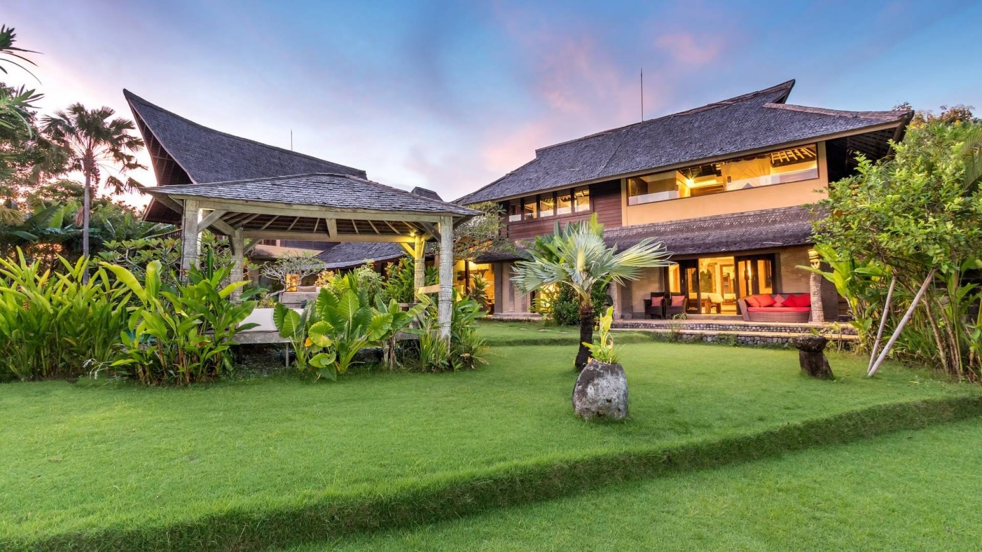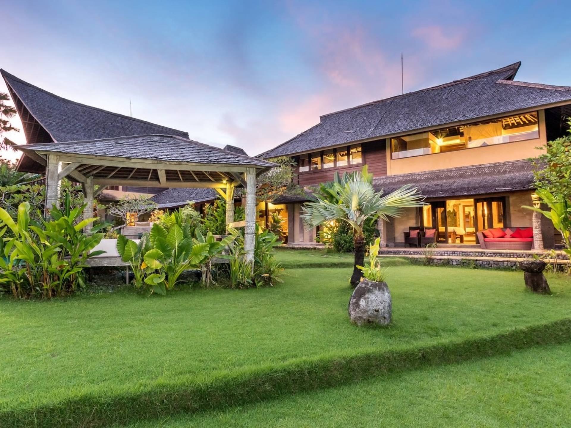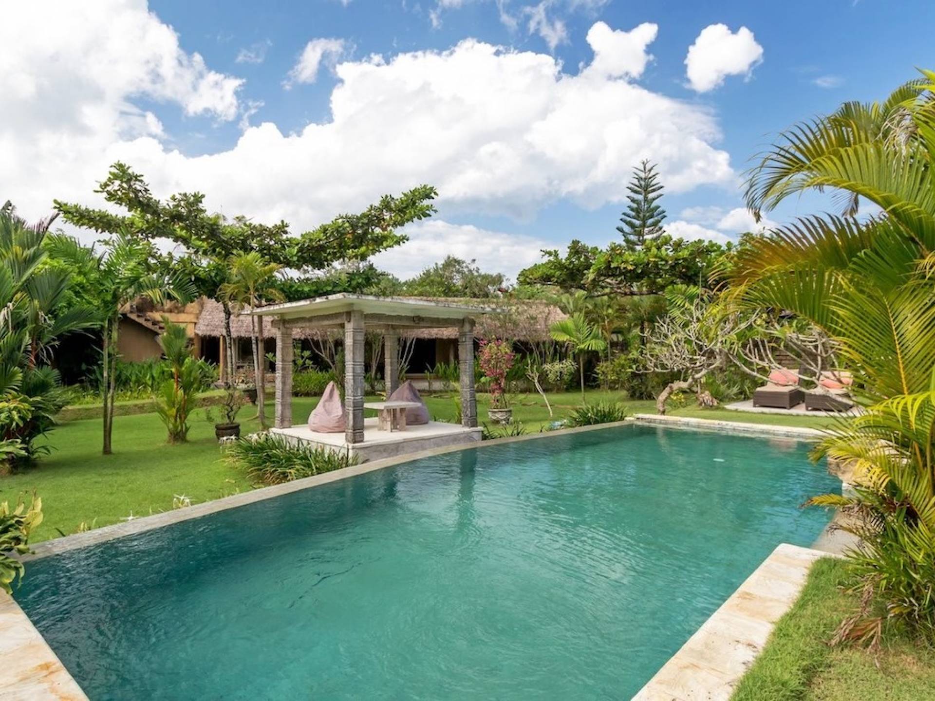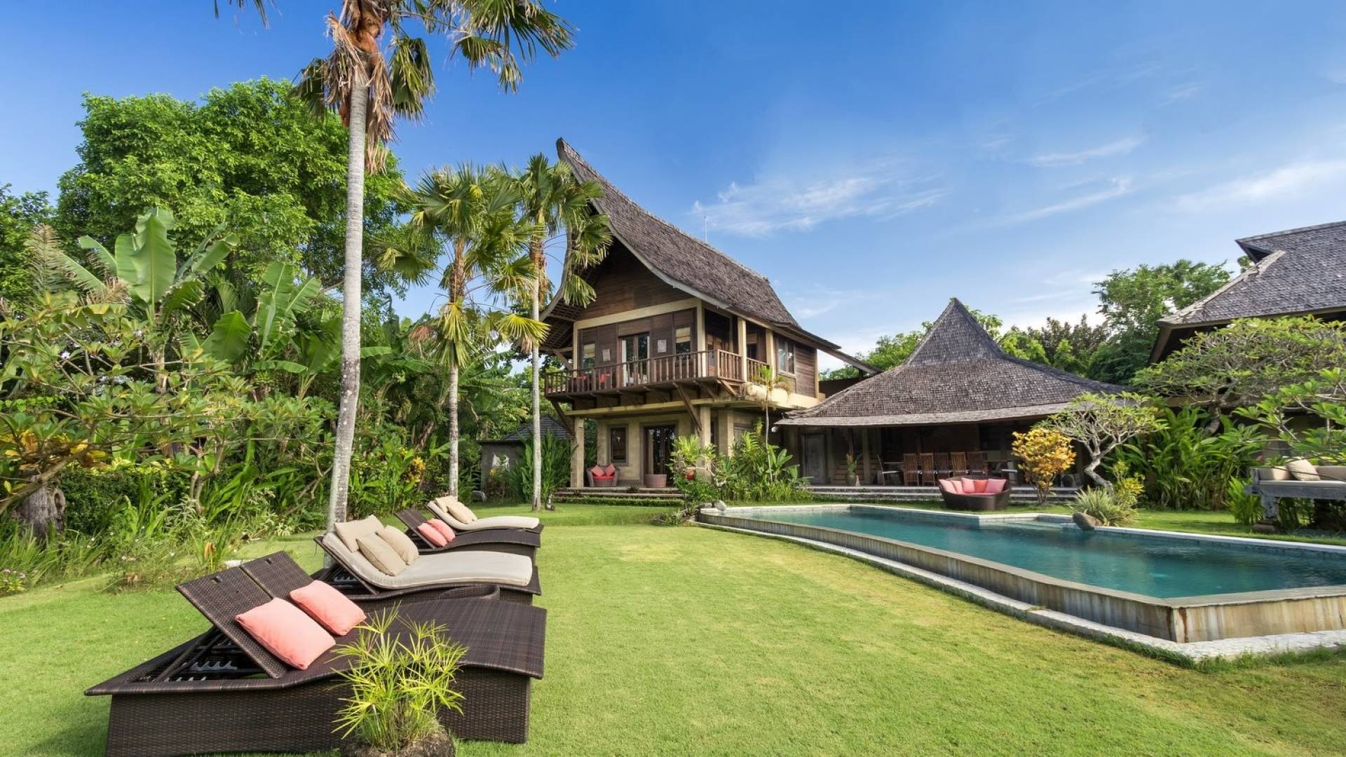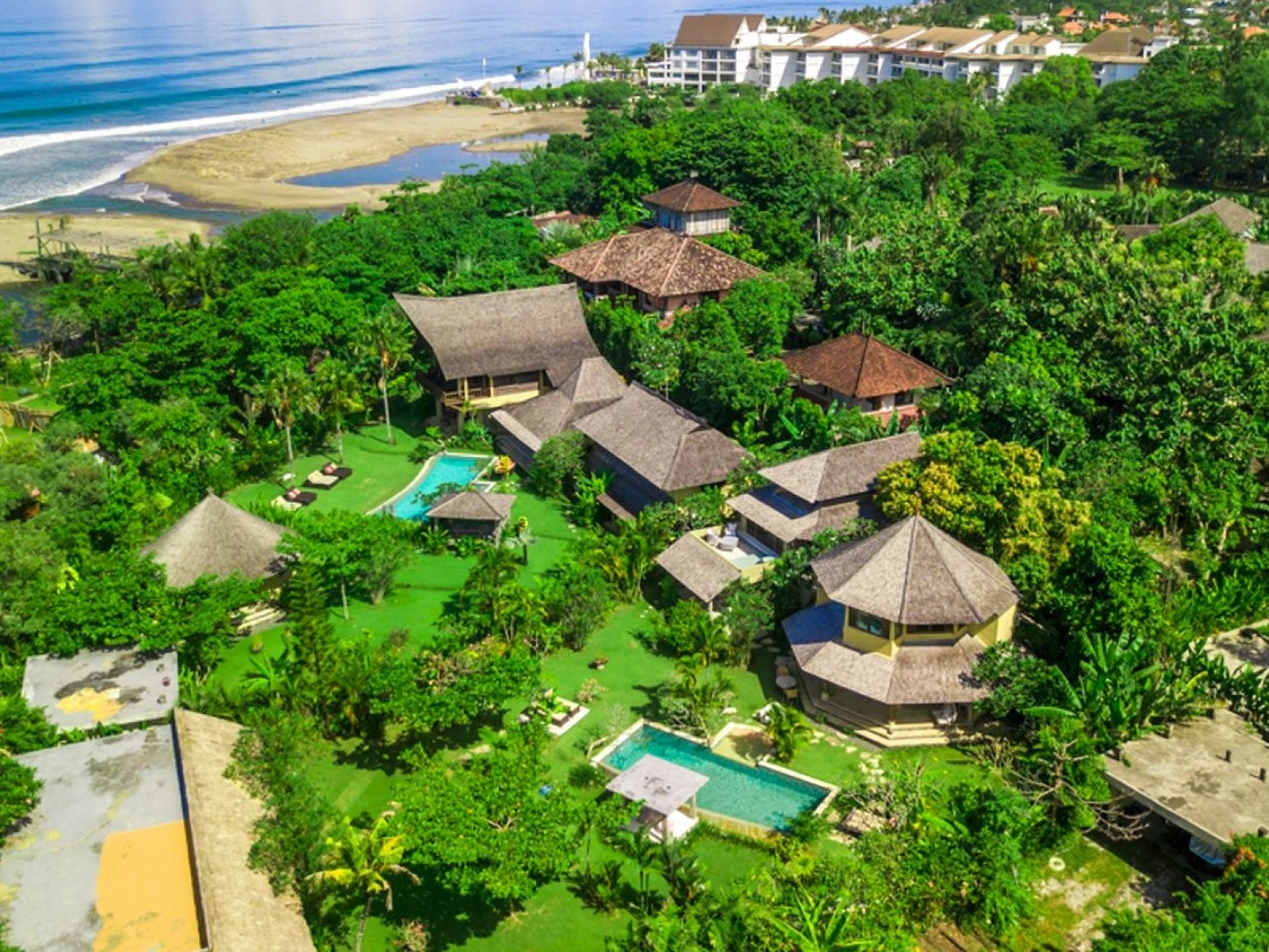 Just meters away from the beach and La Laguna Beach Club, in the hip and trendy Berawa area of Canggu, awaits this amazing, gigantic 11-bedroom paradise retreat. A place that makes tropical holiday dreams come true with its expansive lush green garden and the gorgeous traditional Indonesian pavilions scattered around on the manicured lawns that surround the glistening private swimming pools of Bunga Desa Estate. Ruled by an abundance of space, verdant tropical greenery, ancient teak wood, traditional artwork, and modern luxury facilities, everyone will love staying here.