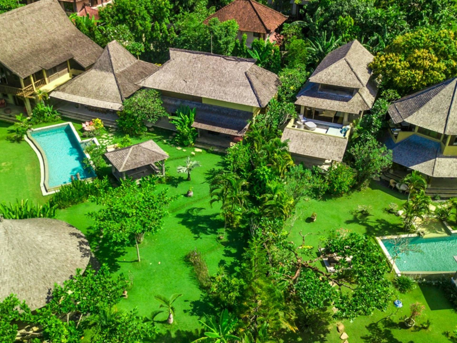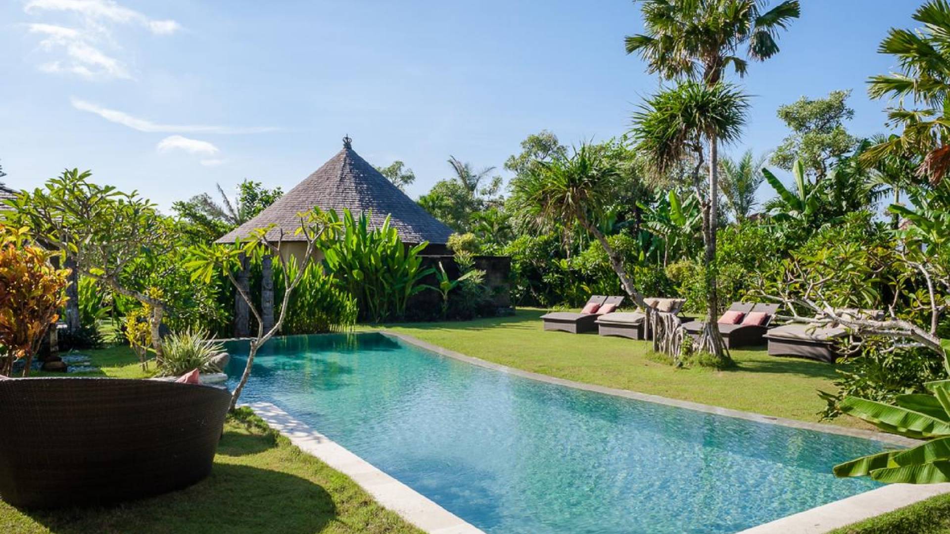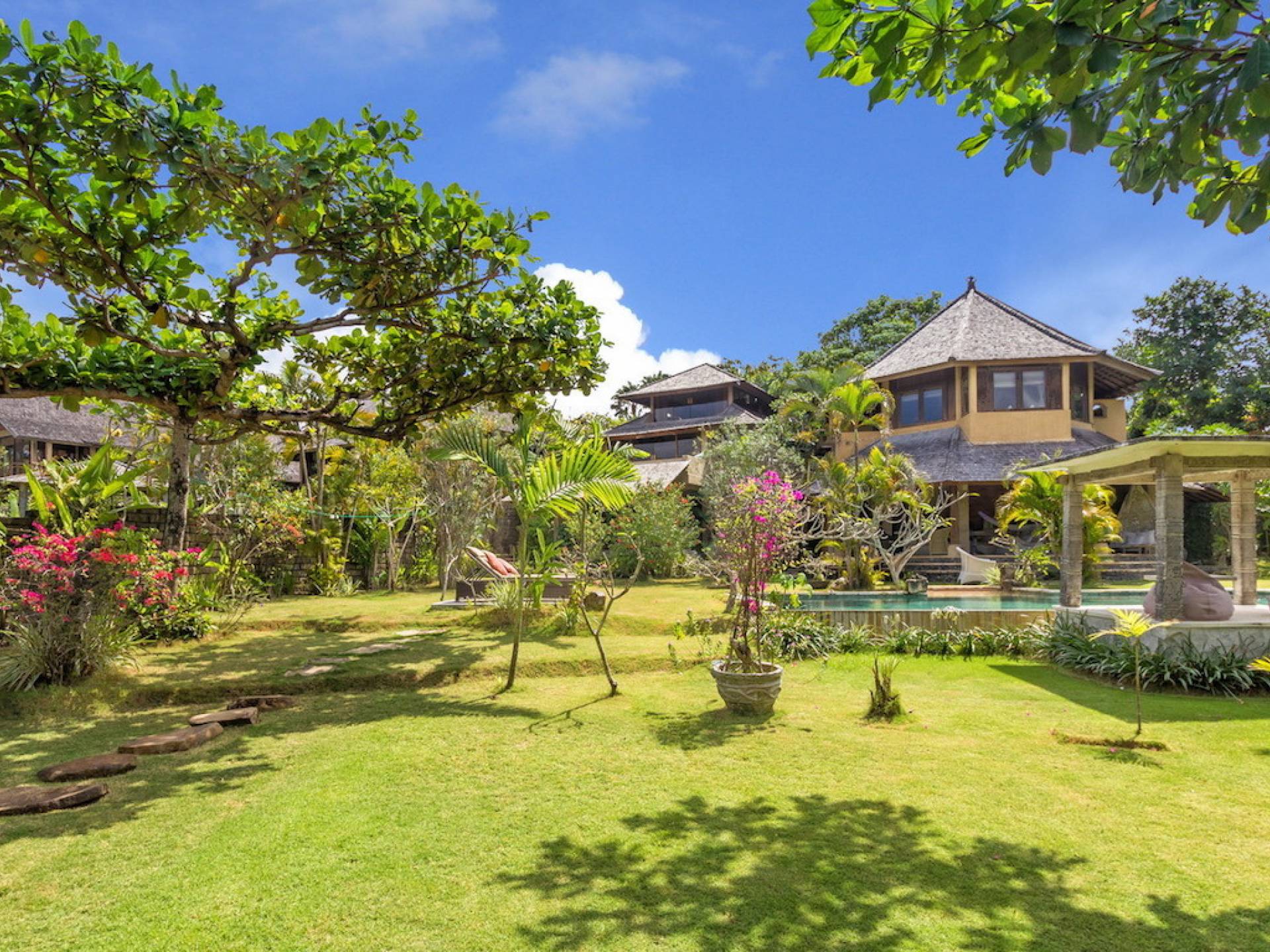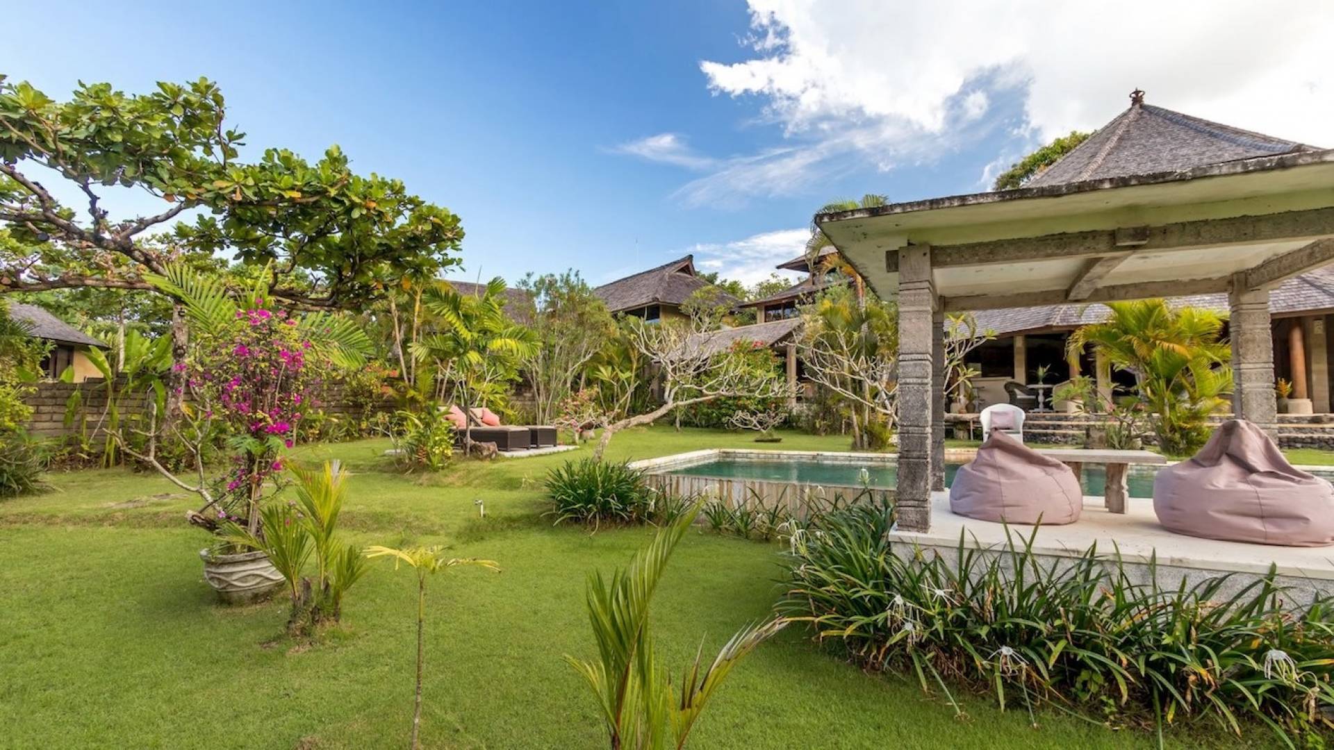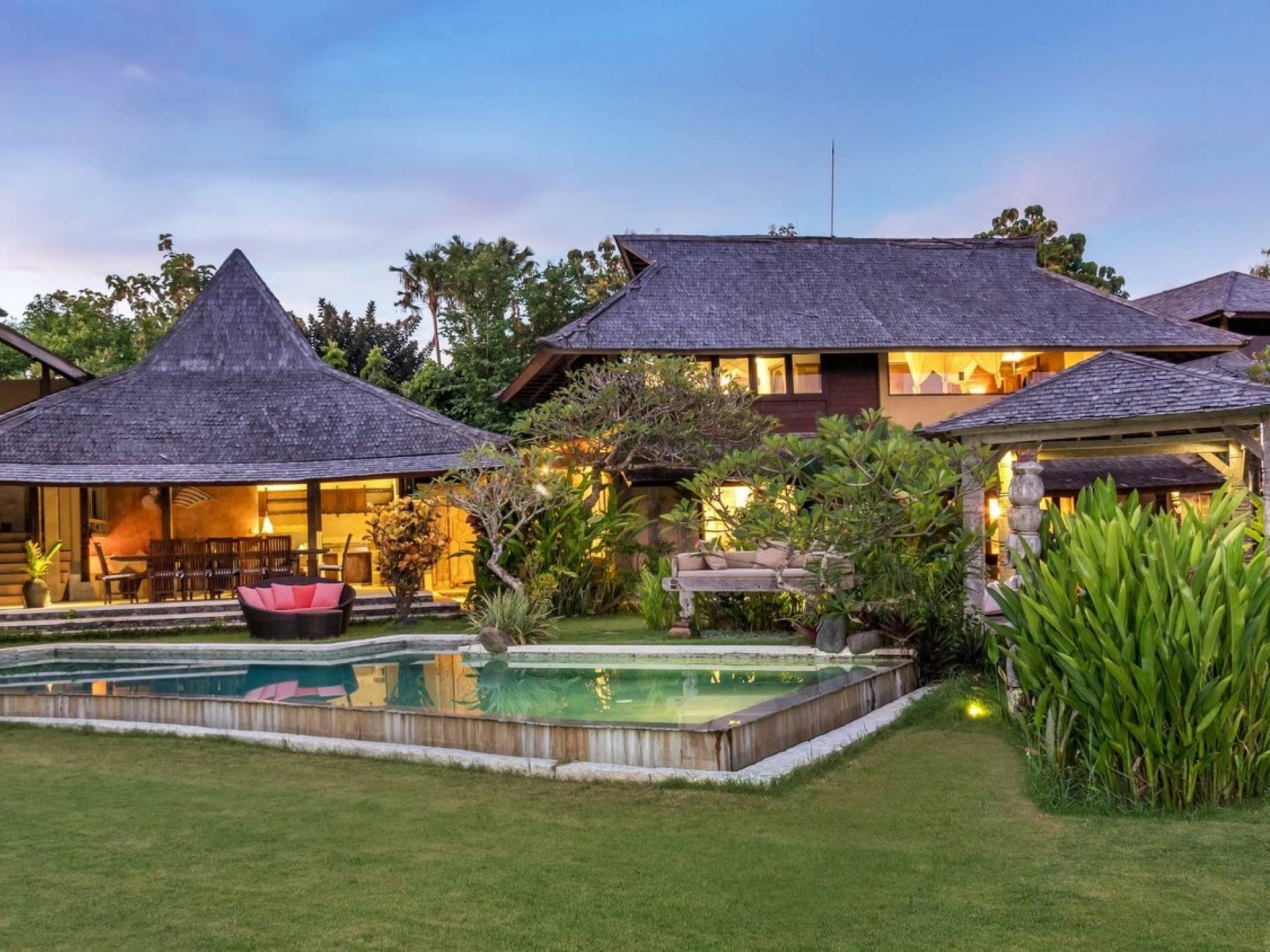 Just meters away from the beach and La Laguna Beach Club, in the hip and trendy Berawa area of Canggu, awaits this amazing, gigantic 11-bedroom paradise retreat. A place that makes tropical holiday dreams come true with its expansive lush green garden and the gorgeous traditional Indonesian pavilions scattered around on the manicured lawns that surround the glistening private swimming pools of Bunga Desa Estate. Ruled by an abundance of space, verdant tropical greenery, ancient teak wood, traditional artwork, and modern luxury facilities, everyone will love staying here.