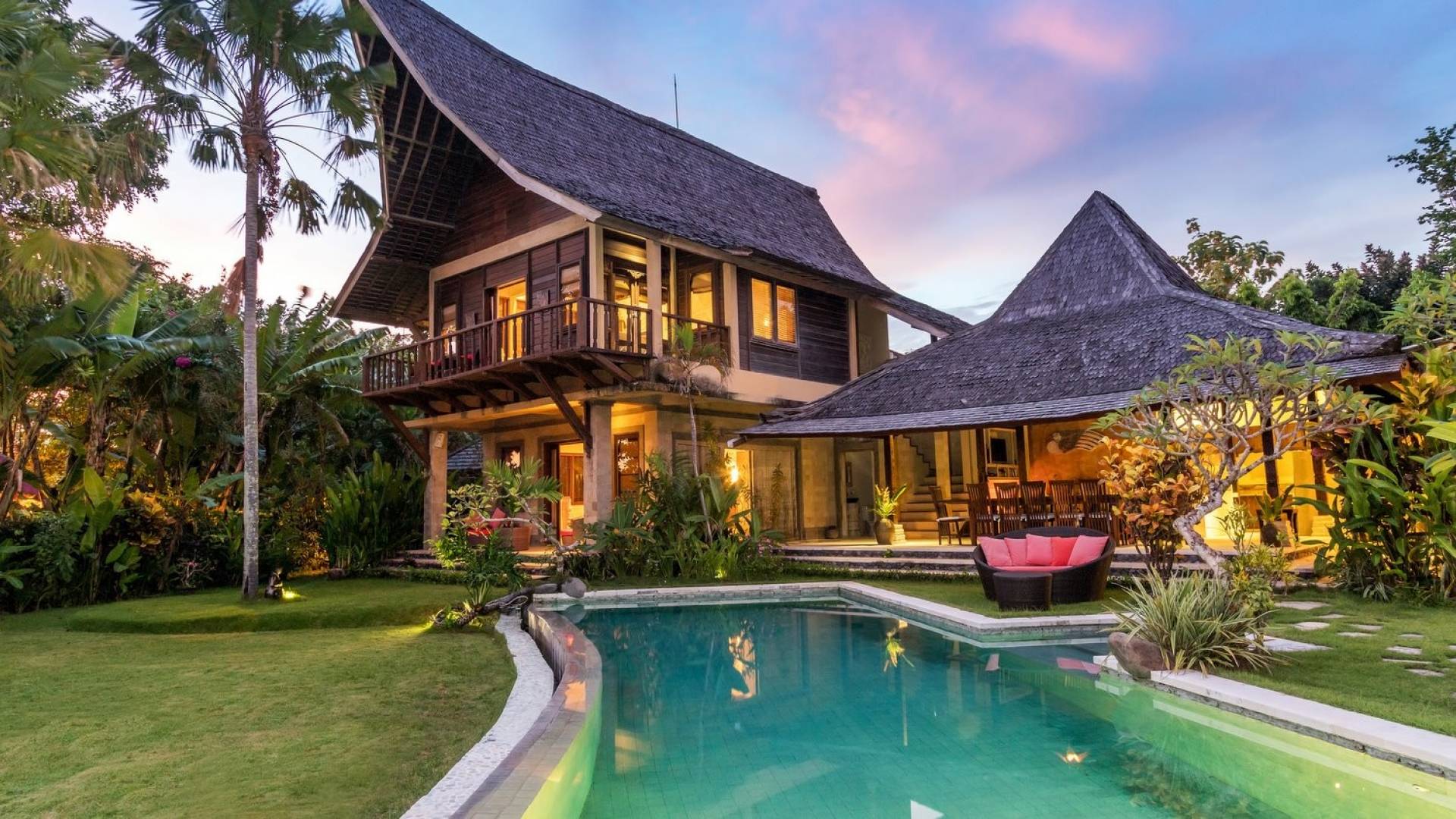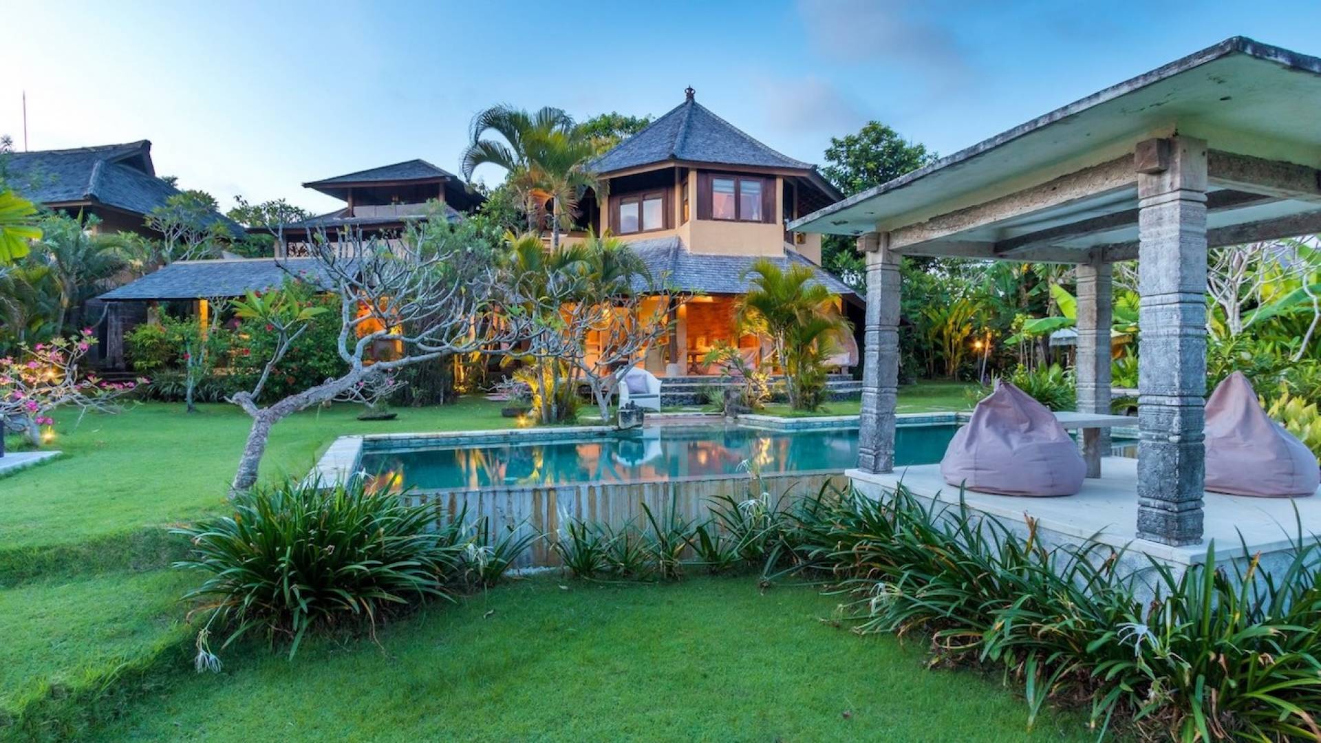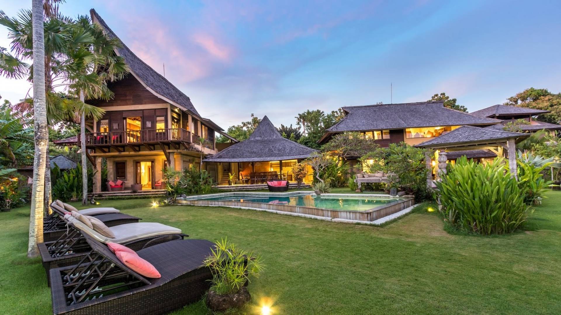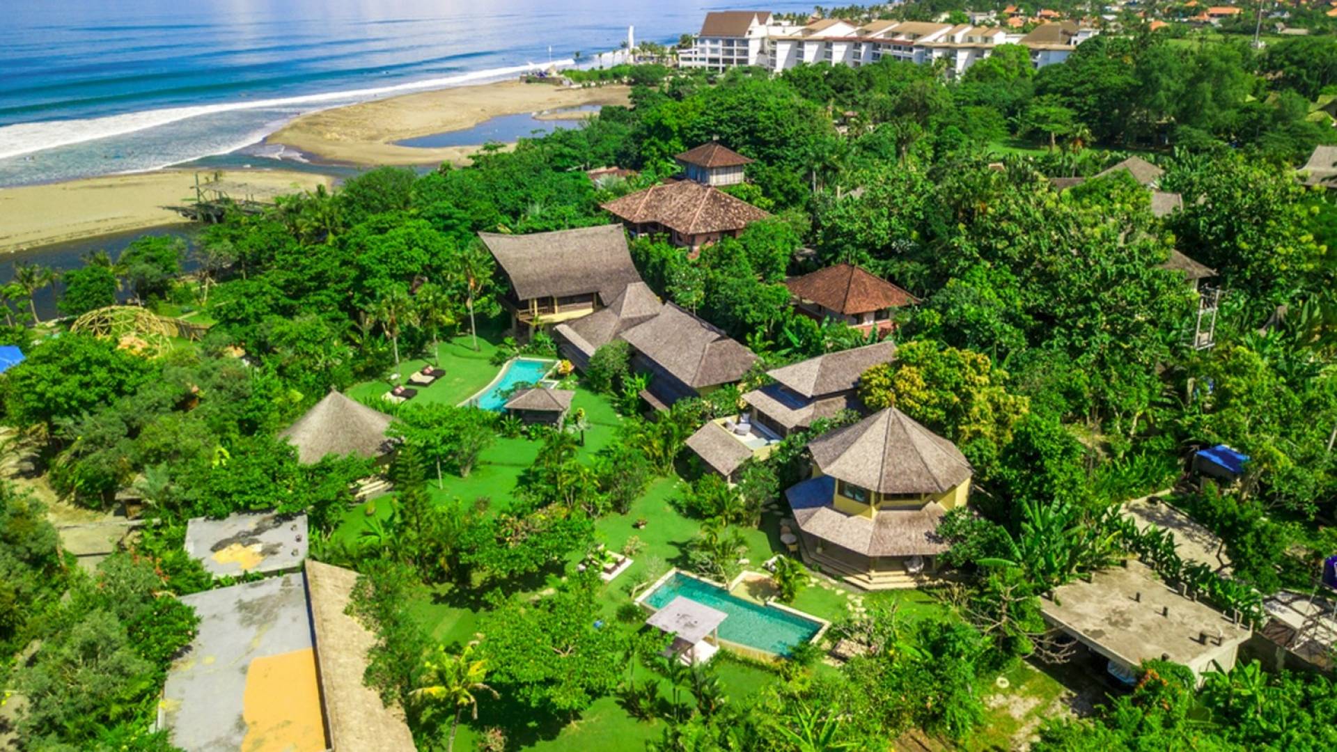 Just meters away from the beach and La Laguna Beach Club, in the hip and trendy Berawa area of Canggu, awaits this amazing, gigantic 11-bedroom paradise retreat. A place that makes tropical holiday dreams come true with its expansive lush green garden and the gorgeous traditional Indonesian pavilions scattered around on the manicured lawns that surround the glistening private swimming pools of Bunga Desa Estate. Ruled by an abundance of space, verdant tropical greenery, ancient teak wood, traditional artwork, and modern luxury facilities, everyone will love staying here.