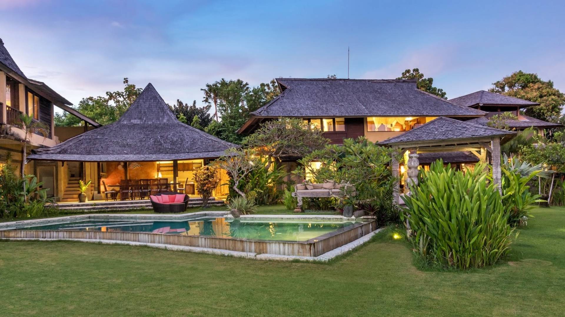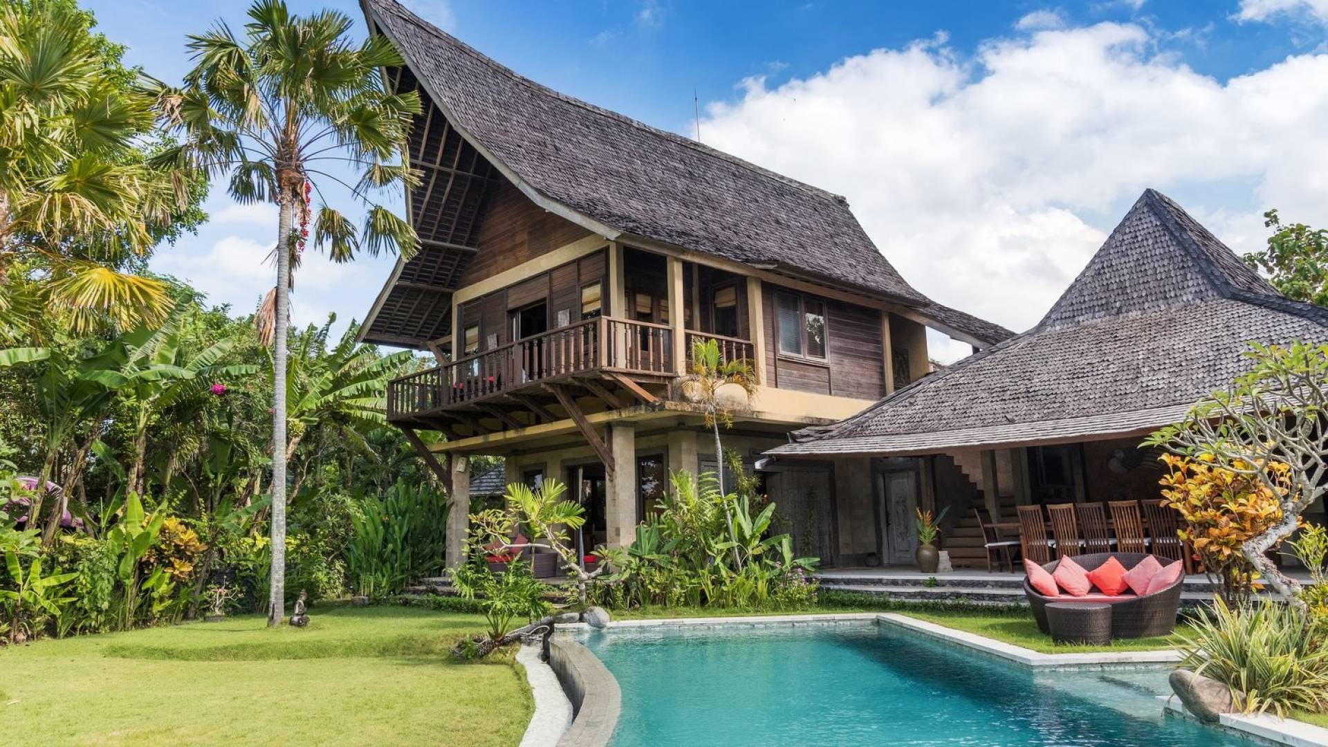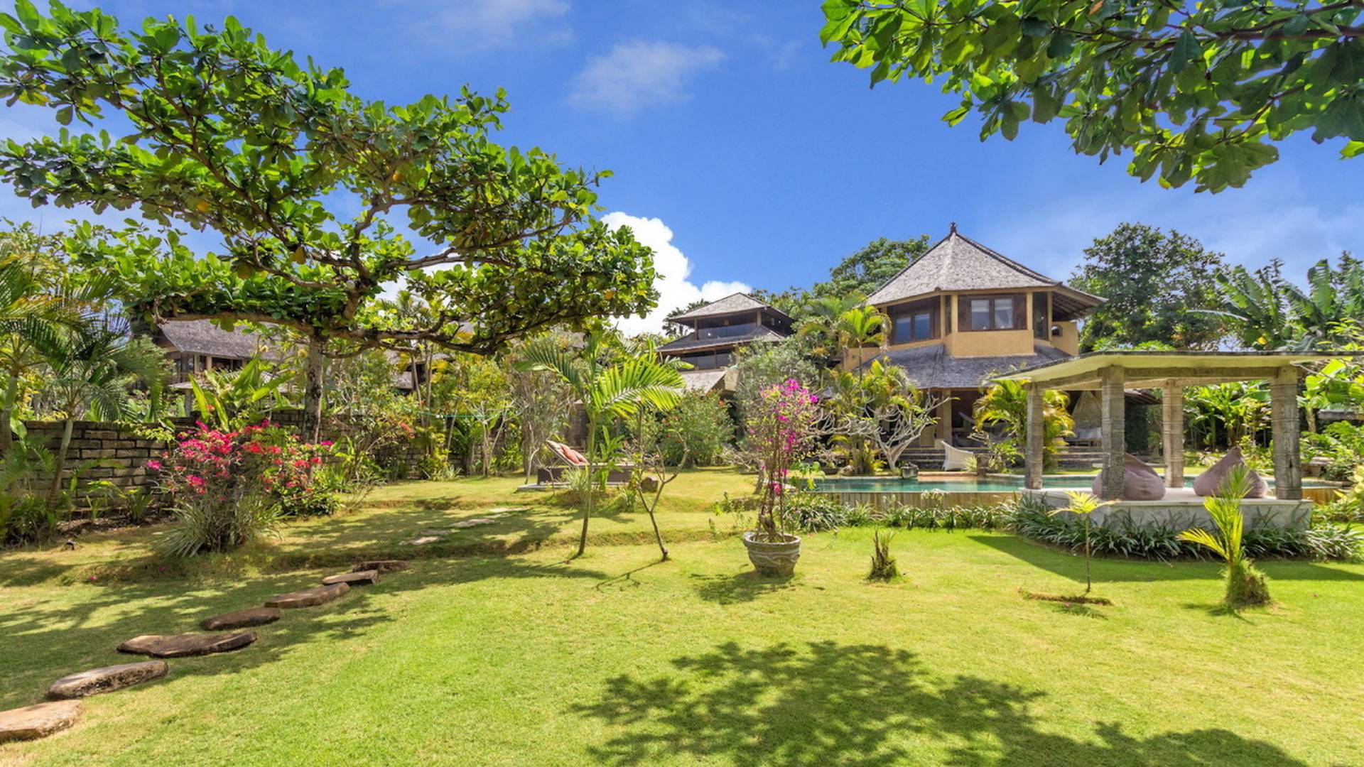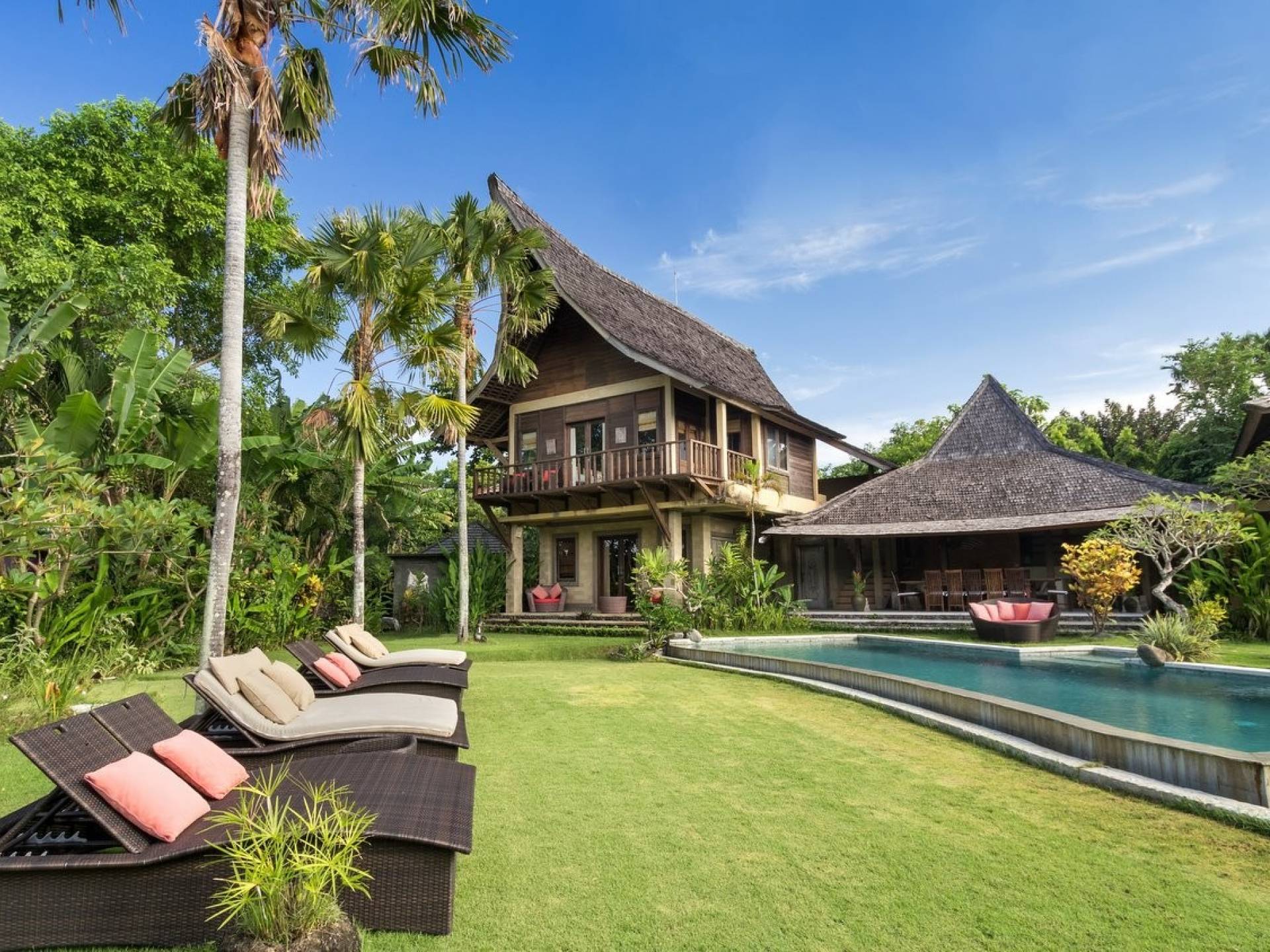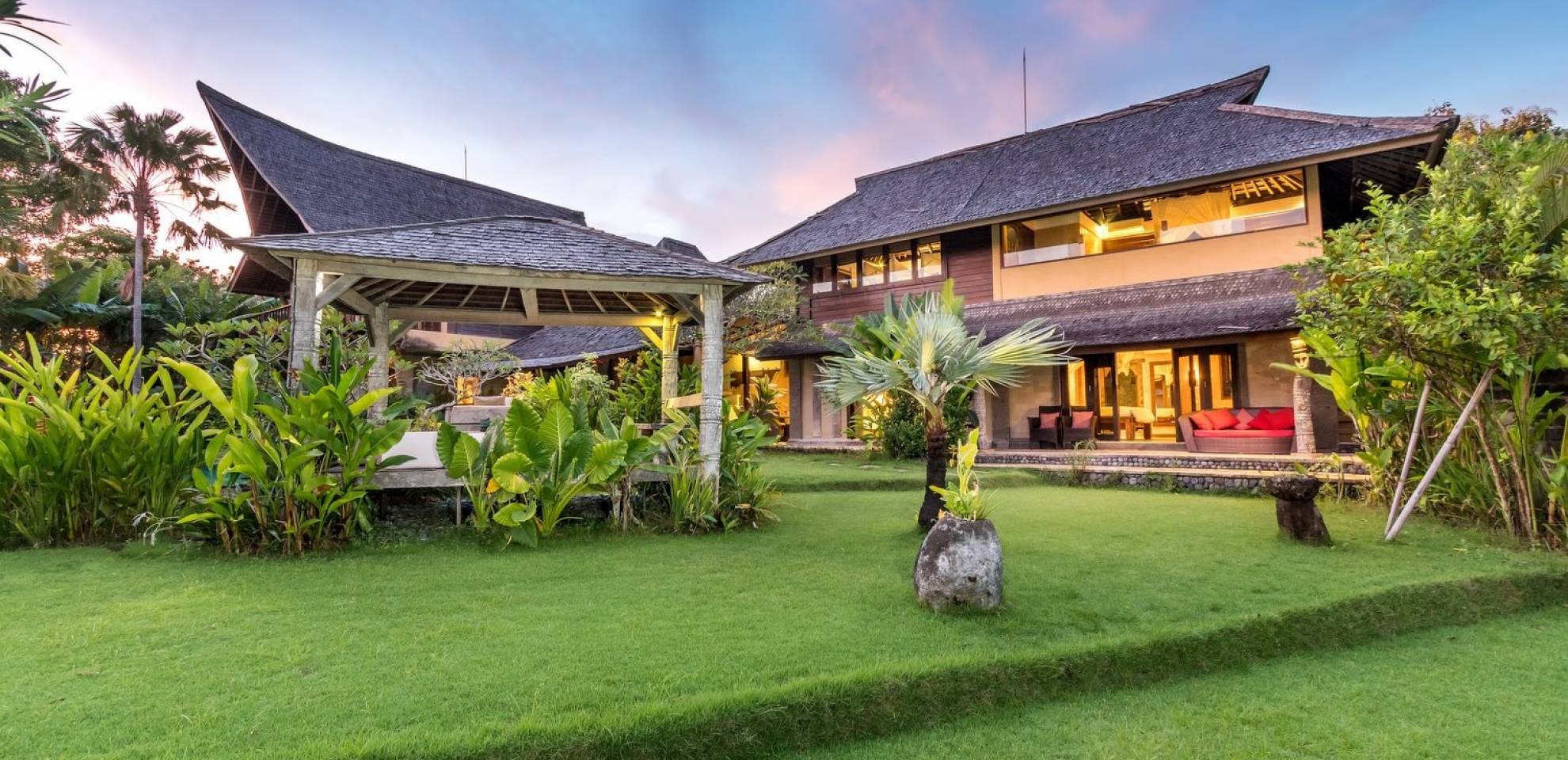 Just meters away from the beach and La Laguna Beach Club, in the hip and trendy Berawa area of Canggu, awaits this amazing, gigantic 11-bedroom paradise retreat. A place that makes tropical holiday dreams come true with its expansive lush green garden and the gorgeous traditional Indonesian pavilions scattered around on the manicured lawns that surround the glistening private swimming pools of Bunga Desa Estate. Ruled by an abundance of space, verdant tropical greenery, ancient teak wood, traditional artwork, and modern luxury facilities, everyone will love staying here.