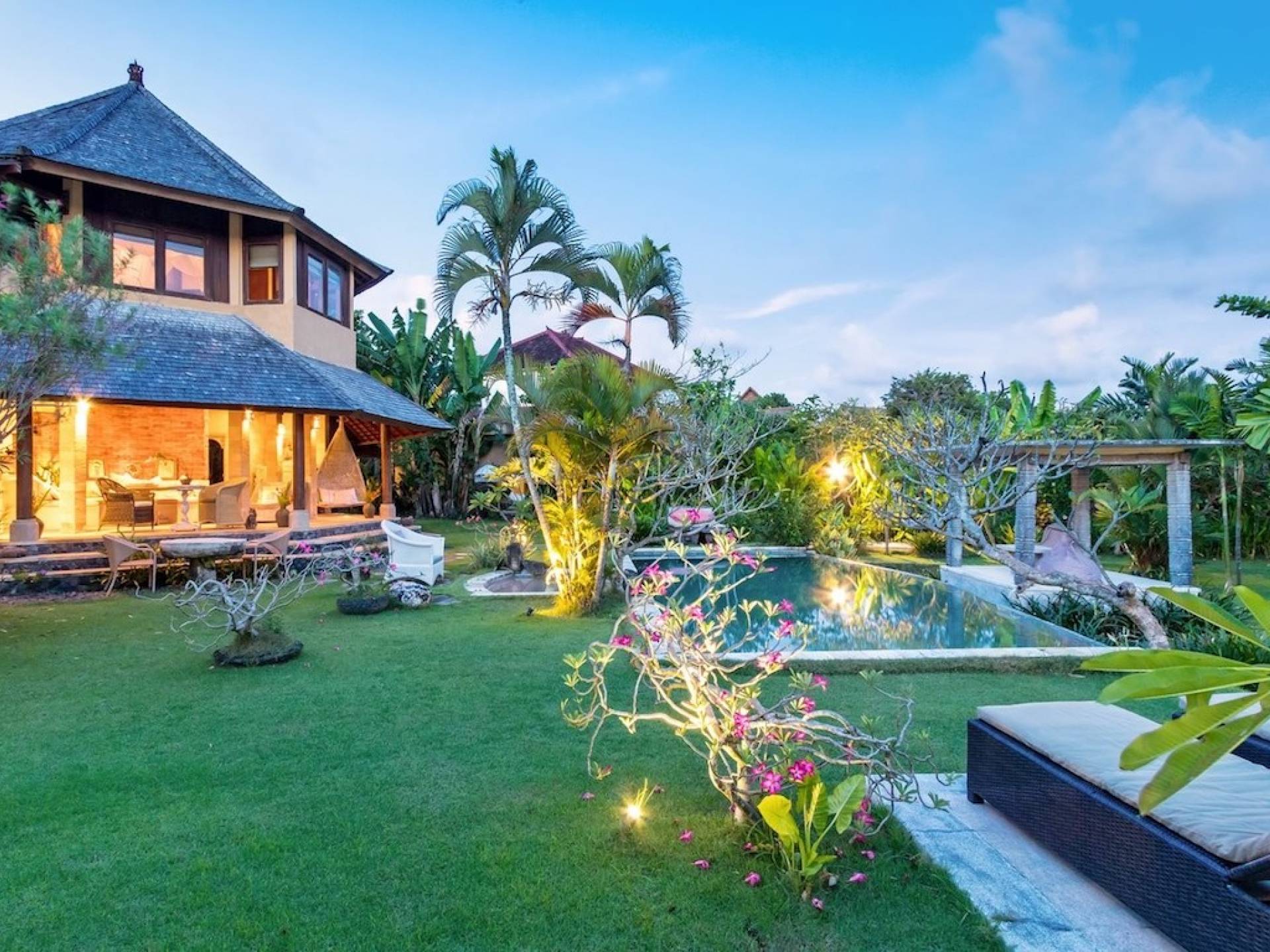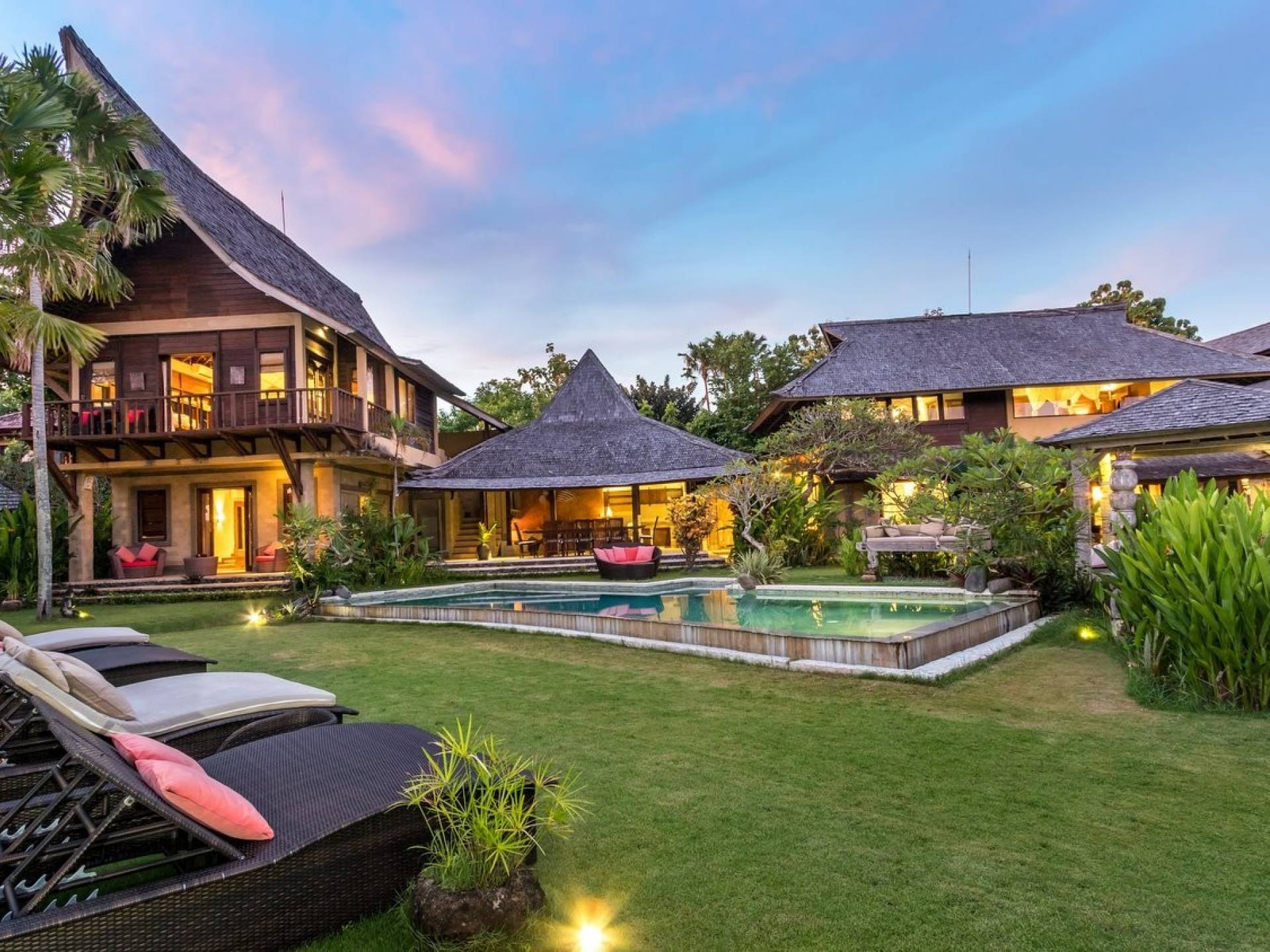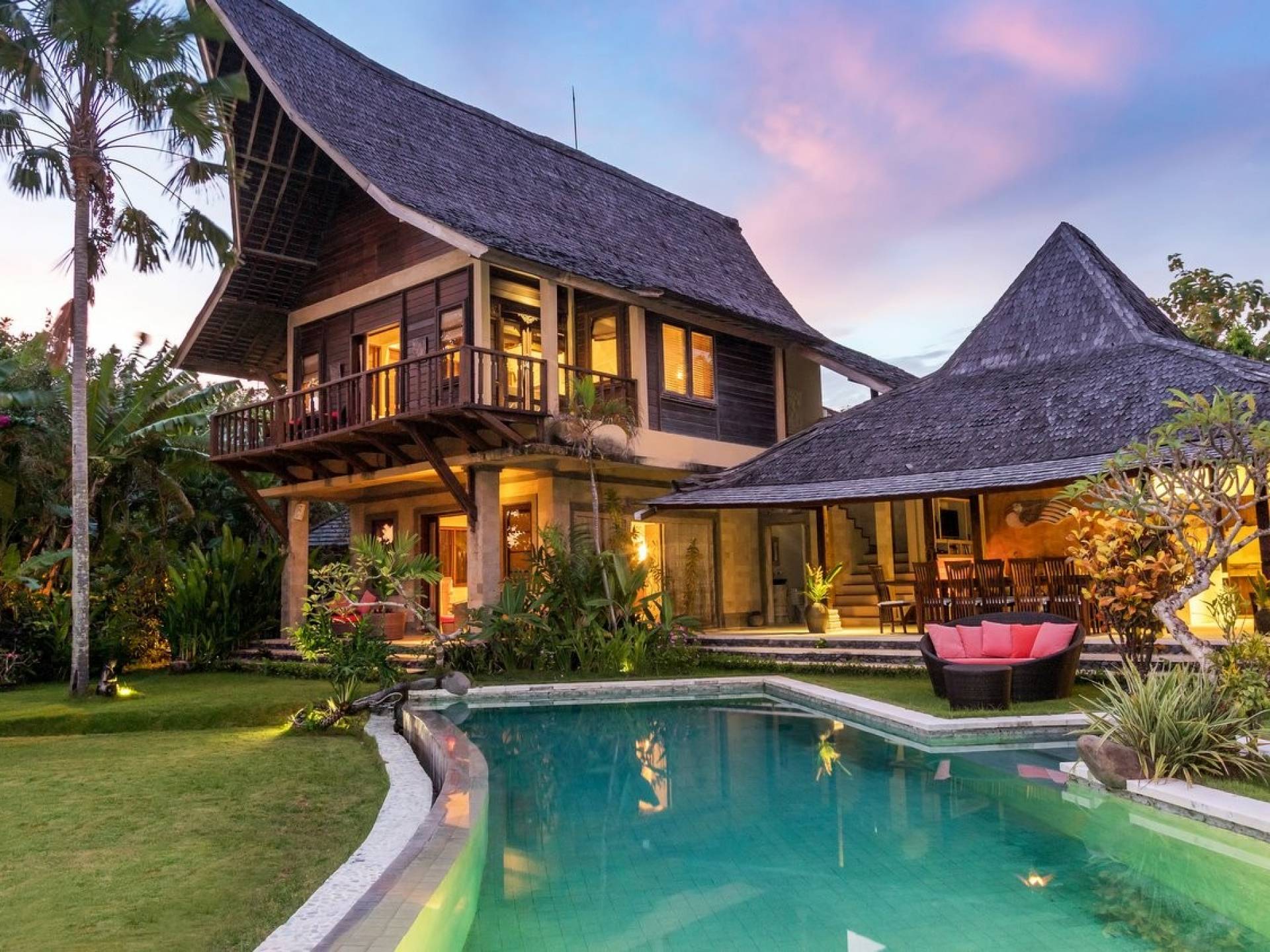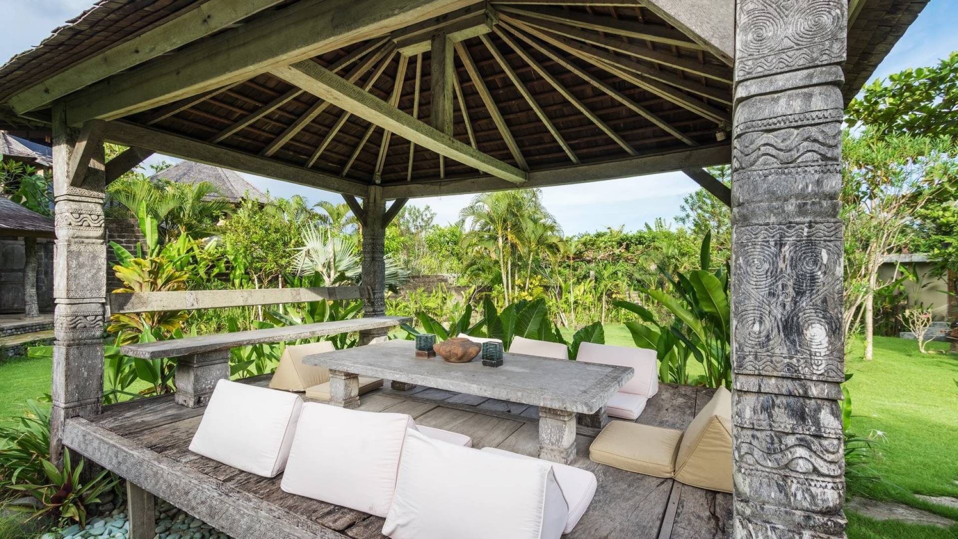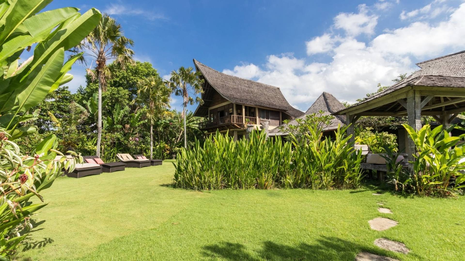 Just meters away from the beach and La Laguna Beach Club, in the hip and trendy Berawa area of Canggu, awaits this amazing, gigantic 11-bedroom paradise retreat. A place that makes tropical holiday dreams come true with its expansive lush green garden and the gorgeous traditional Indonesian pavilions scattered around on the manicured lawns that surround the glistening private swimming pools of Bunga Desa Estate. Ruled by an abundance of space, verdant tropical greenery, ancient teak wood, traditional artwork, and modern luxury facilities, everyone will love staying here.