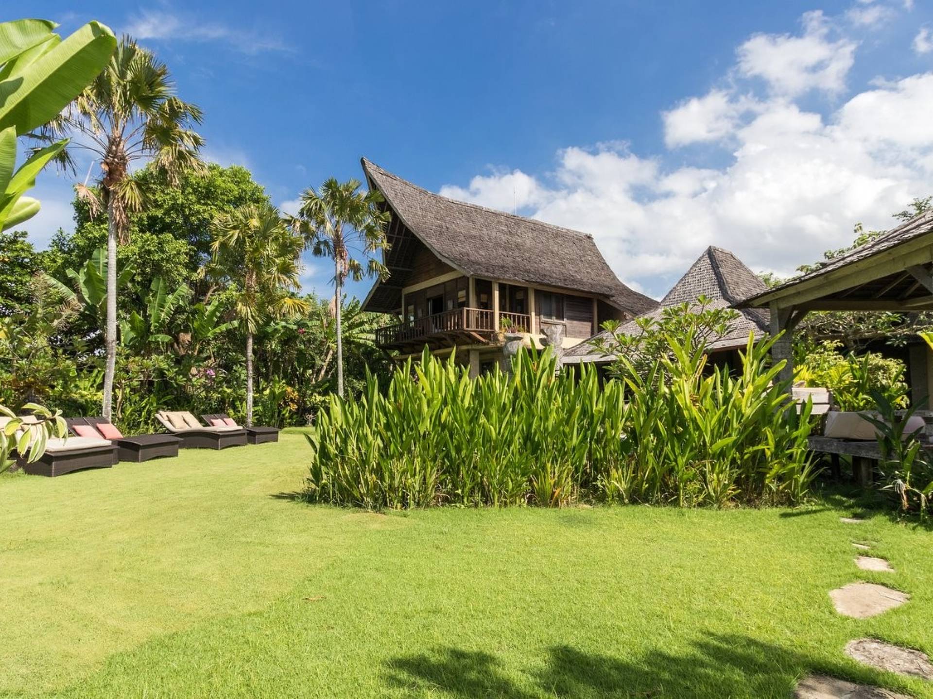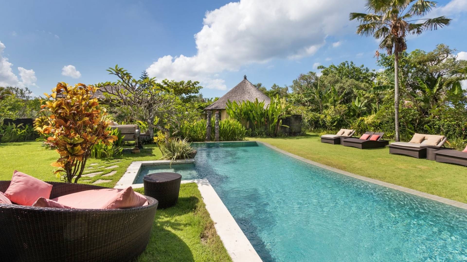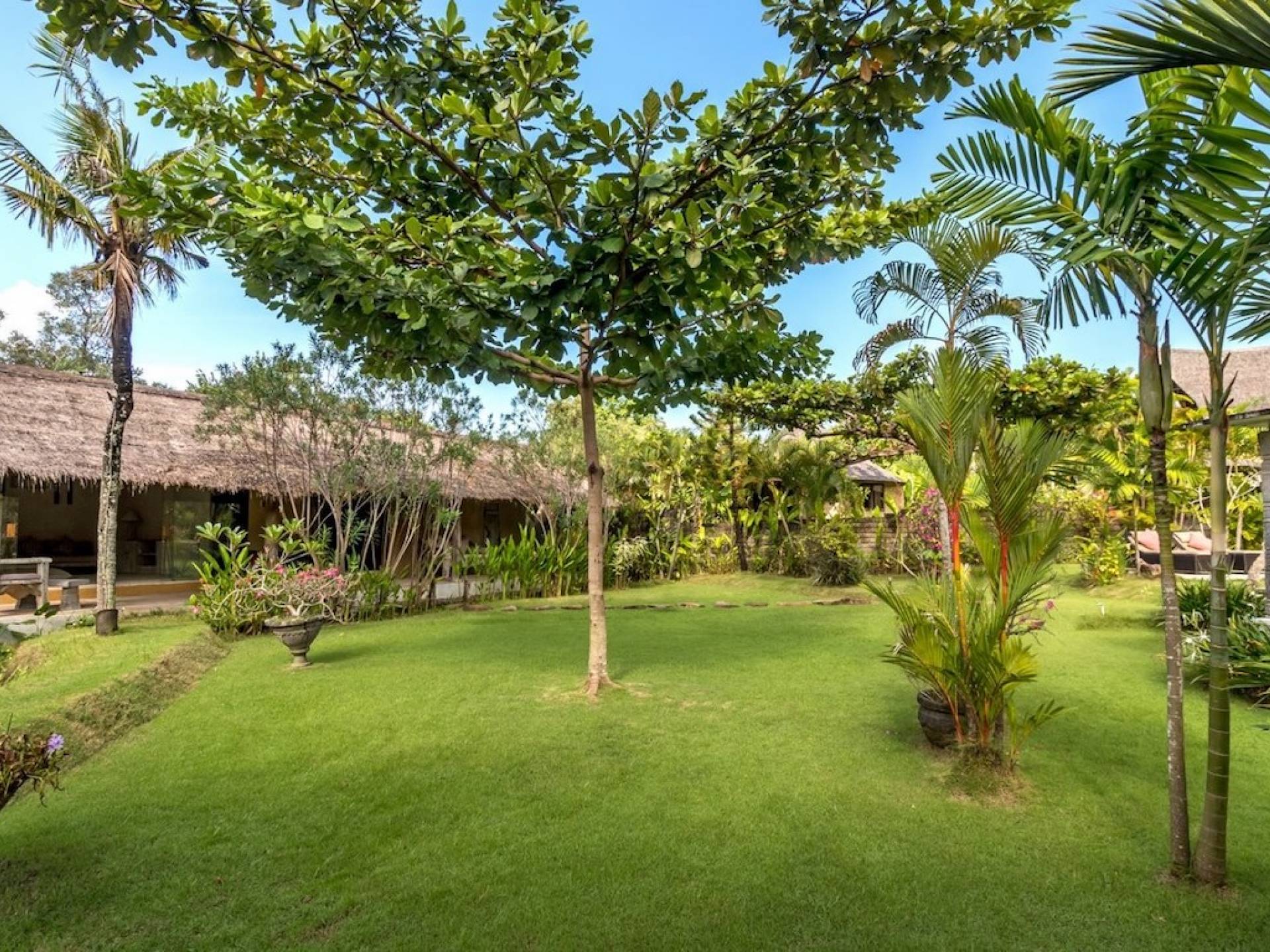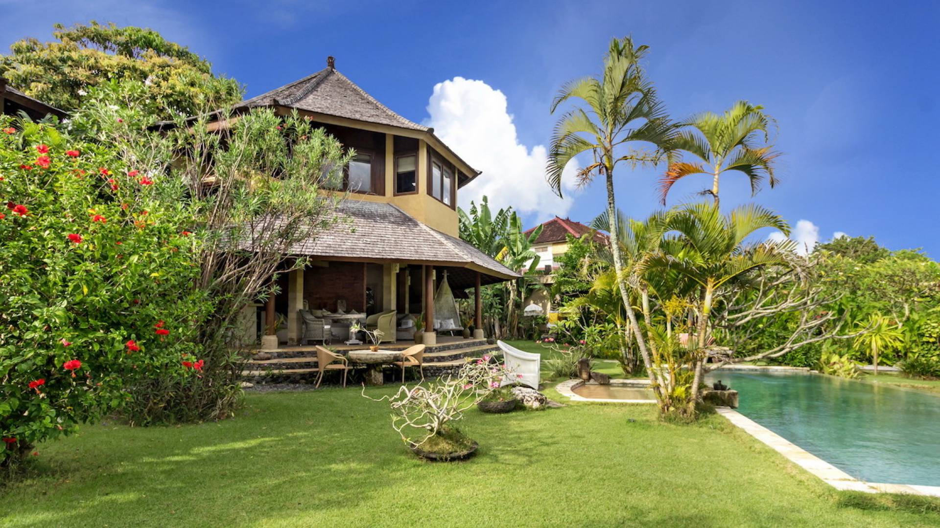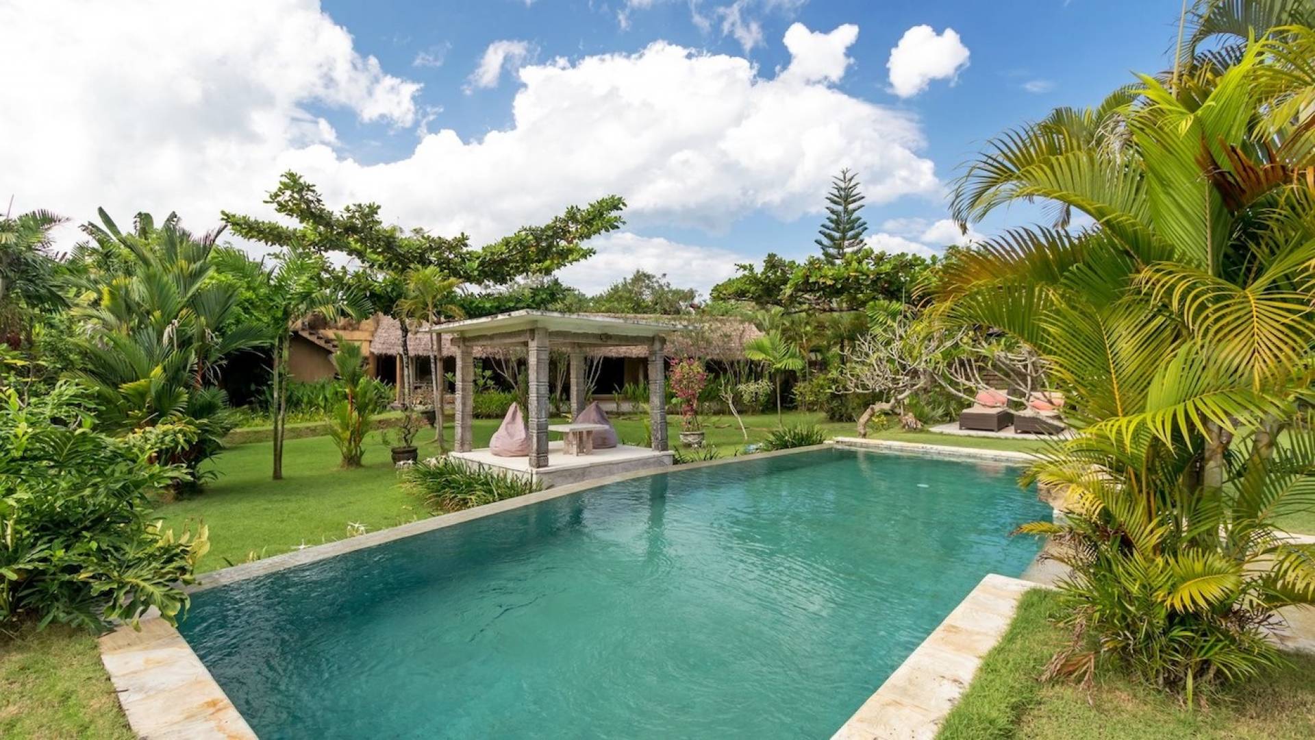 Just meters away from the beach and La Laguna Beach Club, in the hip and trendy Berawa area of Canggu, awaits this amazing, gigantic 11-bedroom paradise retreat. A place that makes tropical holiday dreams come true with its expansive lush green garden and the gorgeous traditional Indonesian pavilions scattered around on the manicured lawns that surround the glistening private swimming pools of Bunga Desa Estate. Ruled by an abundance of space, verdant tropical greenery, ancient teak wood, traditional artwork, and modern luxury facilities, everyone will love staying here.