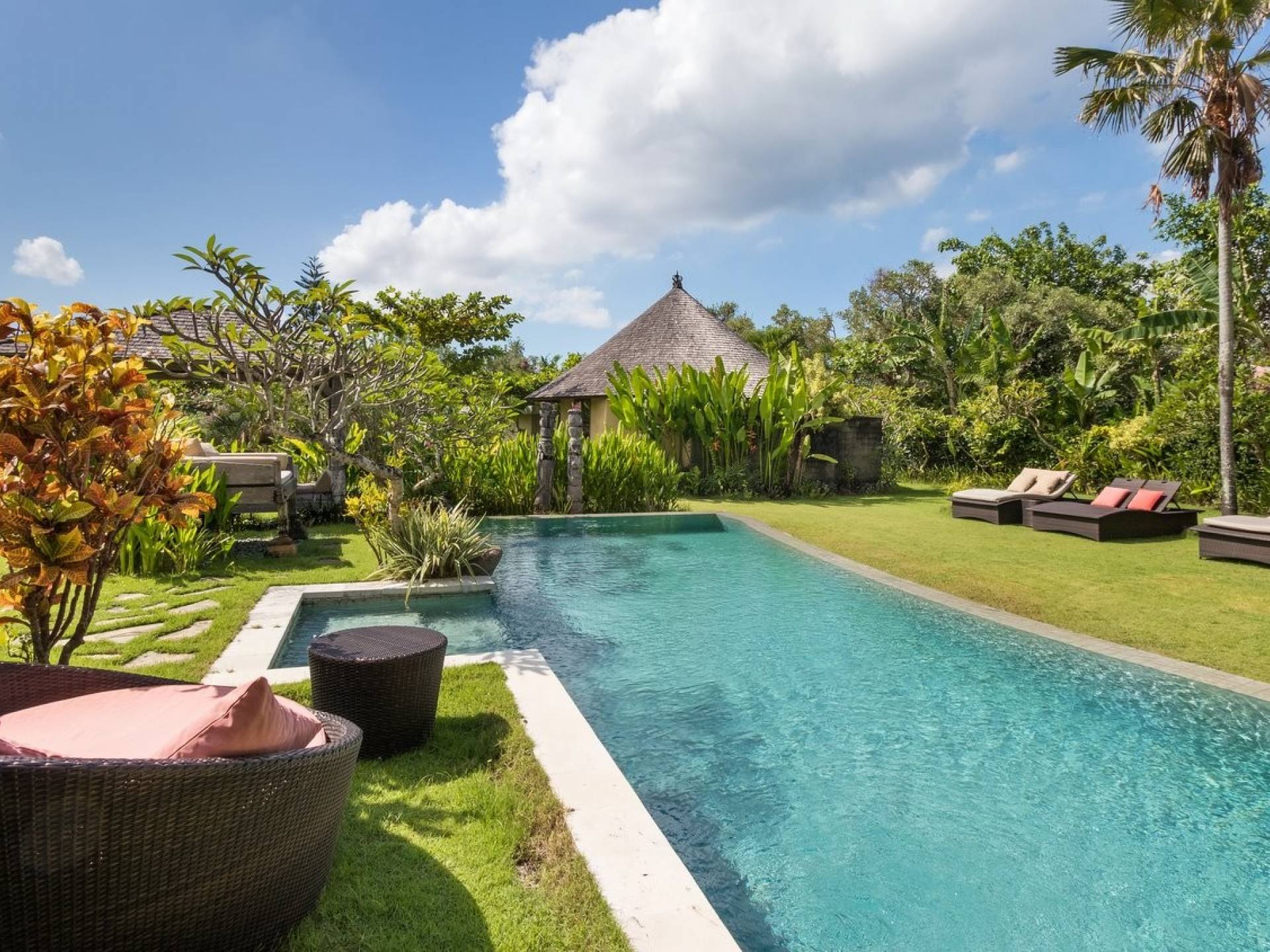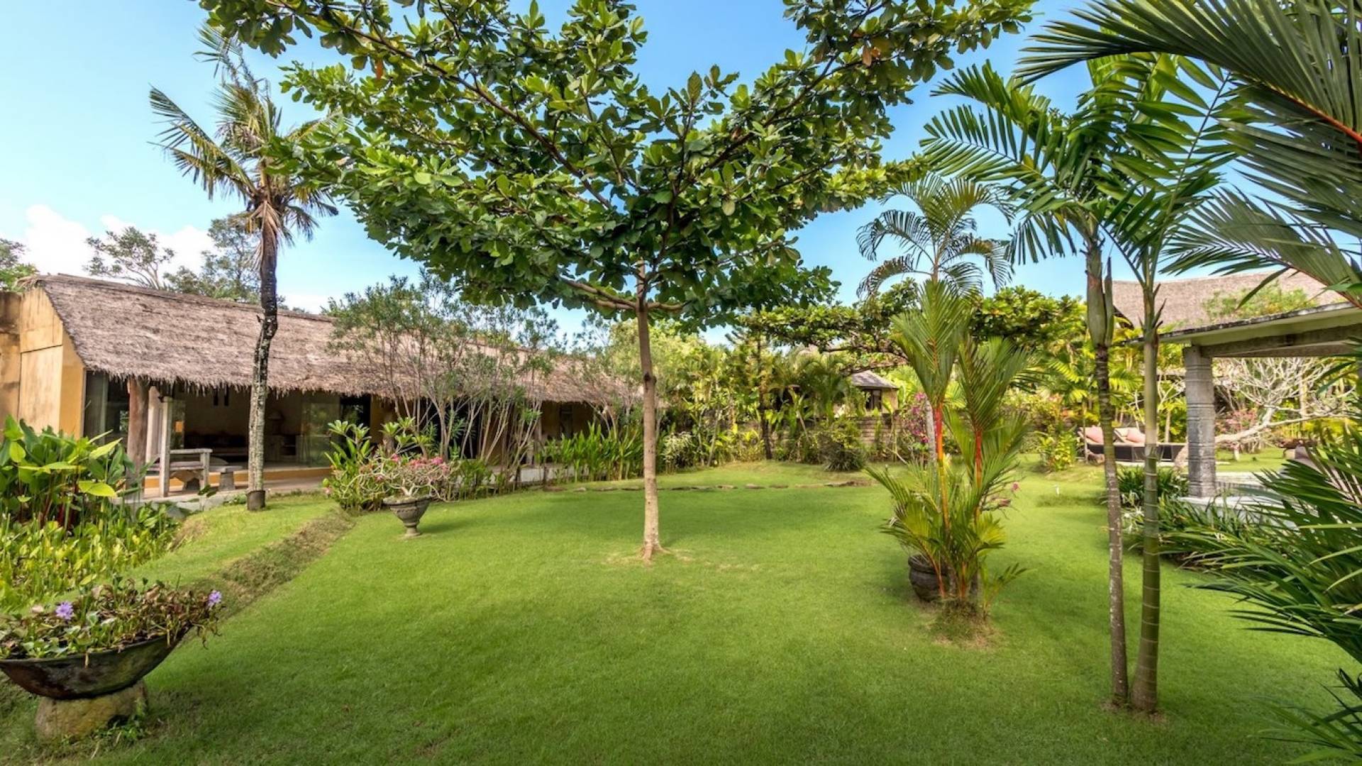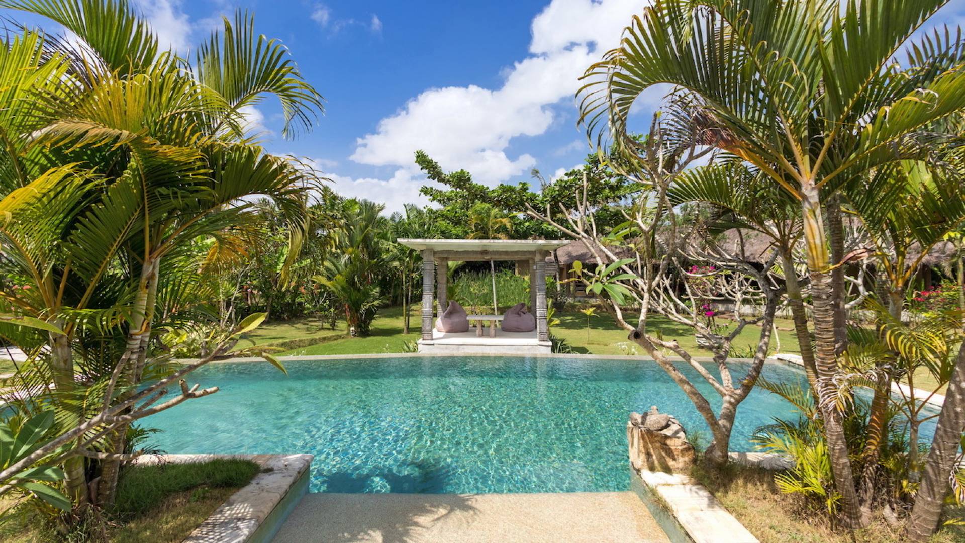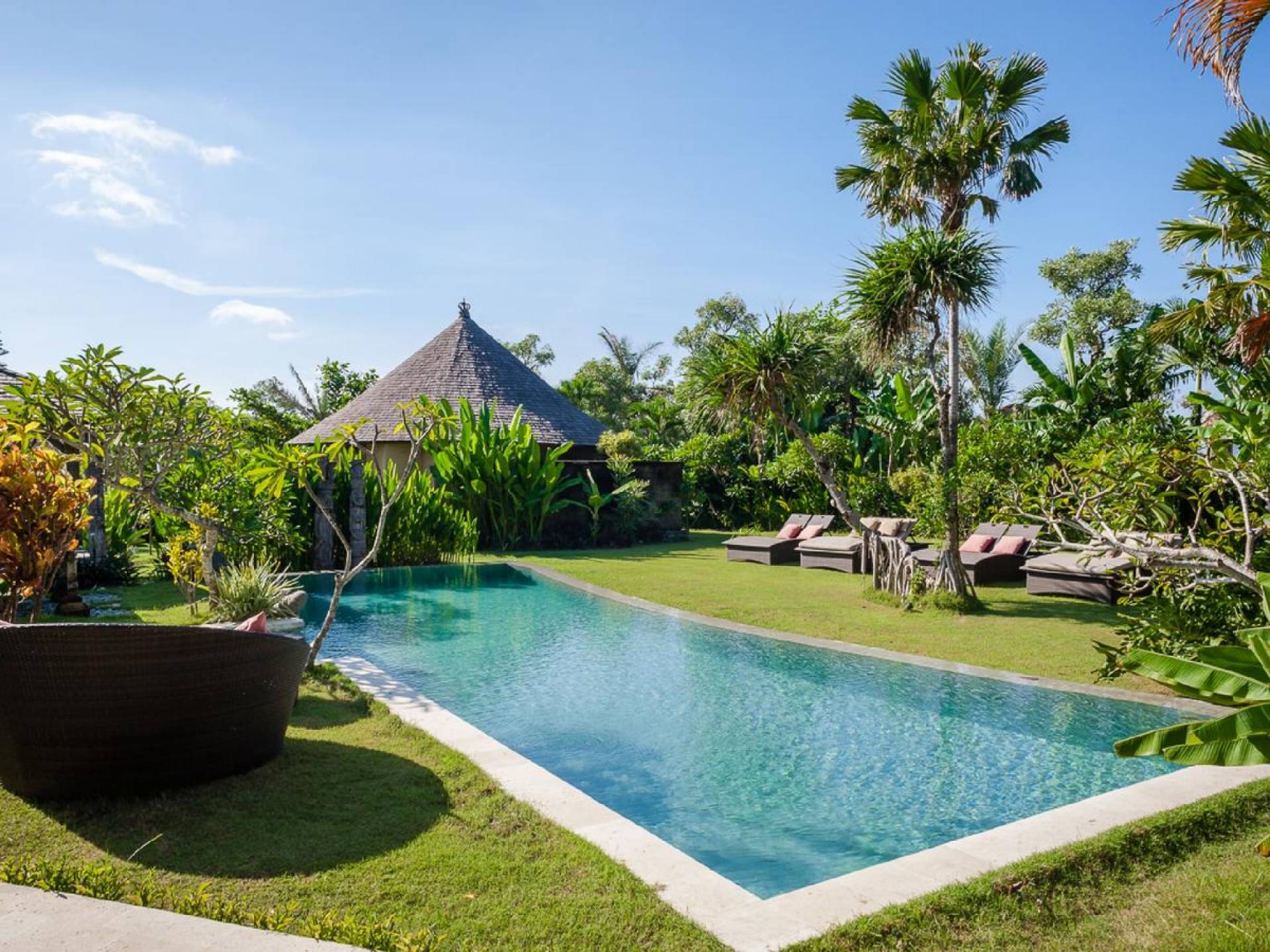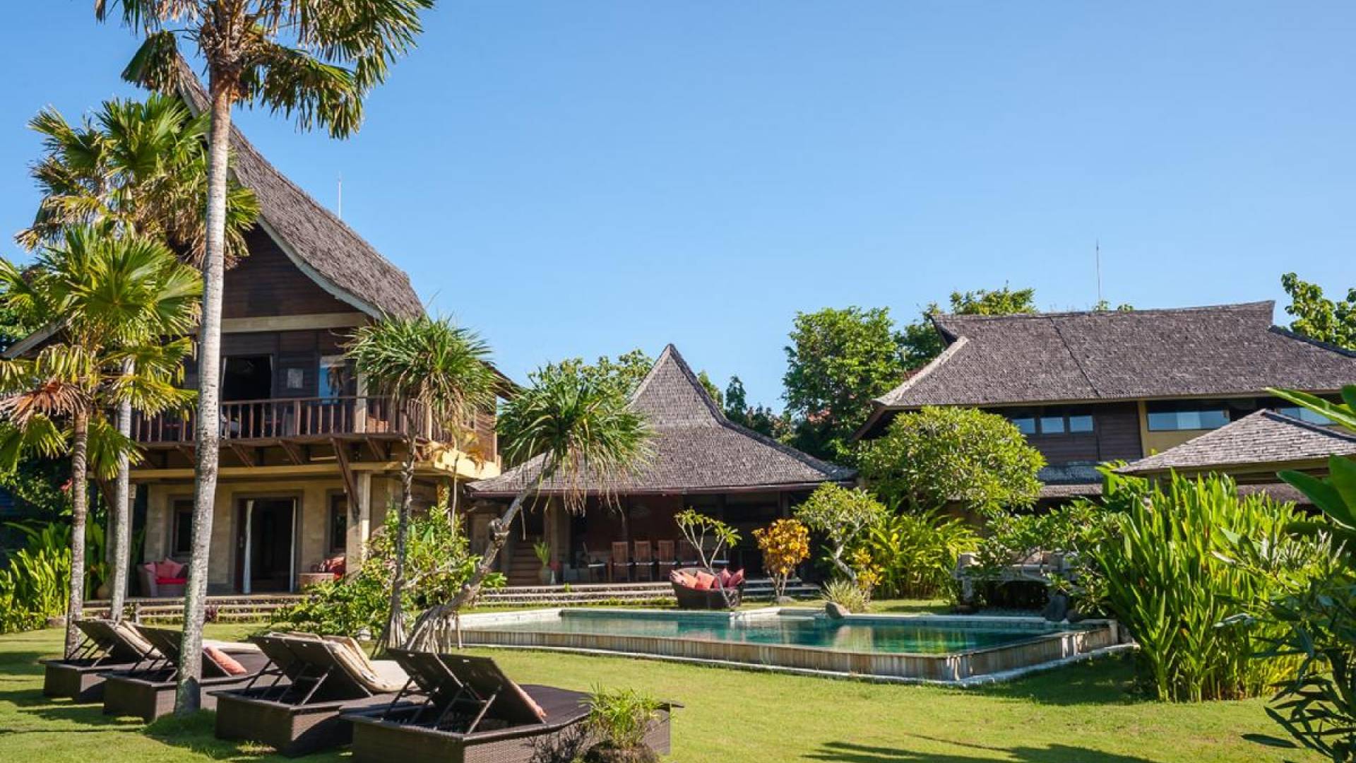 Just meters away from the beach and La Laguna Beach Club, in the hip and trendy Berawa area of Canggu, awaits this amazing, gigantic 11-bedroom paradise retreat. A place that makes tropical holiday dreams come true with its expansive lush green garden and the gorgeous traditional Indonesian pavilions scattered around on the manicured lawns that surround the glistening private swimming pools of Bunga Desa Estate. Ruled by an abundance of space, verdant tropical greenery, ancient teak wood, traditional artwork, and modern luxury facilities, everyone will love staying here.