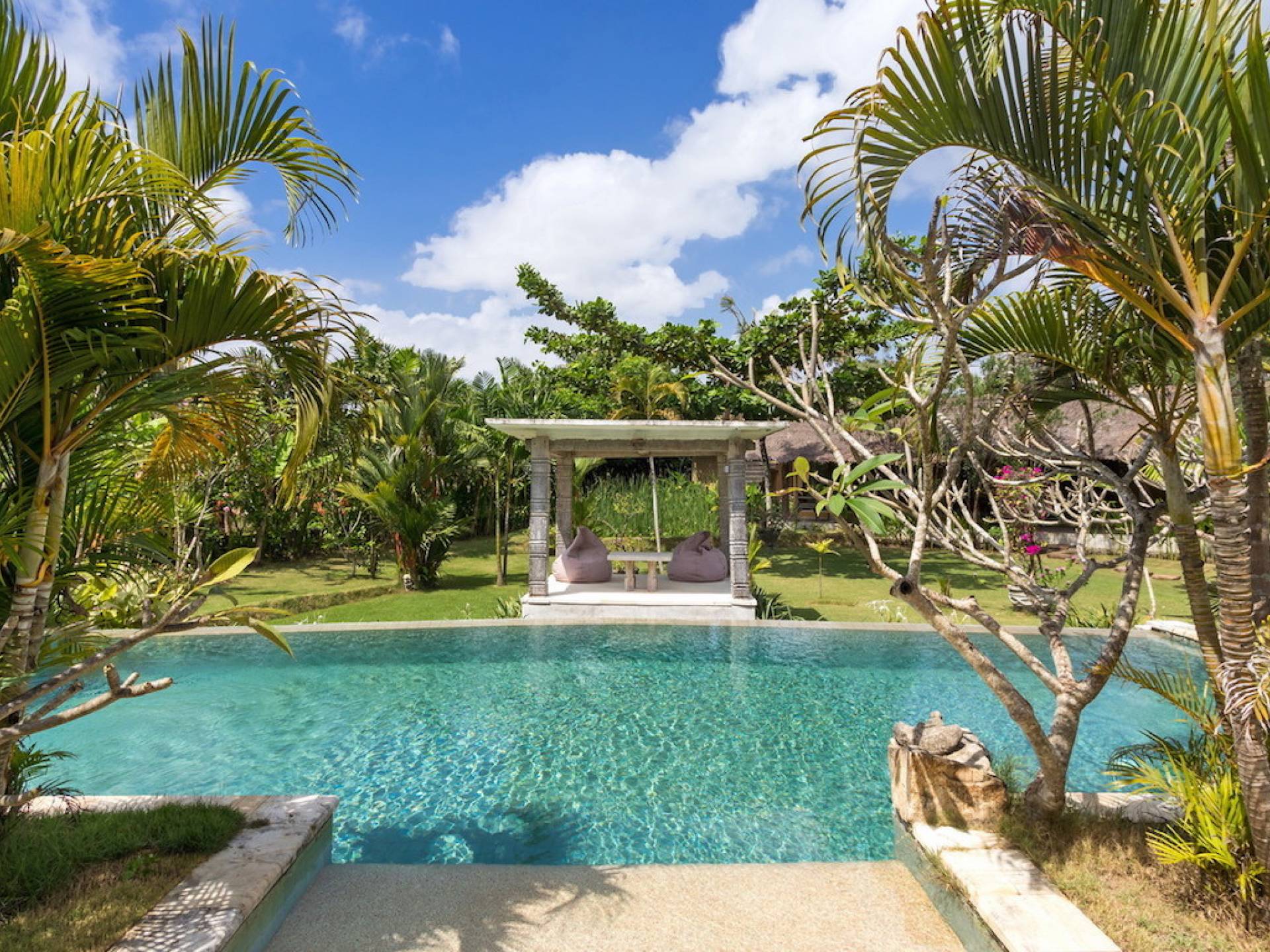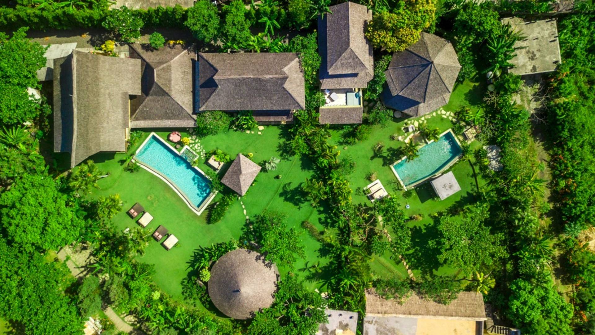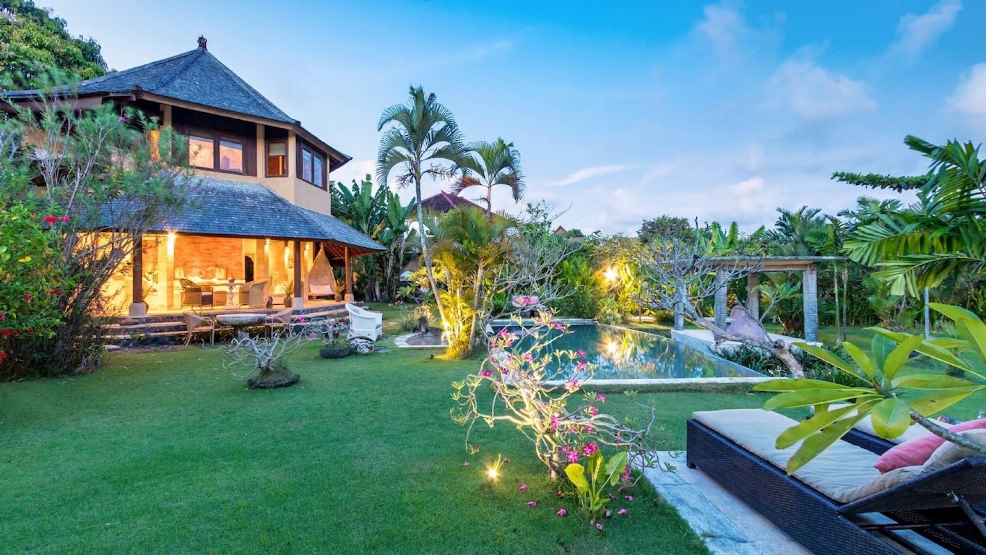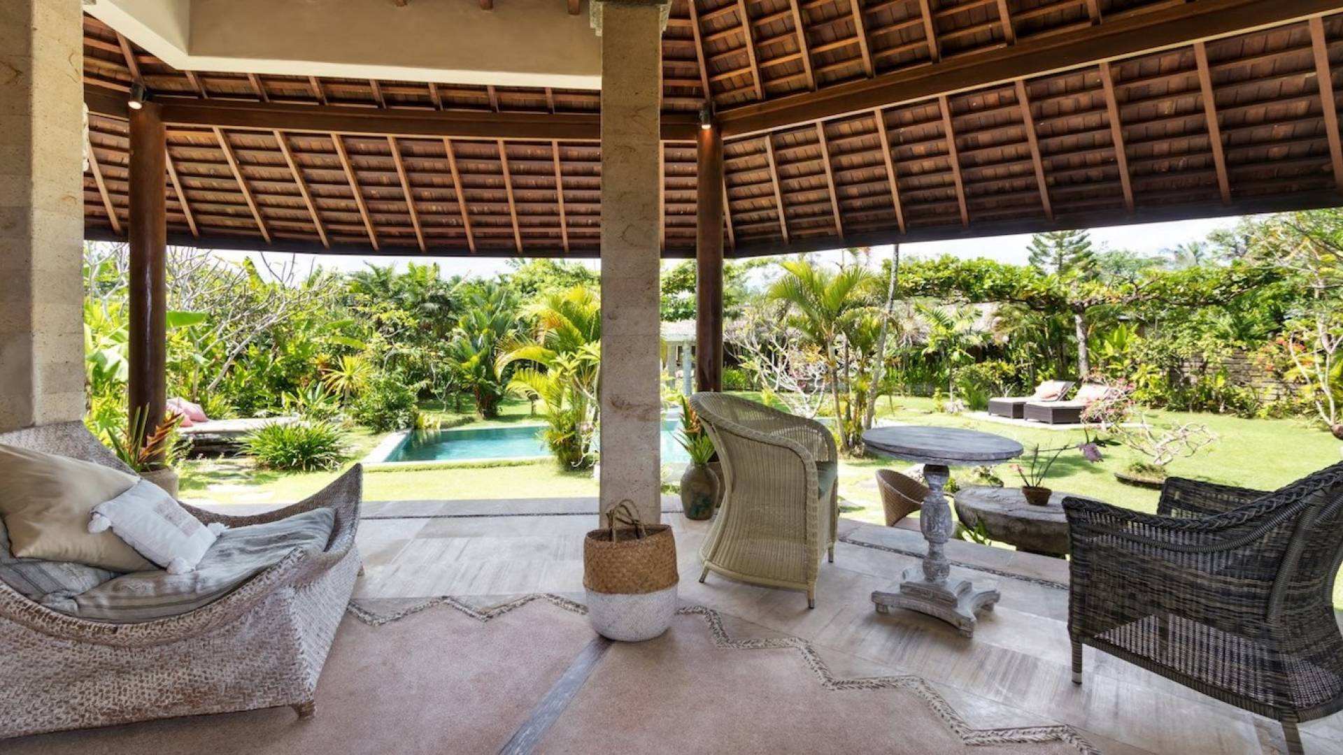 Just meters away from the beach and La Laguna Beach Club, in the hip and trendy Berawa area of Canggu, awaits this amazing, gigantic 11-bedroom paradise retreat. A place that makes tropical holiday dreams come true with its expansive lush green garden and the gorgeous traditional Indonesian pavilions scattered around on the manicured lawns that surround the glistening private swimming pools of Bunga Desa Estate. Ruled by an abundance of space, verdant tropical greenery, ancient teak wood, traditional artwork, and modern luxury facilities, everyone will love staying here.