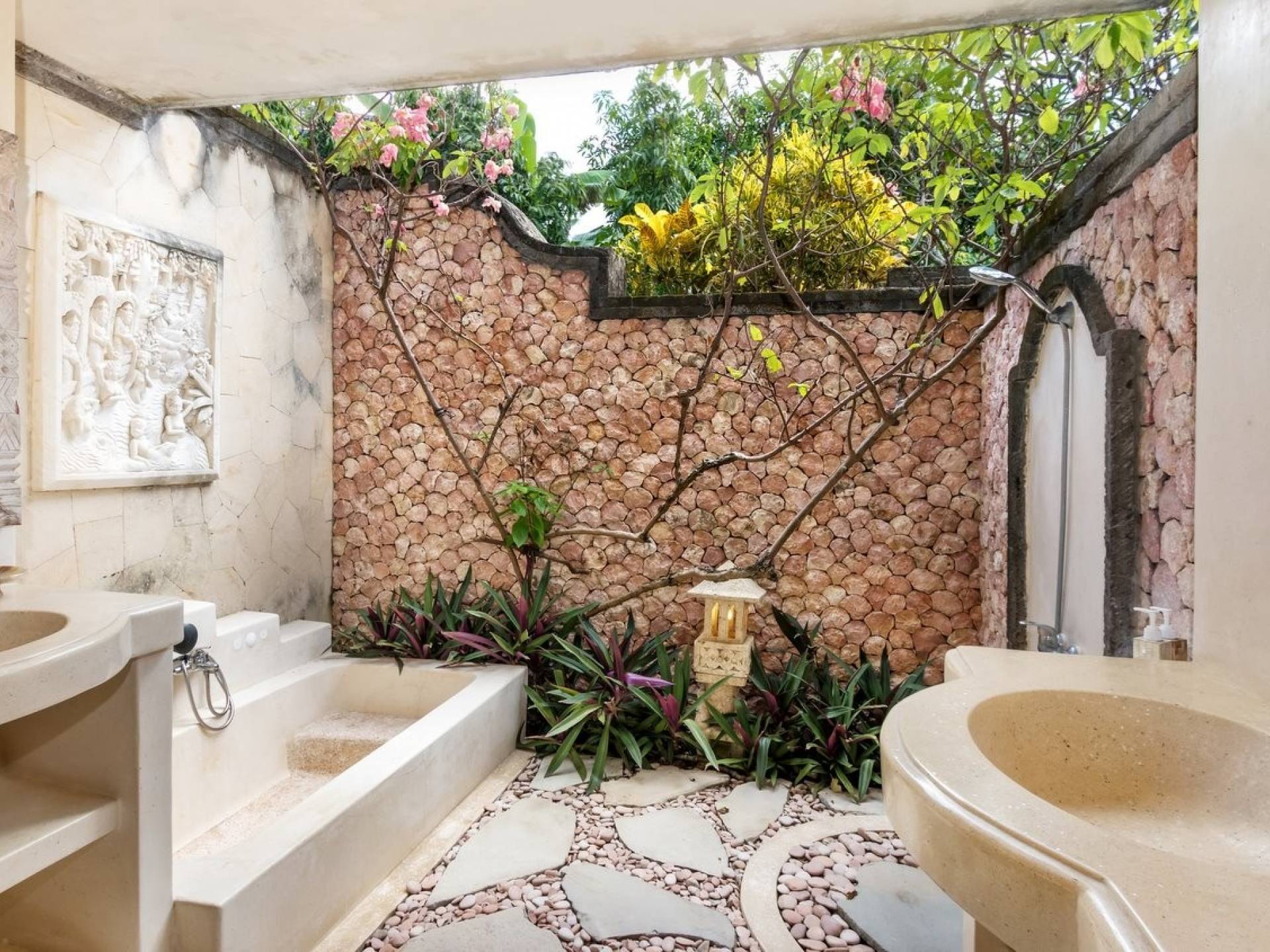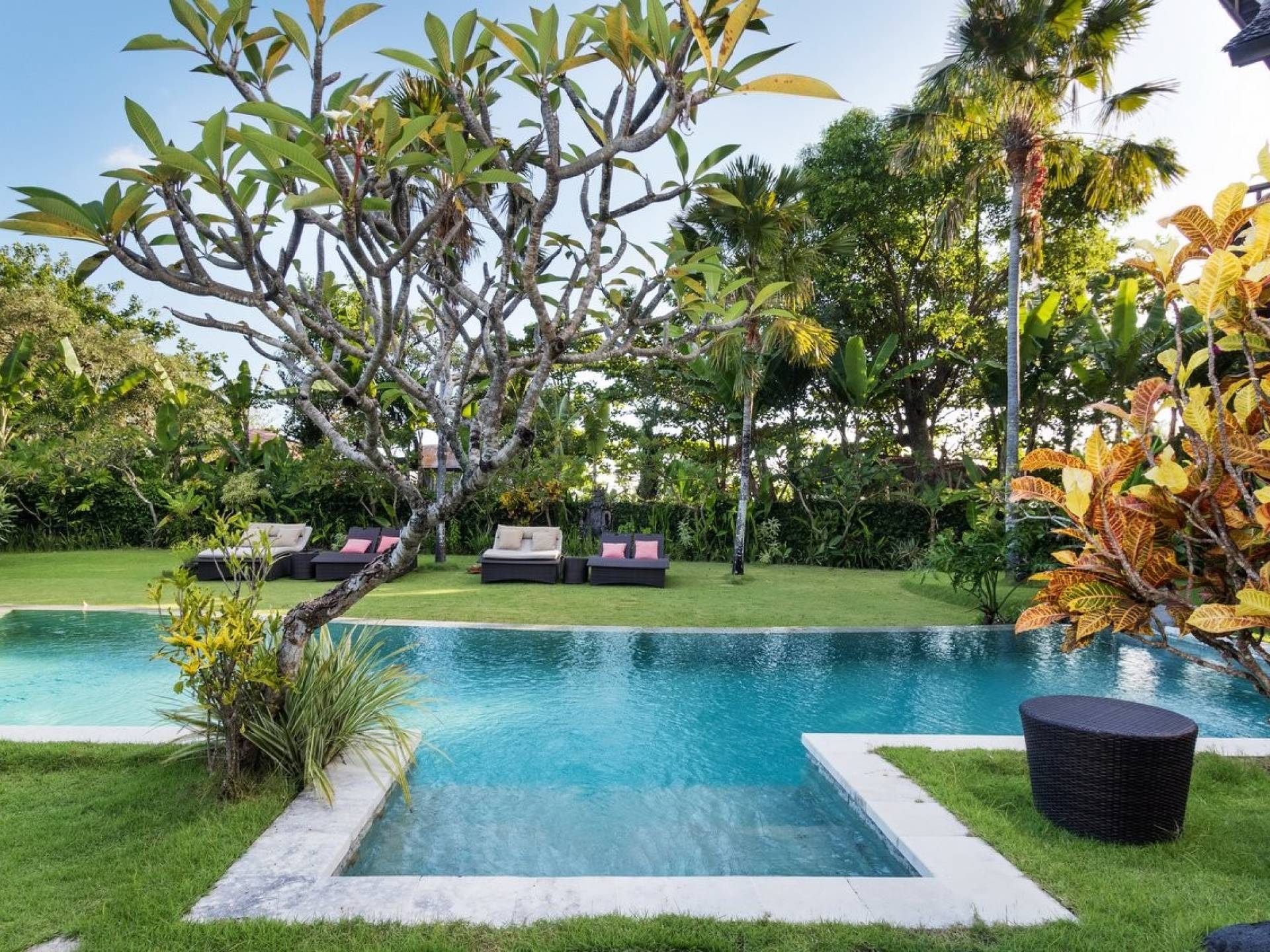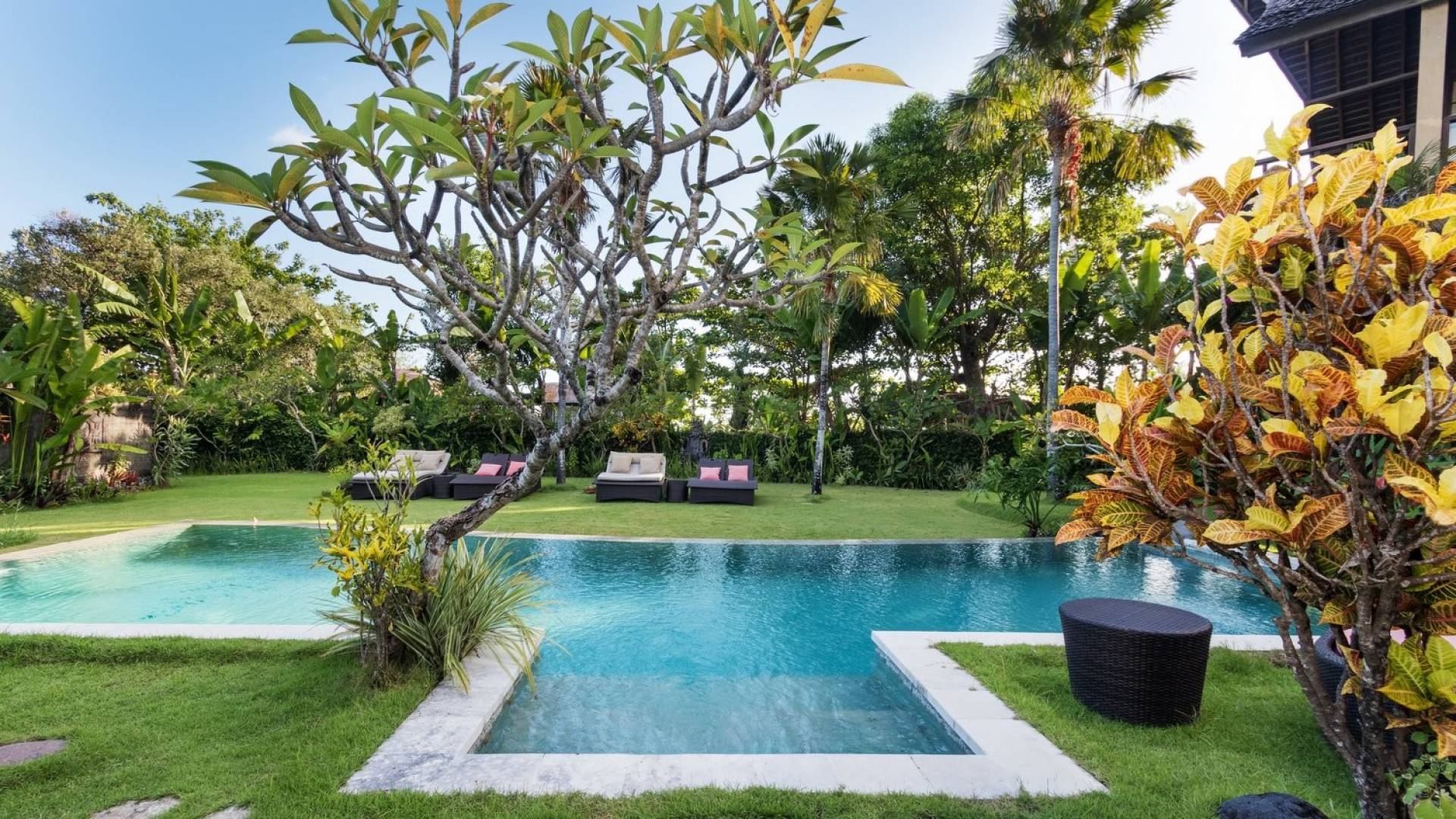 Bungadesa Estate Canggu comprises the 4-bedroom Villa Little Bunga Desa and the 7-bedroom Villa Bunga Desa. It has got 2 entrances and the two villas come together in the huge tropical garden that features 2 swimming pools, fringed by pink and yellow frangipanis. In the garden, there are plenty of reclining chairs and daybeds to soak up the sun, read a book, snooze a little, and relax all day long until the BBQ garden feast starts.