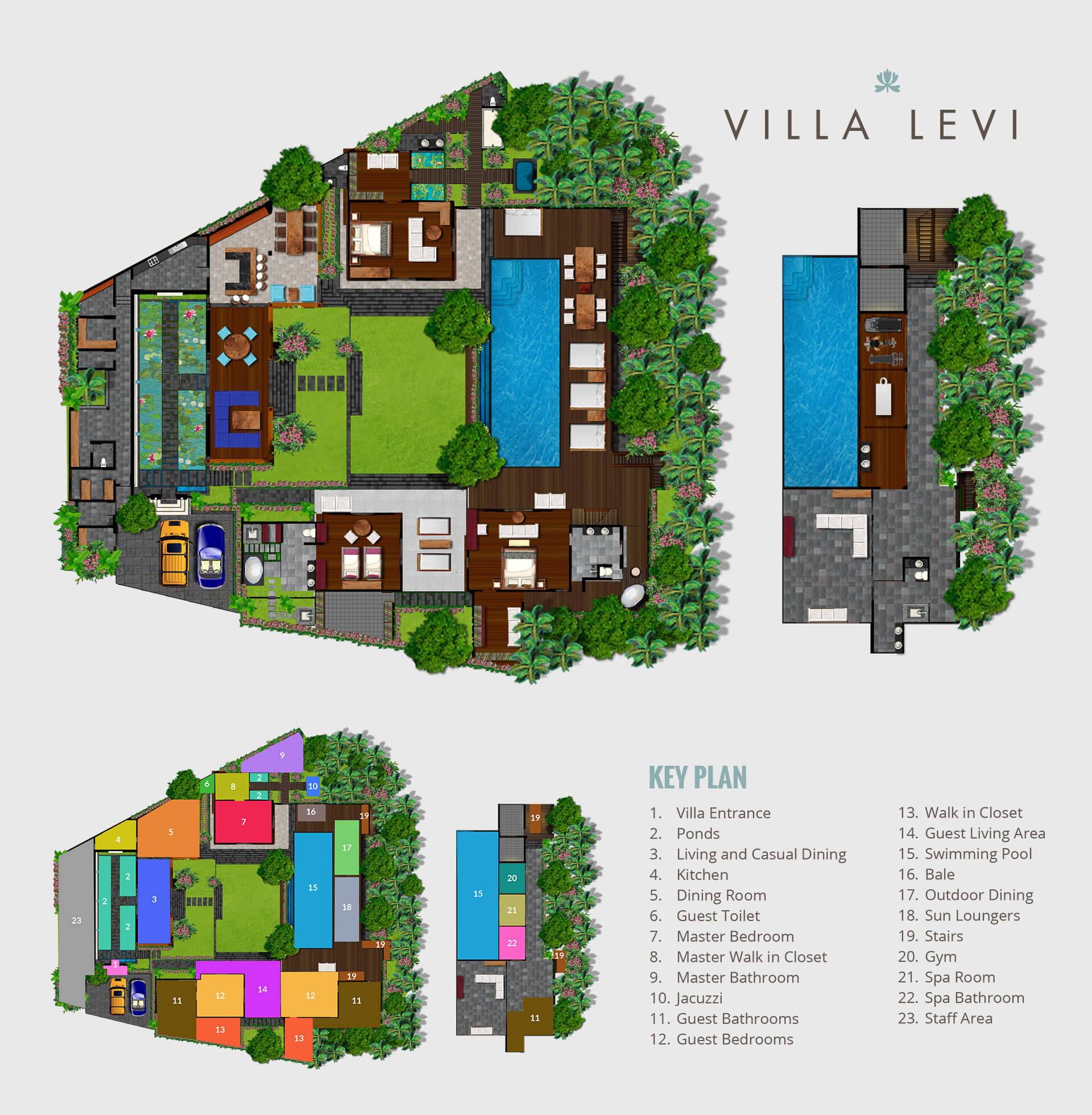 Villa Levi Canggu sits on a river island 200m down a long driveway, with only forest, fields, local houses, and other private villas nearby, with a revered temple positioned on the opposite side of the river. Out on the main road are a couple of local shops selling basic grocery items and snacks, while less than two kilometers away is Echo Beach, with great surf and an enclave of cheap and cheerful but good quality seaside restaurants. A huge new apartment development will be opening soon at Echo Beach and will no doubt bring more great restaurants and retail outlets to the area.