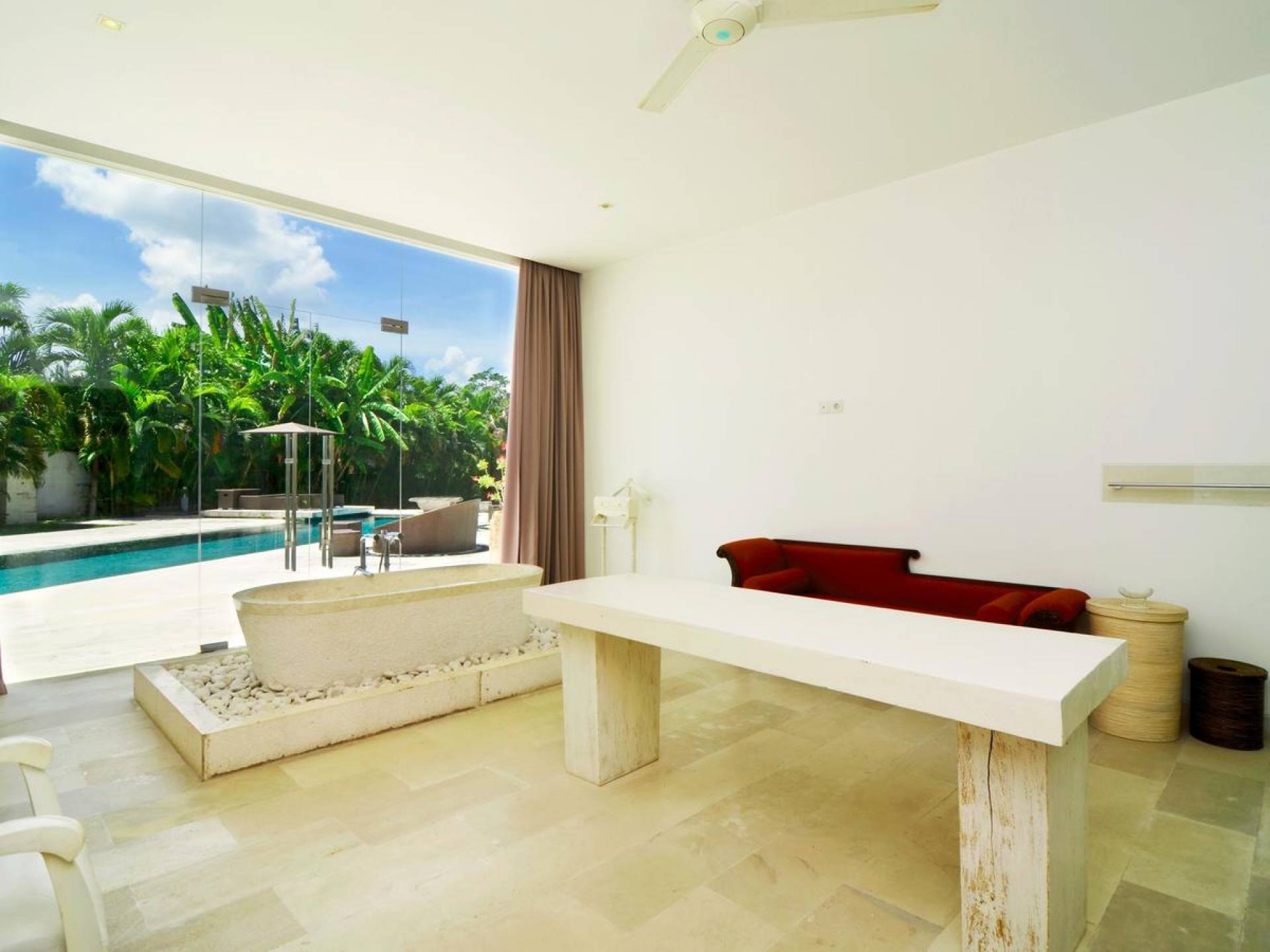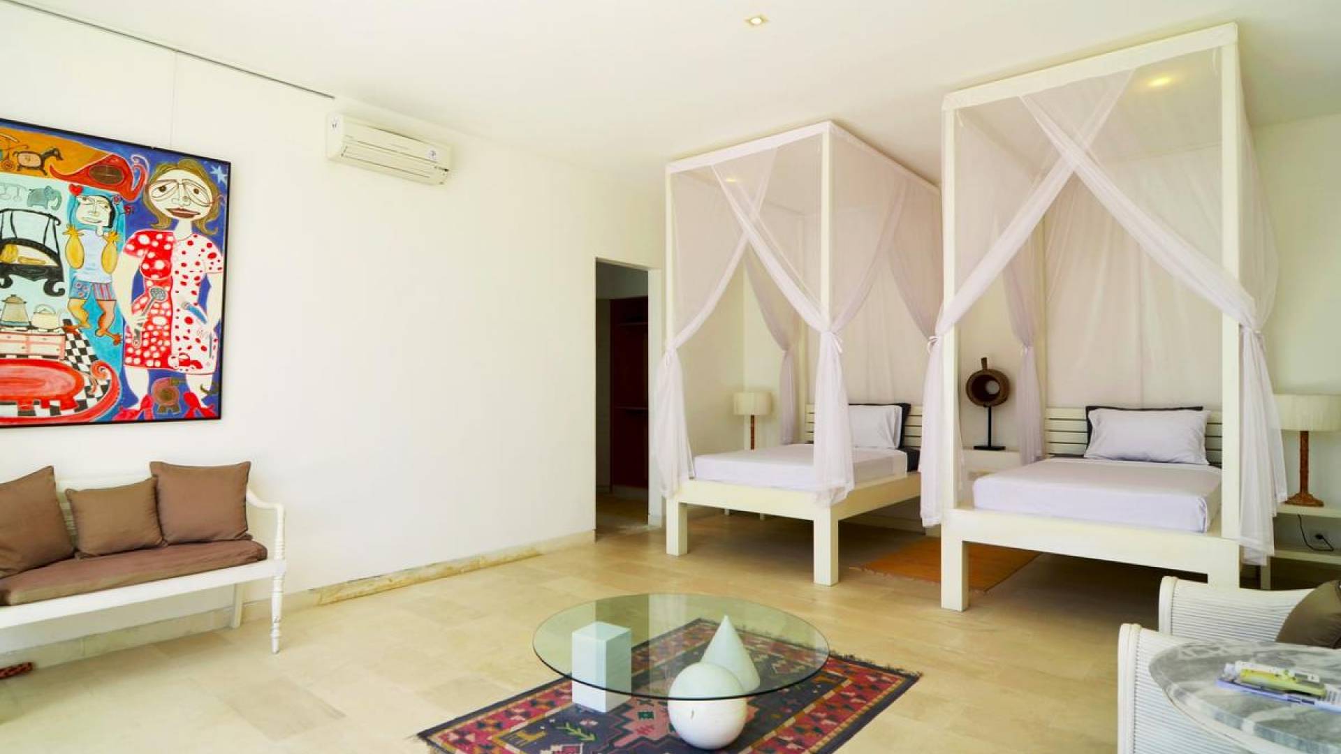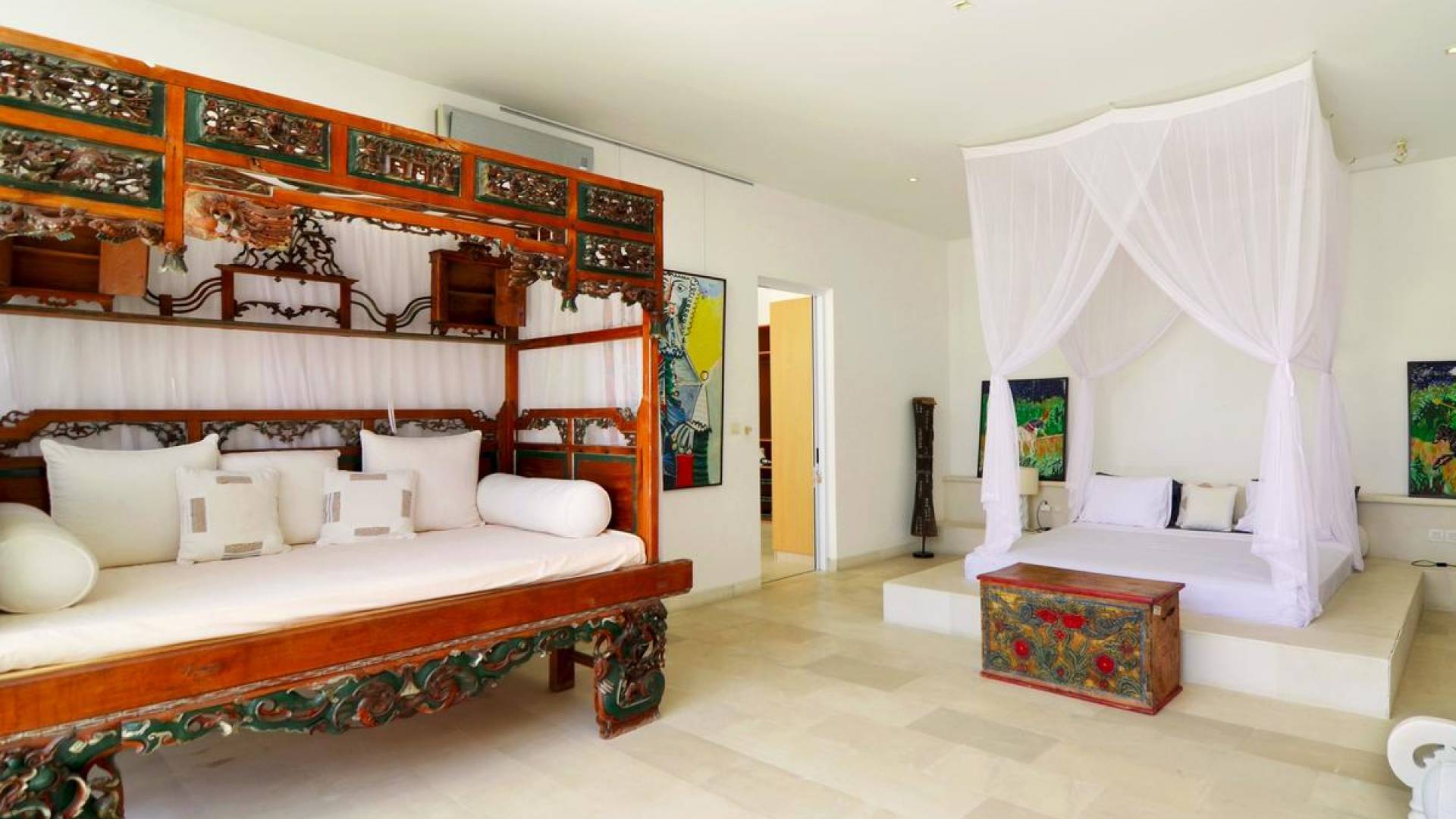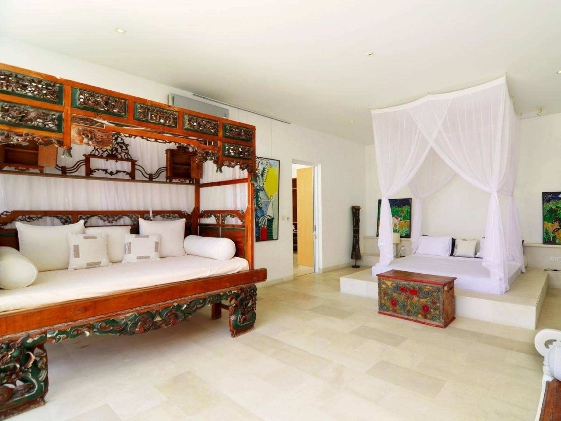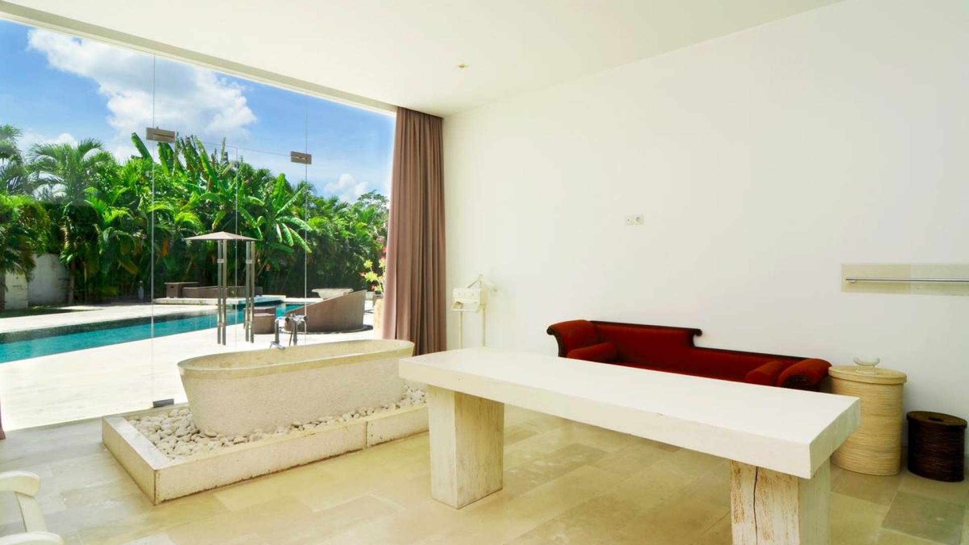 The master bedroom is located up on the first floor, adjoined by the rooftop sunset terrace. This spacious, opulent bedroom is fully air-conditioned and the floor-to-ceiling glass walls provide guests with great views of the garden, pool, and the surrounding landscape of Canggu. The king-size bed is crafted out of whole tree trunks and it is draped in a mosquito net. The wardrobe closet is equipped with a safe and the en-suite, also air-conditioned, features a hot/cold rain shower, dual vanity, and a separate toilet. The two guest bedrooms are located downstairs in the garden, giving almost direct access to the pool. Both rooms feature air-conditioning, comfy beds (one king-size and the other twin beds), wardrobe areas, and deluxe en-suites fitted with bathtubs. The king-bedded bedroom also features an antique daybed and the en-suite doubles as a Spa Room, complete with a massage bed. Ask the staff to arrange a professional spa therapist to come to the villa.