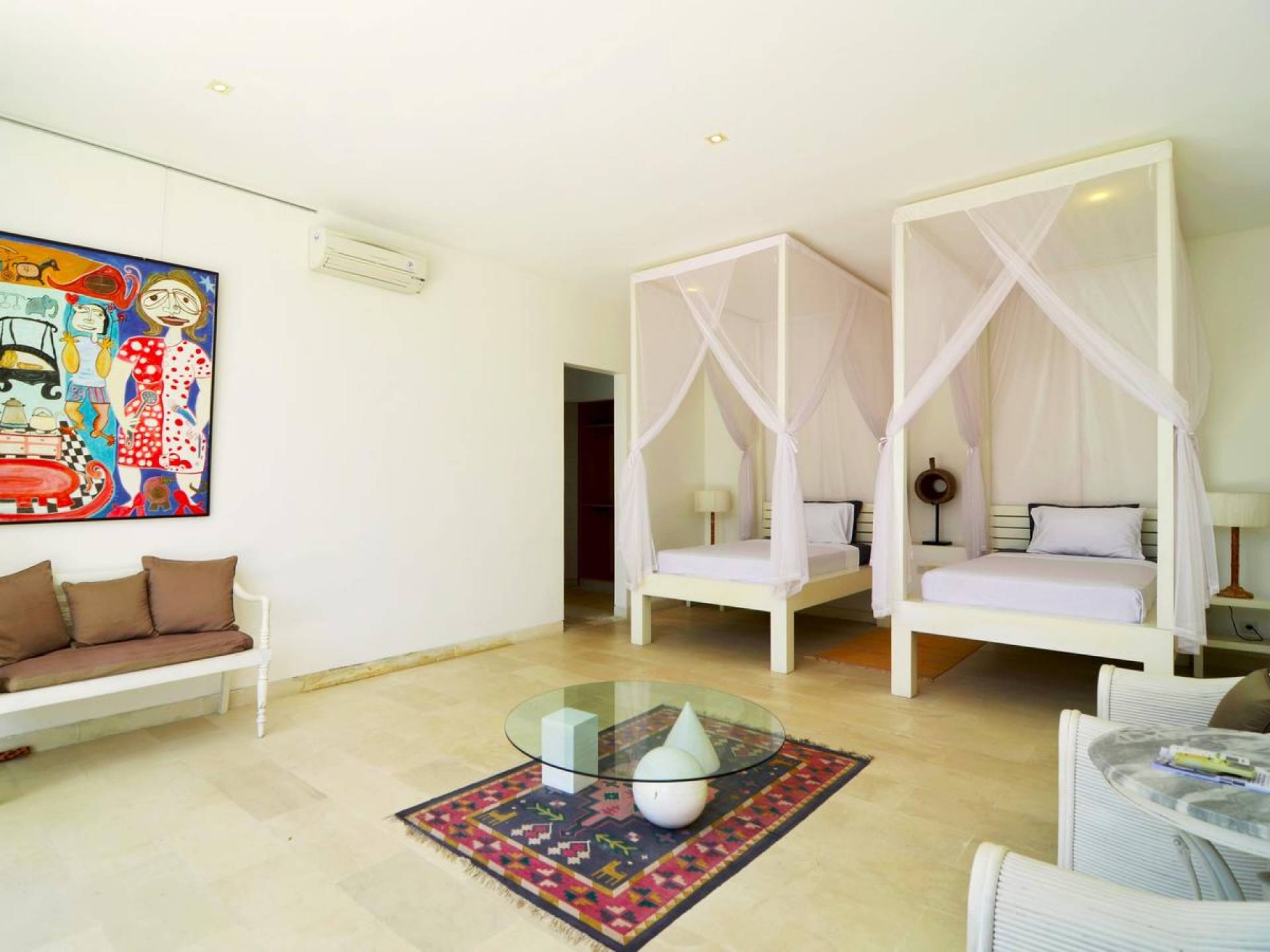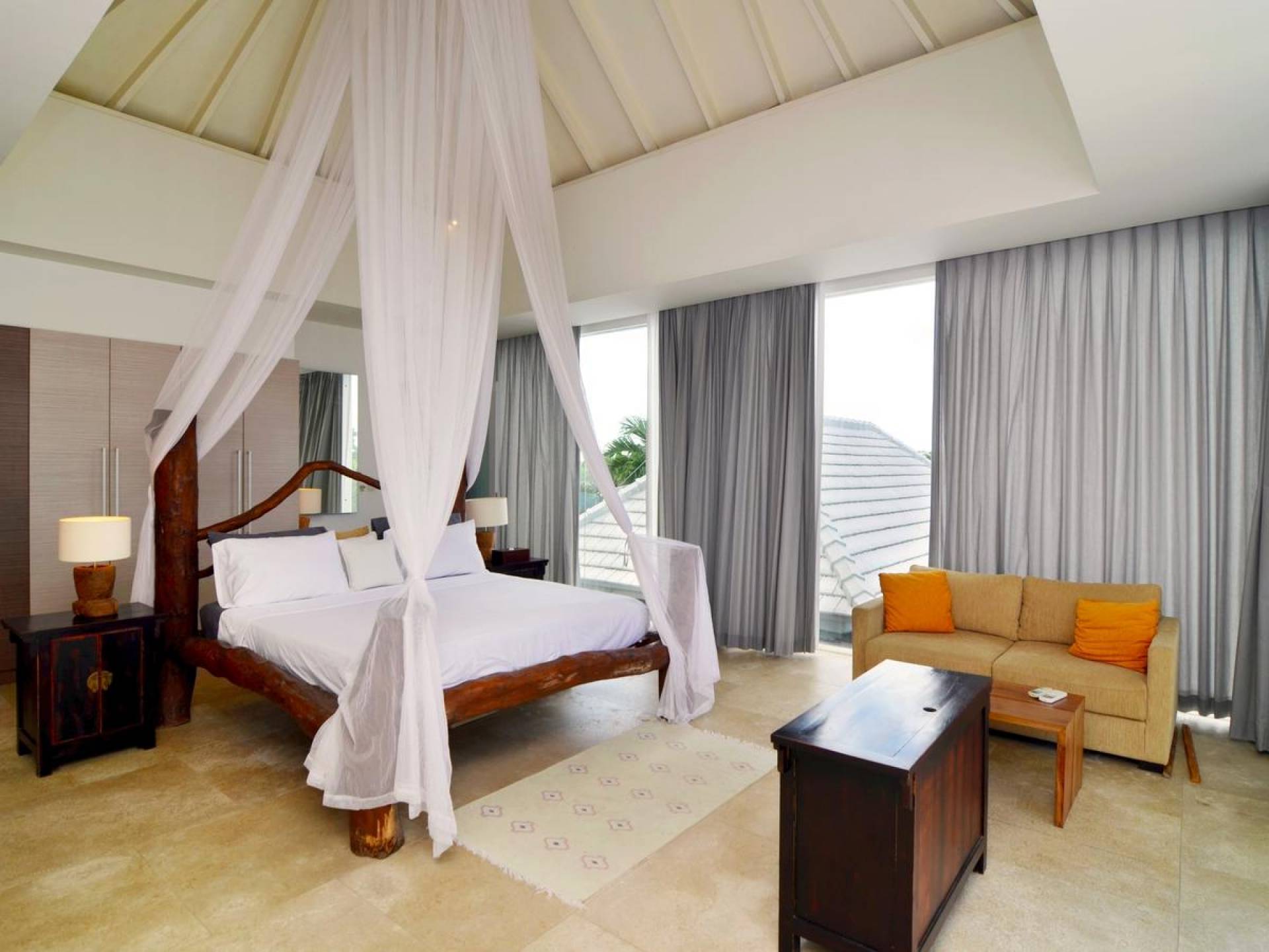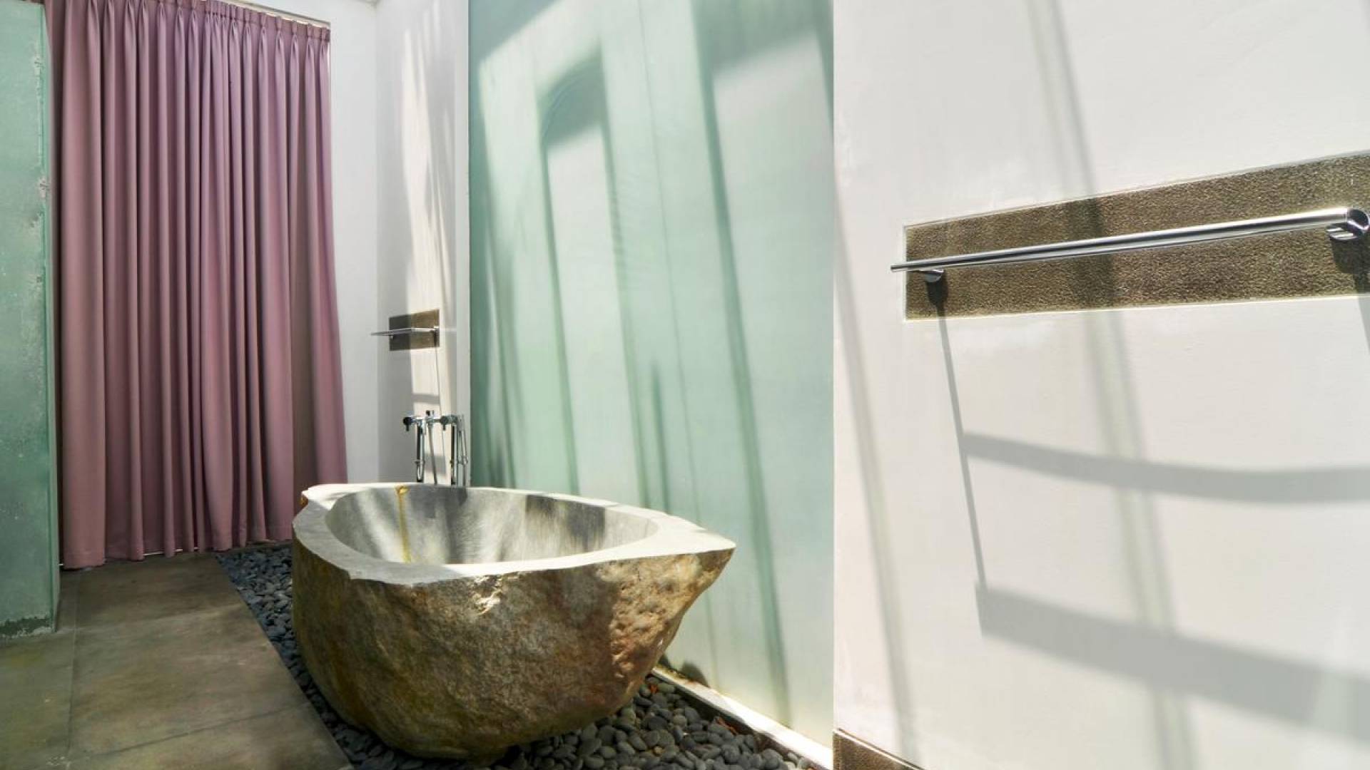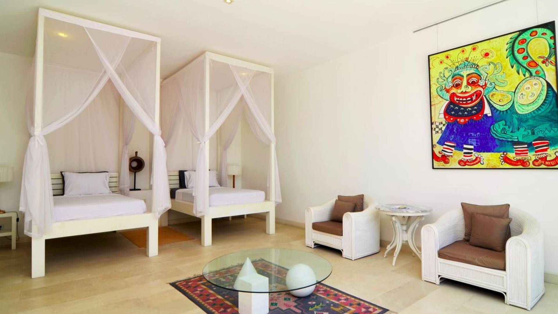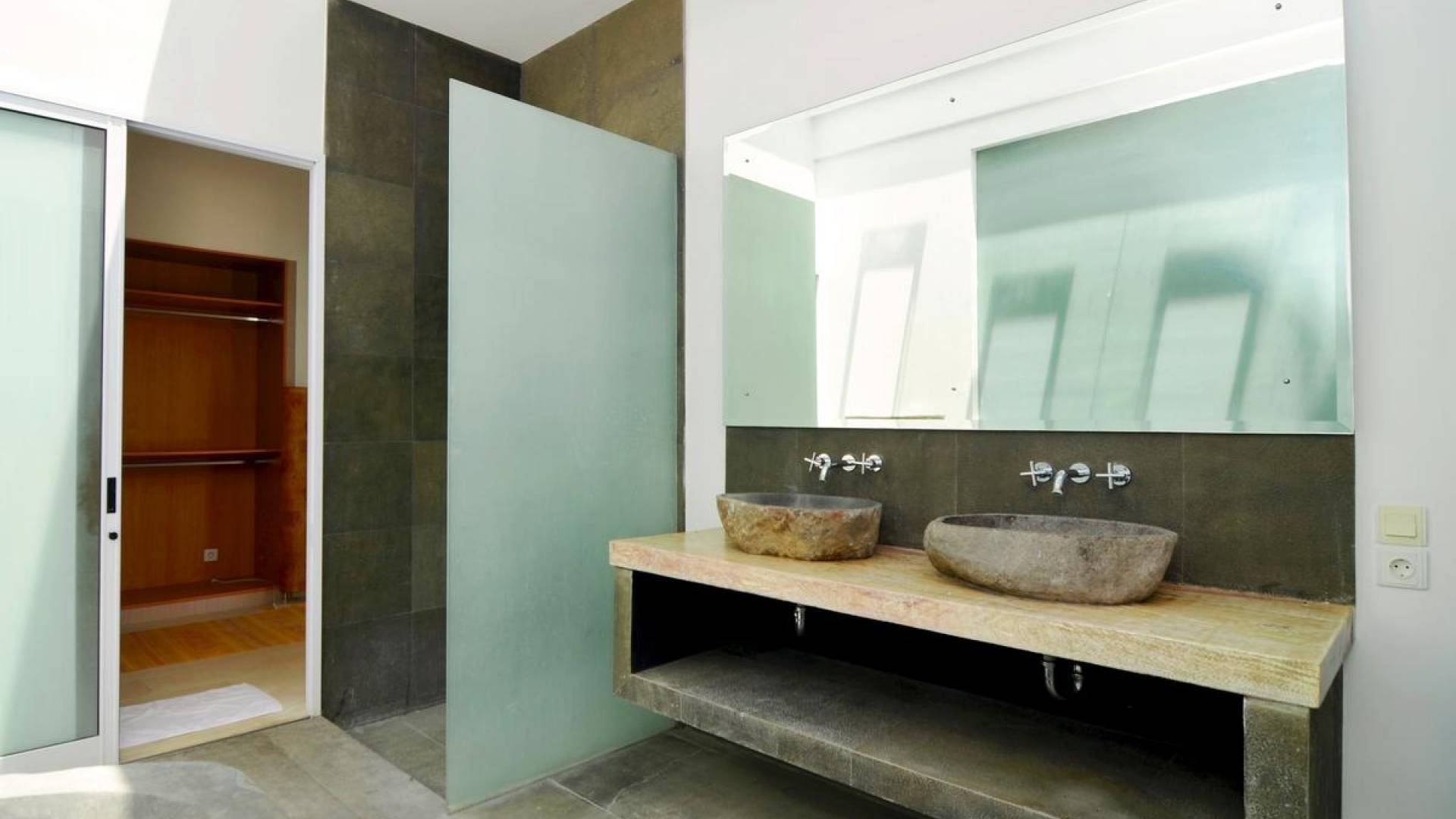 The master bedroom is located up on the first floor, adjoined by the rooftop sunset terrace. This spacious, opulent bedroom is fully air-conditioned and the floor-to-ceiling glass walls provide guests with great views of the garden, pool, and the surrounding landscape of Canggu. The king-size bed is crafted out of whole tree trunks and it is draped in a mosquito net. The wardrobe closet is equipped with a safe and the en-suite, also air-conditioned, features a hot/cold rain shower, dual vanity, and a separate toilet. The two guest bedrooms are located downstairs in the garden, giving almost direct access to the pool. Both rooms feature air-conditioning, comfy beds (one king-size and the other twin beds), wardrobe areas, and deluxe en-suites fitted with bathtubs. The king-bedded bedroom also features an antique daybed and the en-suite doubles as a Spa Room, complete with a massage bed. Ask the staff to arrange a professional spa therapist to come to the villa.