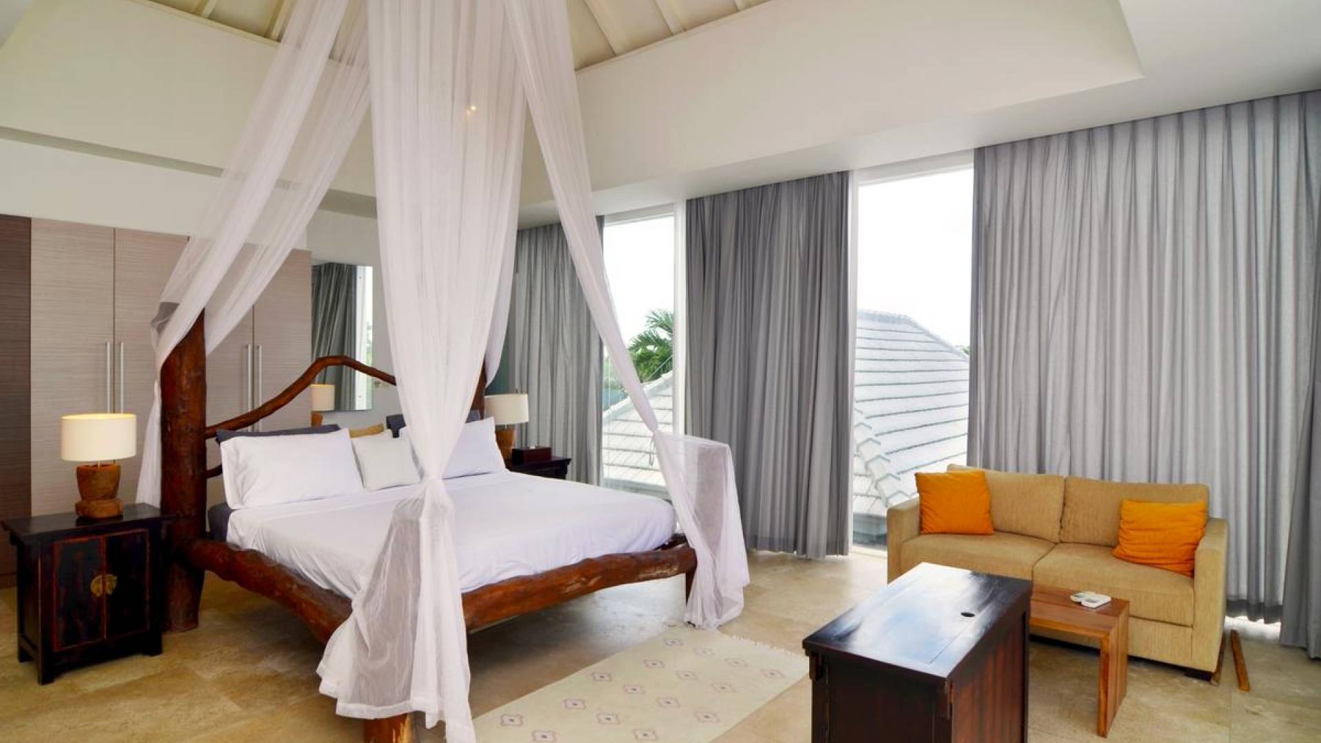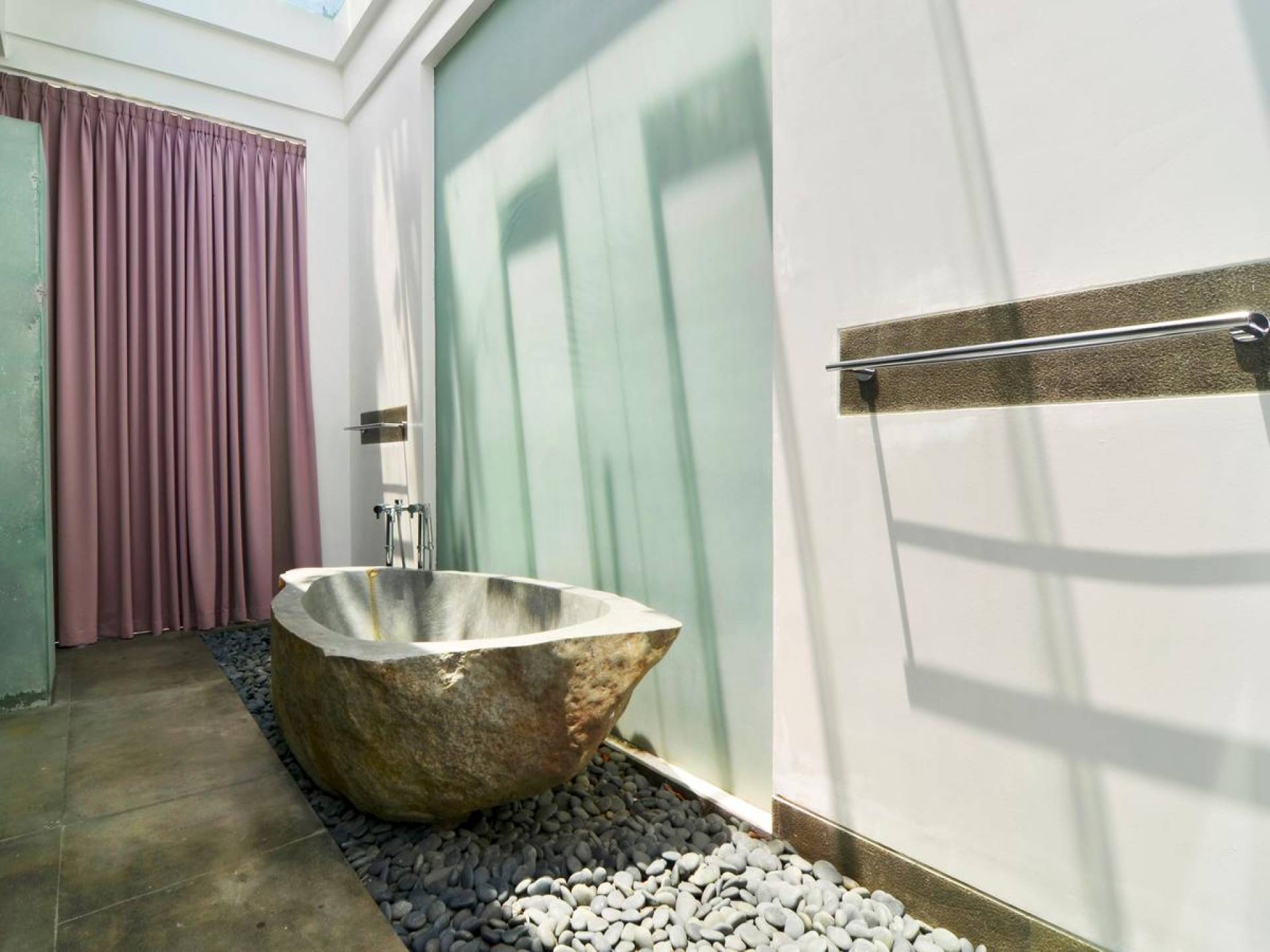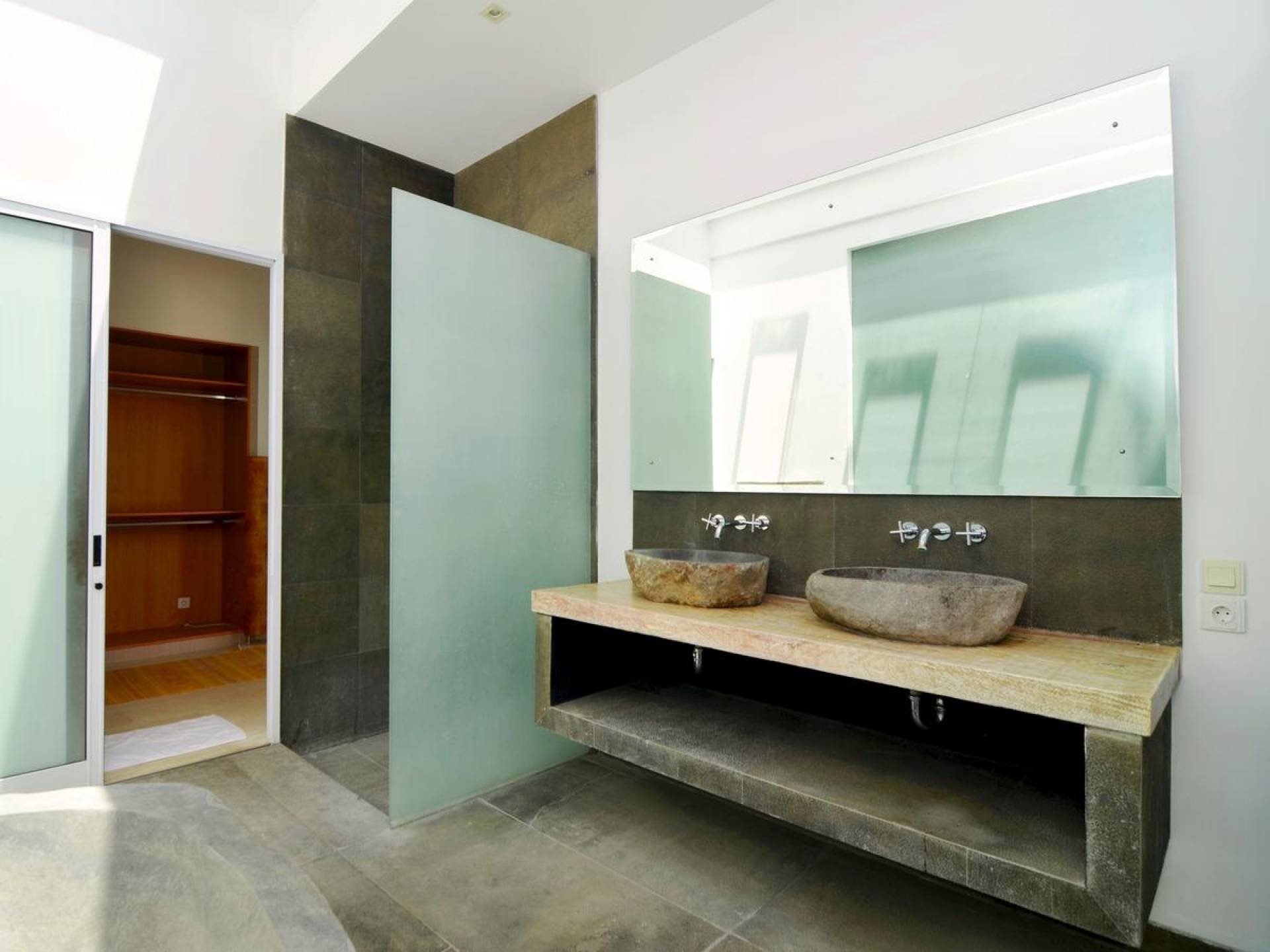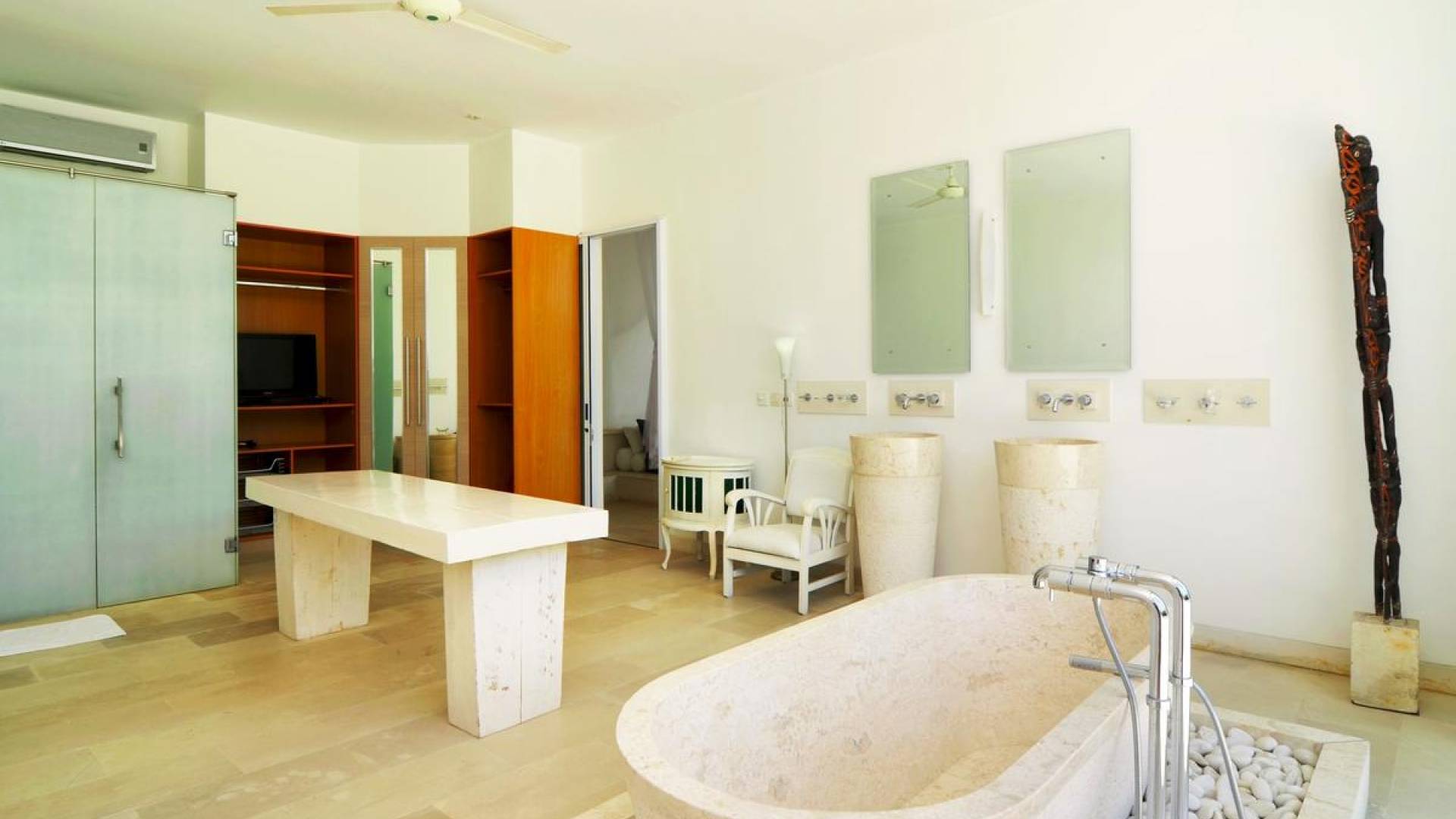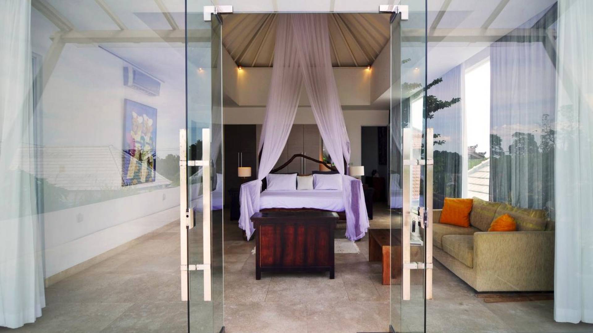 The master bedroom is located up on the first floor, adjoined by the rooftop sunset terrace. This spacious, opulent bedroom is fully air-conditioned and the floor-to-ceiling glass walls provide guests with great views of the garden, pool, and the surrounding landscape of Canggu. The king-size bed is crafted out of whole tree trunks and it is draped in a mosquito net. The wardrobe closet is equipped with a safe and the en-suite, also air-conditioned, features a hot/cold rain shower, dual vanity, and a separate toilet. The two guest bedrooms are located downstairs in the garden, giving almost direct access to the pool. Both rooms feature air-conditioning, comfy beds (one king-size and the other twin beds), wardrobe areas, and deluxe en-suites fitted with bathtubs. The king-bedded bedroom also features an antique daybed and the en-suite doubles as a Spa Room, complete with a massage bed. Ask the staff to arrange a professional spa therapist to come to the villa.