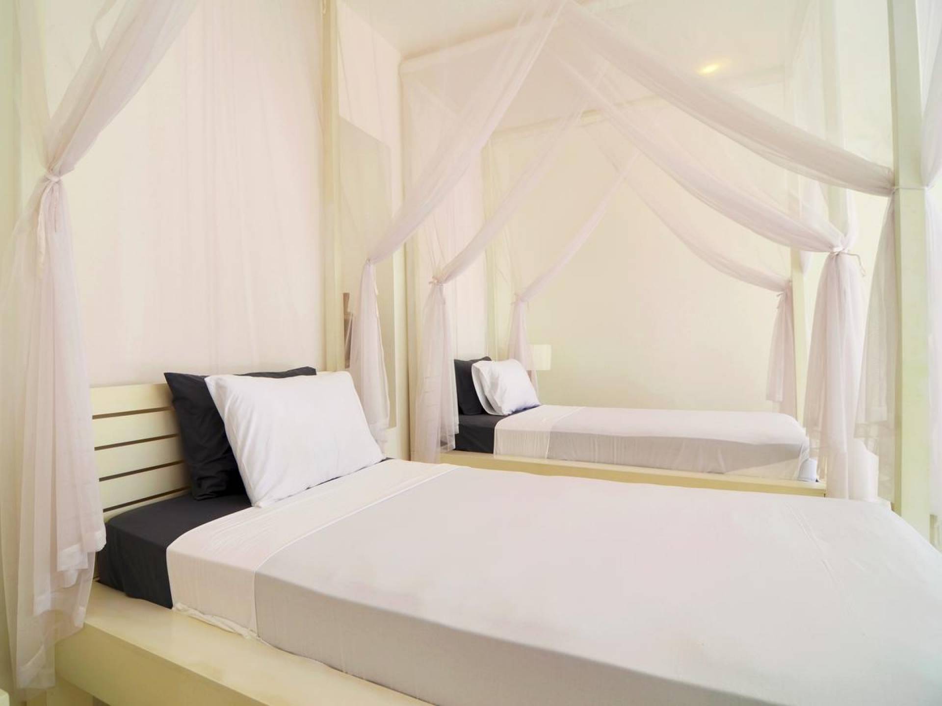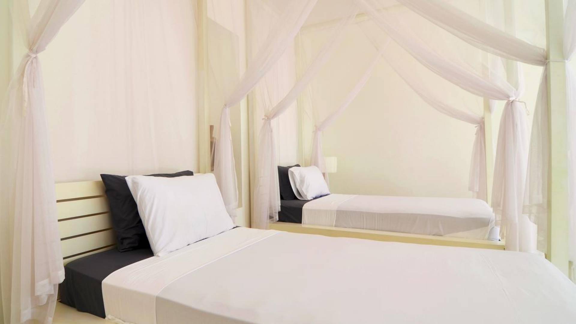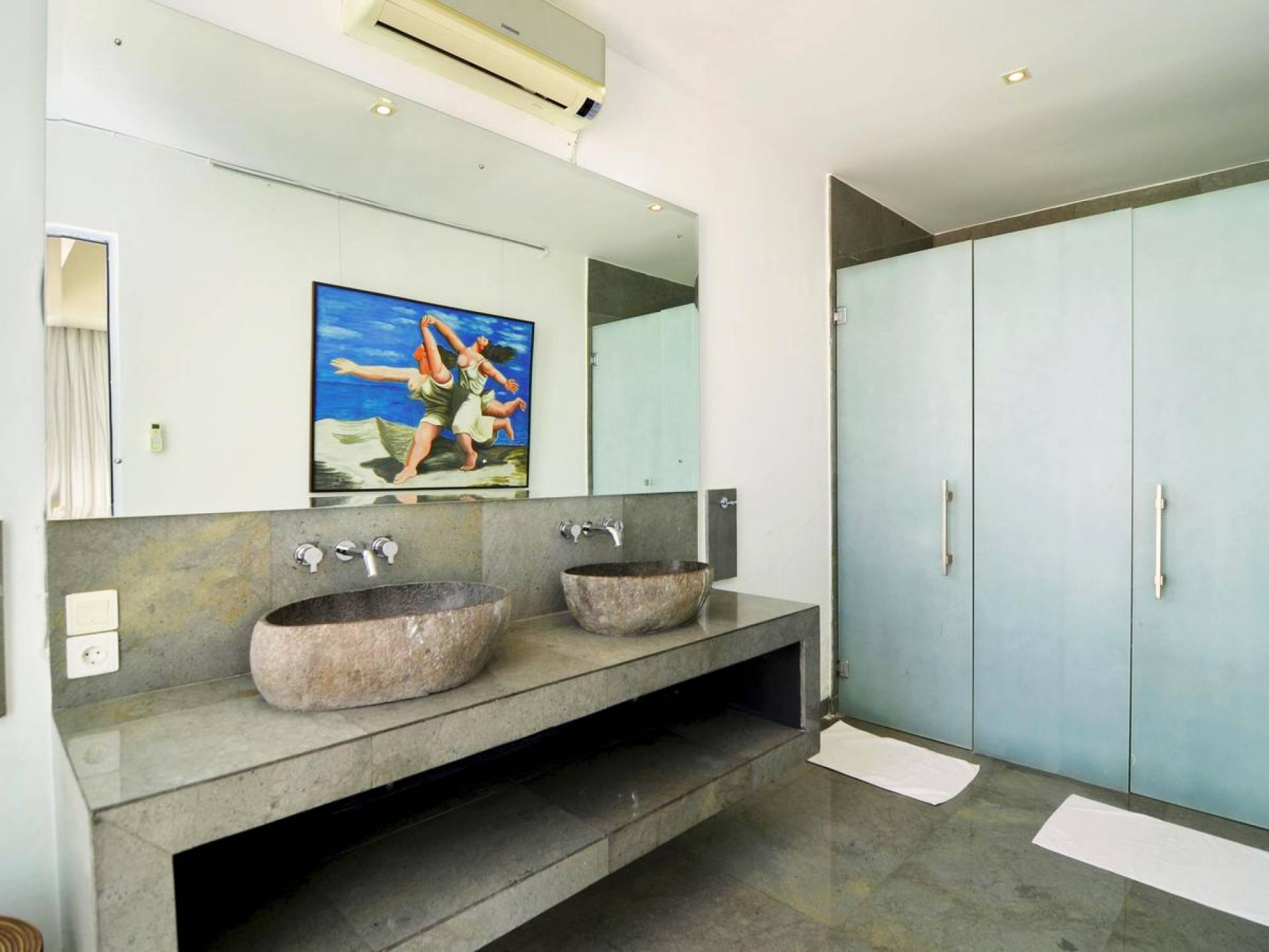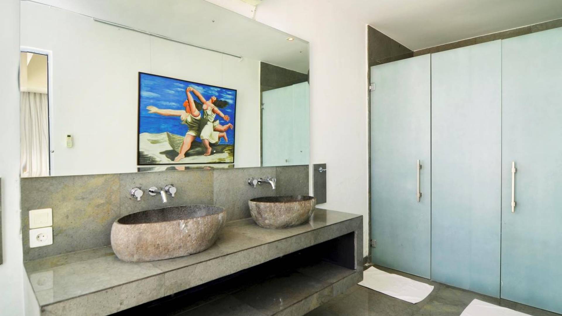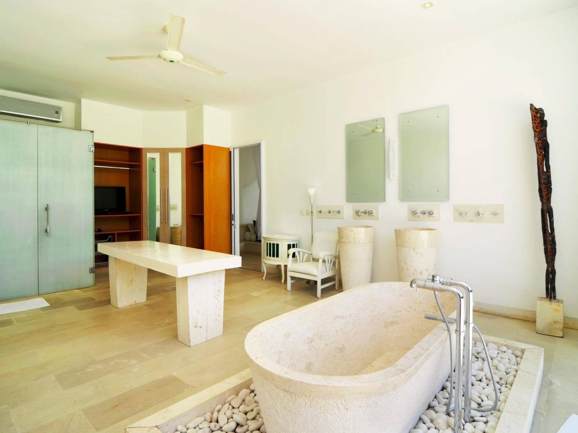The master bedroom is located up on the first floor, adjoined by the rooftop sunset terrace. This spacious, opulent bedroom is fully air-conditioned and the floor-to-ceiling glass walls provide guests with great views of the garden, pool, and the surrounding landscape of Canggu. The king-size bed is crafted out of whole tree trunks and it is draped in a mosquito net. The wardrobe closet is equipped with a safe and the en-suite, also air-conditioned, features a hot/cold rain shower, dual vanity, and a separate toilet. The two guest bedrooms are located downstairs in the garden, giving almost direct access to the pool. Both rooms feature air-conditioning, comfy beds (one king-size and the other twin beds), wardrobe areas, and deluxe en-suites fitted with bathtubs. The king-bedded bedroom also features an antique daybed and the en-suite doubles as a Spa Room, complete with a massage bed. Ask the staff to arrange a professional spa therapist to come to the villa.