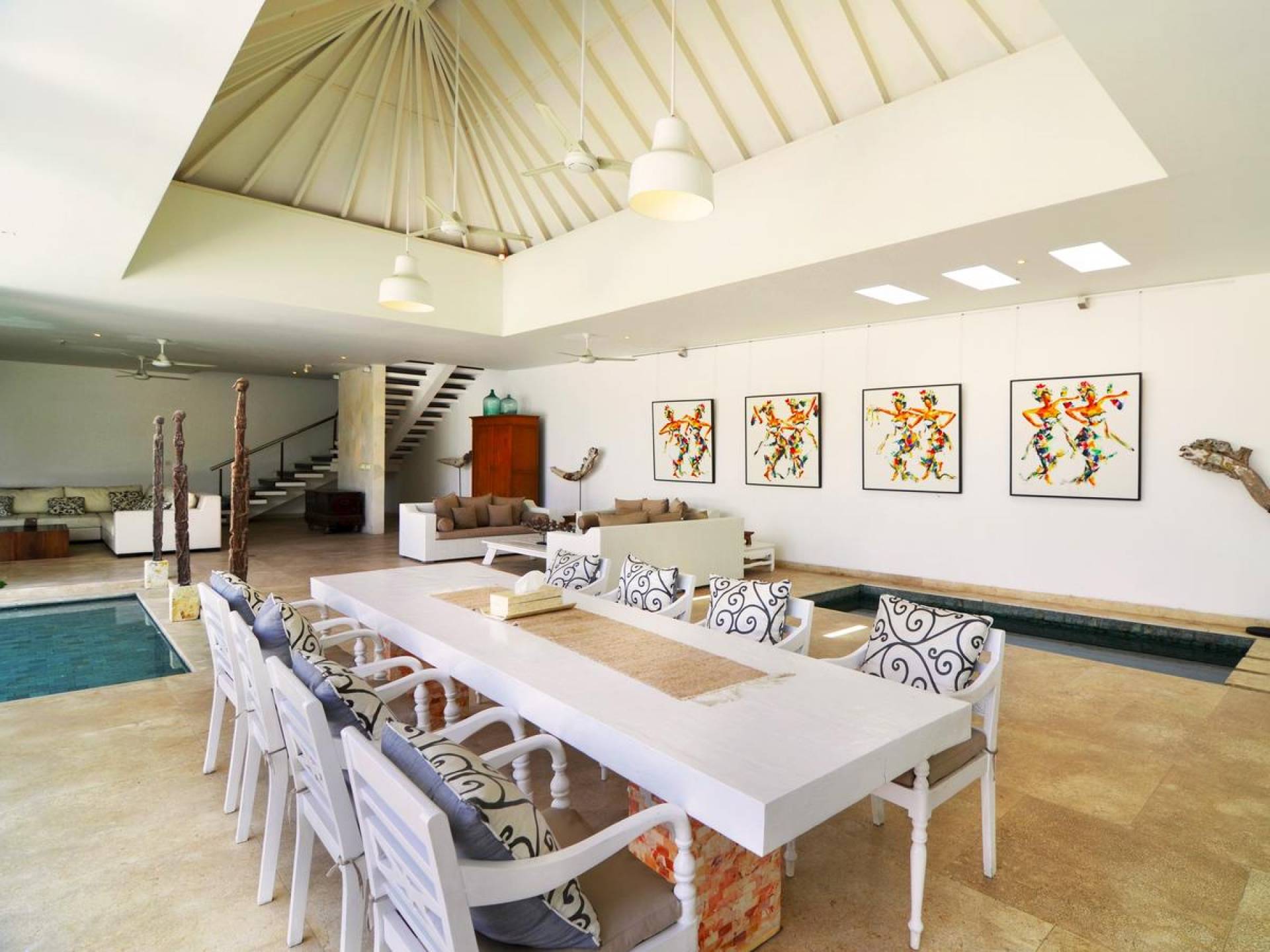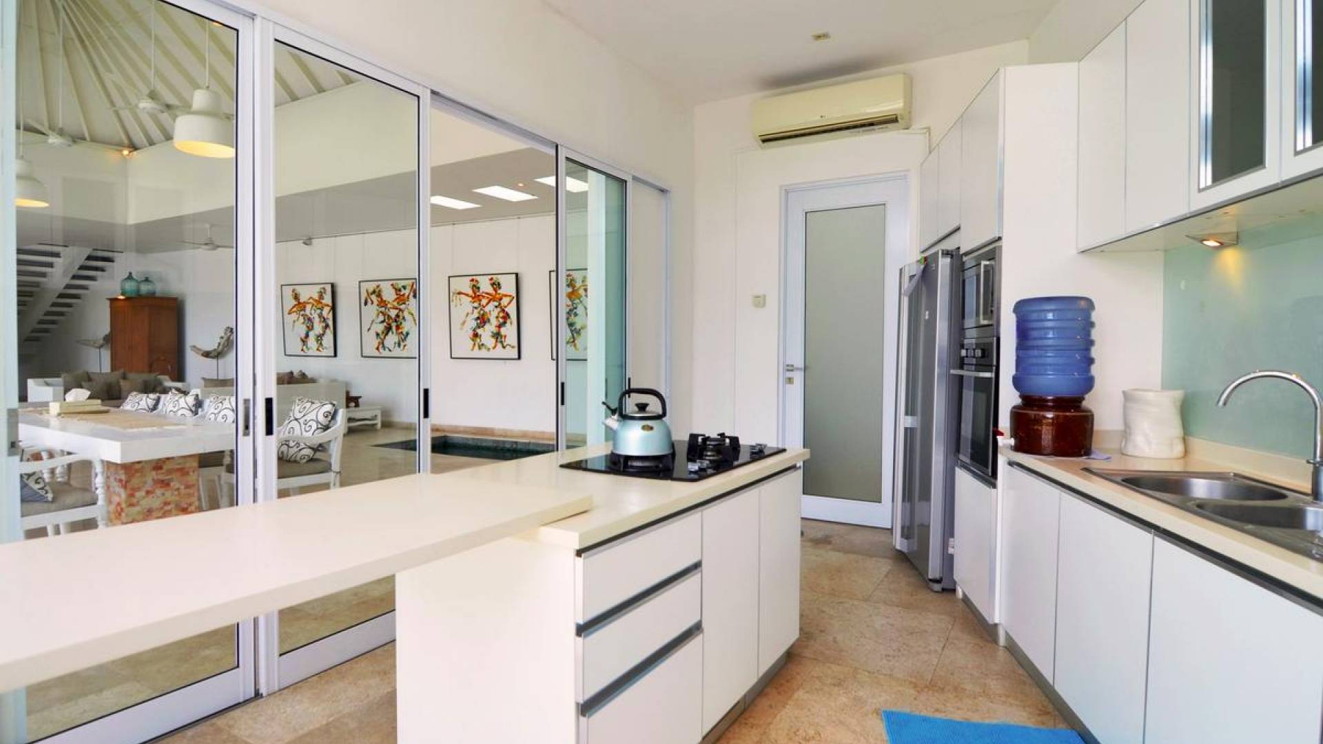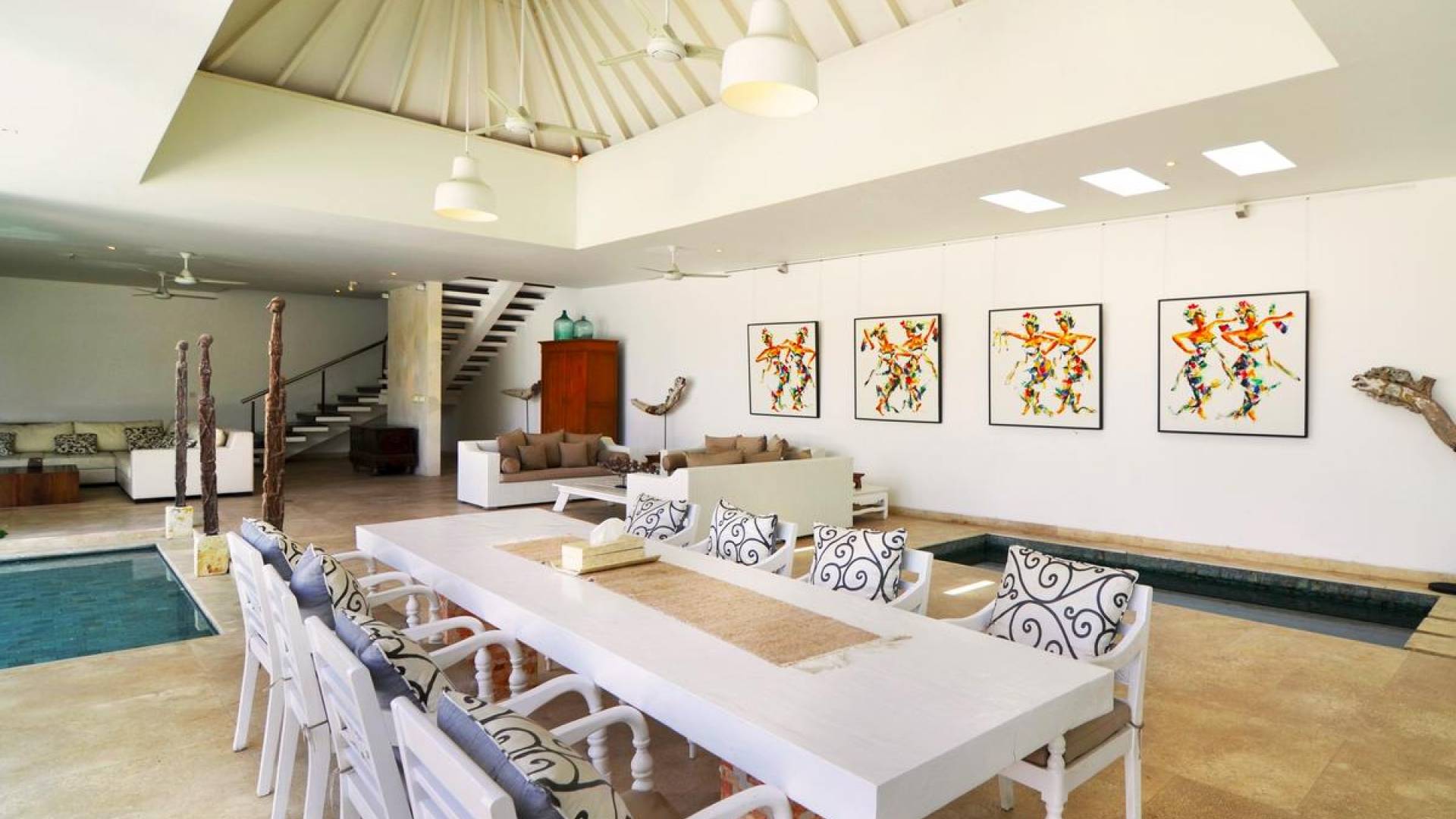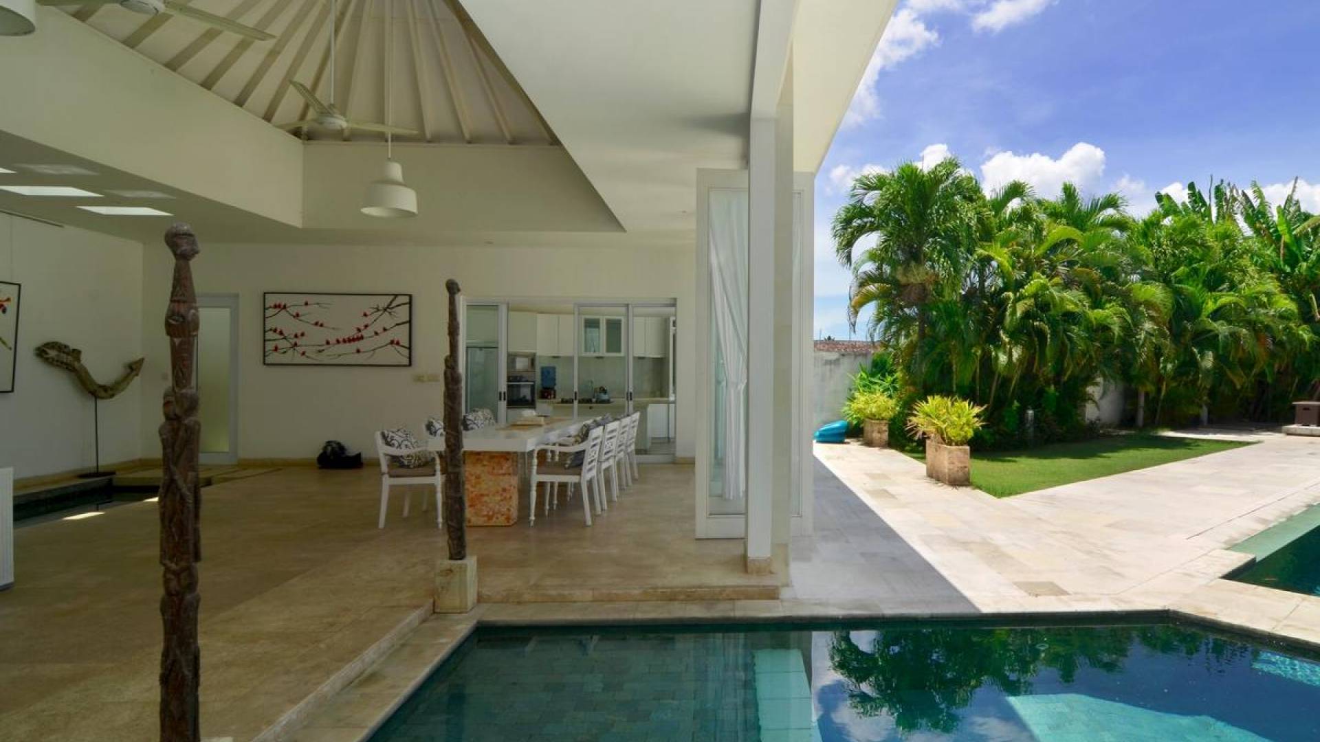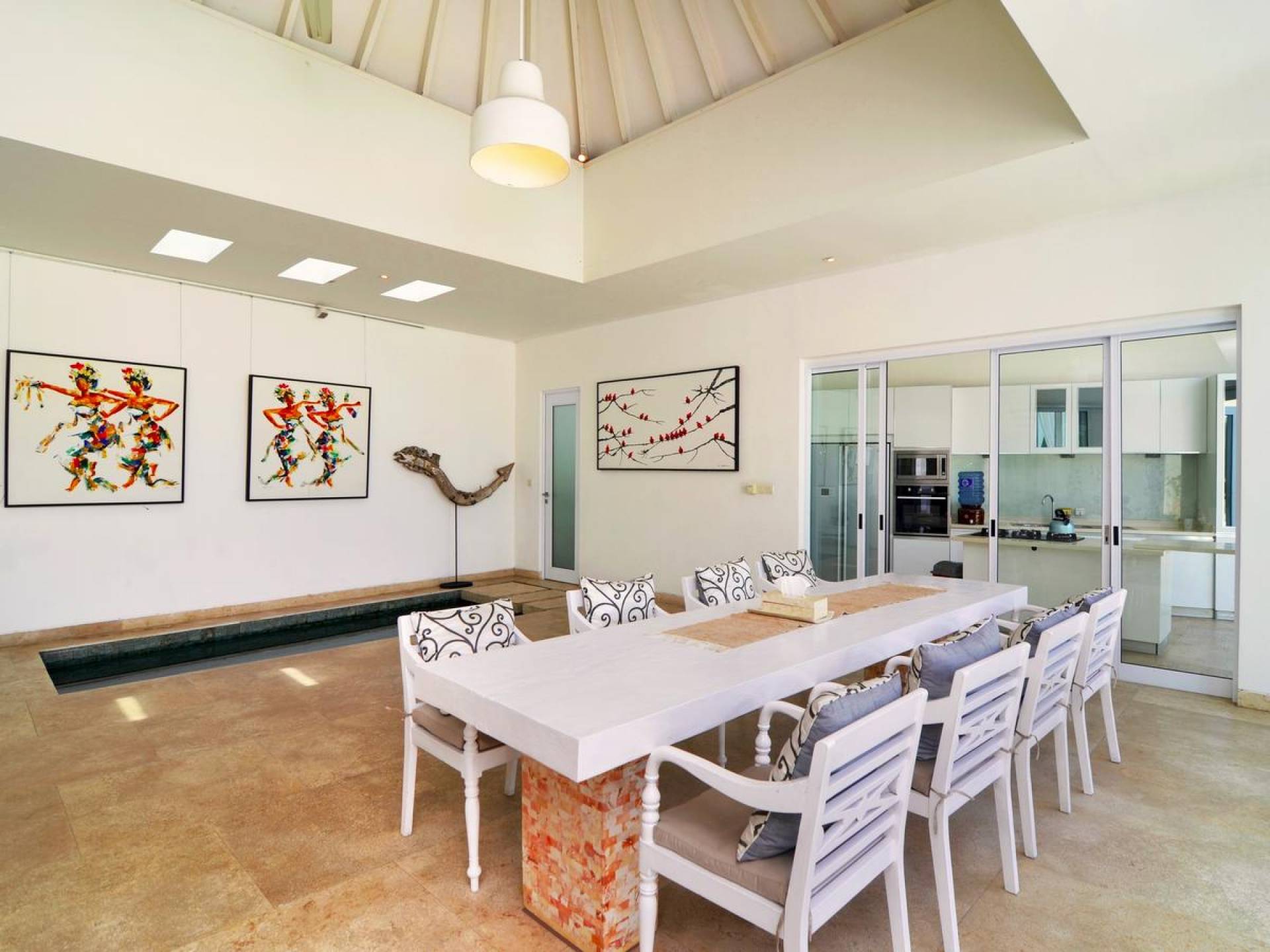 A bridge over the pool leads from one side to the other side of the garden. The best place to enjoy sunset drinks is up on the rooftop terrace in the afternoon. The spacious living pavilion features a tropical open-plan design from where you can step straight into the pool. Inside, there is a separate shallow kiddies pool so the little ones can safely have some water fun while parents can keep an eye on them from the sofa, dining table, or even the kitchen. The interior design is ruled by traditional artwork, sculptures, and a Balinese musical instrument. There is a chic white leather sofa to lounge on, watching your favorite show on the satellite TV with DVD player. In the middle of the room stand three more sofas to sit together, enjoying the view of the garden and pool. For dinner, gather at the white-painted timber dining table for 8, enjoying some good food with your loved ones. The kitchen is fully equipped with everything needed and there is a kitchen bar with stools to sit and have drinks together at any time of the day.