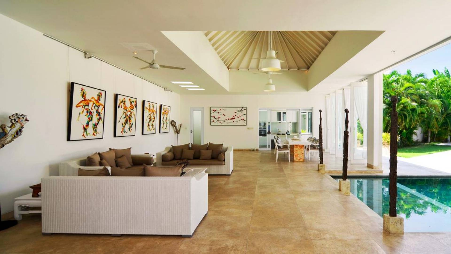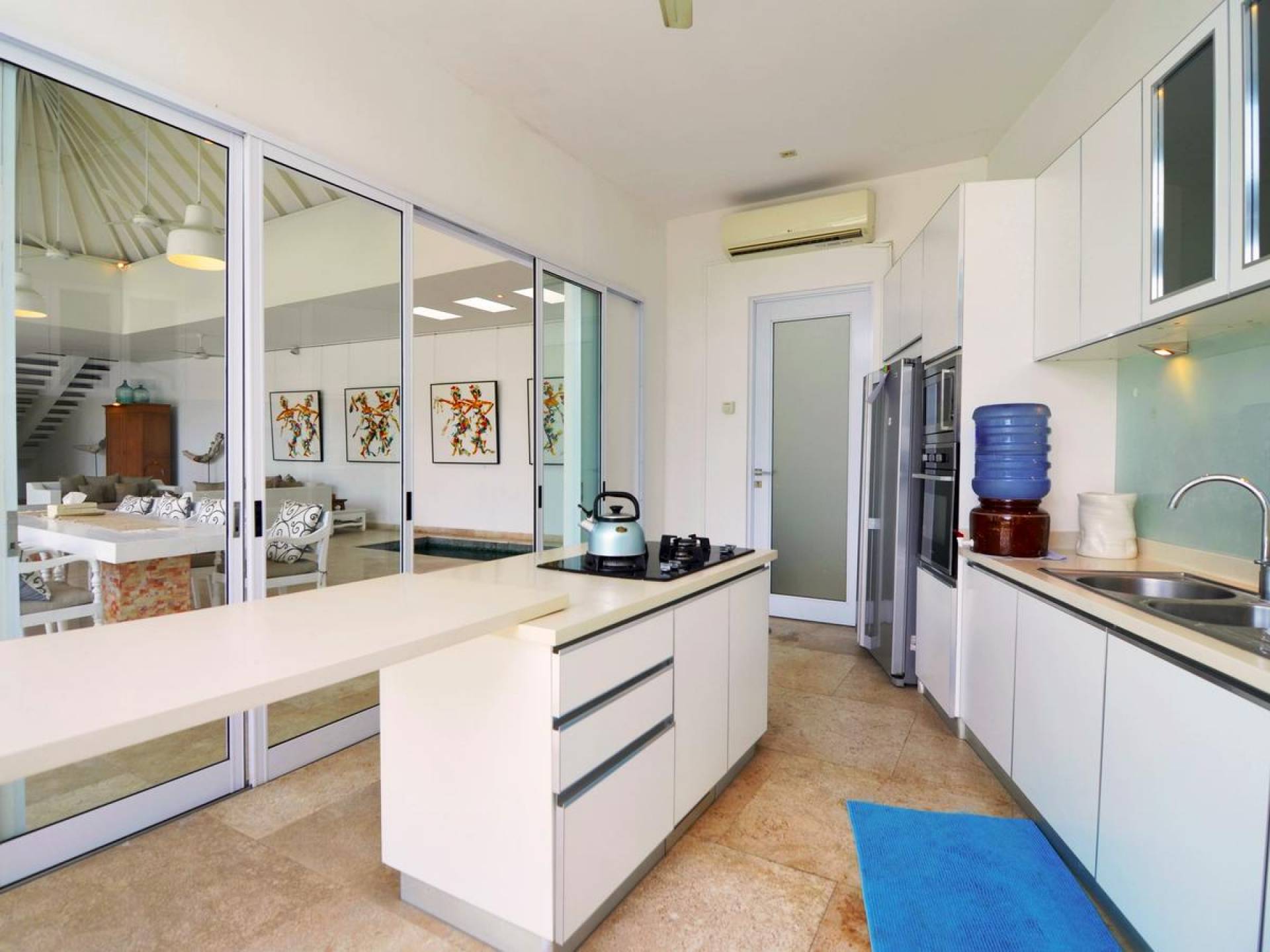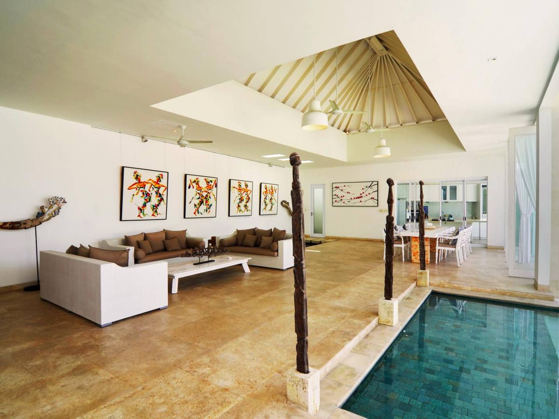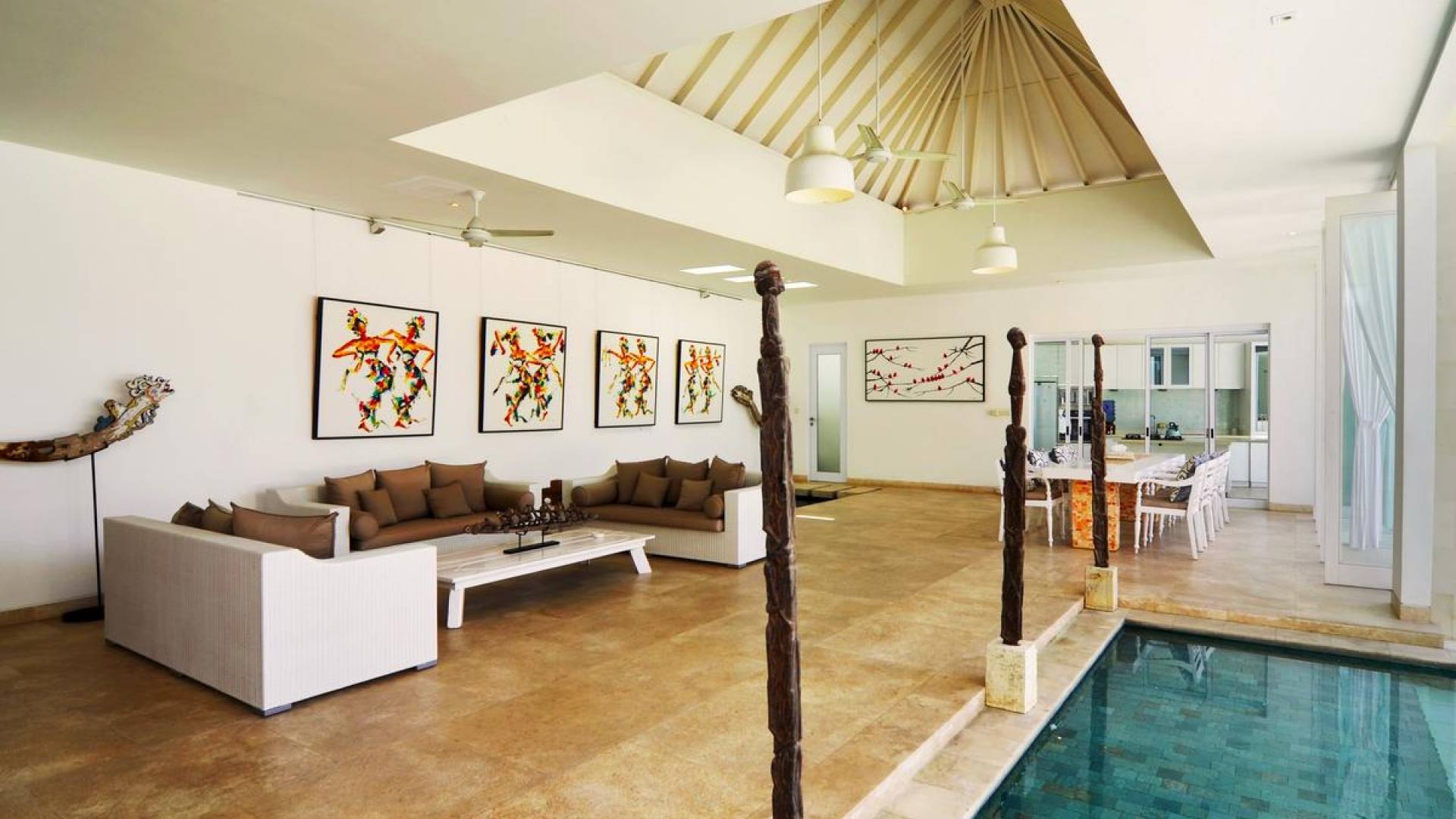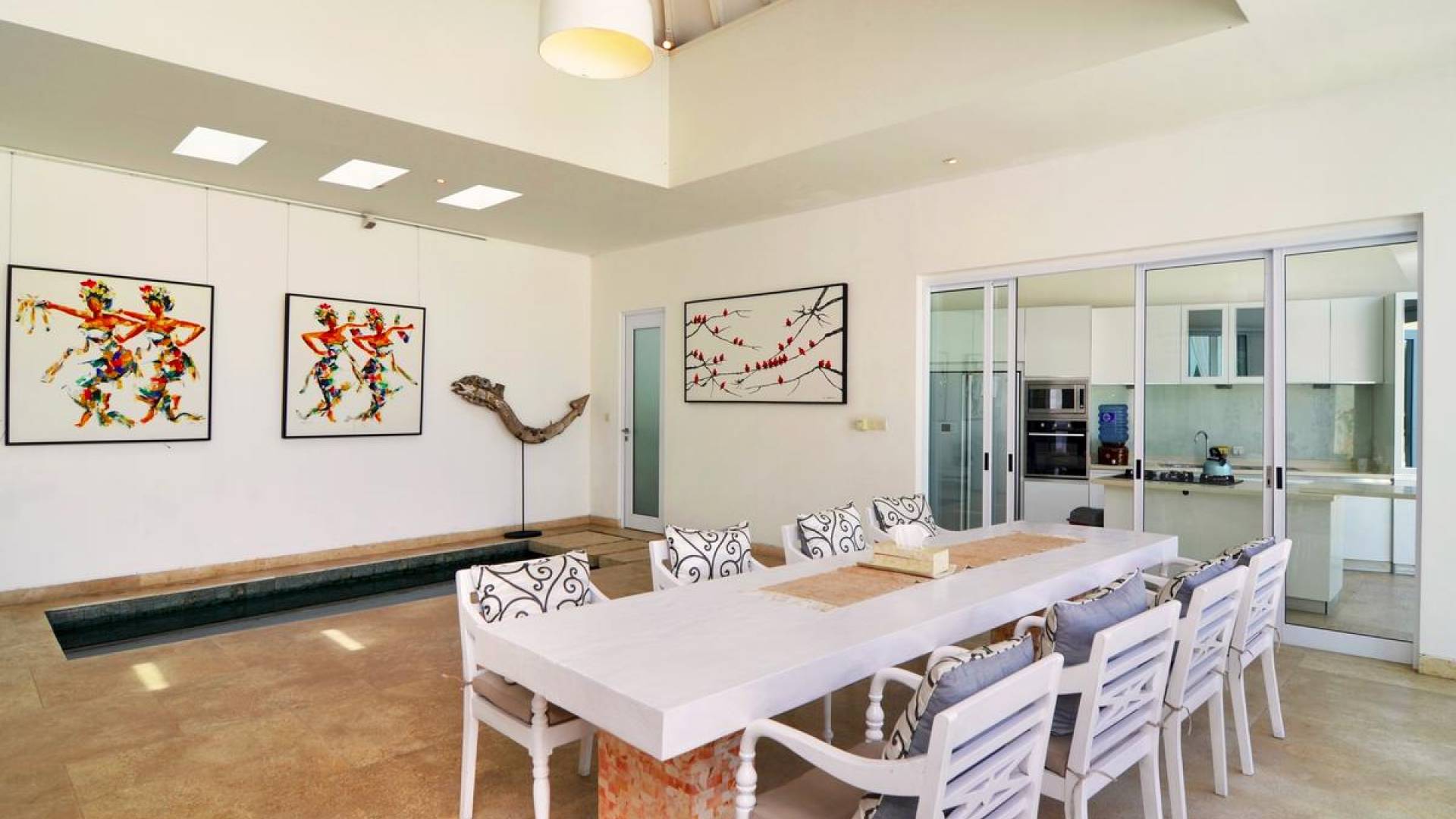A bridge over the pool leads from one side to the other side of the garden. The best place to enjoy sunset drinks is up on the rooftop terrace in the afternoon. The spacious living pavilion features a tropical open-plan design from where you can step straight into the pool. Inside, there is a separate shallow kiddies pool so the little ones can safely have some water fun while parents can keep an eye on them from the sofa, dining table, or even the kitchen. The interior design is ruled by traditional artwork, sculptures, and a Balinese musical instrument. There is a chic white leather sofa to lounge on, watching your favorite show on the satellite TV with DVD player. In the middle of the room stand three more sofas to sit together, enjoying the view of the garden and pool. For dinner, gather at the white-painted timber dining table for 8, enjoying some good food with your loved ones. The kitchen is fully equipped with everything needed and there is a kitchen bar with stools to sit and have drinks together at any time of the day.