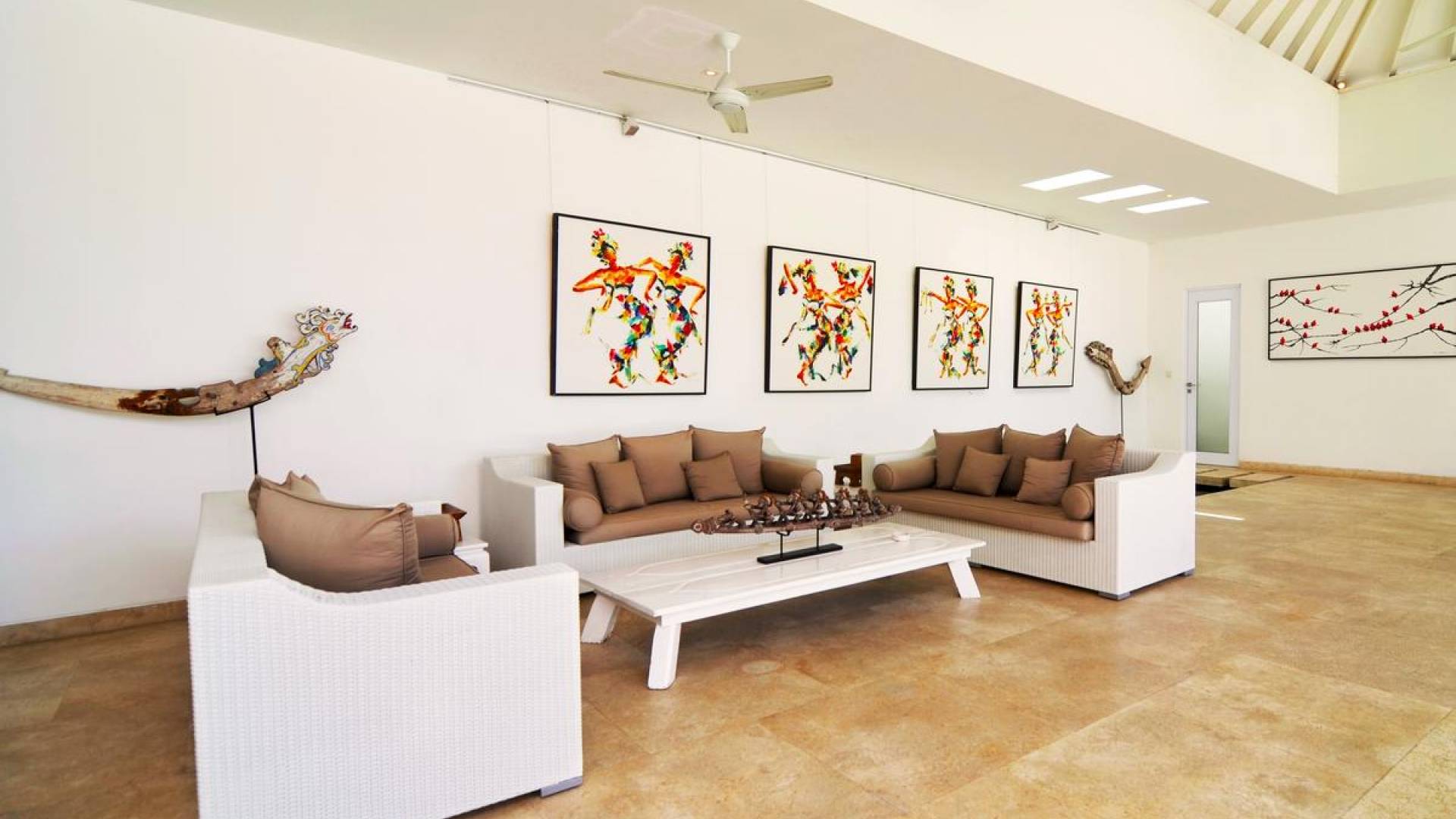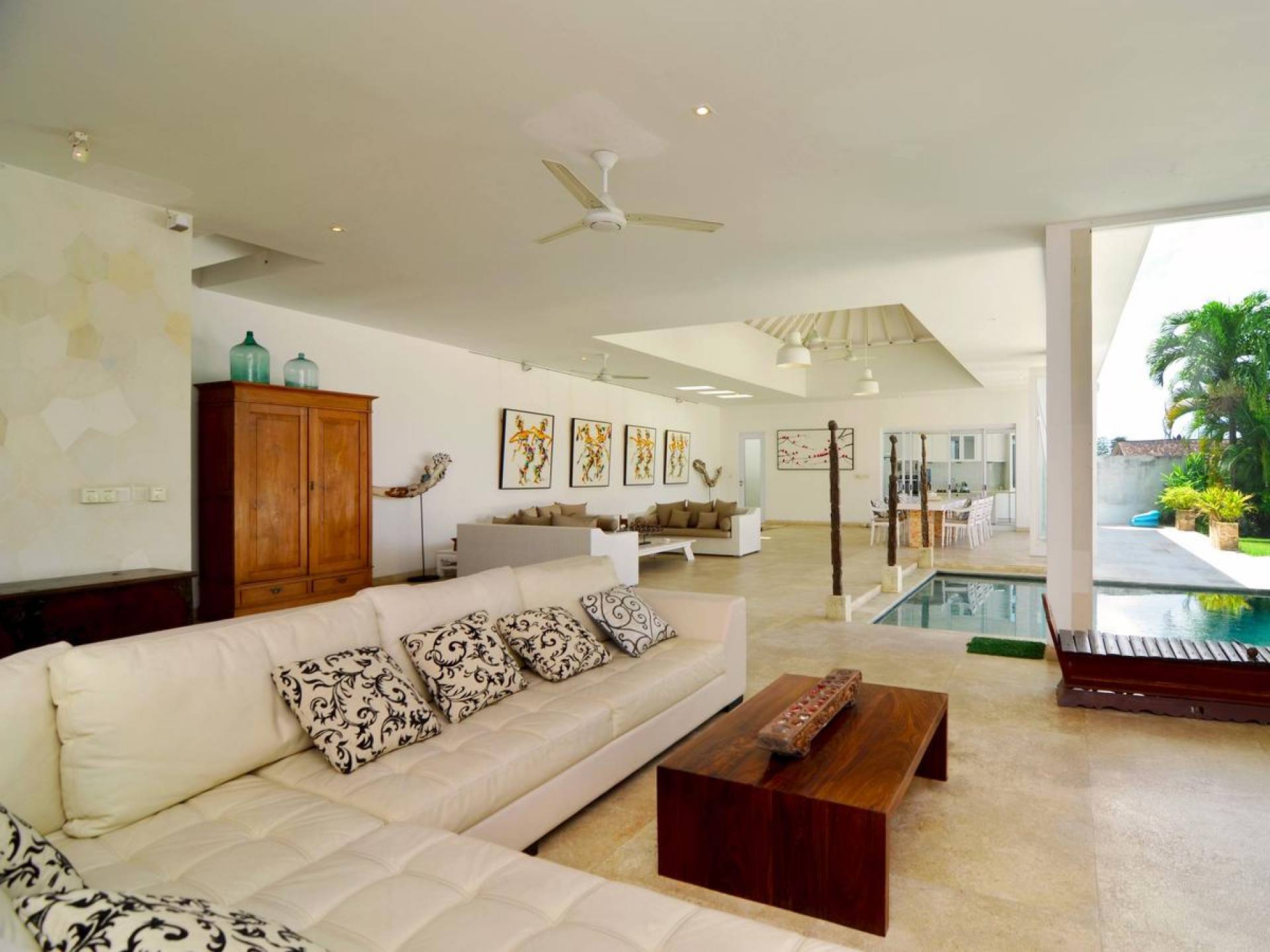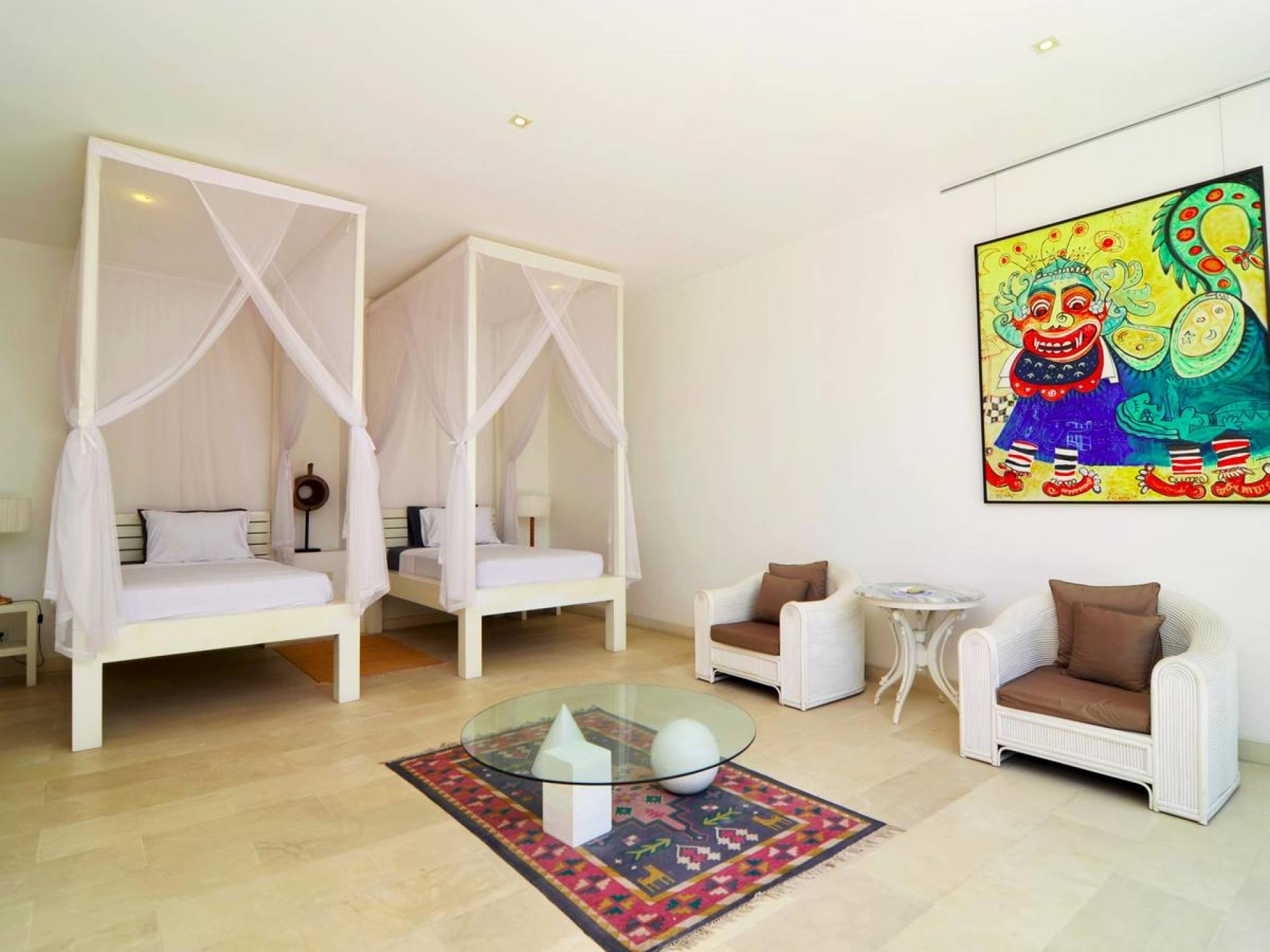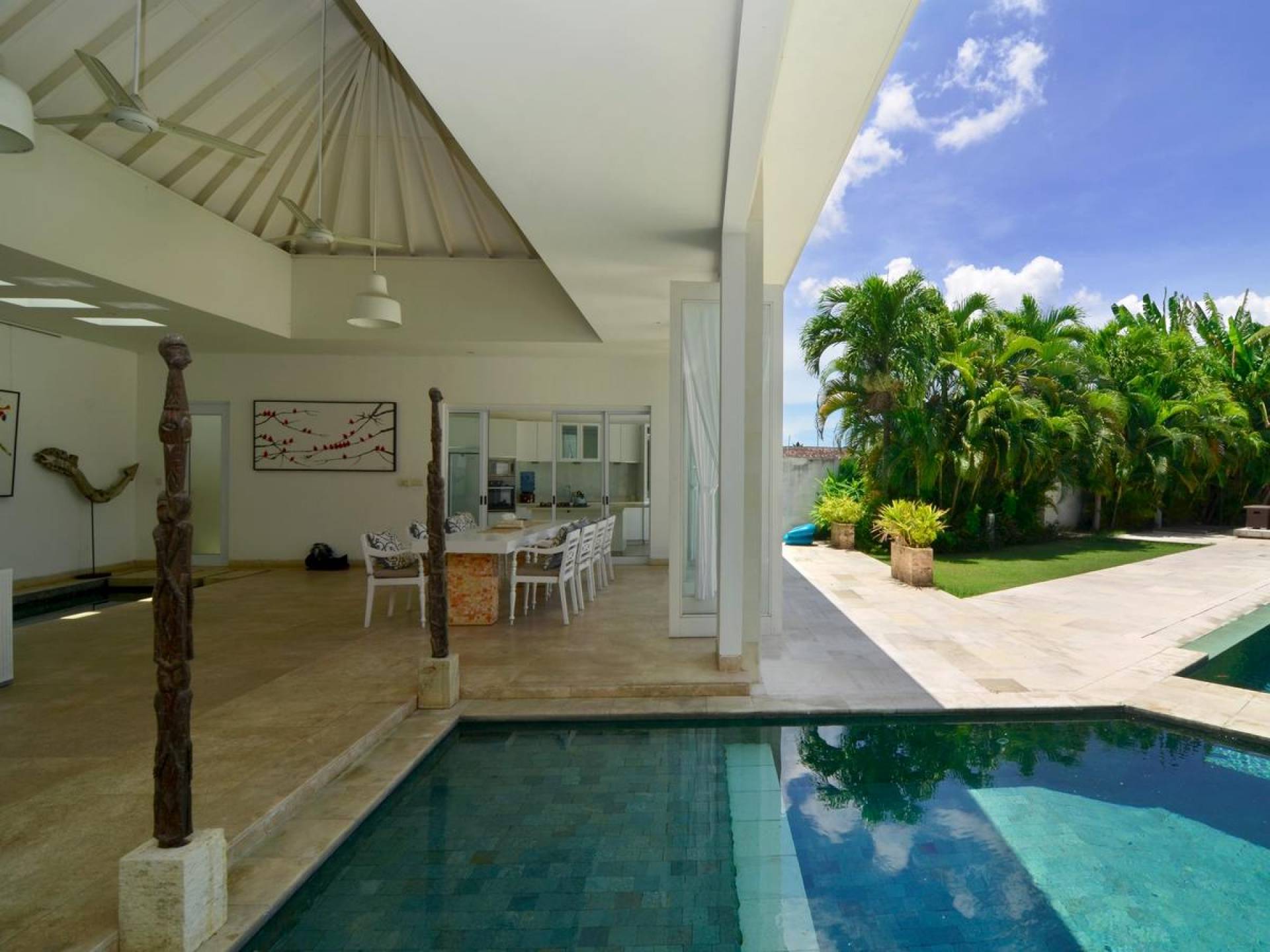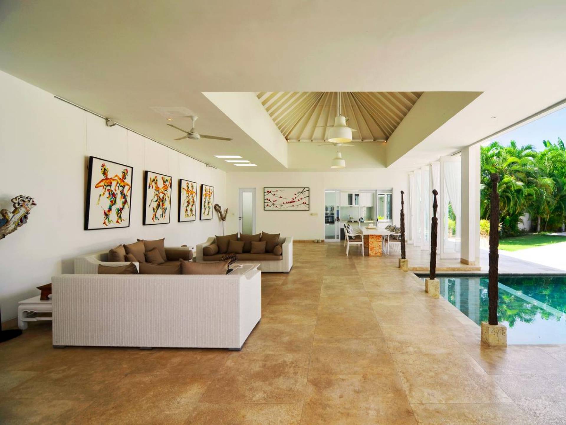 A bridge over the pool leads from one side to the other side of the garden. The best place to enjoy sunset drinks is up on the rooftop terrace in the afternoon. The spacious living pavilion features a tropical open-plan design from where you can step straight into the pool. Inside, there is a separate shallow kiddies pool so the little ones can safely have some water fun while parents can keep an eye on them from the sofa, dining table, or even the kitchen. The interior design is ruled by traditional artwork, sculptures, and a Balinese musical instrument. There is a chic white leather sofa to lounge on, watching your favorite show on the satellite TV with DVD player. In the middle of the room stand three more sofas to sit together, enjoying the view of the garden and pool. For dinner, gather at the white-painted timber dining table for 8, enjoying some good food with your loved ones. The kitchen is fully equipped with everything needed and there is a kitchen bar with stools to sit and have drinks together at any time of the day.
