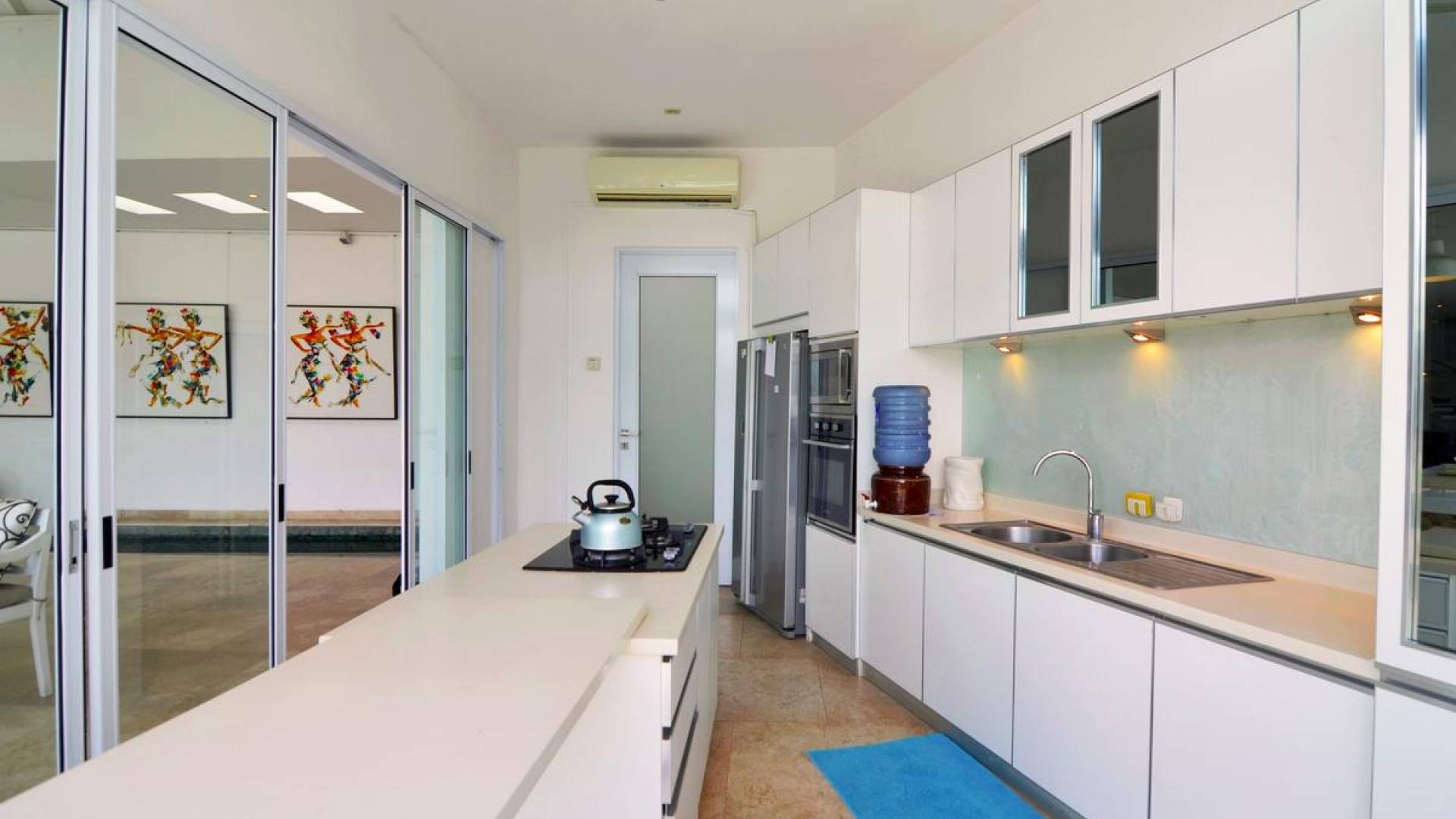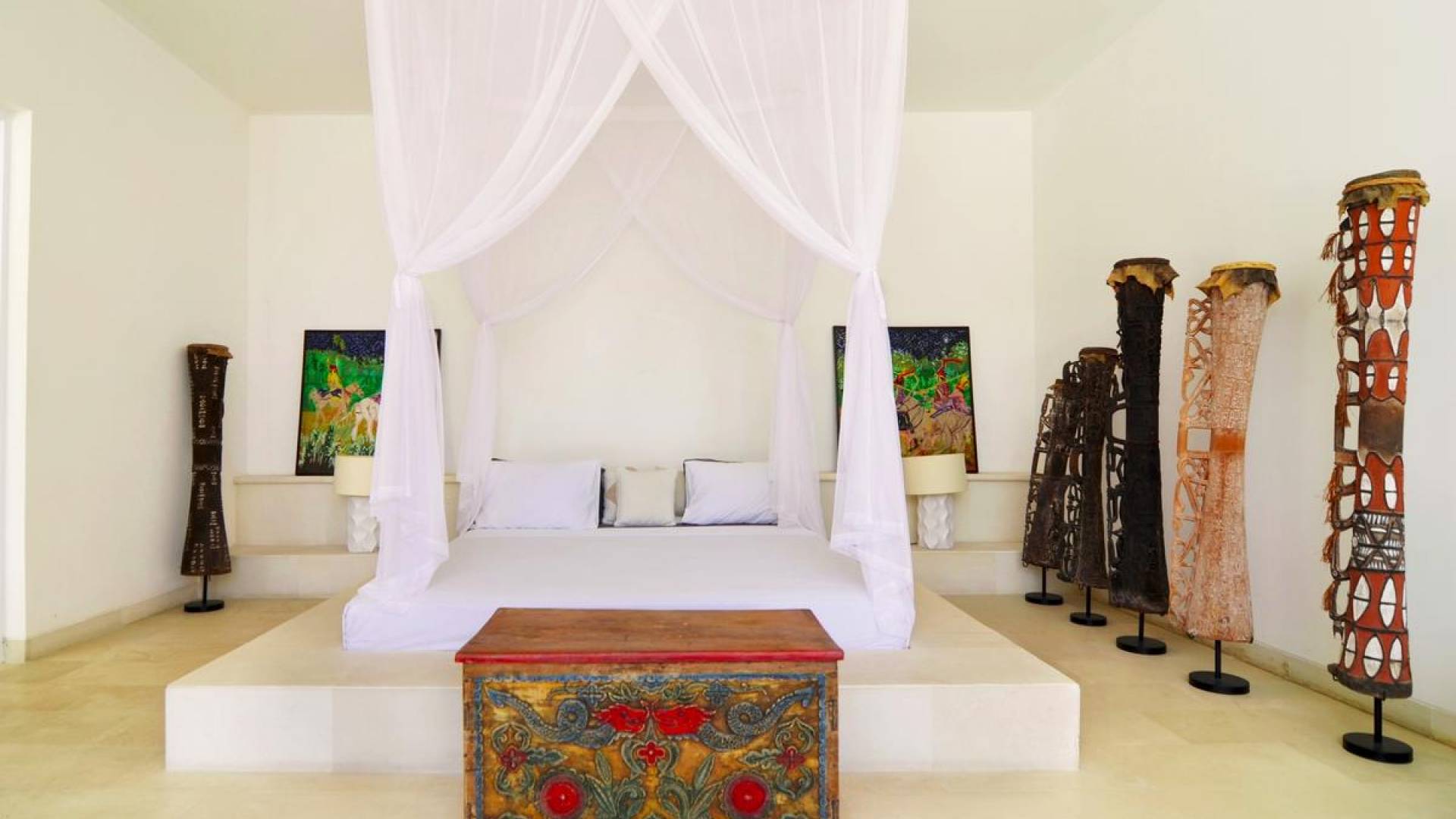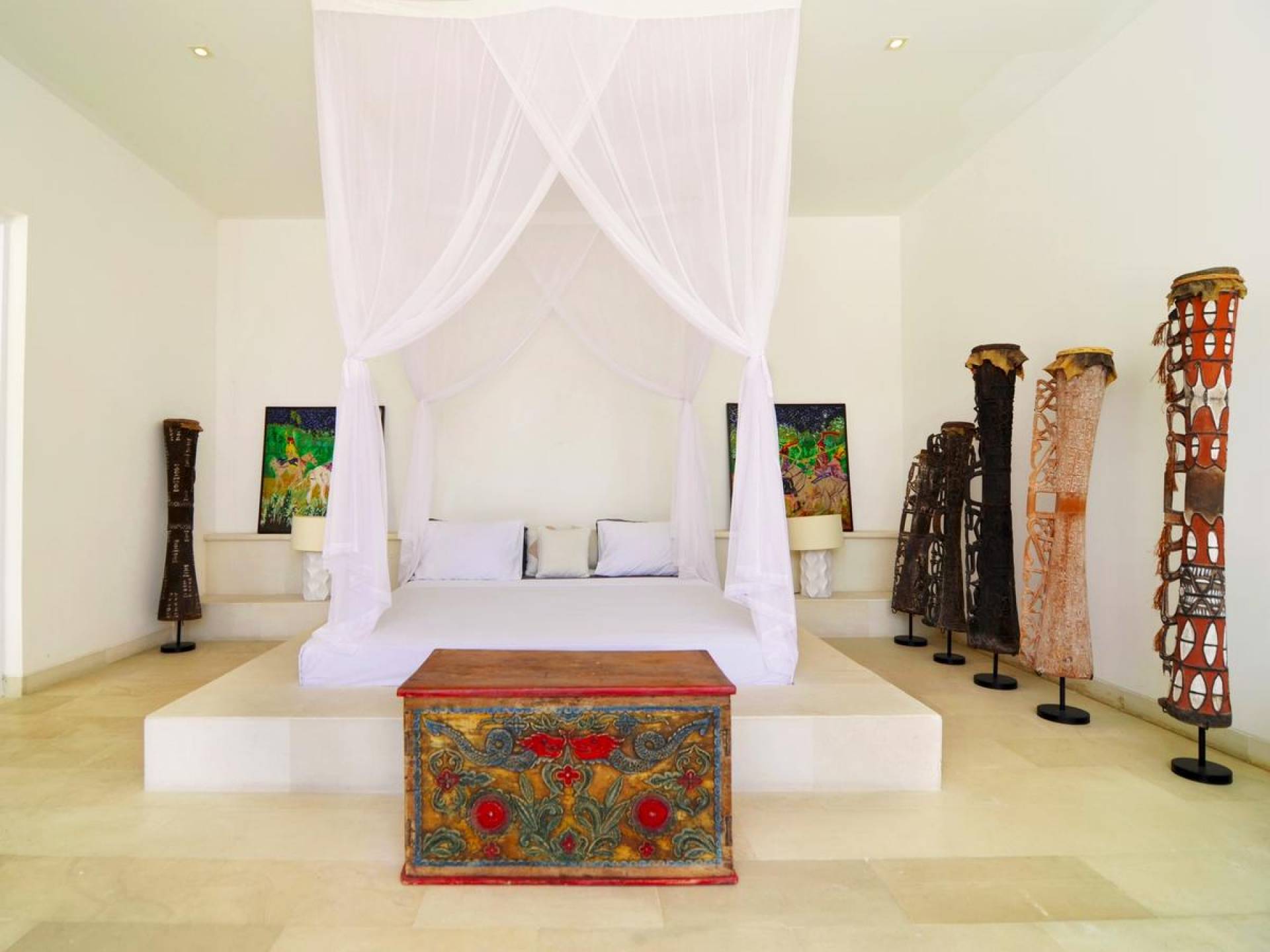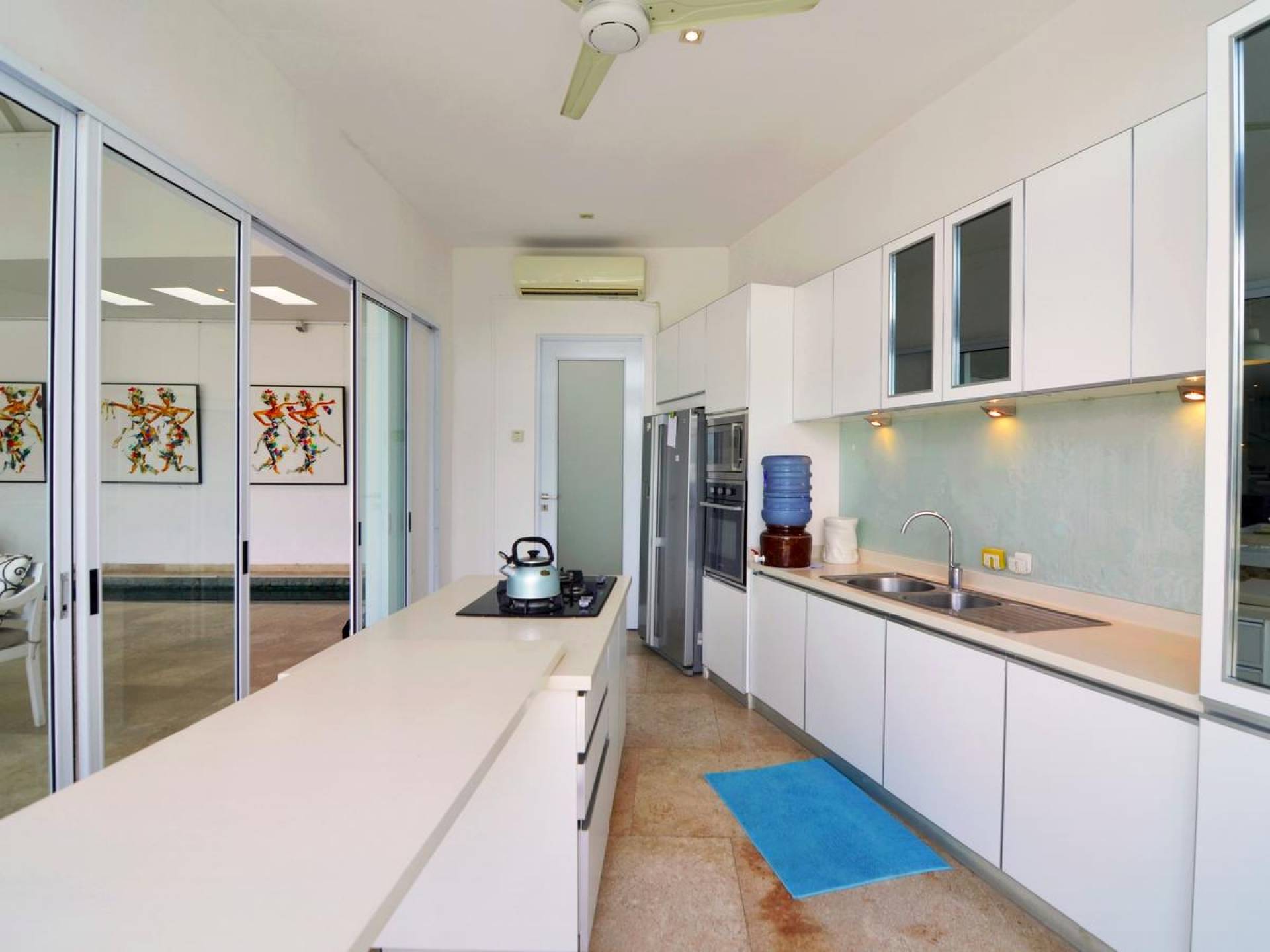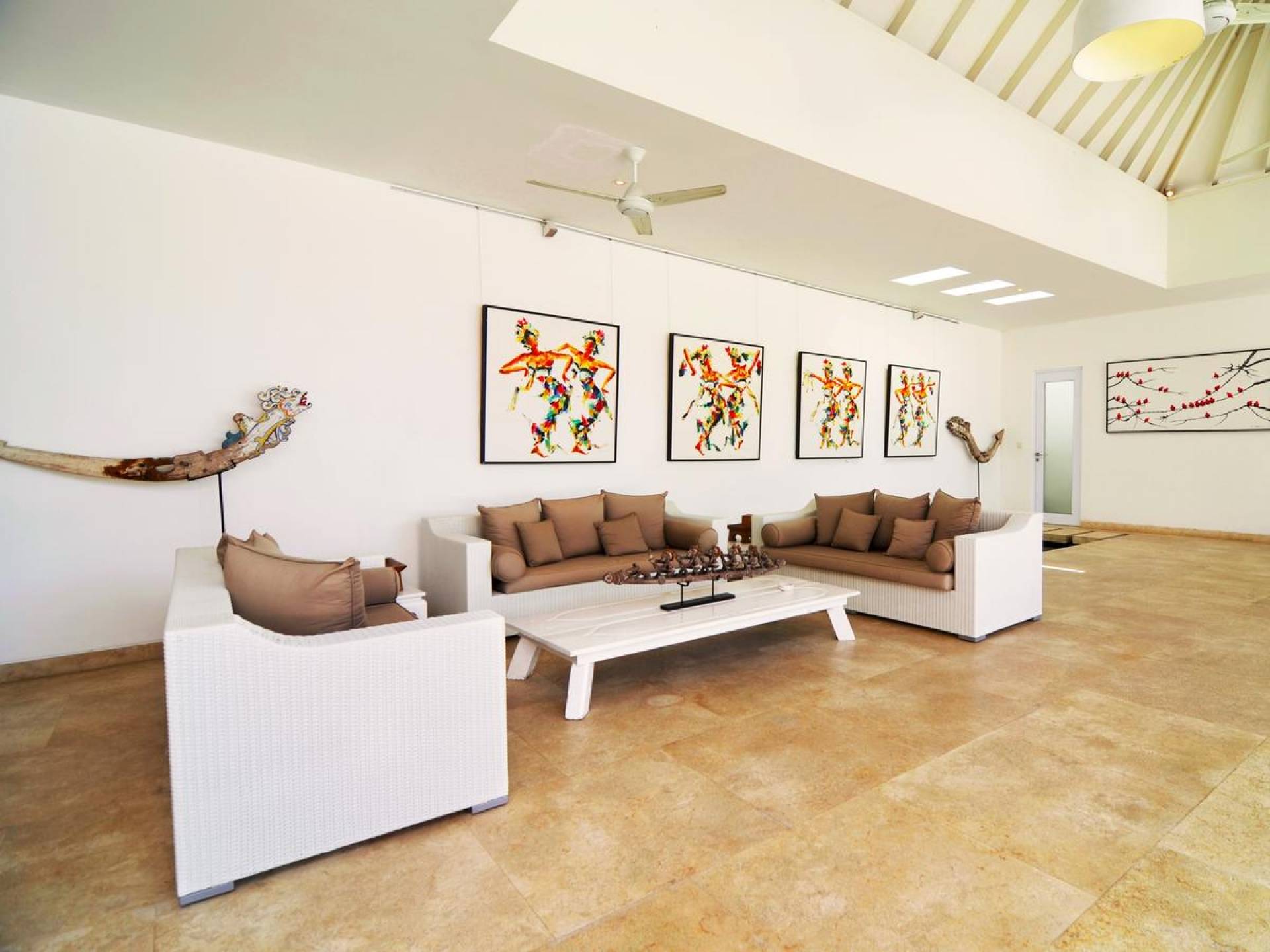 A bridge over the pool leads from one side to the other side of the garden. The best place to enjoy sunset drinks is up on the rooftop terrace in the afternoon. The spacious living pavilion features a tropical open-plan design from where you can step straight into the pool. Inside, there is a separate shallow kiddies pool so the little ones can safely have some water fun while parents can keep an eye on them from the sofa, dining table, or even the kitchen. The interior design is ruled by traditional artwork, sculptures, and a Balinese musical instrument. There is a chic white leather sofa to lounge on, watching your favorite show on the satellite TV with DVD player. In the middle of the room stand three more sofas to sit together, enjoying the view of the garden and pool. For dinner, gather at the white-painted timber dining table for 8, enjoying some good food with your loved ones. The kitchen is fully equipped with everything needed and there is a kitchen bar with stools to sit and have drinks together at any time of the day.