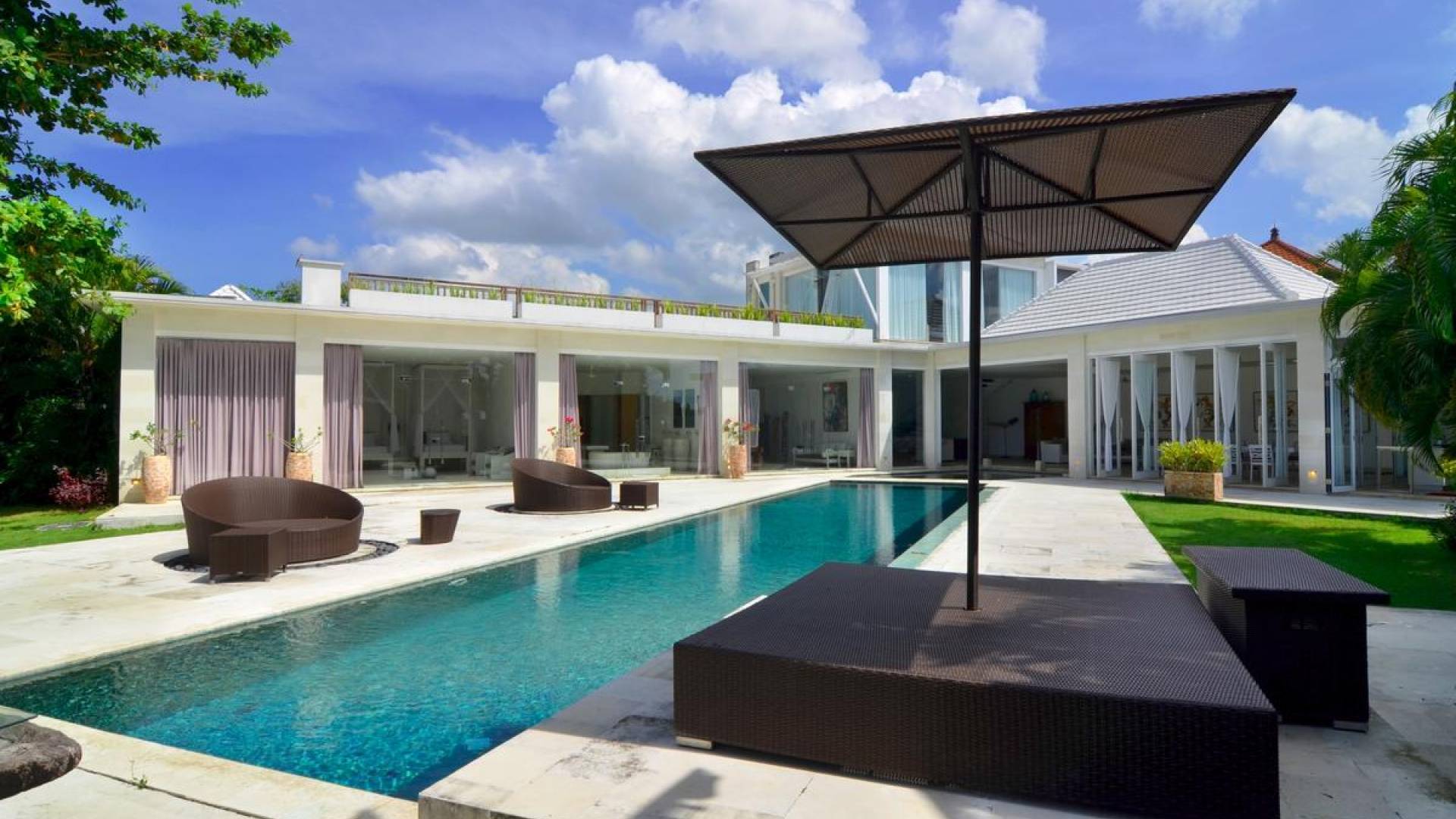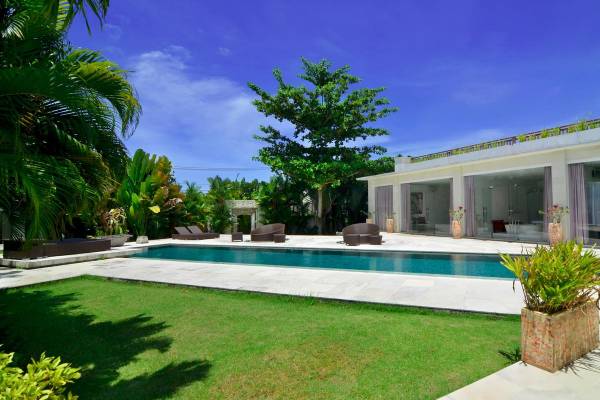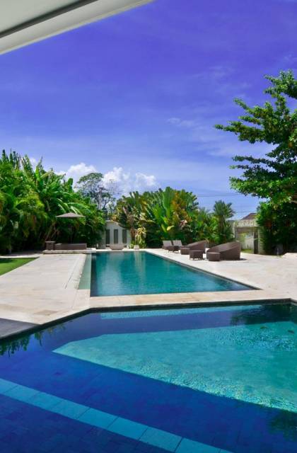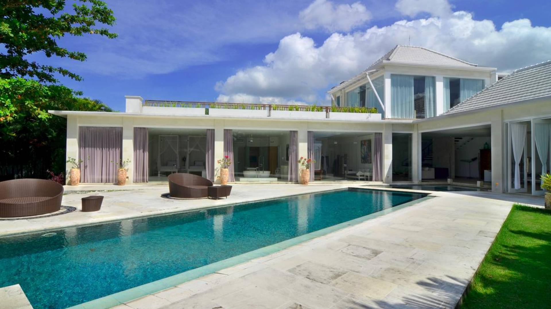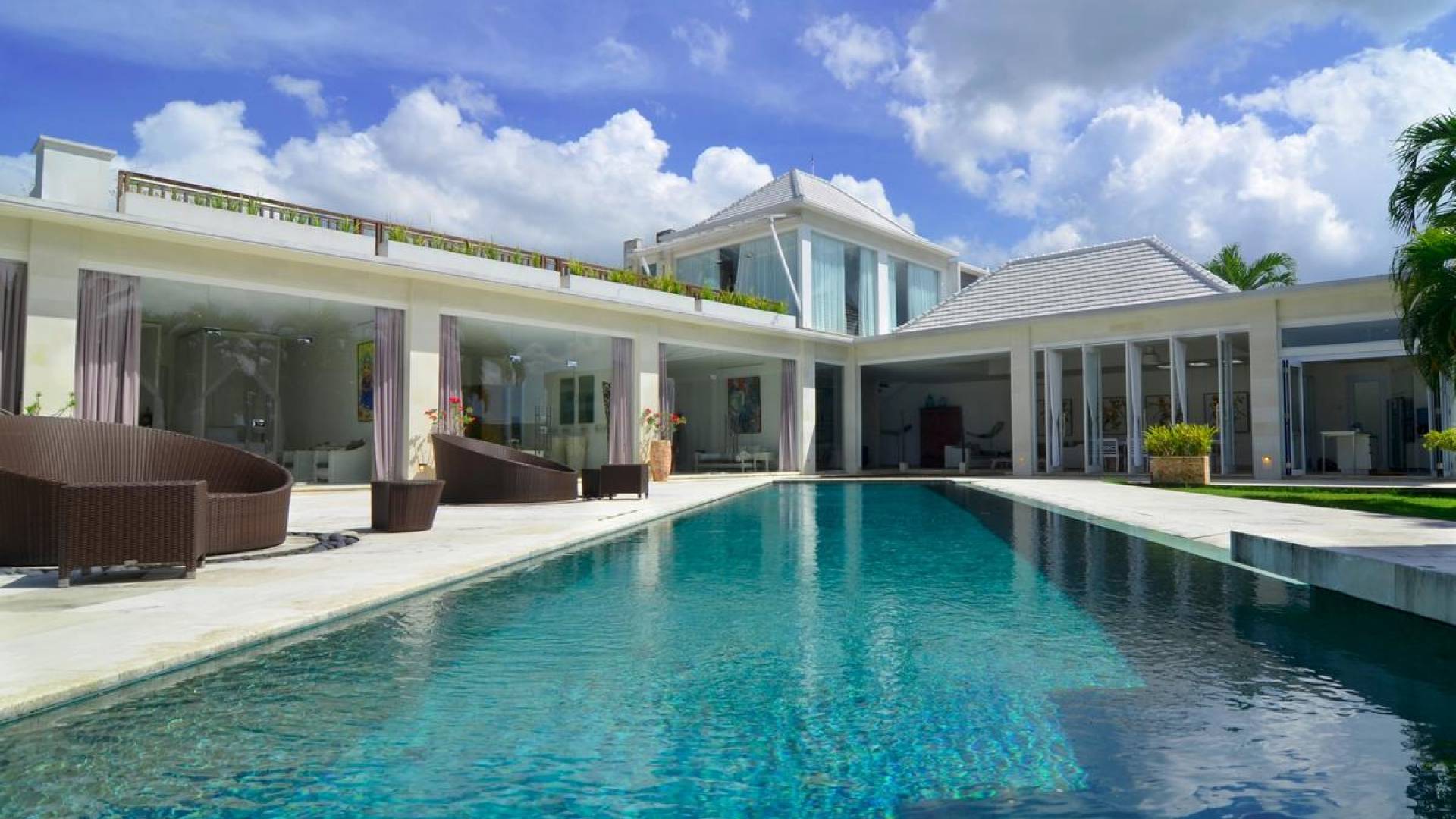 Villa Putih Satu Canggu is a contemporary luxury retreat located in Canggu, an area full of rice paddies, rural life, unspoiled beaches, and tourist spots next to the trendy town of Seminyak. Canggu is a surfing haven still it is peaceful and simply beautiful. The 3-bedroom Villa Putih features a stunning white architectural design, a rooftop terrace, and a huge garden with a large lap pool sparkling in the middle. This villa exudes style and sophistication and it makes a great luxury home on Bali island for families and groups of friends.