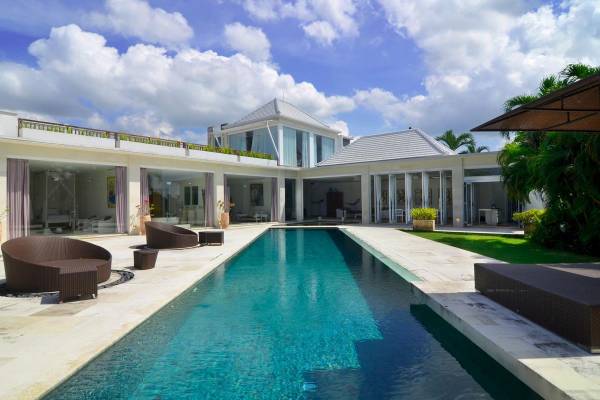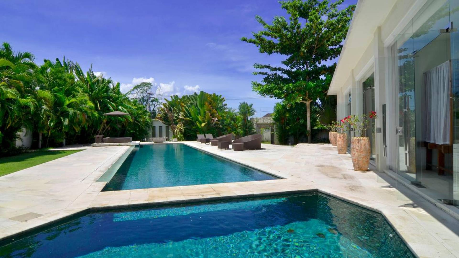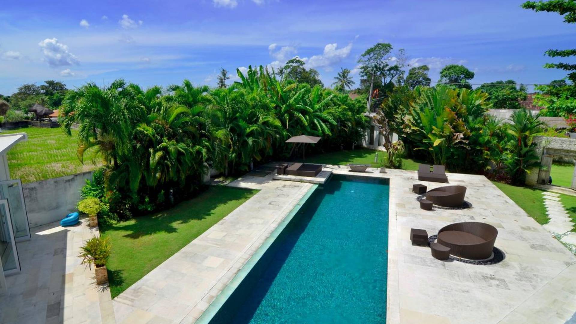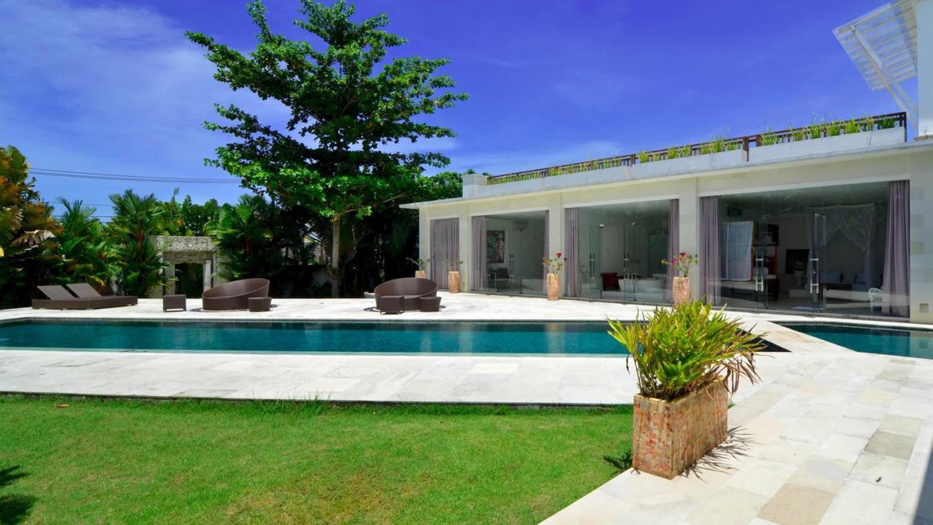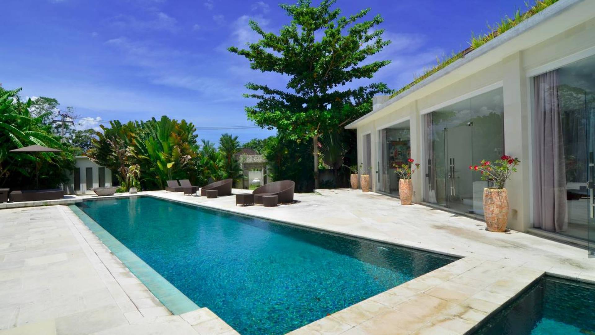 Villa Putih Satu Canggu is a contemporary luxury retreat located in Canggu, an area full of rice paddies, rural life, unspoiled beaches, and tourist spots next to the trendy town of Seminyak. Canggu is a surfing haven still it is peaceful and simply beautiful. The 3-bedroom Villa Putih features a stunning white architectural design, a rooftop terrace, and a huge garden with a large lap pool sparkling in the middle. This villa exudes style and sophistication and it makes a great luxury home on Bali island for families and groups of friends.