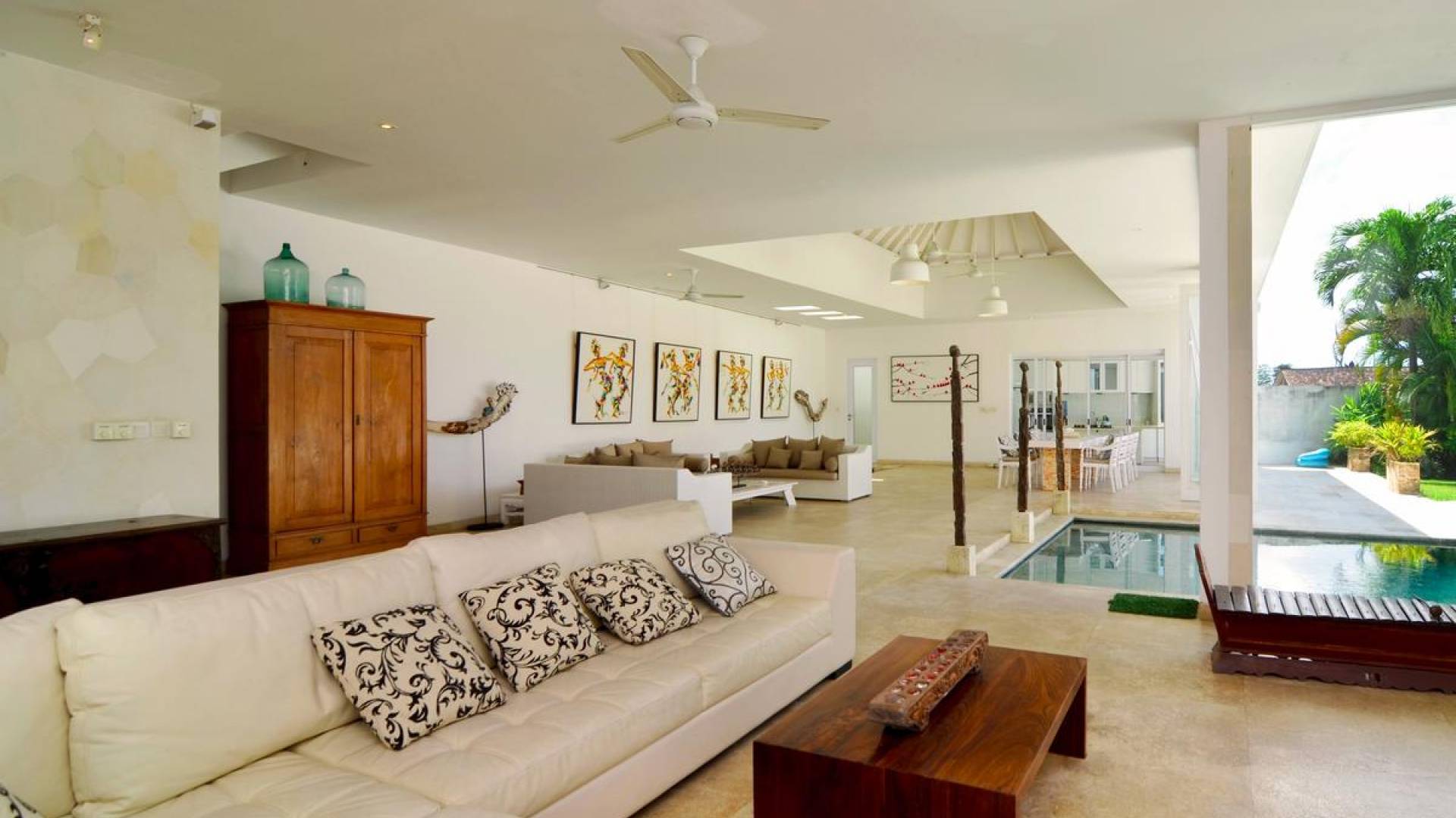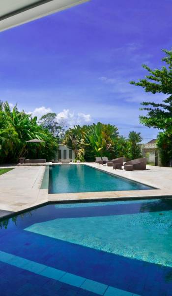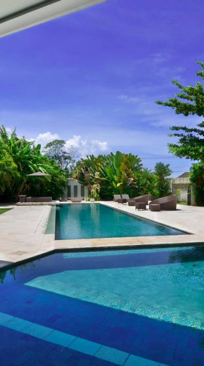 A large private parking lot sits in front of Villa Putih Satu Canggu. A carved wooden gate opens up to the expansive, sunny tropical garden of Villa Putih Satu. The garden is fully encompassed by lush green plants and trees, ensuring privacy and peacefulness. In the heart of the estate sparkles a huge private swimming pool surrounded by a stone sundeck with sun loungers and day beds. Swimming laps in the pool start in the living room and it ends at the other side of the garden.