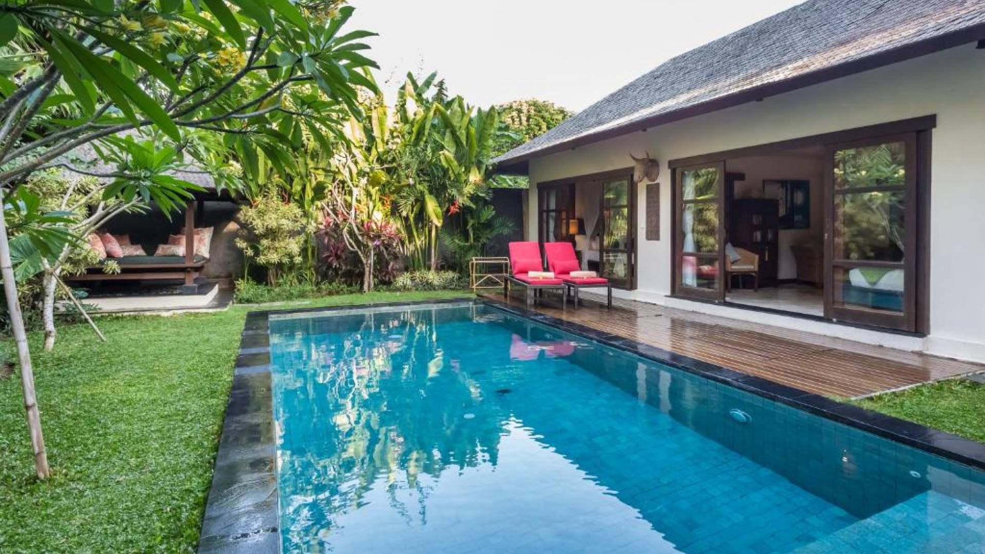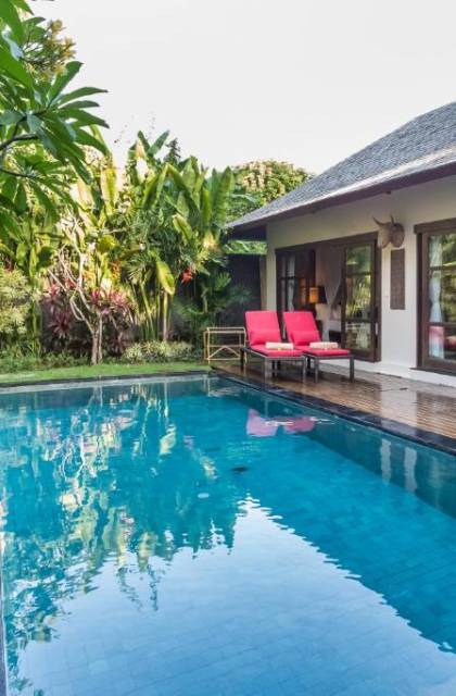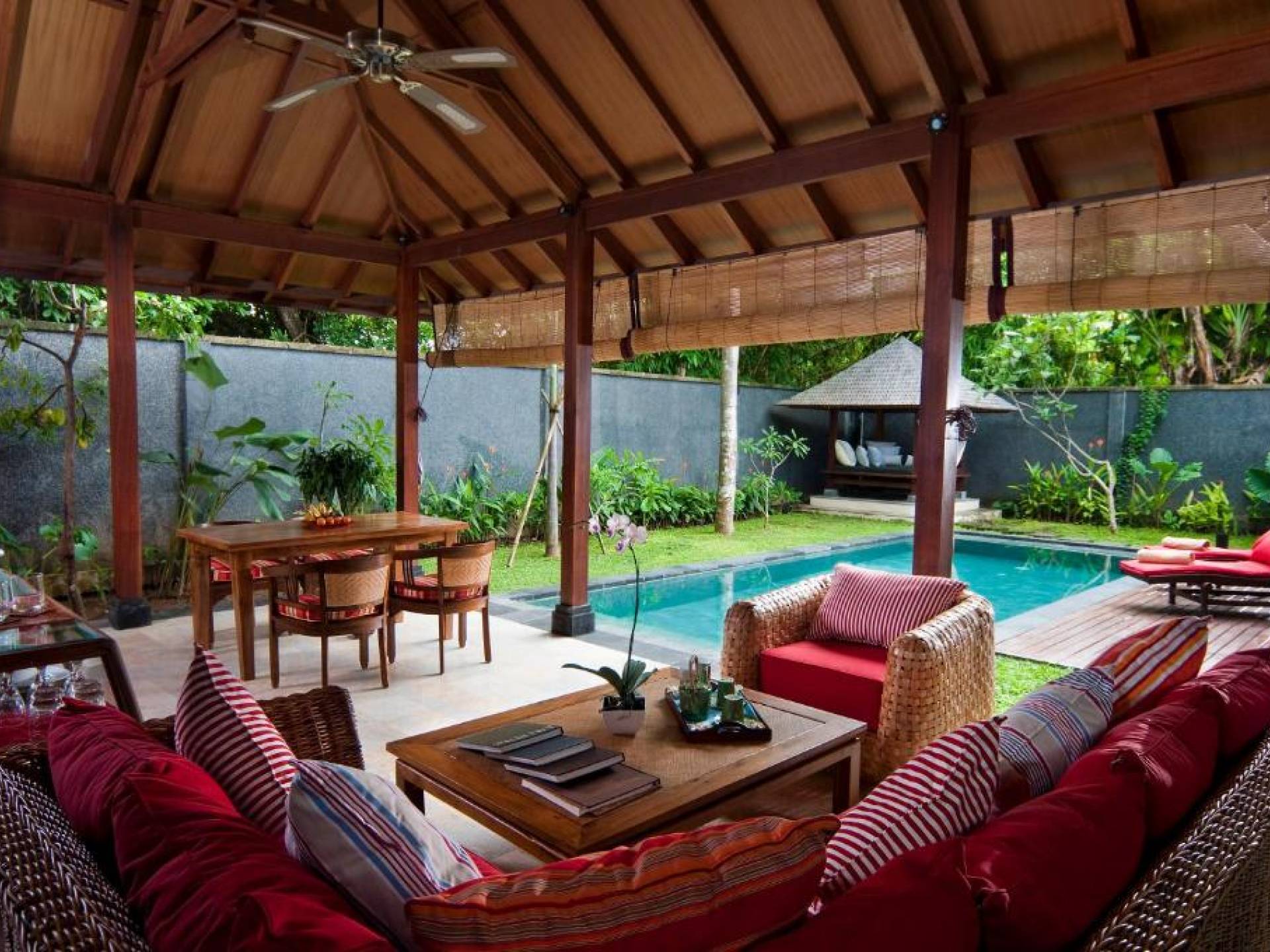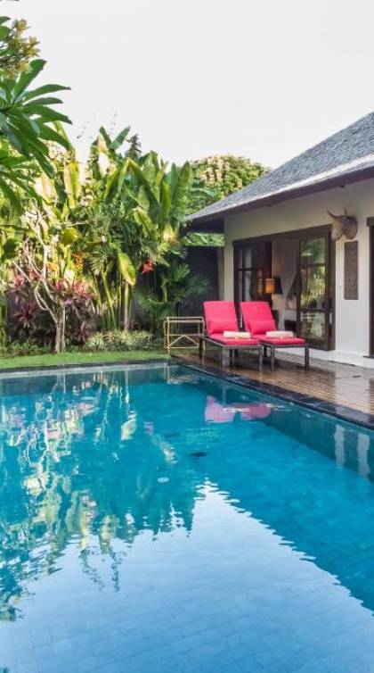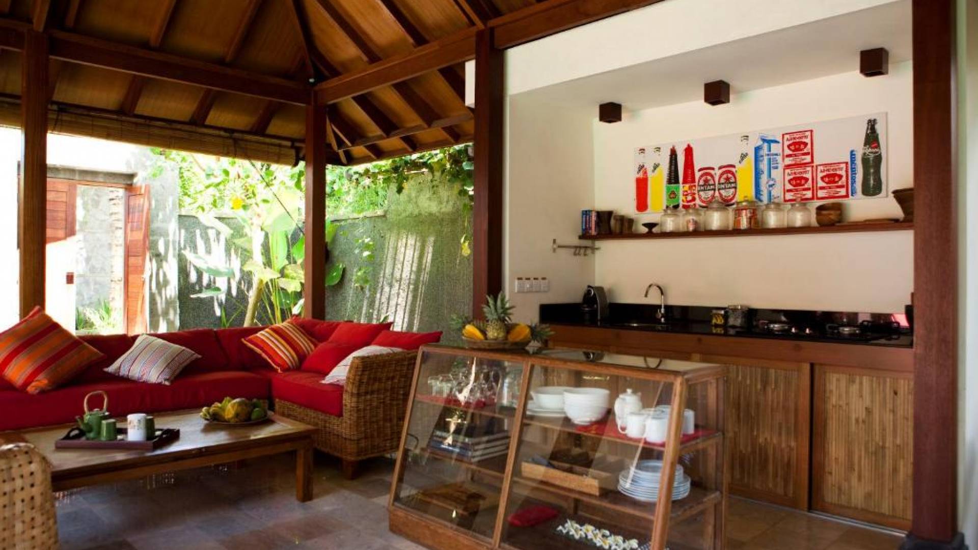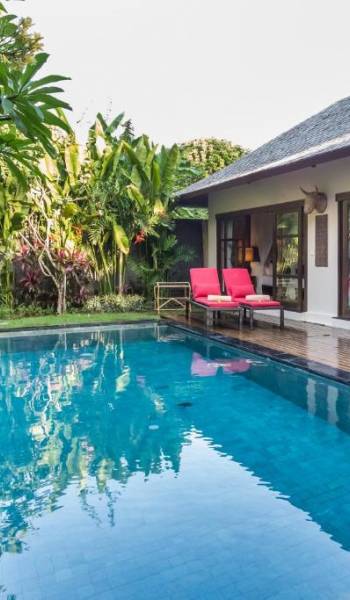 The luxury villas were designed by using the simplicity of Balinese architecture and the use of local materials such as bamboo, old teak wood, and white Palimanan stone, together with ironwood shingle roofs. All of this combined with modern facilities; such as air-conditioning, open living room, well-equipped kitchen, etc. The guests can relax in the private courtyard while sunbathing by the swimming pool deck or simply seated on the sofa enjoying the private lush garden of the villa.