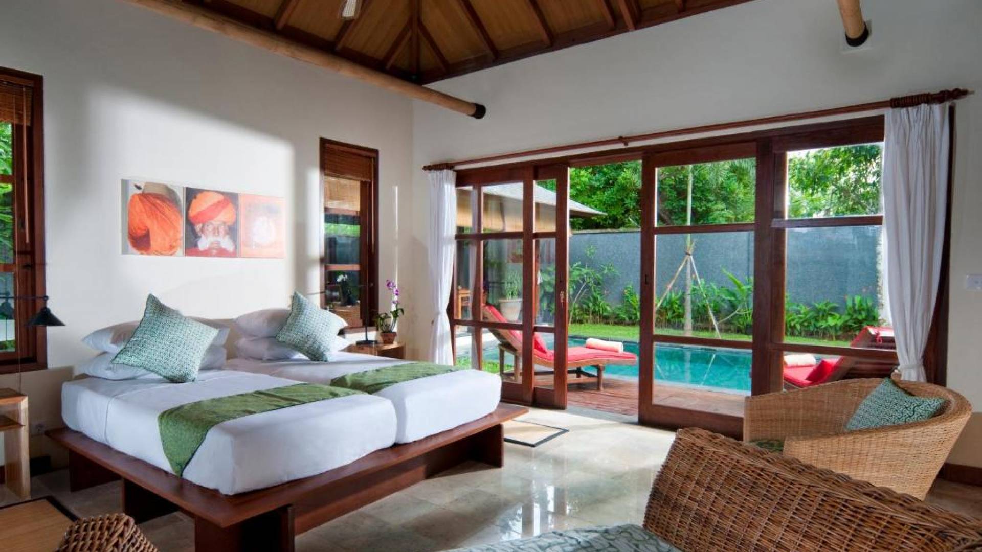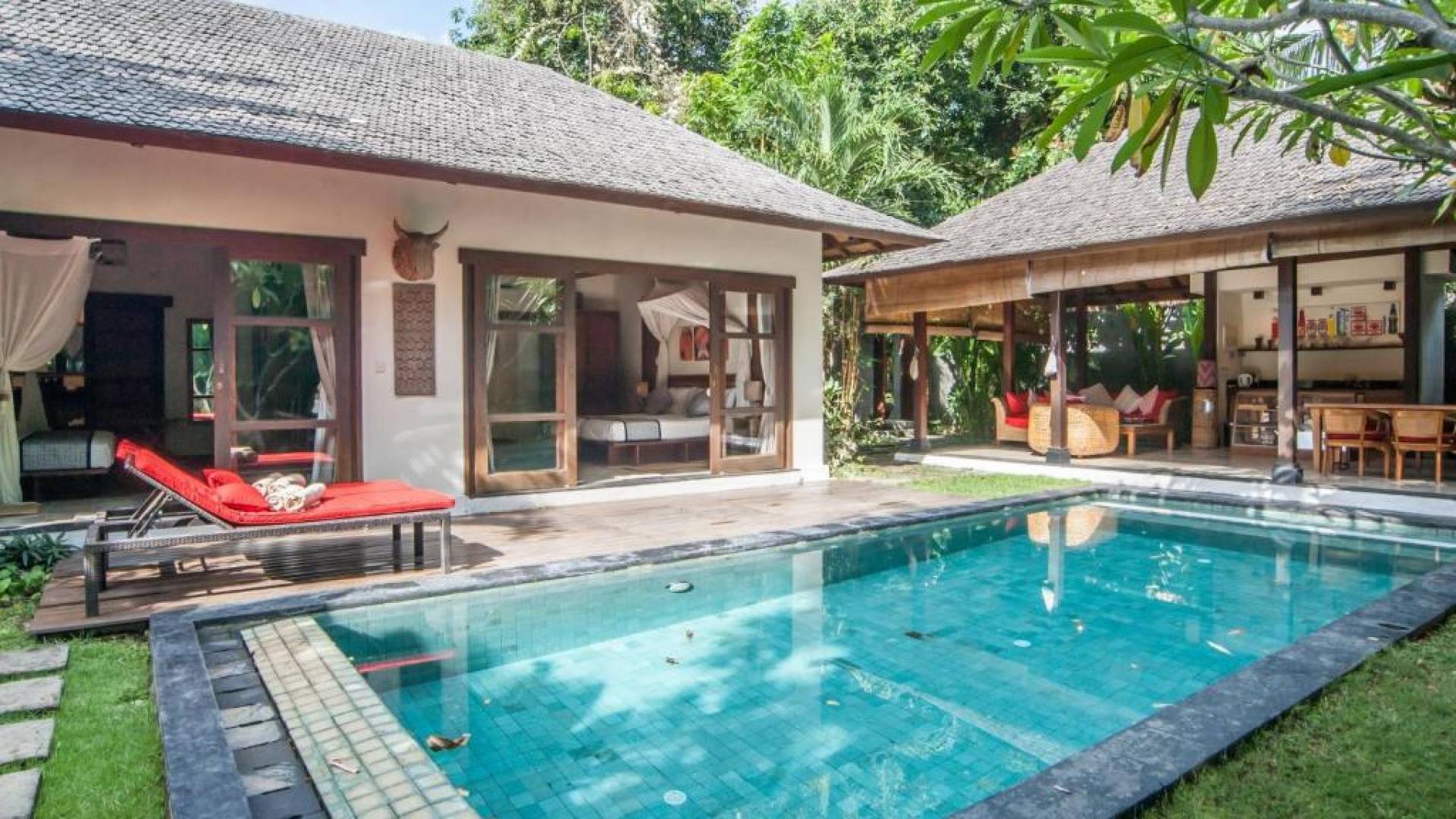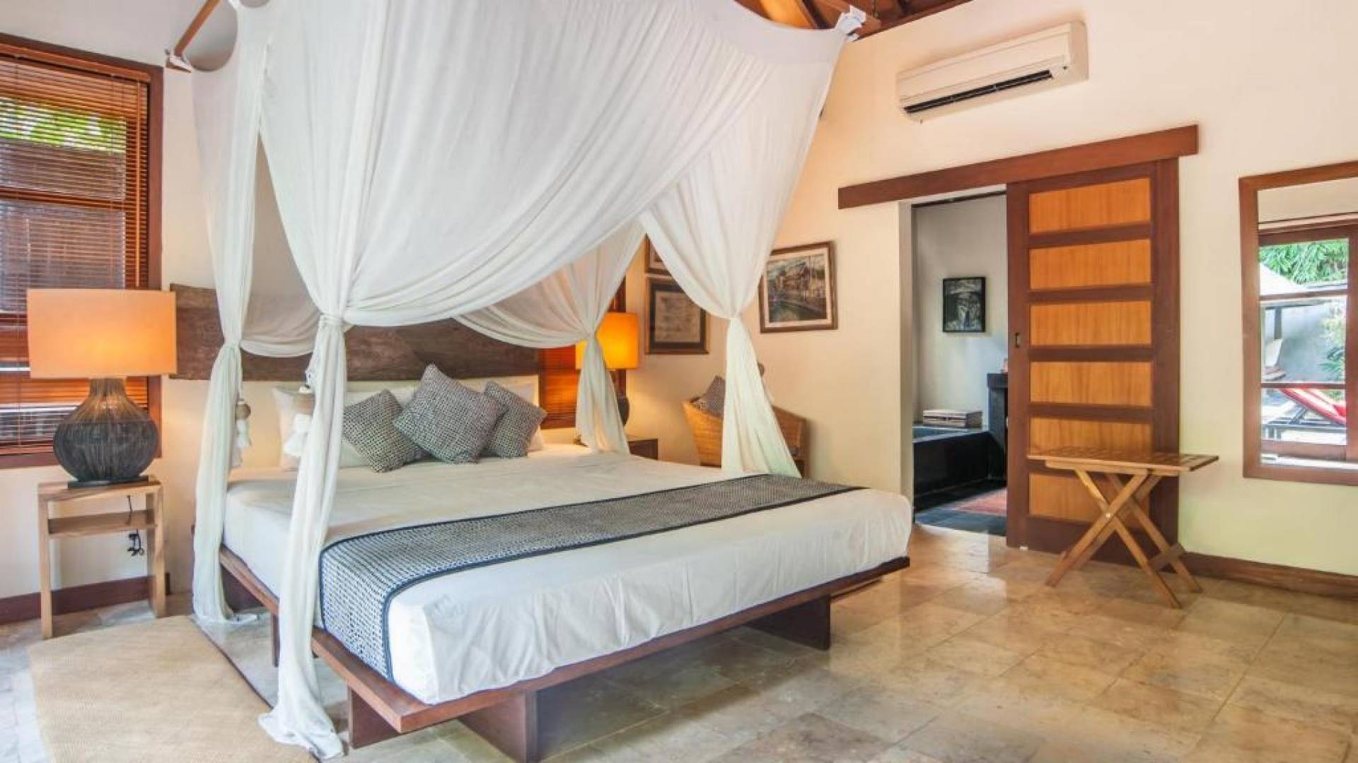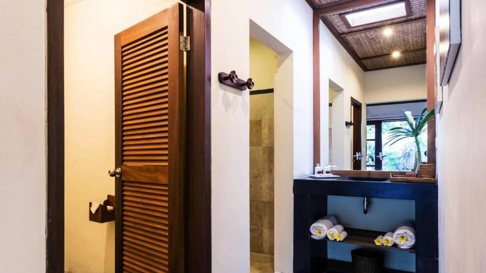 The elegant interior consists of a master bedroom with a king-size bed and satellite flat-screen TV, DVD, and i-pod dock. It is connected with the twin bedded room and both are equipped with mosquito nets, ceiling fan, and air conditioning. Each room has its private bathroom with a stone-carved washing basin and separate shower and toilet, the bathroom in the master bedroom includes a black bathtub. Outside the private 9-meter, a long lap pool is bordered by the wooden terrace, sun lounges, and a Bale to relax.