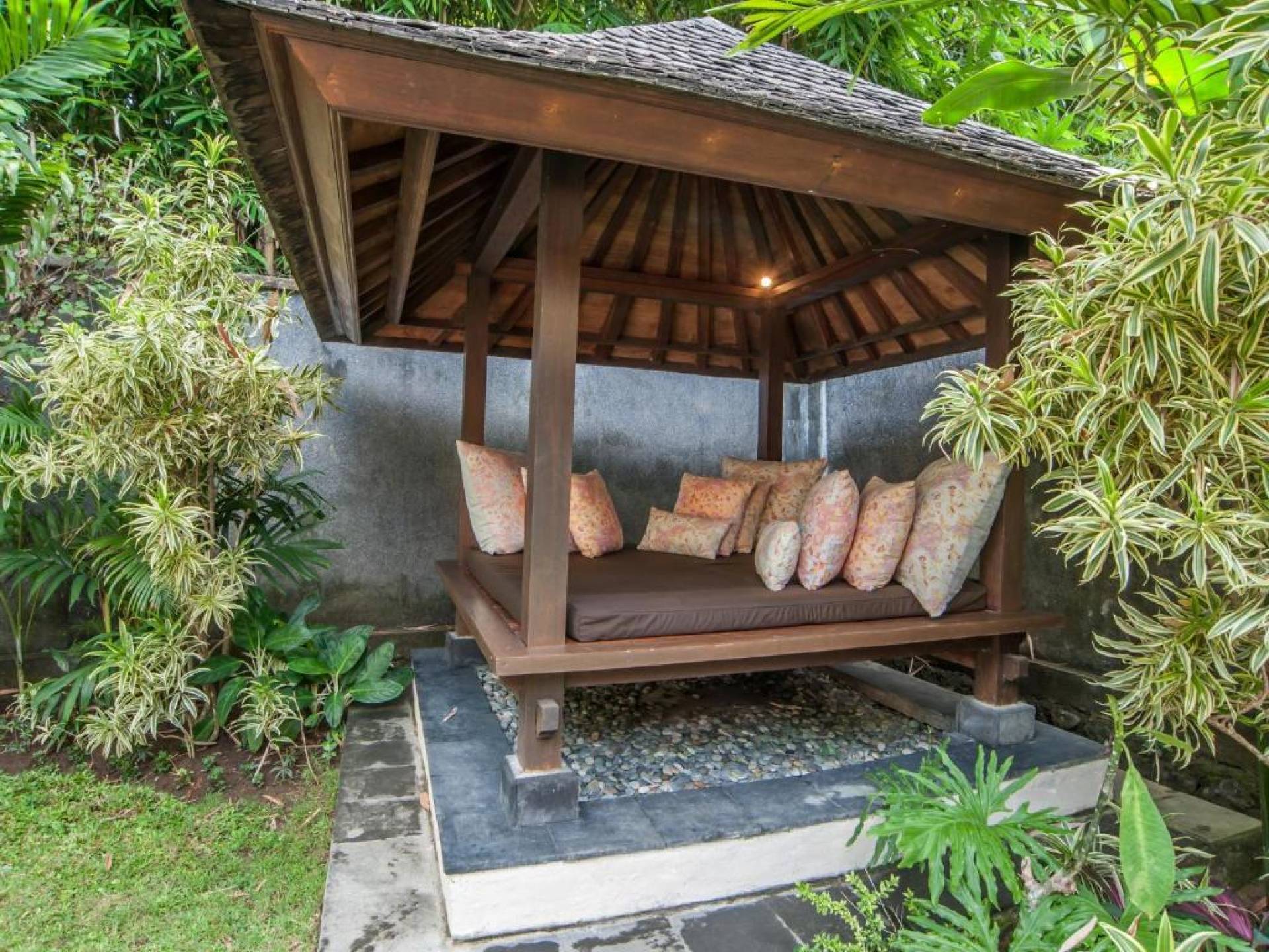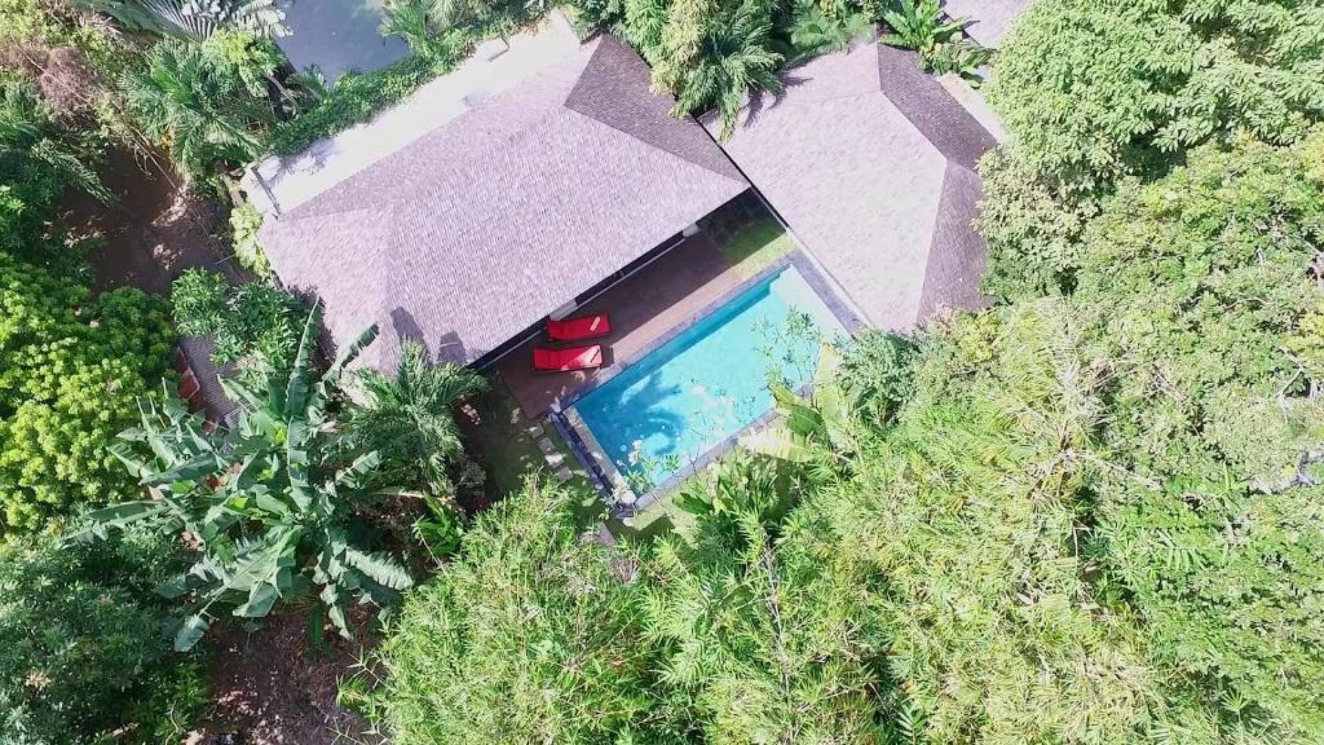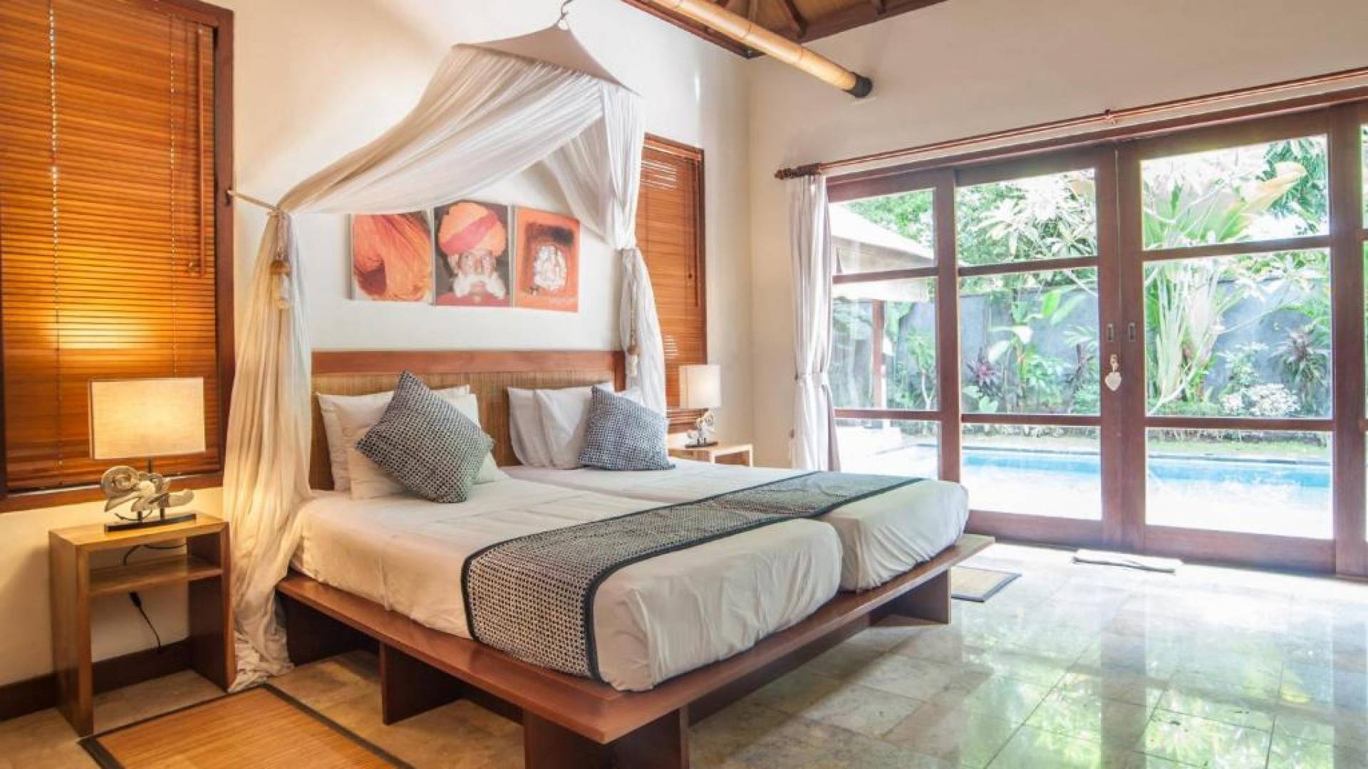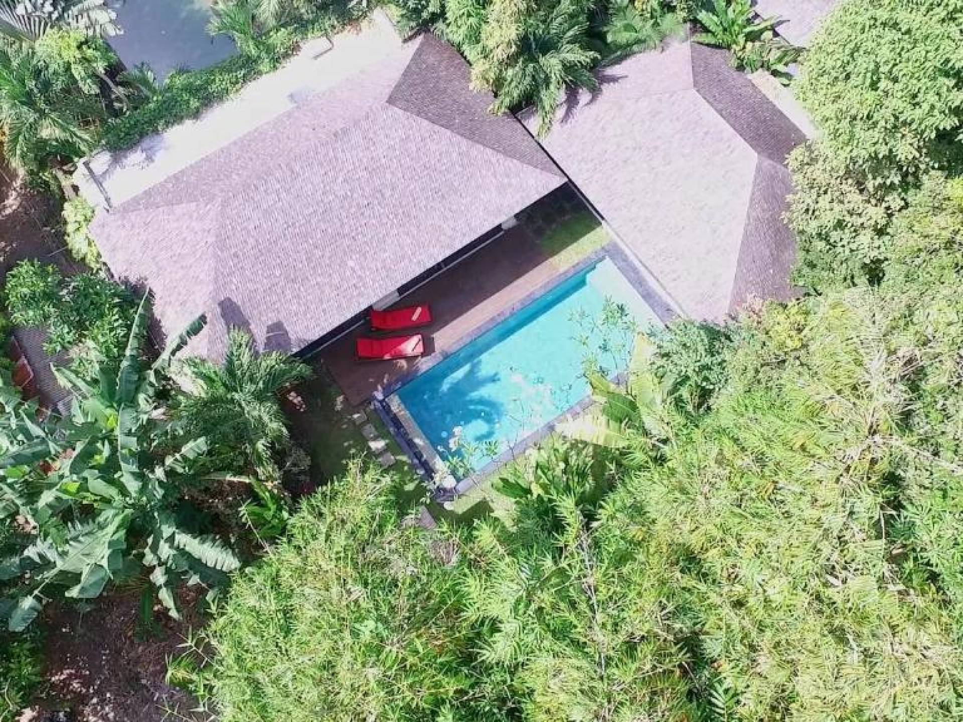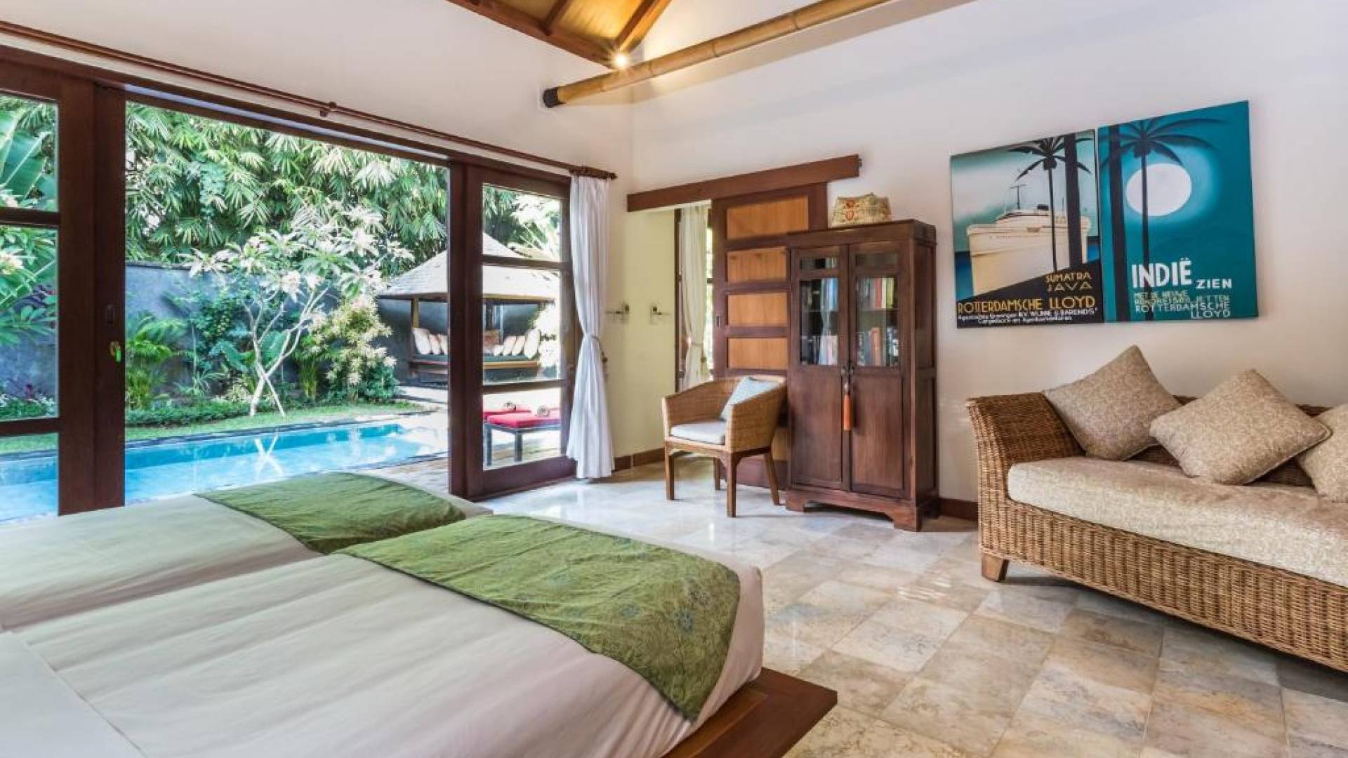 The elegant interior consists of a master bedroom with a king-size bed and satellite flat-screen TV, DVD, and i-pod dock. It is connected with the twin bedded room and both are equipped with mosquito nets, ceiling fan, and air conditioning. Each room has its private bathroom with a stone-carved washing basin and separate shower and toilet, the bathroom in the master bedroom includes a black bathtub. Outside the private 9-meter, a long lap pool is bordered by the wooden terrace, sun lounges, and a Bale to relax.