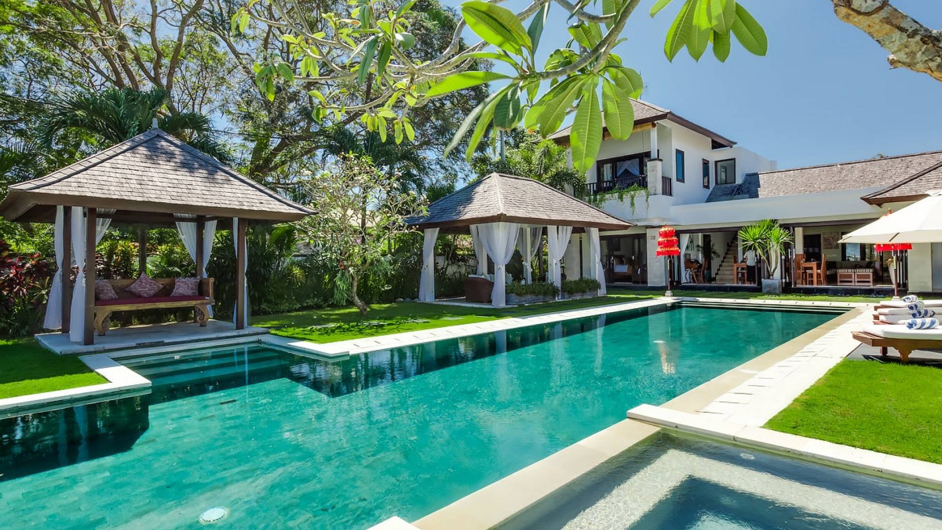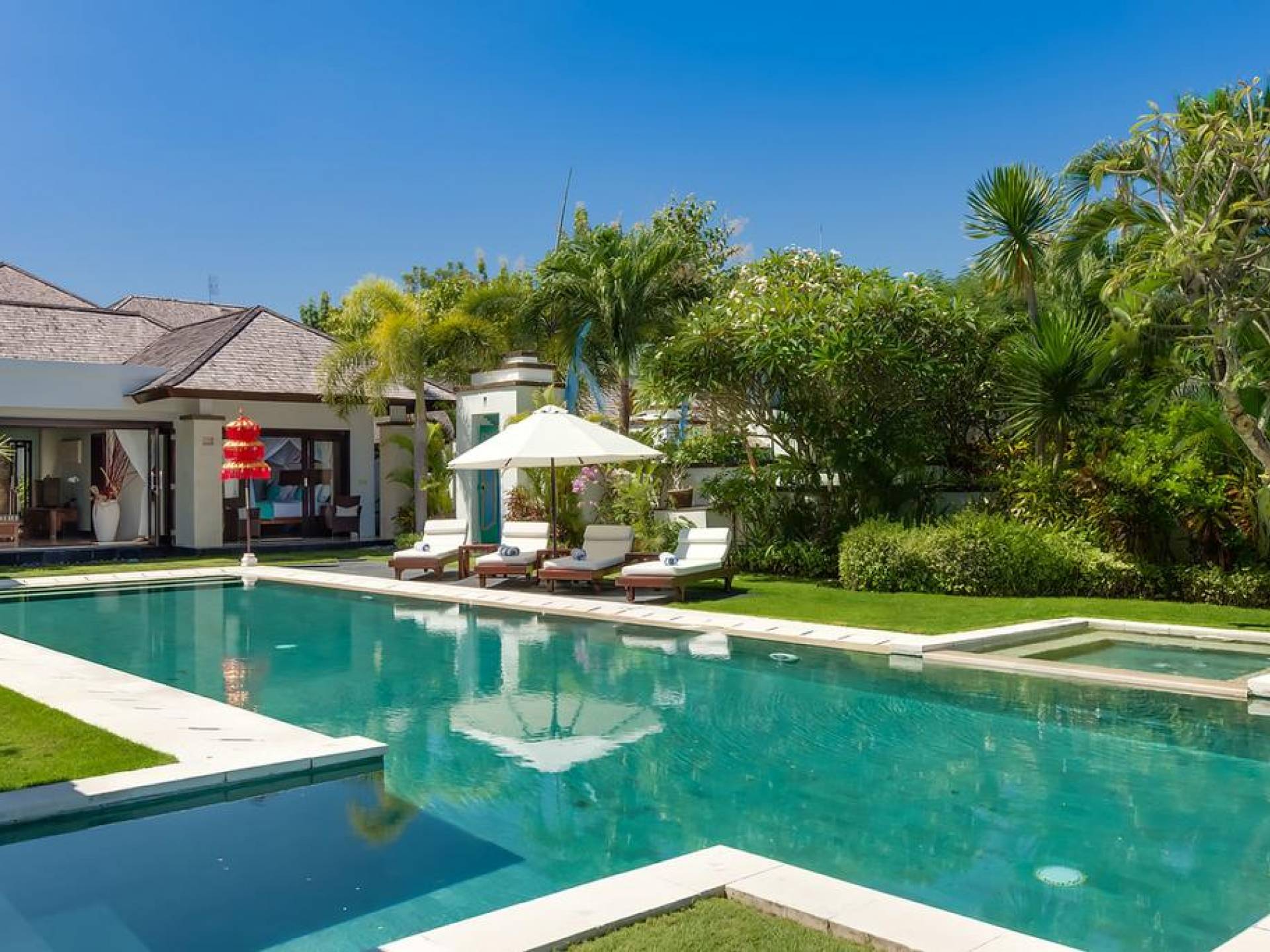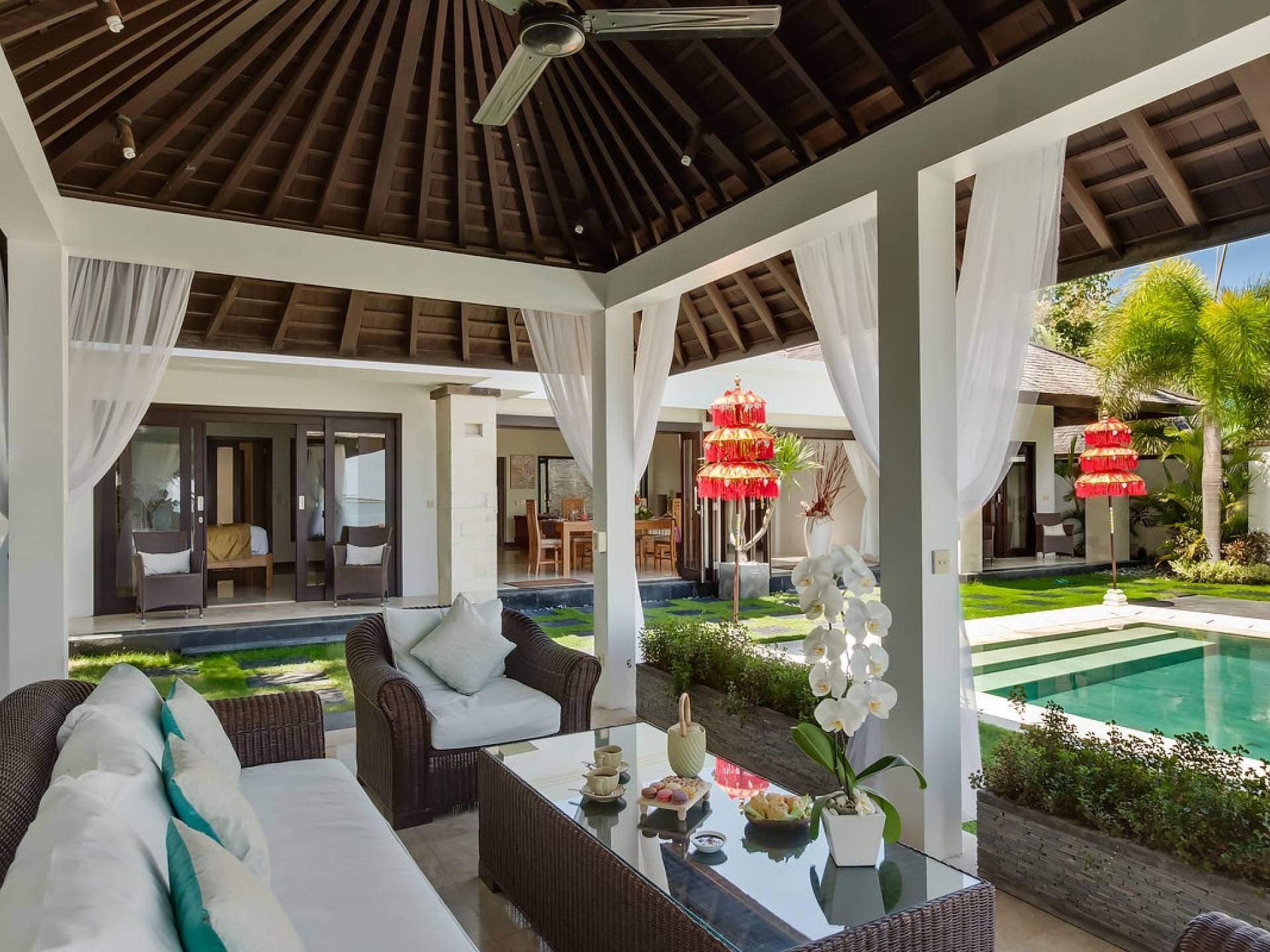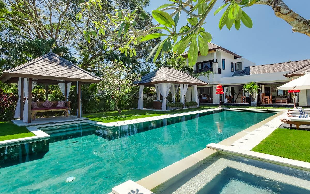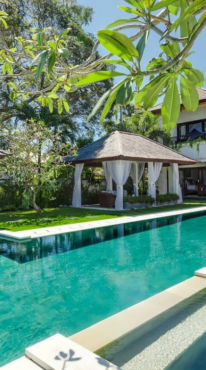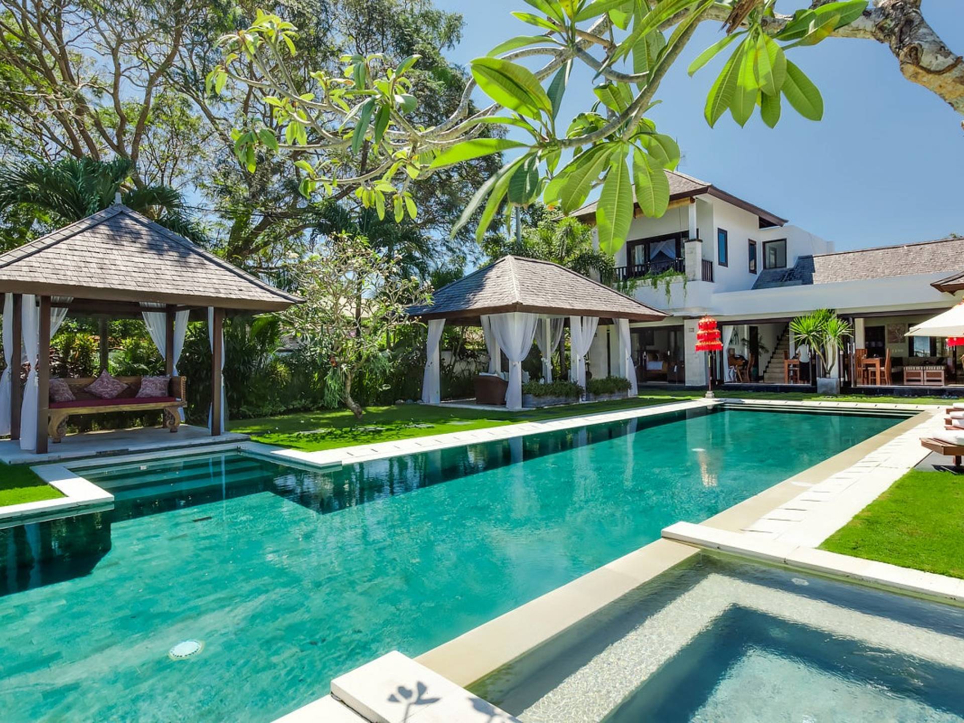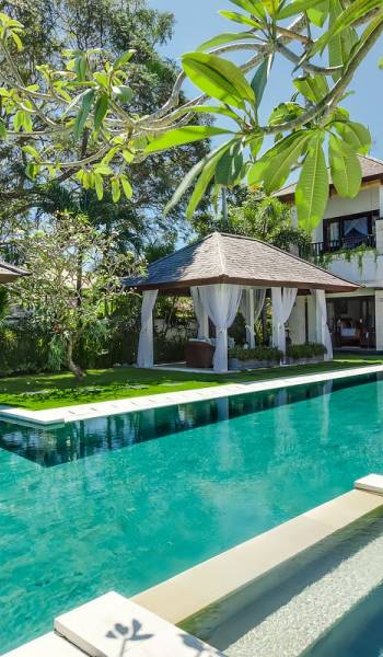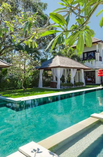 The main buildings and the adjacent open-air pavilions, gazebos, and terraces are surrounded by manicured gardens and plenty of water in the form of sky –blue swimming pools, decorative ponds, and waterfalls, which bring relief from the tropical heat and add to the laid-back, carefree Bali villa holiday atmosphere.