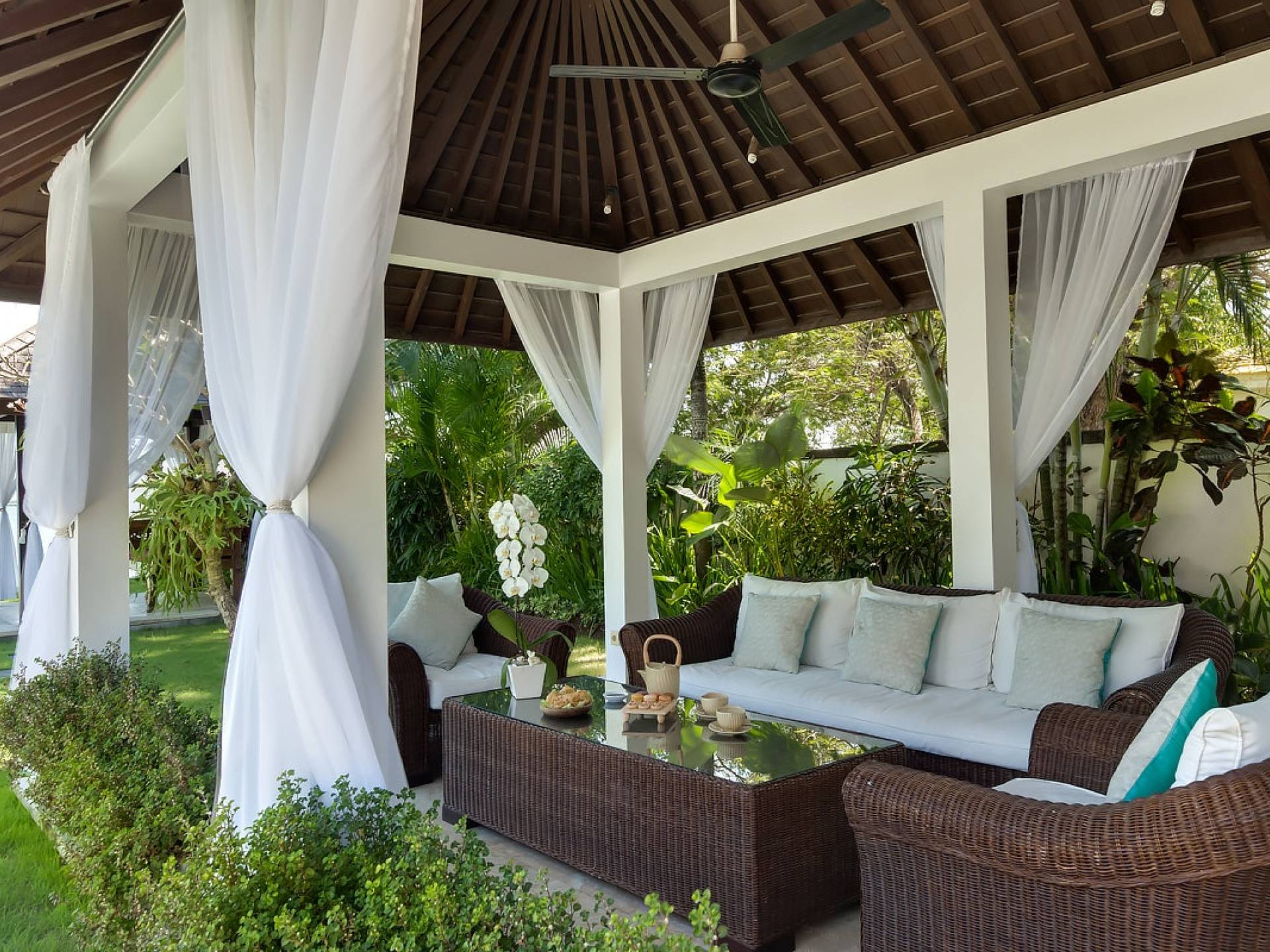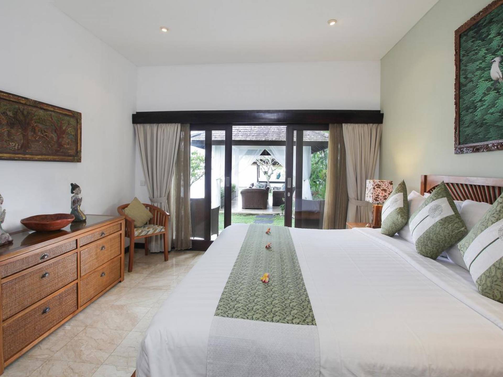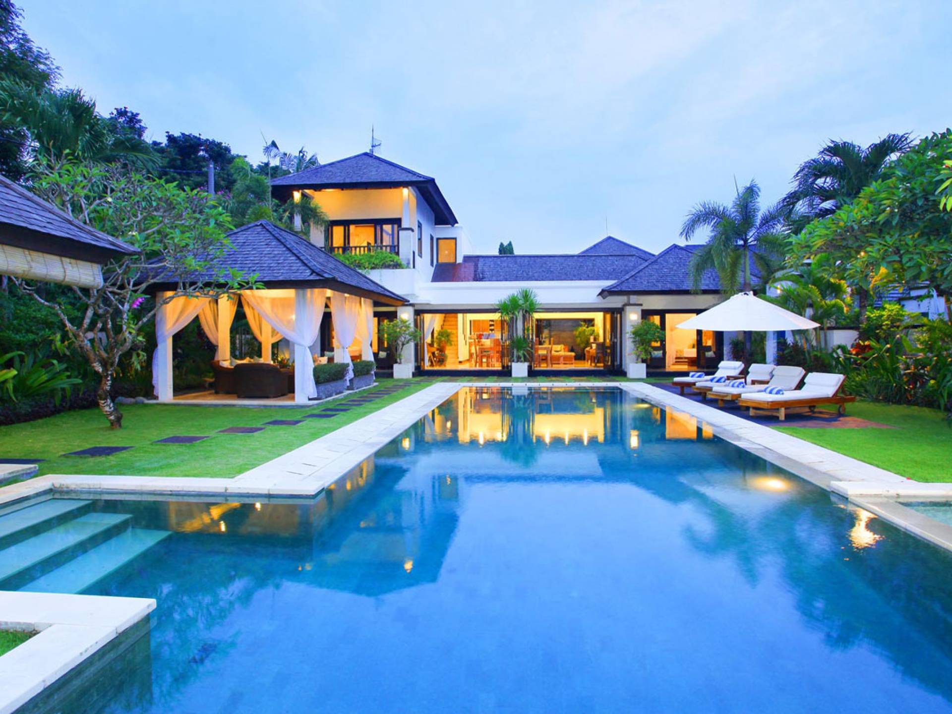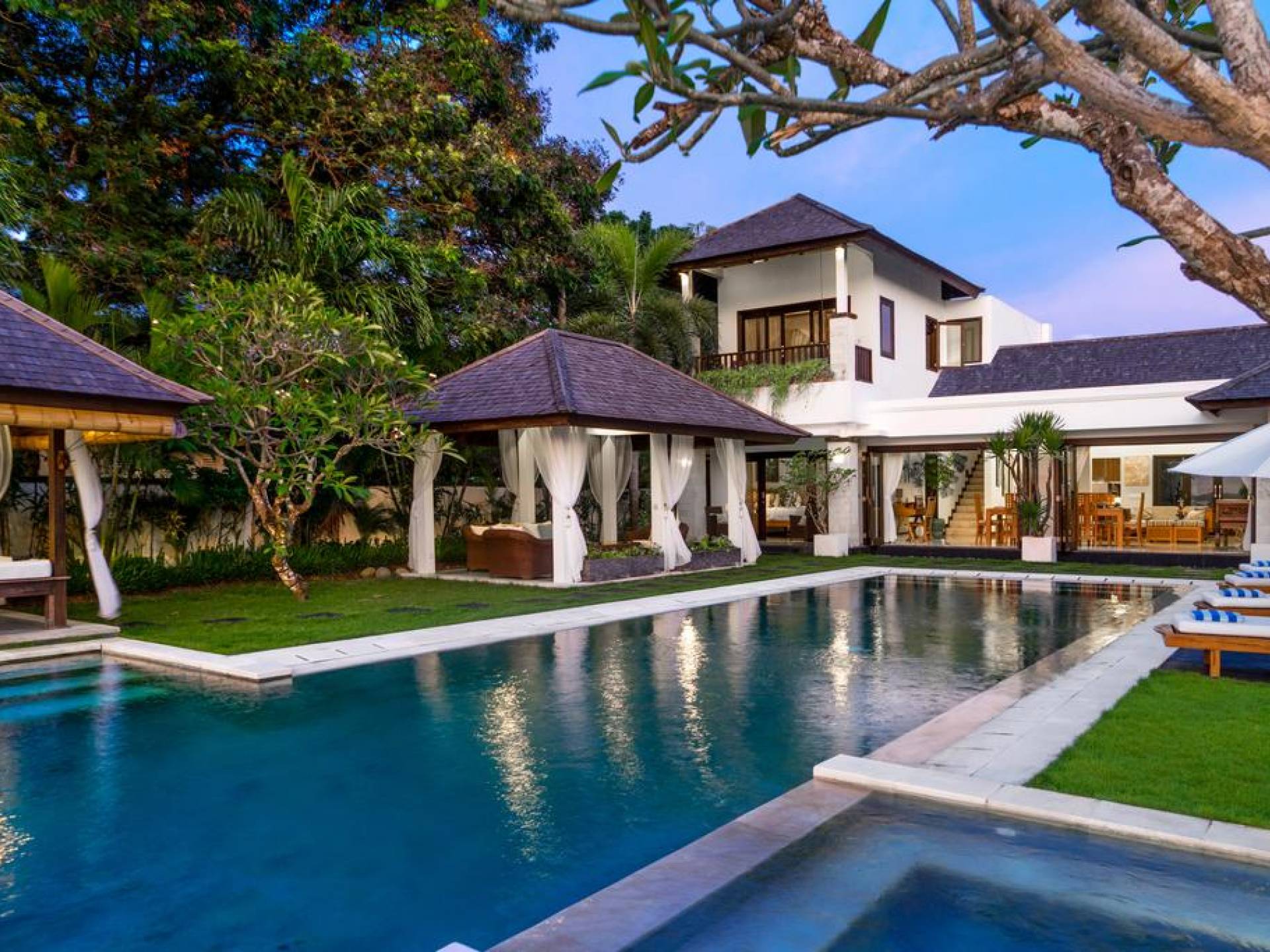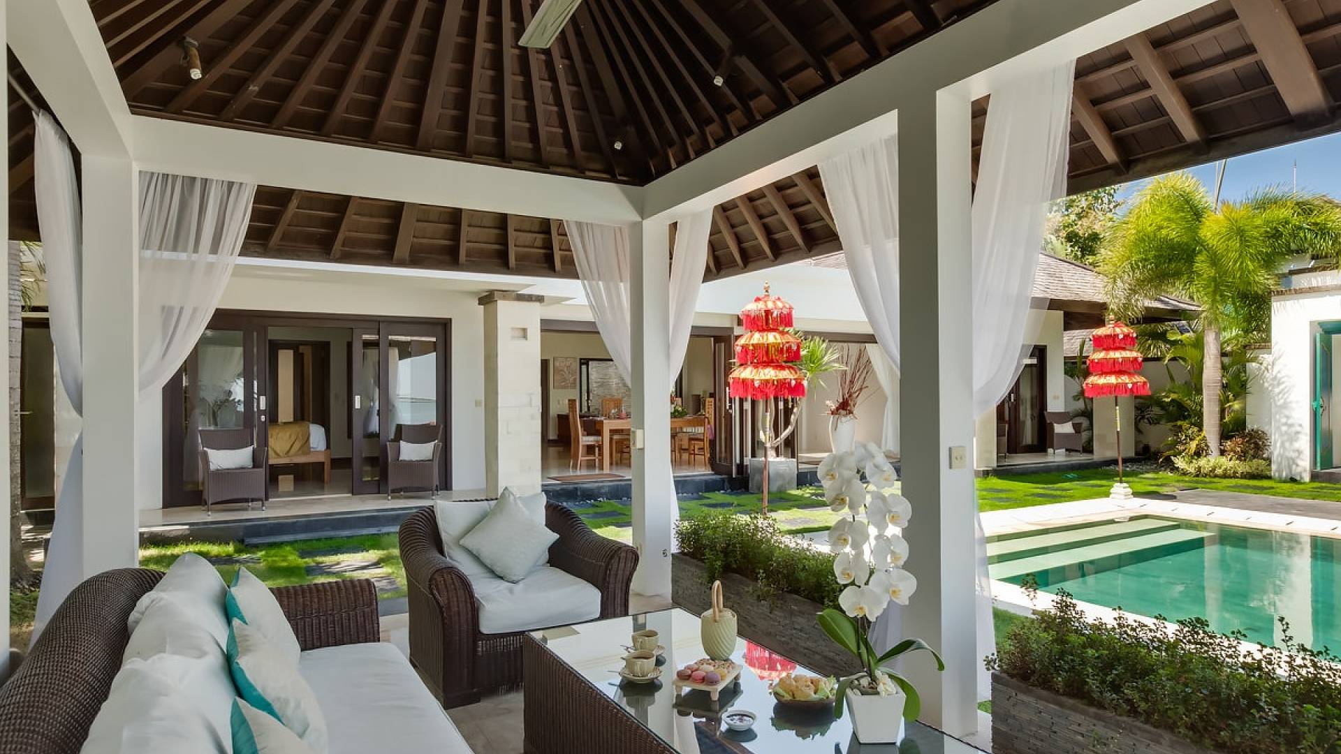 The main buildings and the adjacent open-air pavilions, gazebos, and terraces are surrounded by manicured gardens and plenty of water in the form of sky –blue swimming pools, decorative ponds, and waterfalls, which bring relief from the tropical heat and add to the laid-back, carefree Bali villa holiday atmosphere.