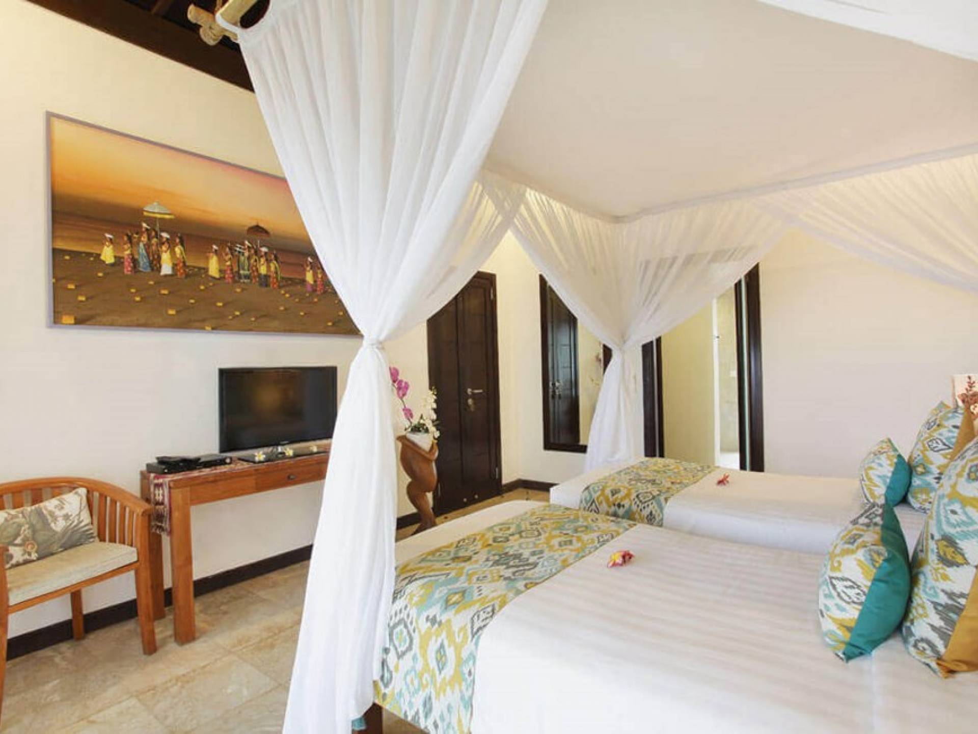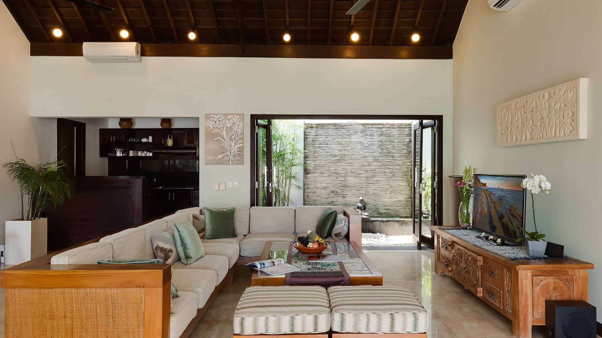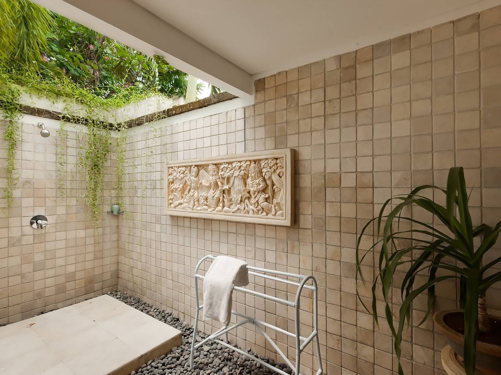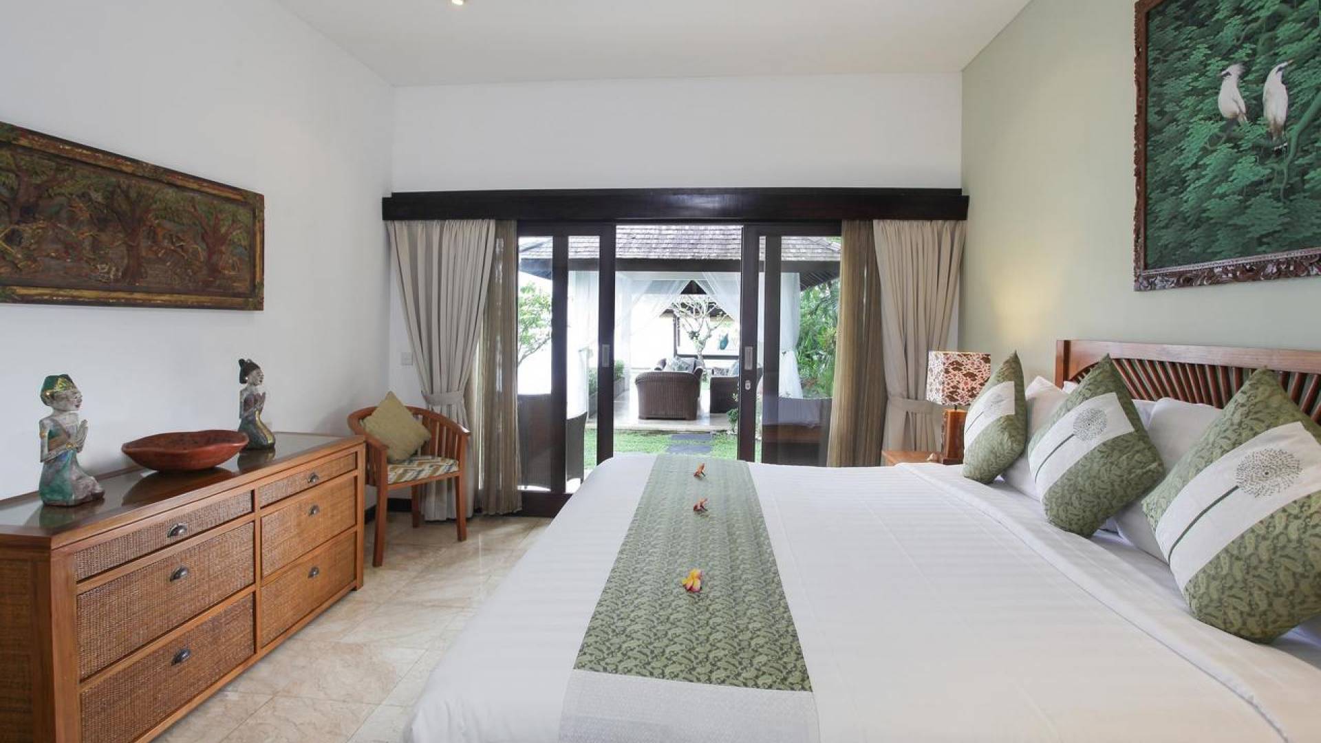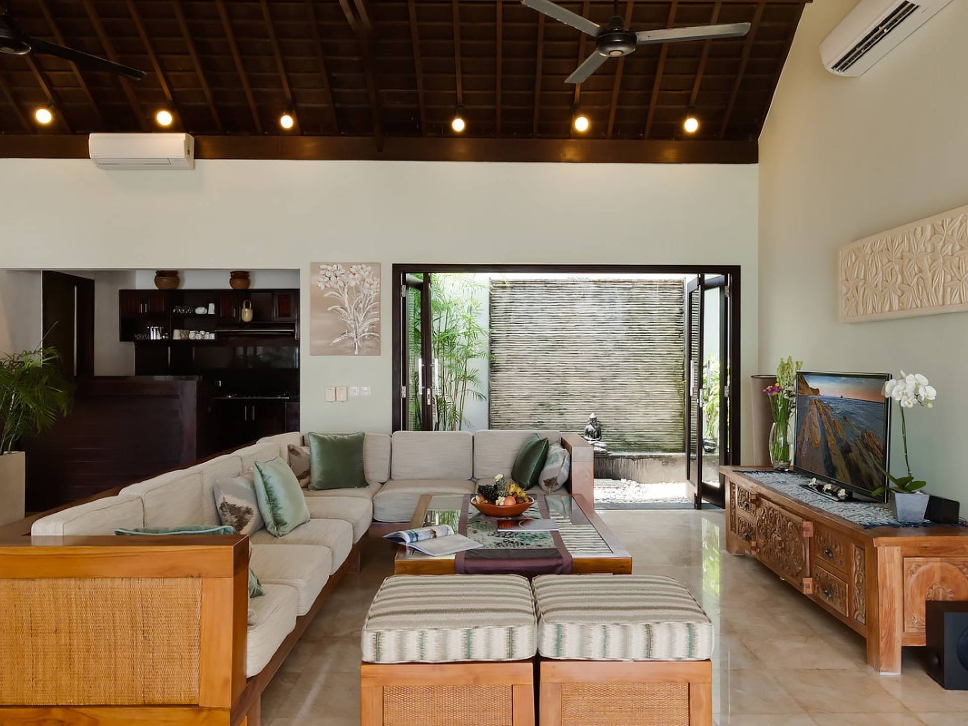 The main buildings and the adjacent open-air pavilions, gazebos, and terraces are surrounded by manicured gardens and plenty of water in the form of sky –blue swimming pools, decorative ponds, and waterfalls, which bring relief from the tropical heat and add to the laid-back, carefree Bali villa holiday atmosphere.