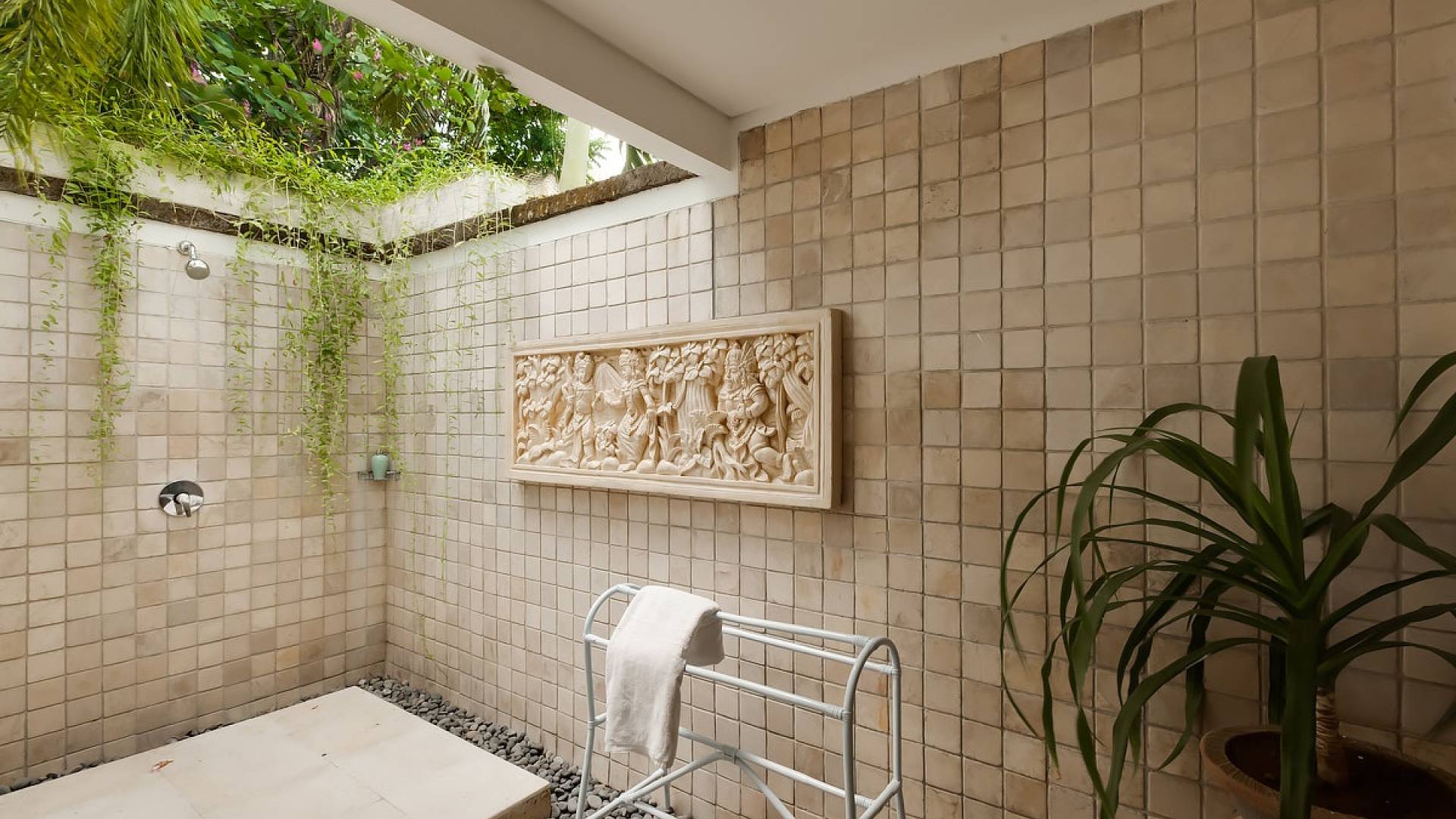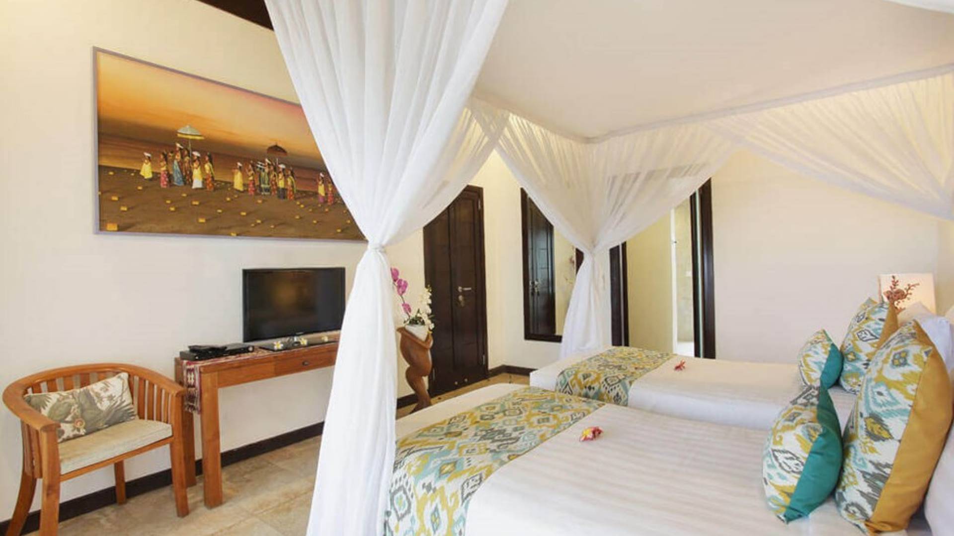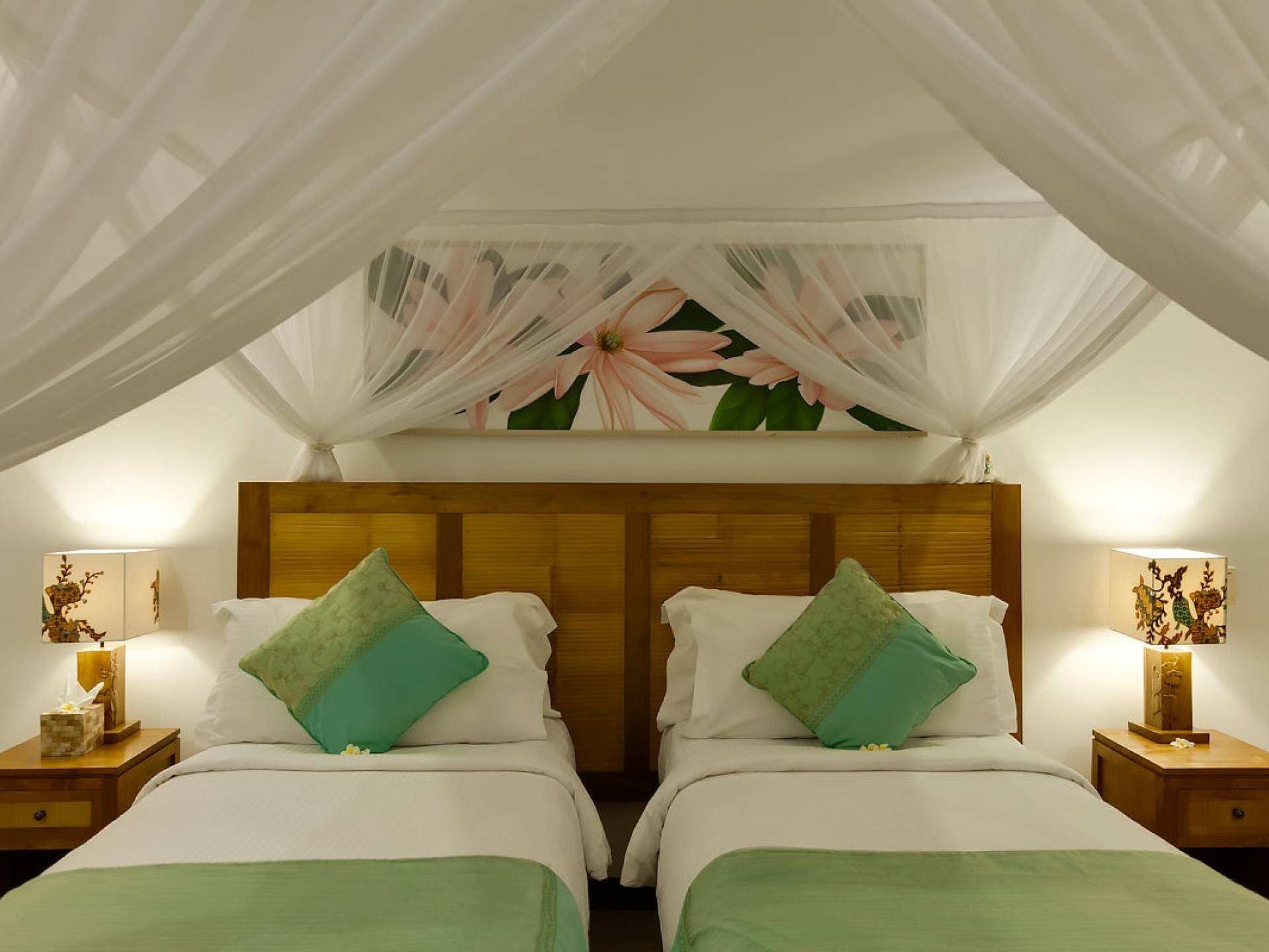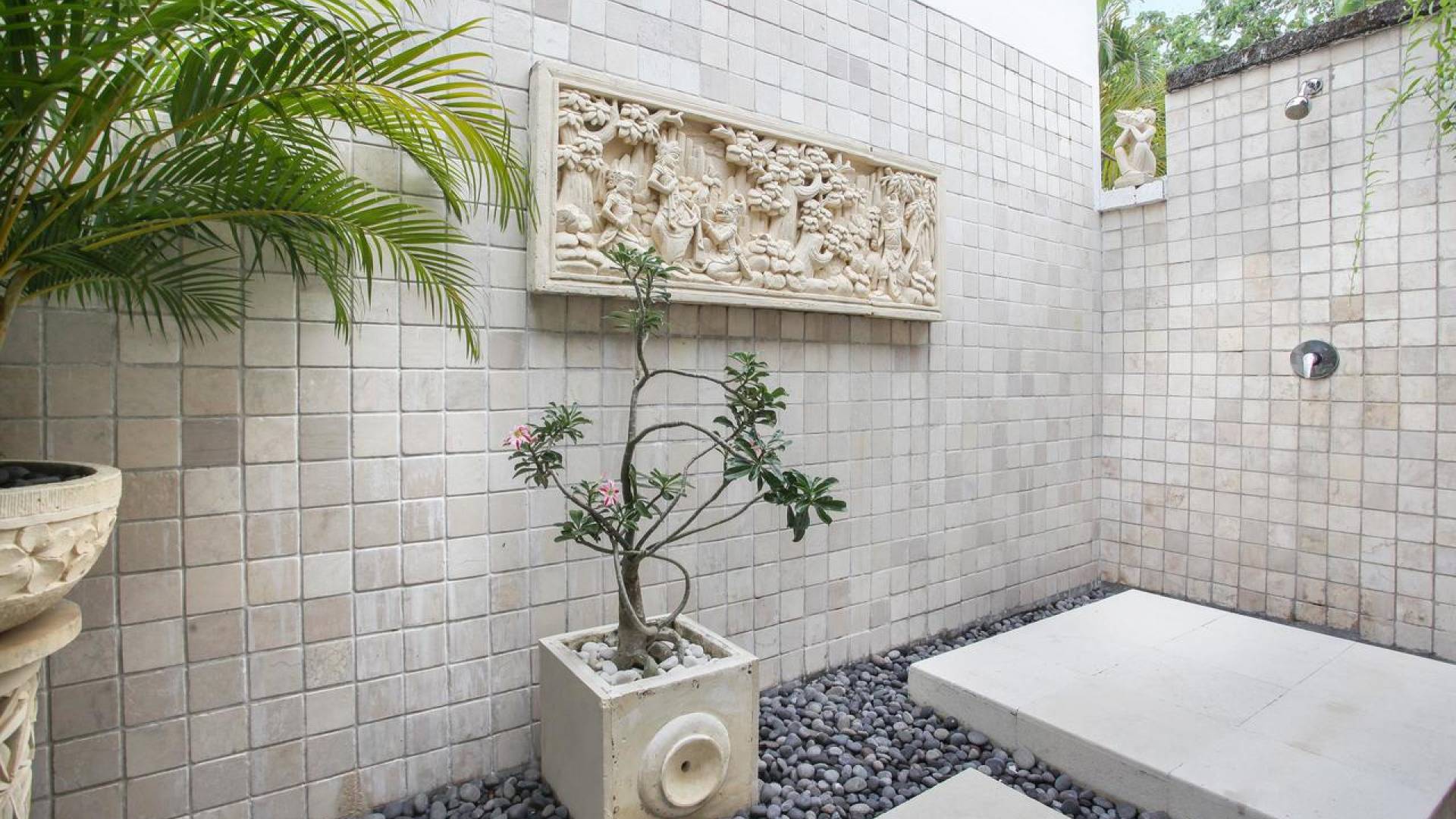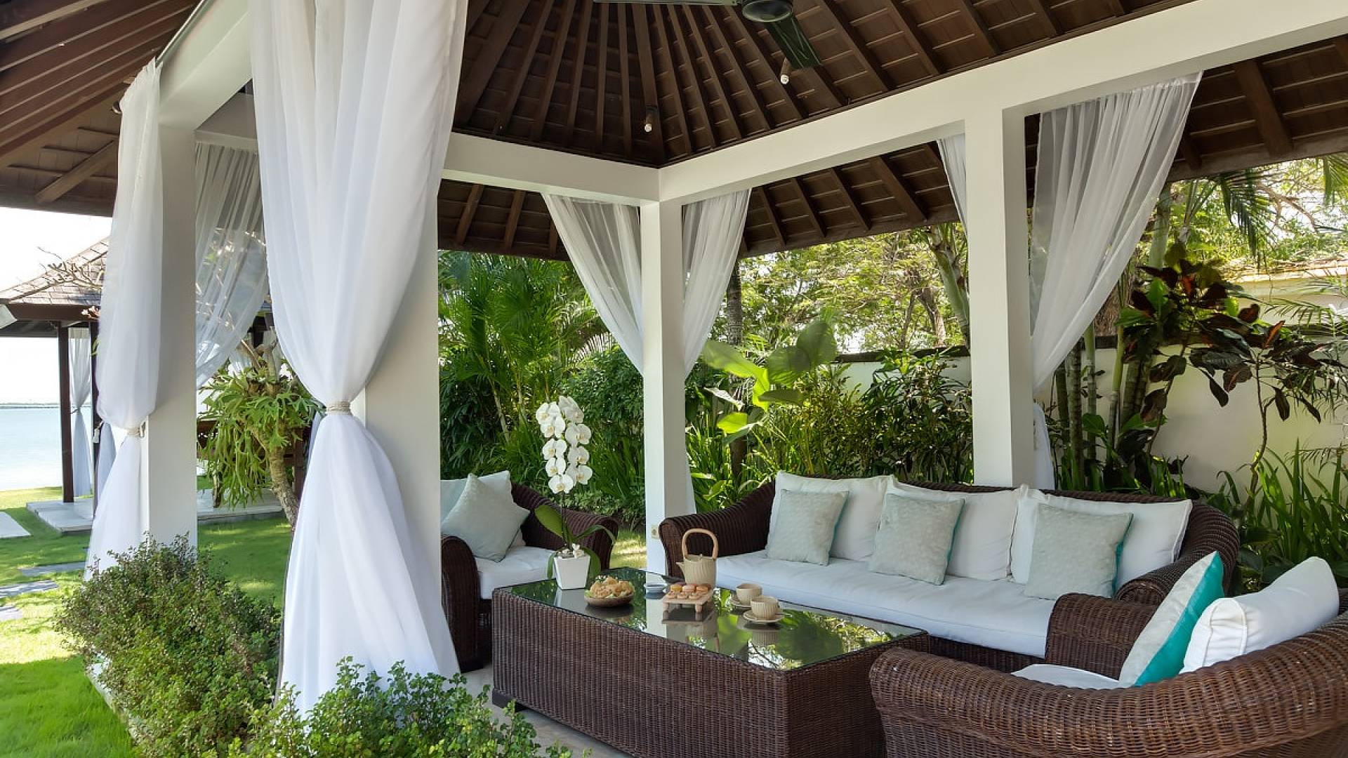The main buildings and the adjacent open-air pavilions, gazebos, and terraces are surrounded by manicured gardens and plenty of water in the form of sky –blue swimming pools, decorative ponds, and waterfalls, which bring relief from the tropical heat and add to the laid-back, carefree Bali villa holiday atmosphere.