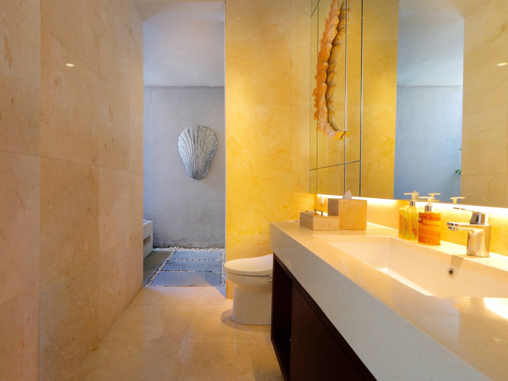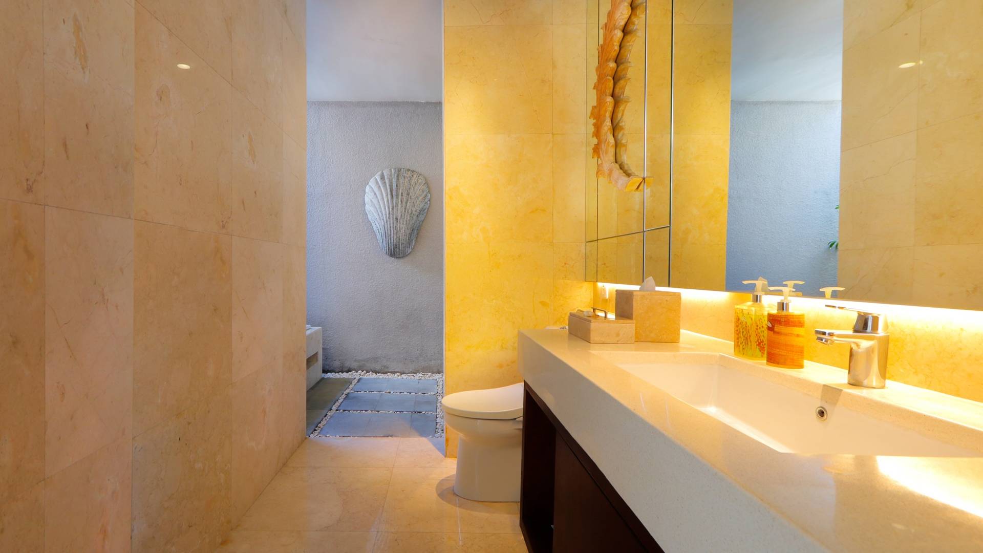 The floor-to-ceiling glass walls ensure ample natural light with access from all rooms on the ground floor opening out to the outdoor pool. The relaxed living spaces are all designed with modern sensibilities for maximum comfort, complemented by exquisite furnishings and refined art pieces. The popular Geger Beach popular with surfers is a mere five-minute walk away. All three bedrooms are ornate showcasing double beds, en-suite, wardrobe, and AC, and open out to the pool area. The stylish bathrooms are spacious with a semi-open roof structure to allow in plenty of natural light. Decked out in white marbles accessorized by natural stones in parts, you probably end up longer in the bathroom than you plan to. All bathrooms are equipped with bathtubs and showers are equipped with resort-level amenities.