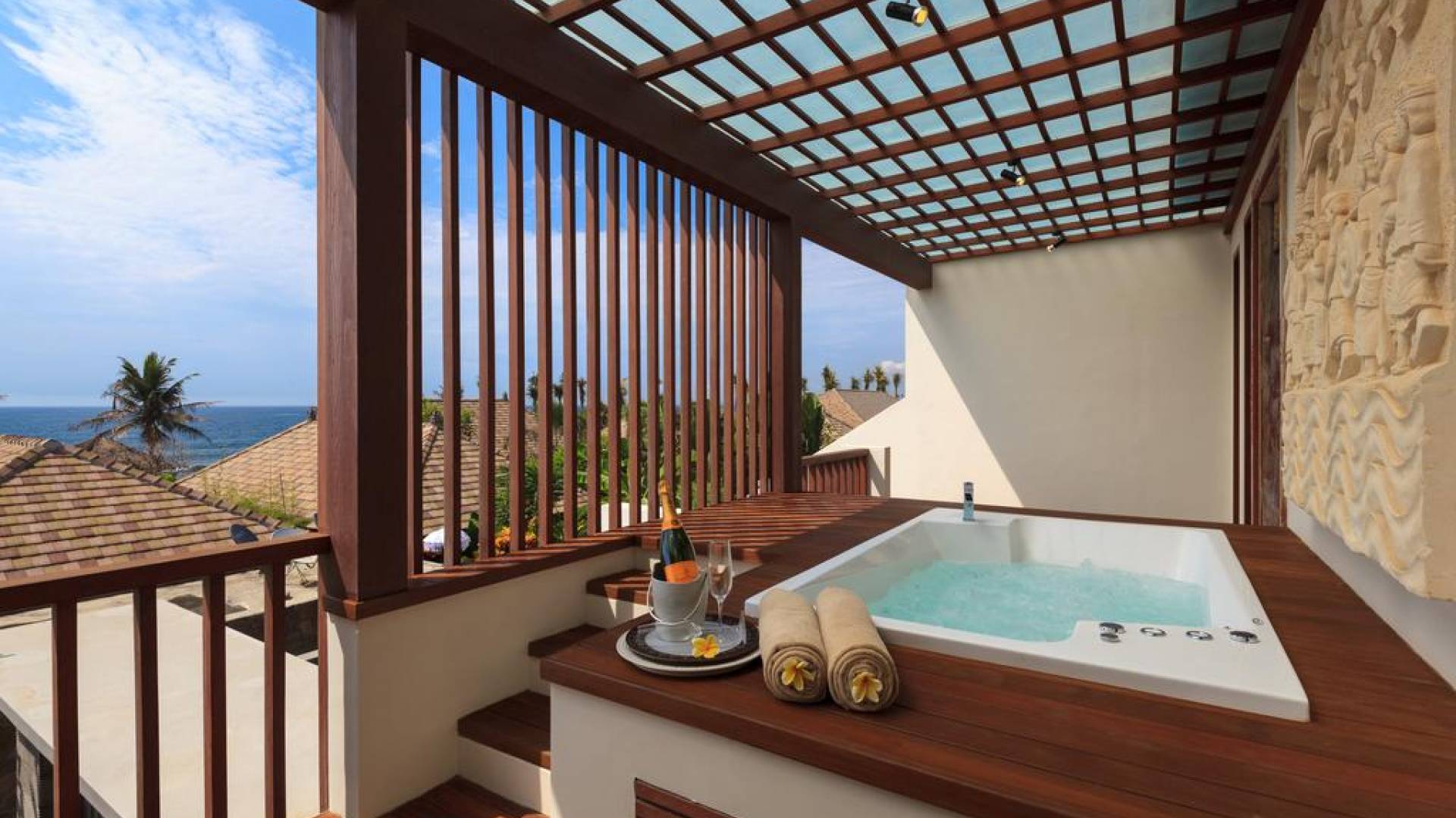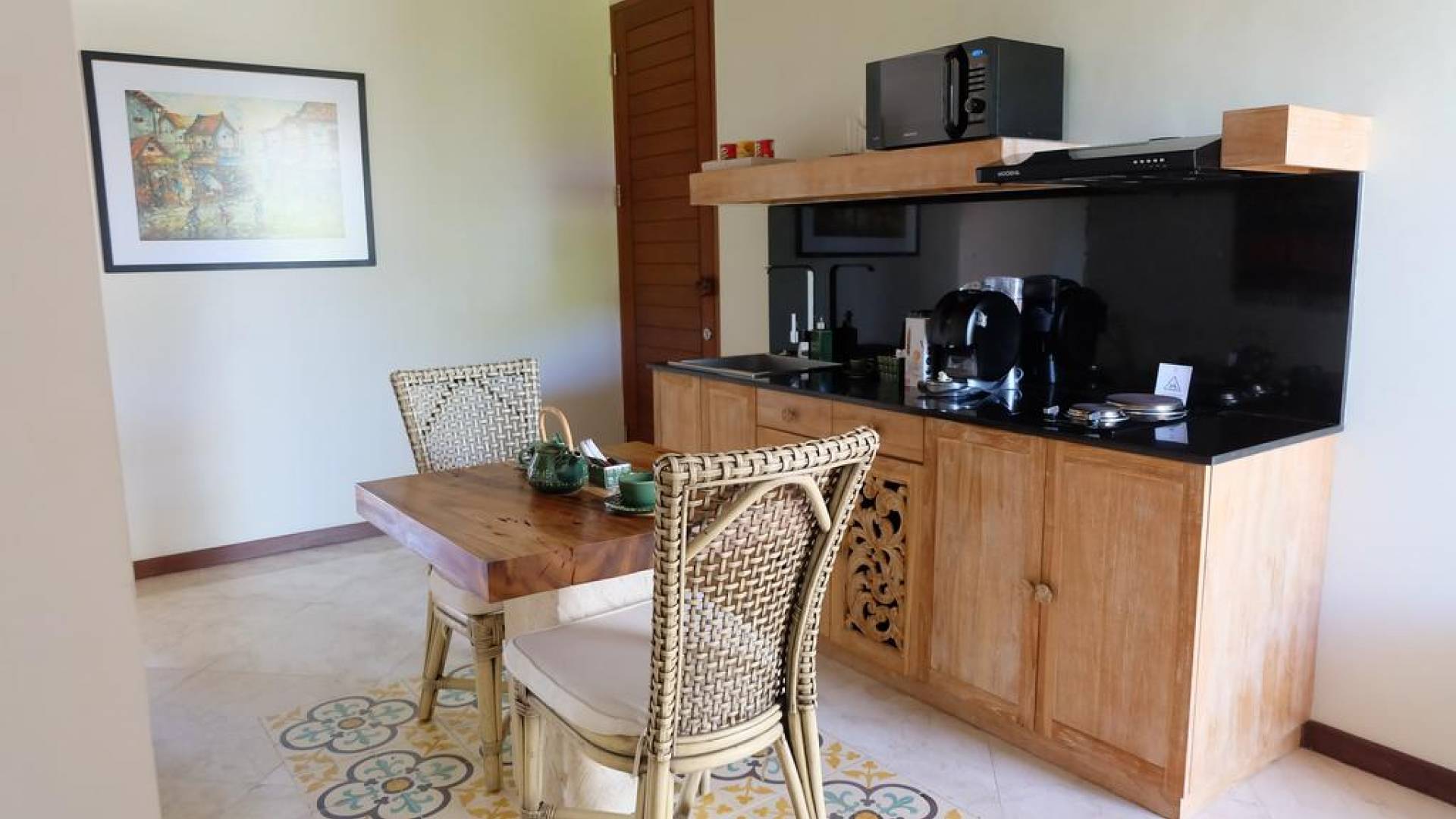 Jepun Jacuzzi Suite is an upper floor 75 square meter suite, a great vacation rental for a couple. Jepun Jacuzzi Suite which is part of the Royal Punrama Art Suites and Villas has a bedroom, living area, separate kitchenette/dining area, semi-open-air bathroom with ‘his and hers washbasins, bathtub and rain shower, jacuzzi, daybed, and balcony. The Royal Purnama Art Suites and Villas has eight Jepun Jacuzzi Suites with garden view and six with ocean view.