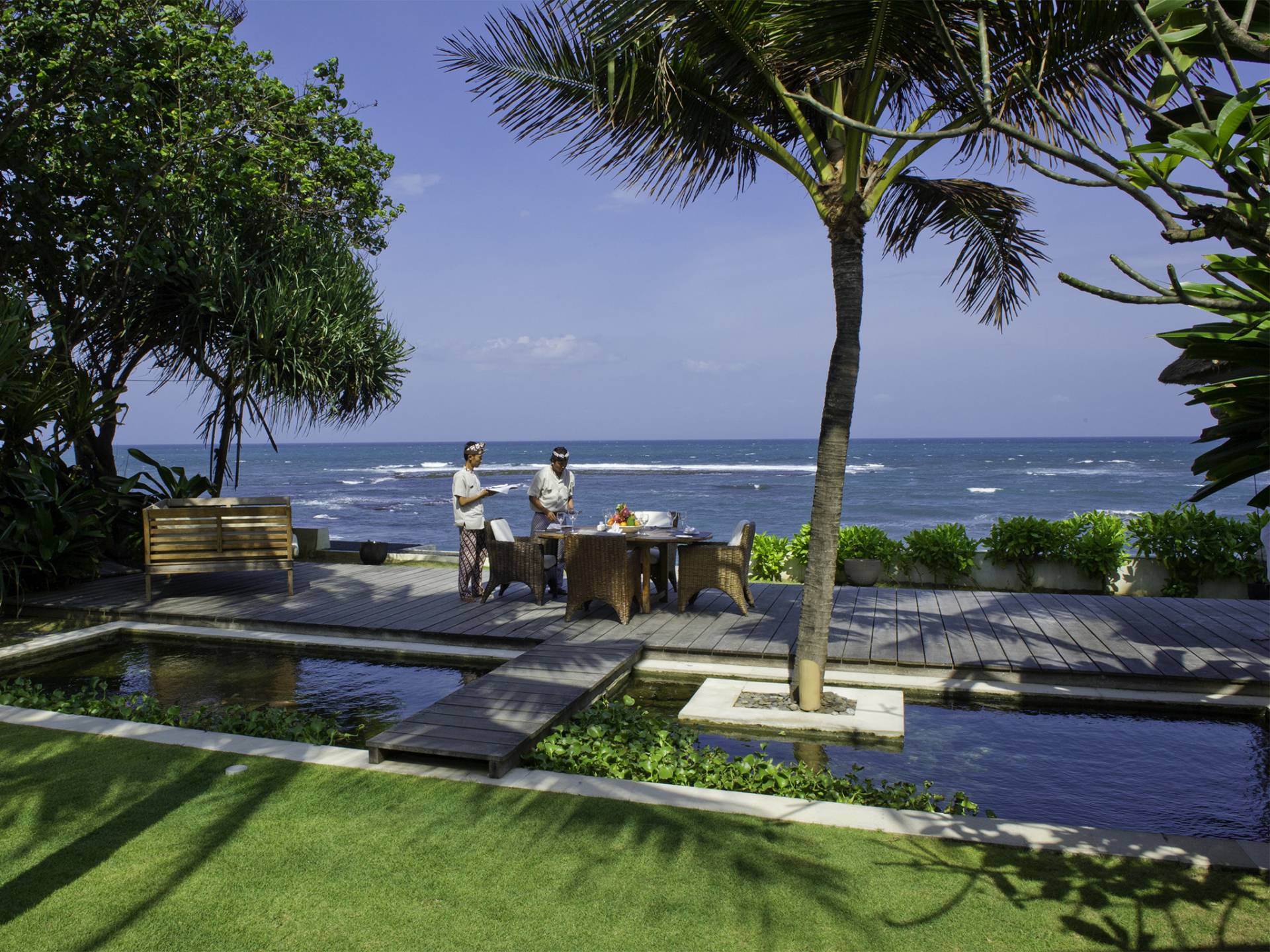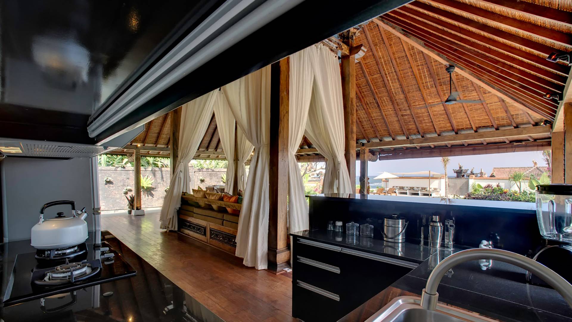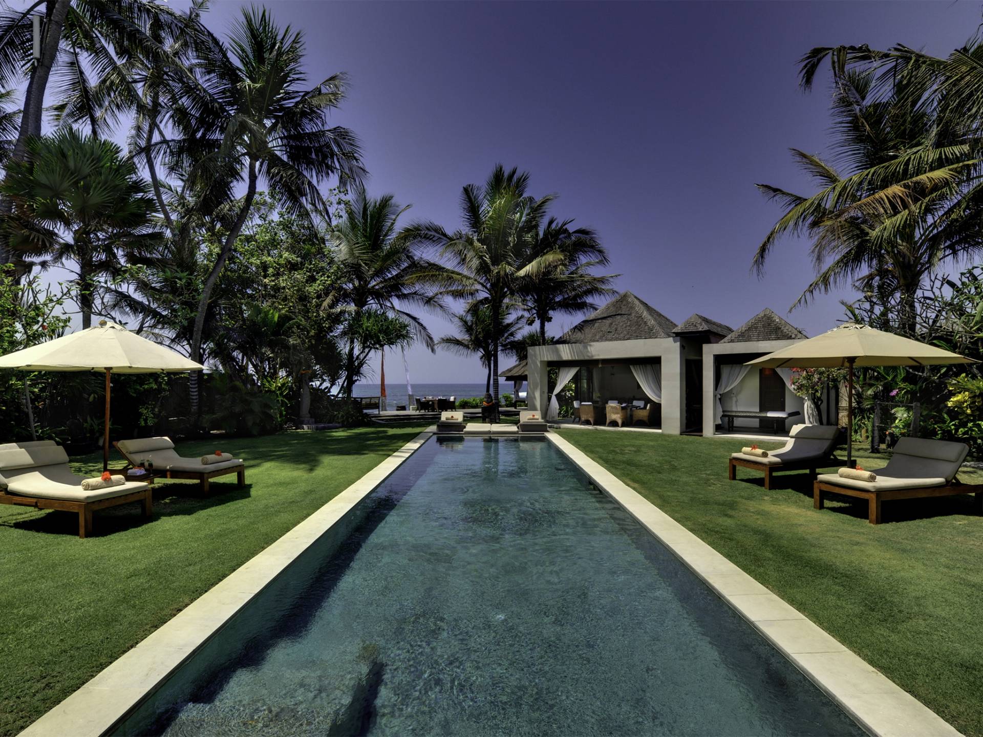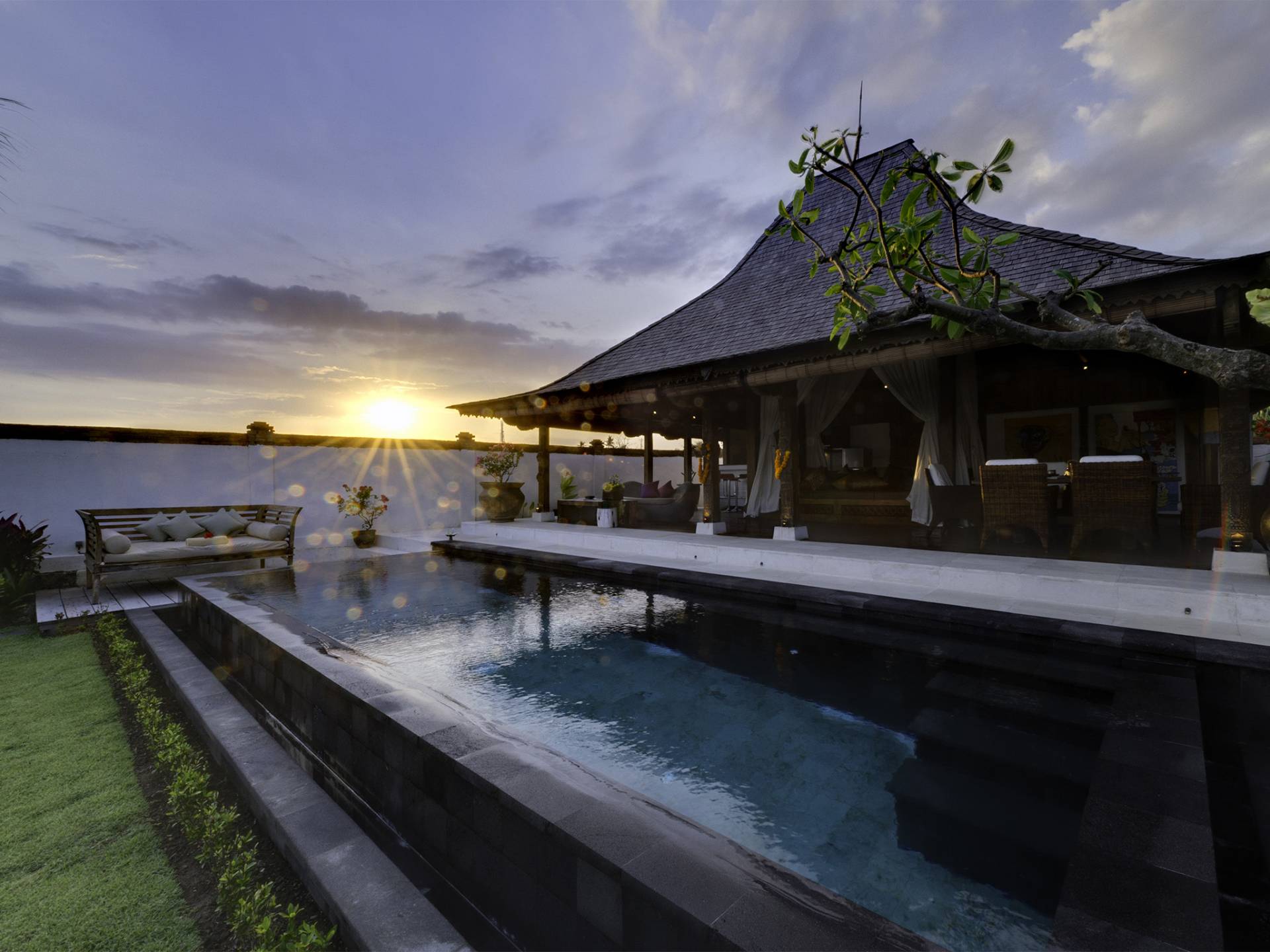 Majapahit Beach Villas Sanur consists of three individual luxurious villas and is located at Pabean Beach down a narrow lane off the Klungkung Bypass, which runs along the east coast and is also known as the Sunrise Road. Bounded by the River Wos, rice fields, tobacco plantations, papaya, banana, and coconut groves, the area is blessed with spectacular views extending across the ocean towards the beaches of Sanur and Nusa Dua, the islands of Lembongan, Ceningan, and Penida, and the mountains of East Bali.