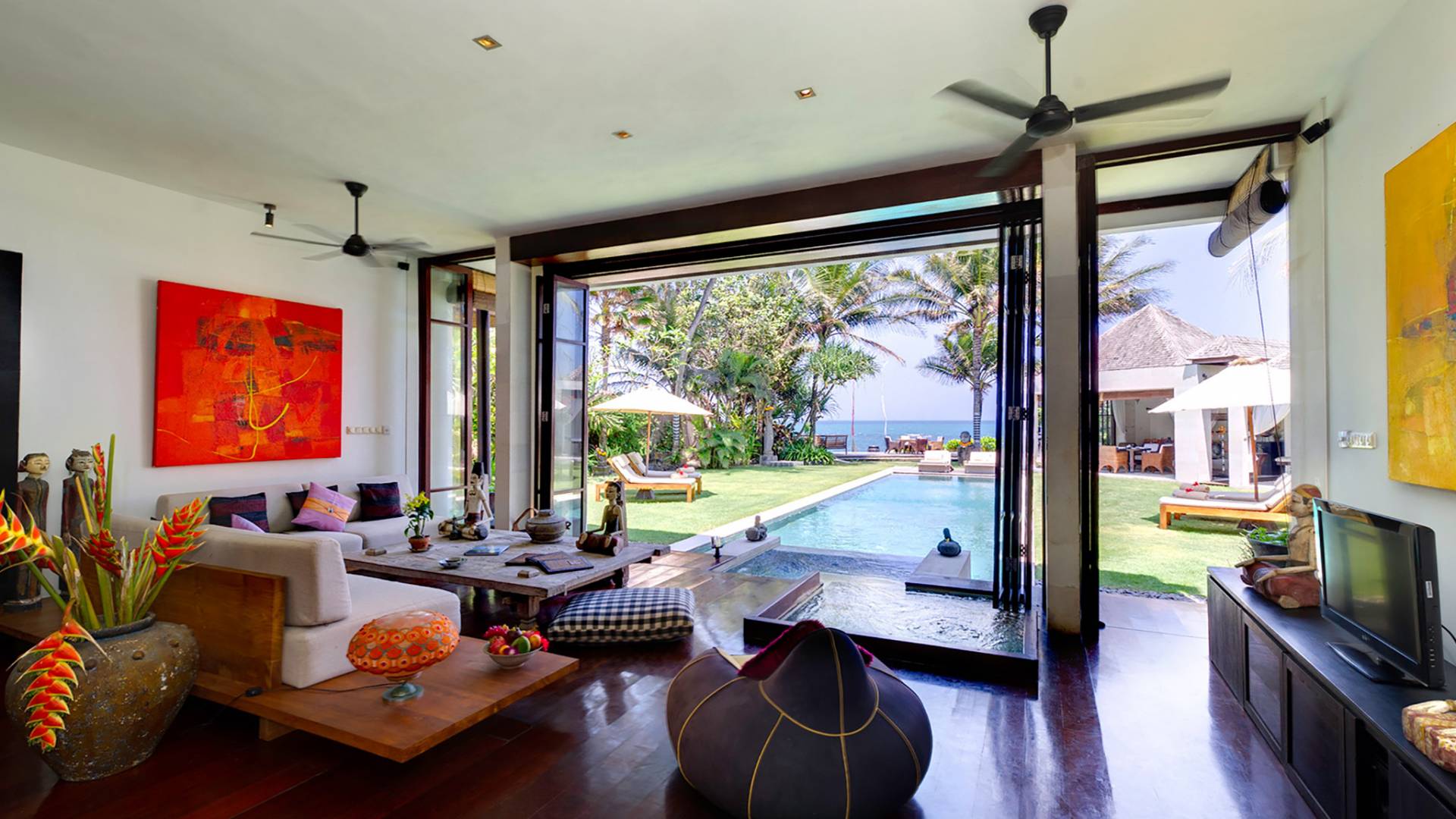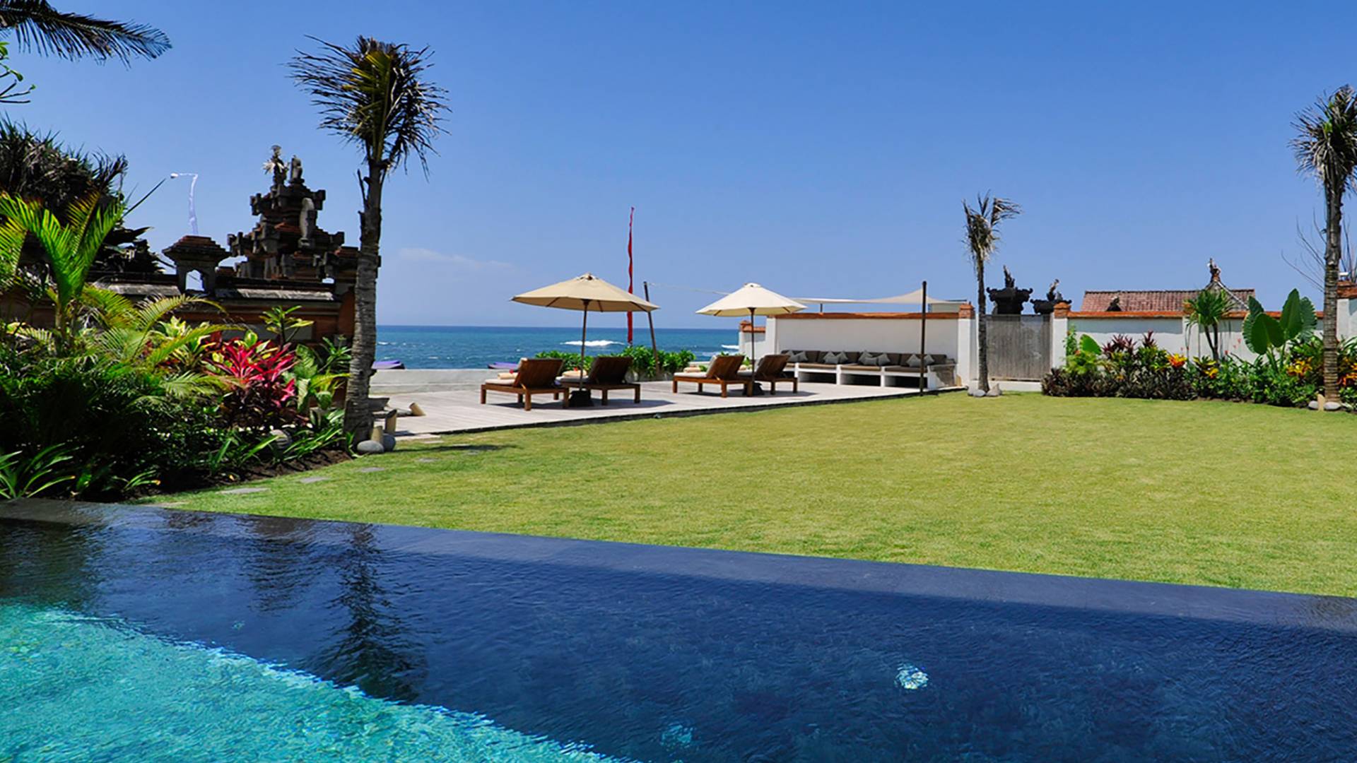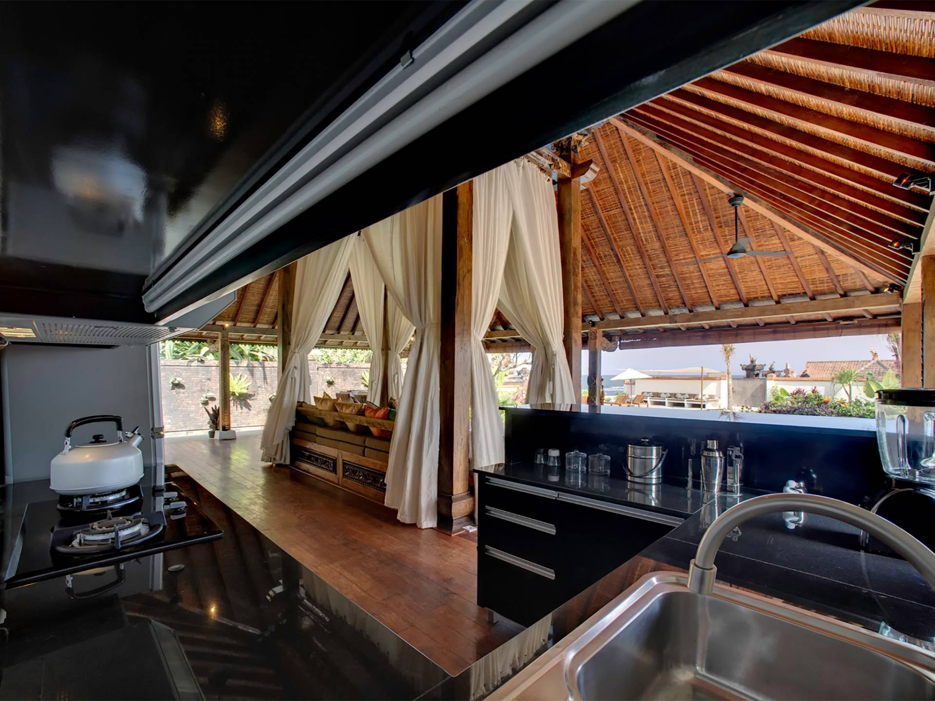 Majapahit Beach Villas Sanur consists of three individual luxurious villas and is located at Pabean Beach down a narrow lane off the Klungkung Bypass, which runs along the east coast and is also known as the Sunrise Road. Bounded by the River Wos, rice fields, tobacco plantations, papaya, banana, and coconut groves, the area is blessed with spectacular views extending across the ocean towards the beaches of Sanur and Nusa Dua, the islands of Lembongan, Ceningan, and Penida, and the mountains of East Bali.