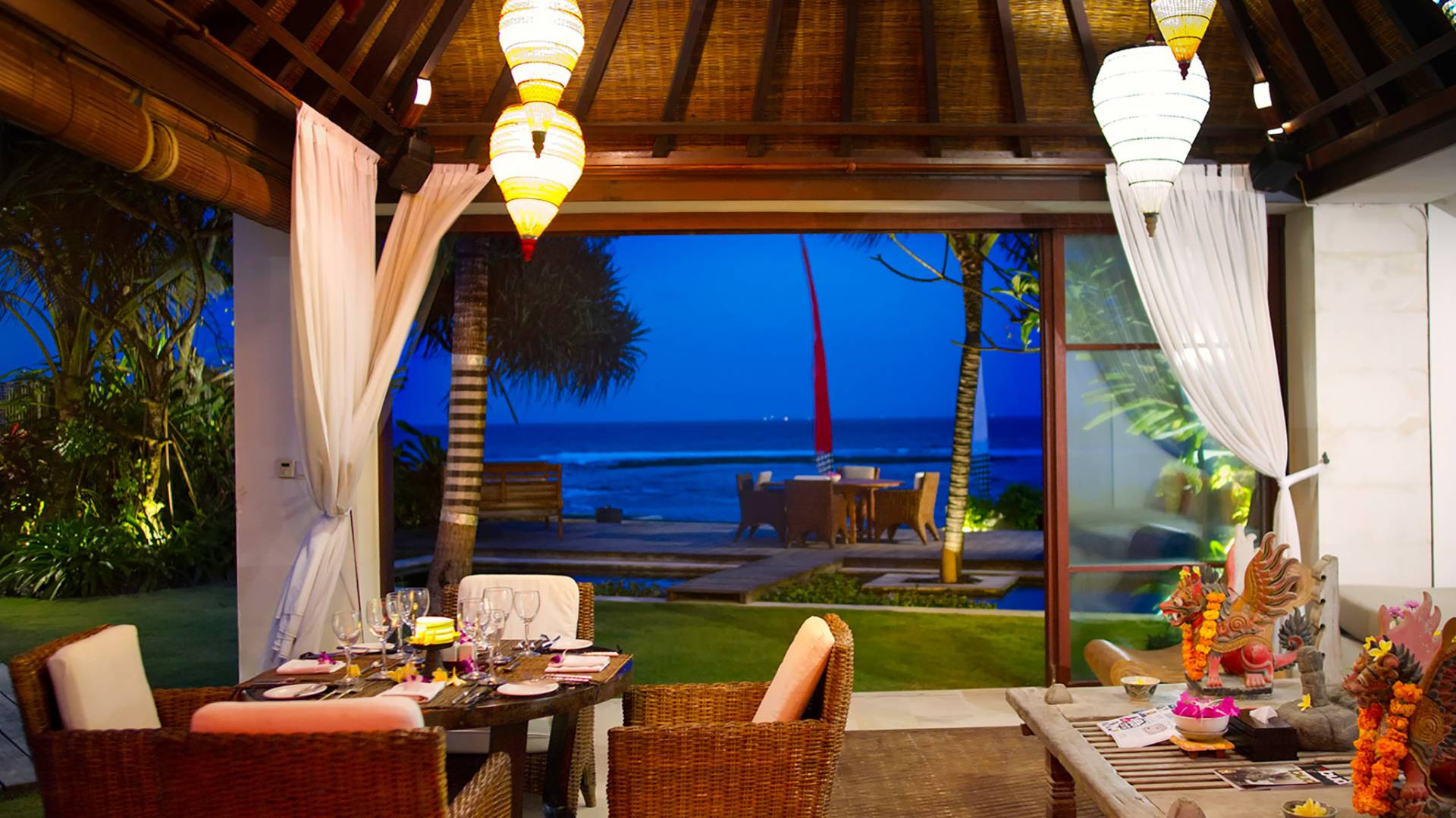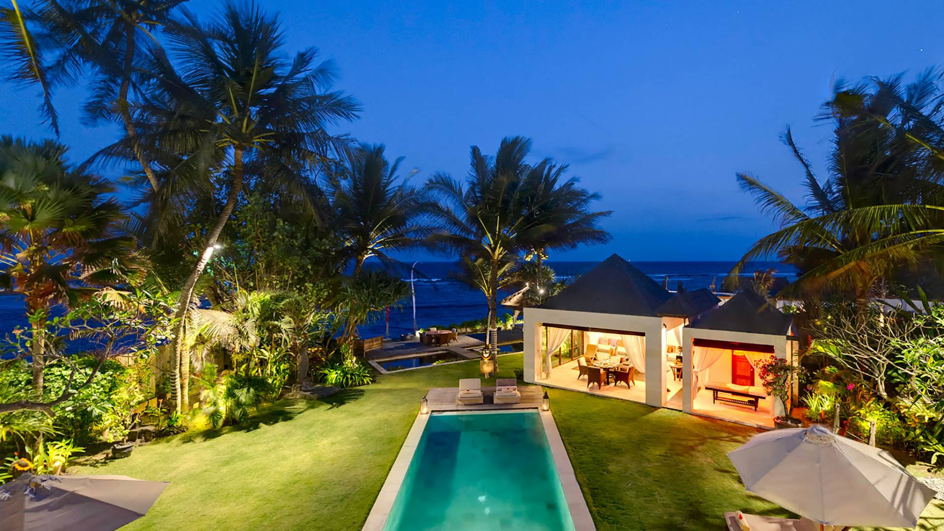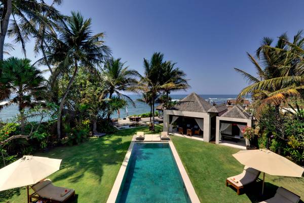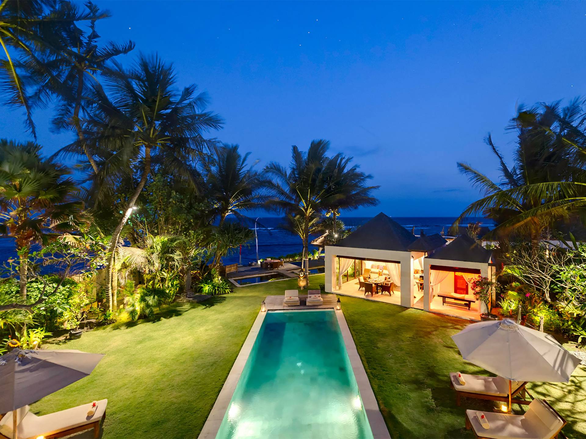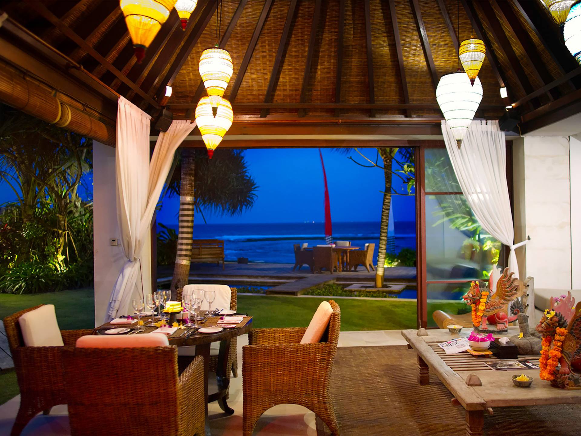The four-bedroom Villa Maya is situated absolutely beachfront on the glistening black-sands of Pabean Beach on Bali’s southeast coast. This beautiful, eclectic villa presents indoor and outdoor living in a three-bedroom main house and a one-bedroom honeymoon villa, linked by a door in the garden wall, and each with its own private garden, pool, and seaside deck. Ideal for brides and grooms and their friends, Villa Maya specializes in beachfront weddings for up to 100 guests who can look forward to glorious coastline views and a five-star standard of service within the calm tranquility that is the true essence of Bali.