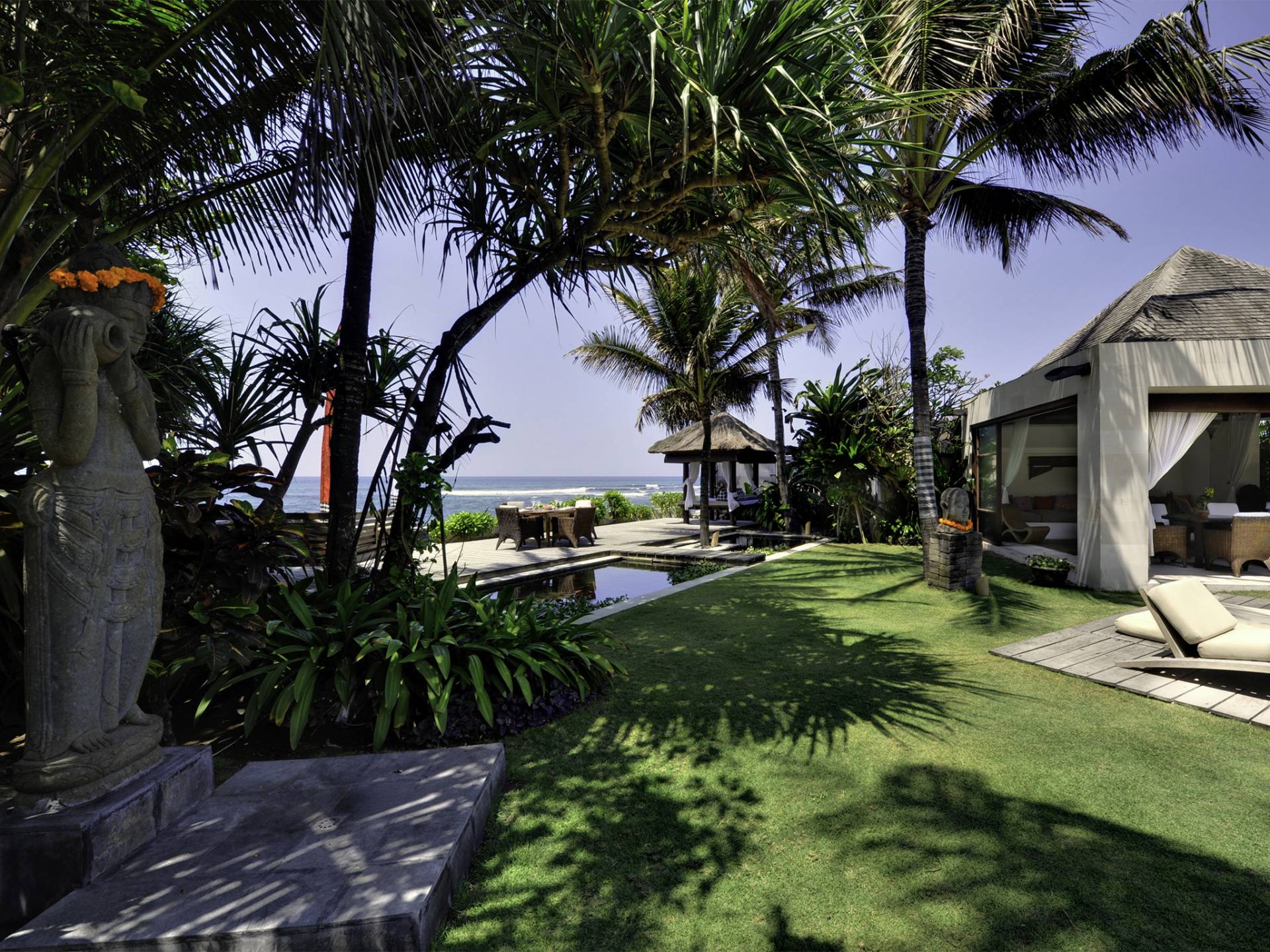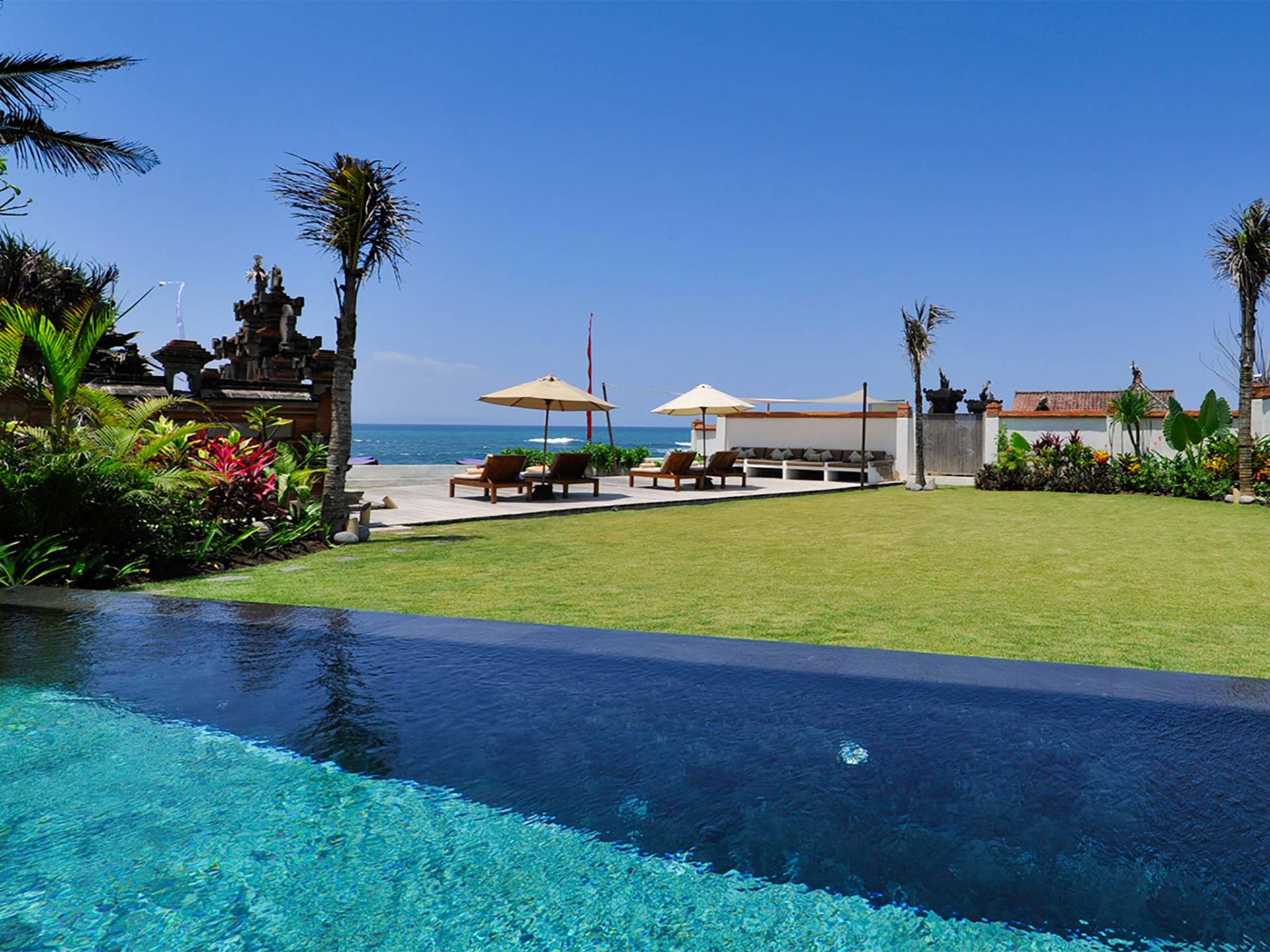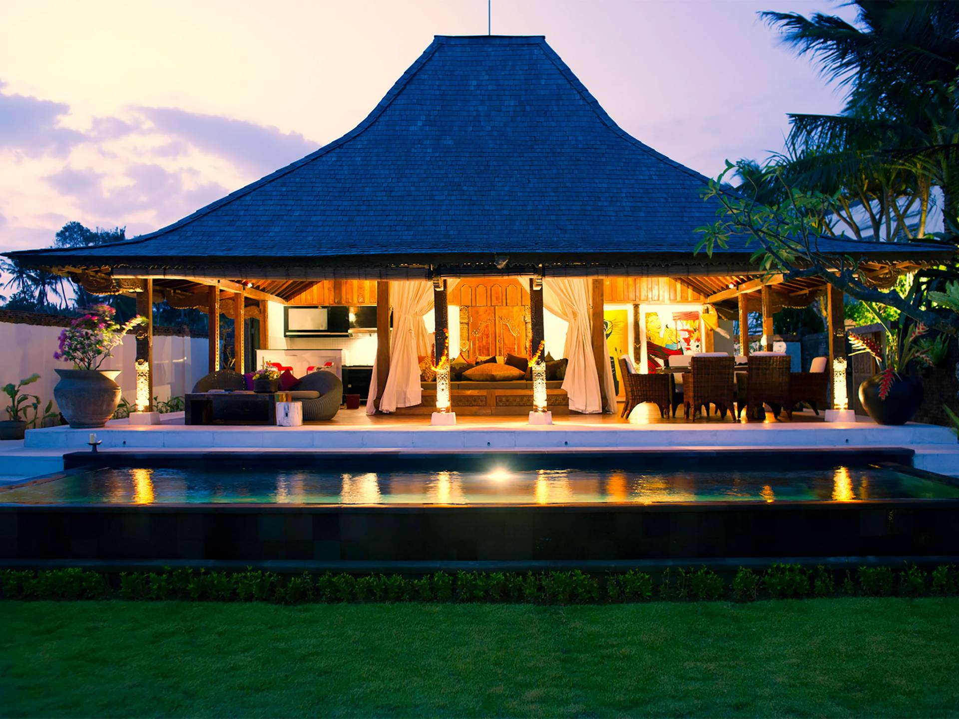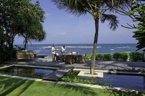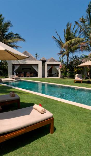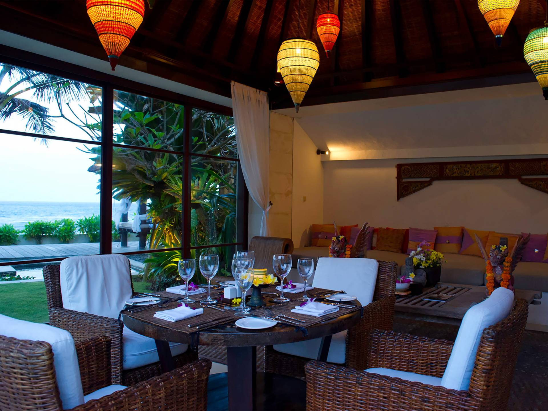 The four-bedroom Villa Maya is situated absolutely beachfront on the glistening black-sands of Pabean Beach on Bali’s southeast coast. This beautiful, eclectic villa presents indoor and outdoor living in a three-bedroom main house and a one-bedroom honeymoon villa, linked by a door in the garden wall, and each with its own private garden, pool, and seaside deck. Ideal for brides and grooms and their friends, Villa Maya specializes in beachfront weddings for up to 100 guests who can look forward to glorious coastline views and a five-star standard of service within the calm tranquility that is the true essence of Bali.
