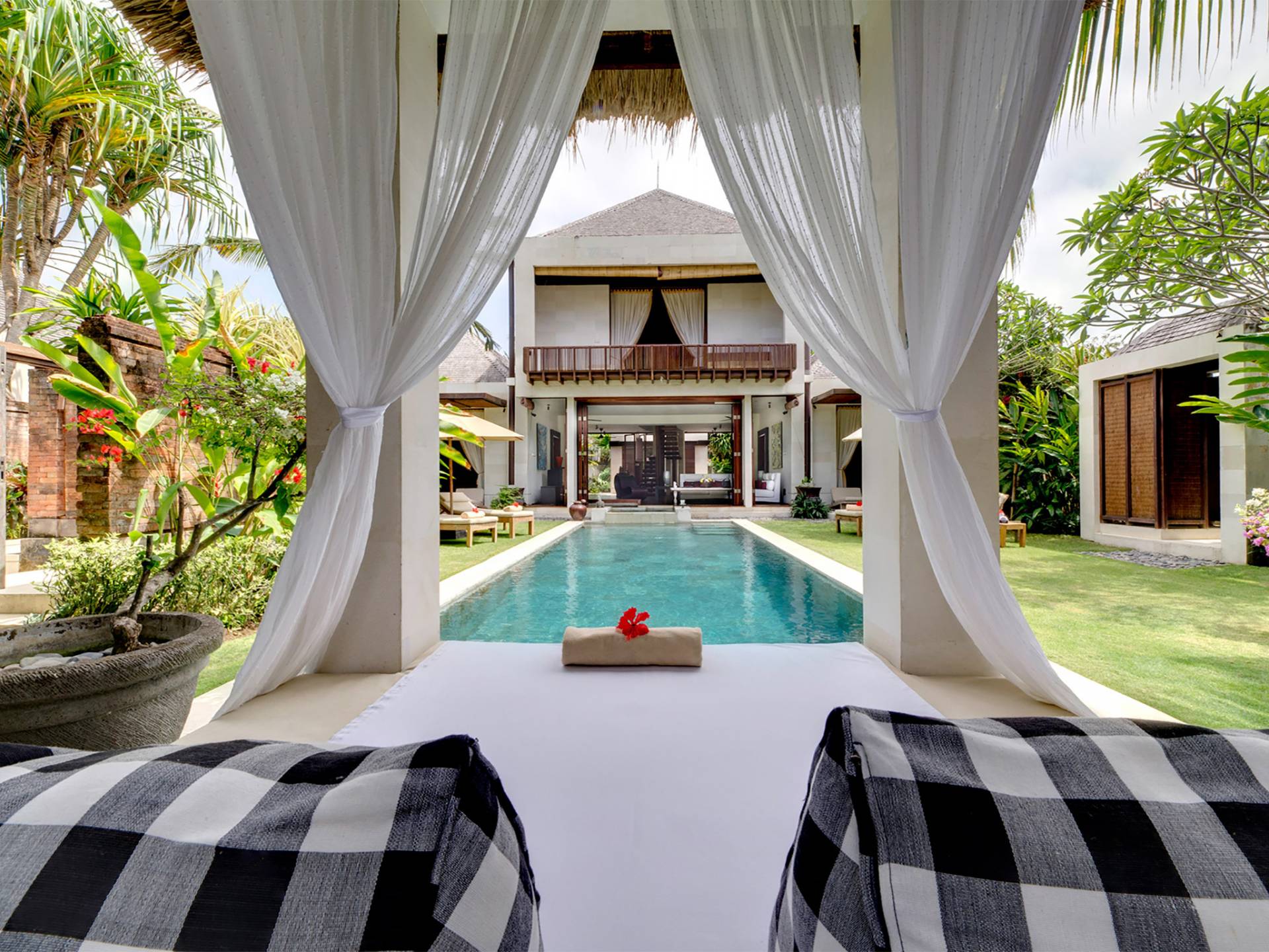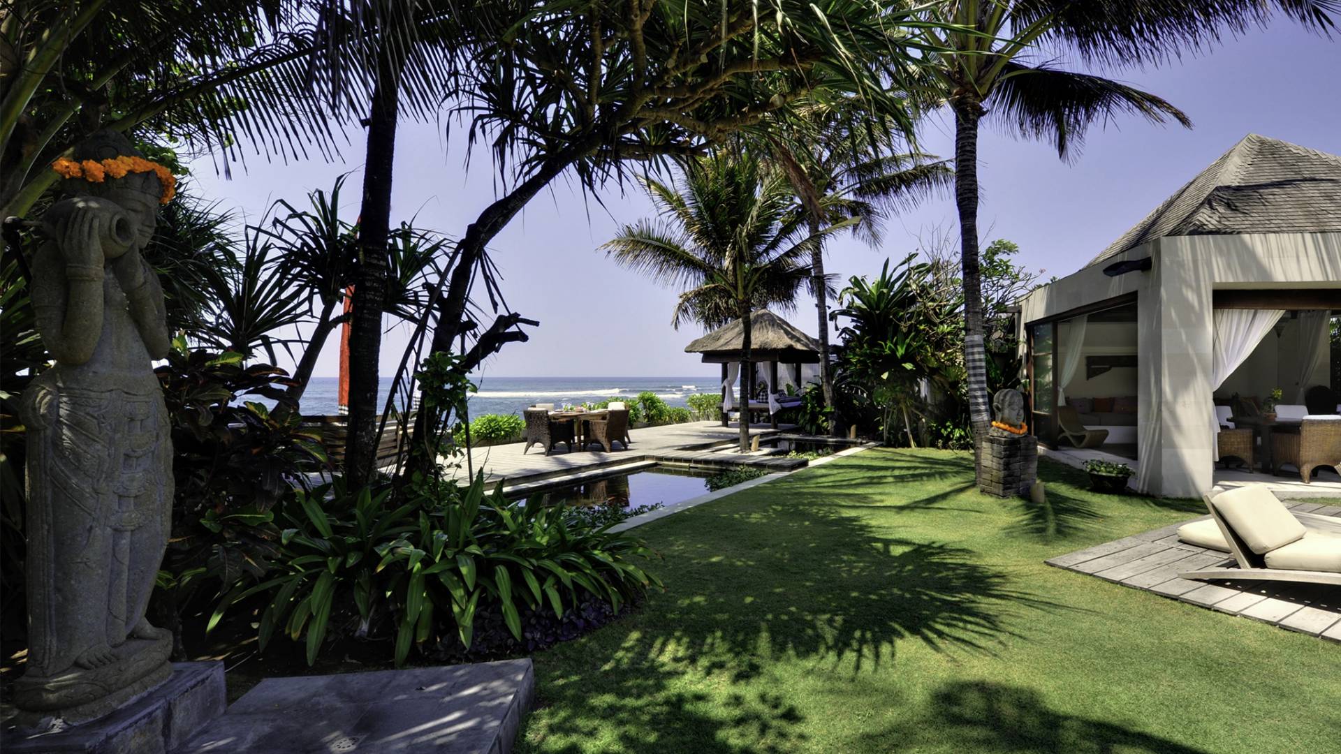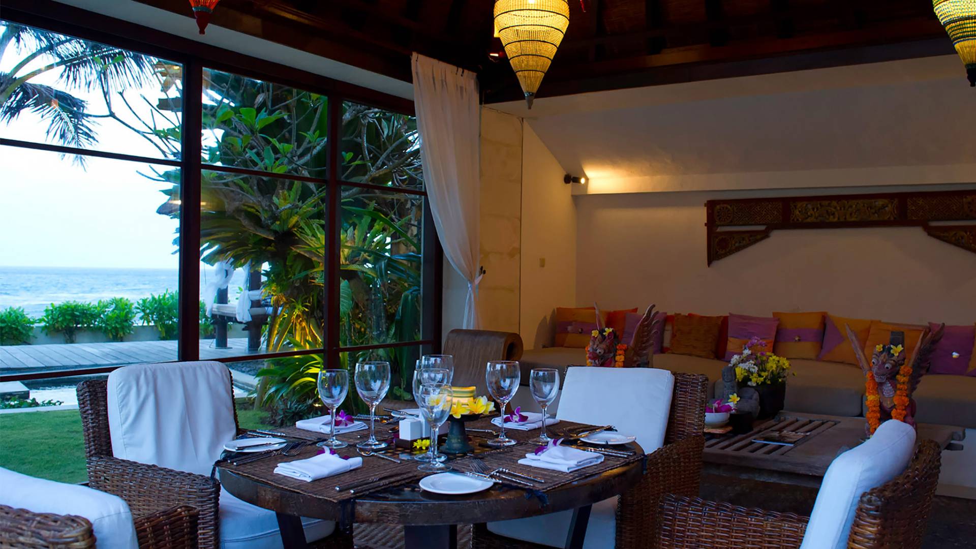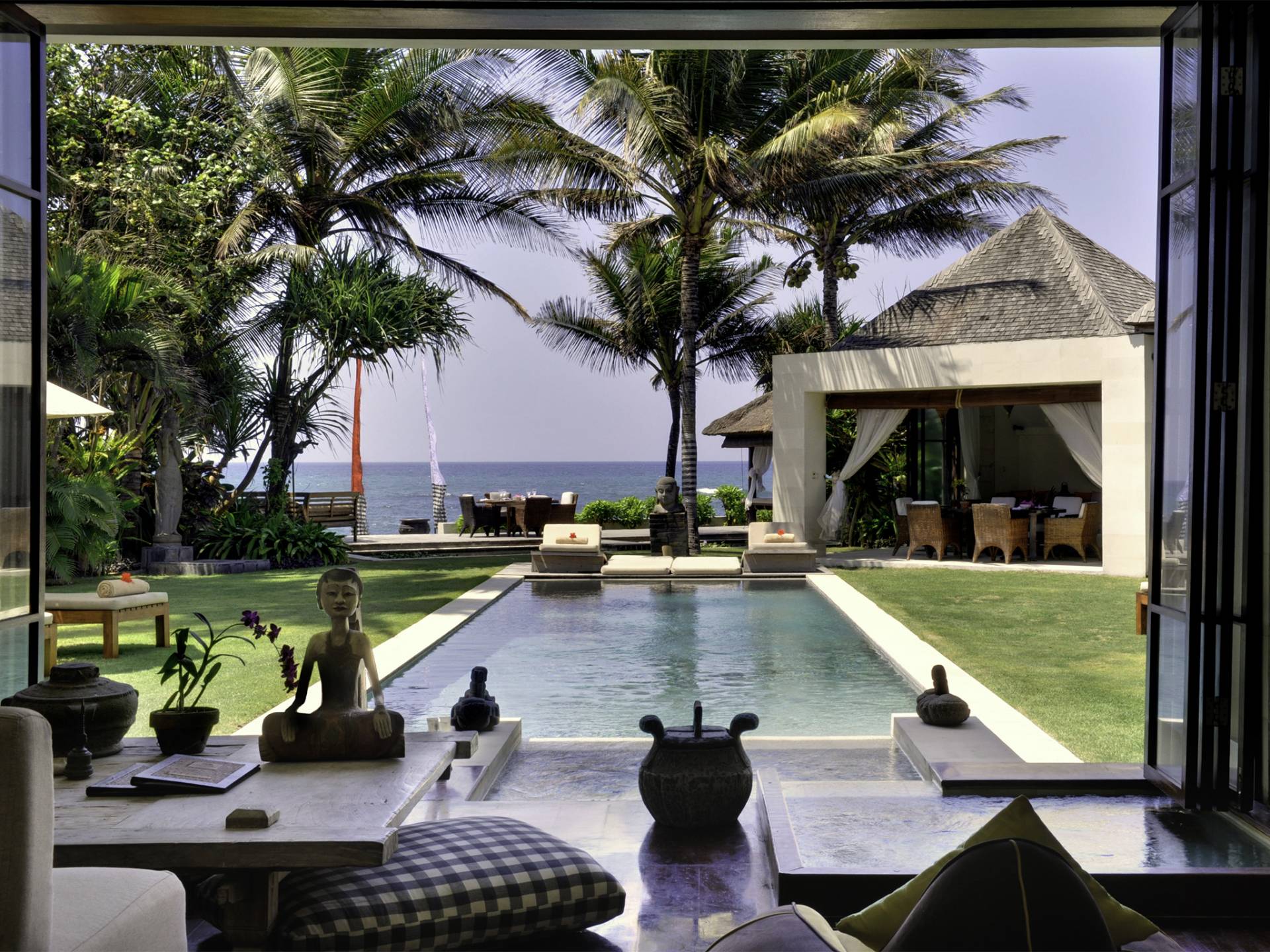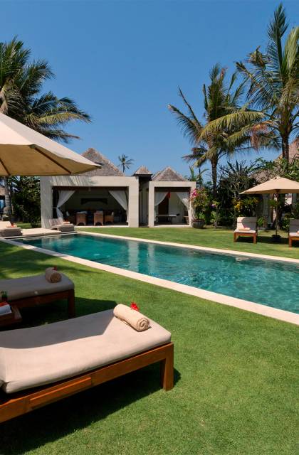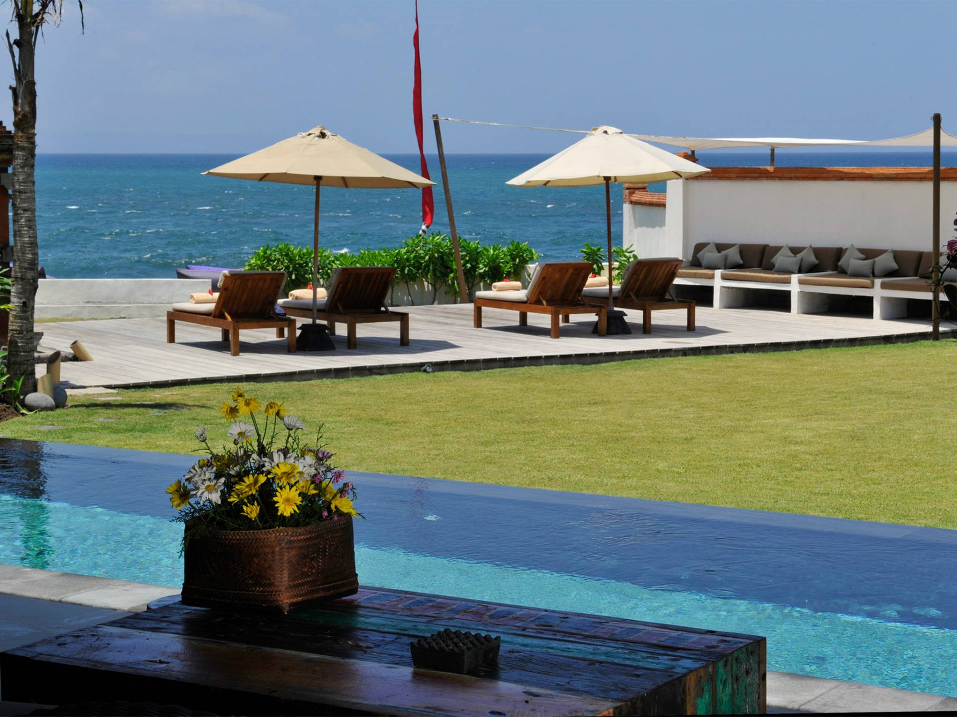 The four-bedroom Villa Maya is situated absolutely beachfront on the glistening black-sands of Pabean Beach on Bali’s southeast coast. This beautiful, eclectic villa presents indoor and outdoor living in a three-bedroom main house and a one-bedroom honeymoon villa, linked by a door in the garden wall, and each with its own private garden, pool, and seaside deck. Ideal for brides and grooms and their friends, Villa Maya specializes in beachfront weddings for up to 100 guests who can look forward to glorious coastline views and a five-star standard of service within the calm tranquility that is the true essence of Bali.