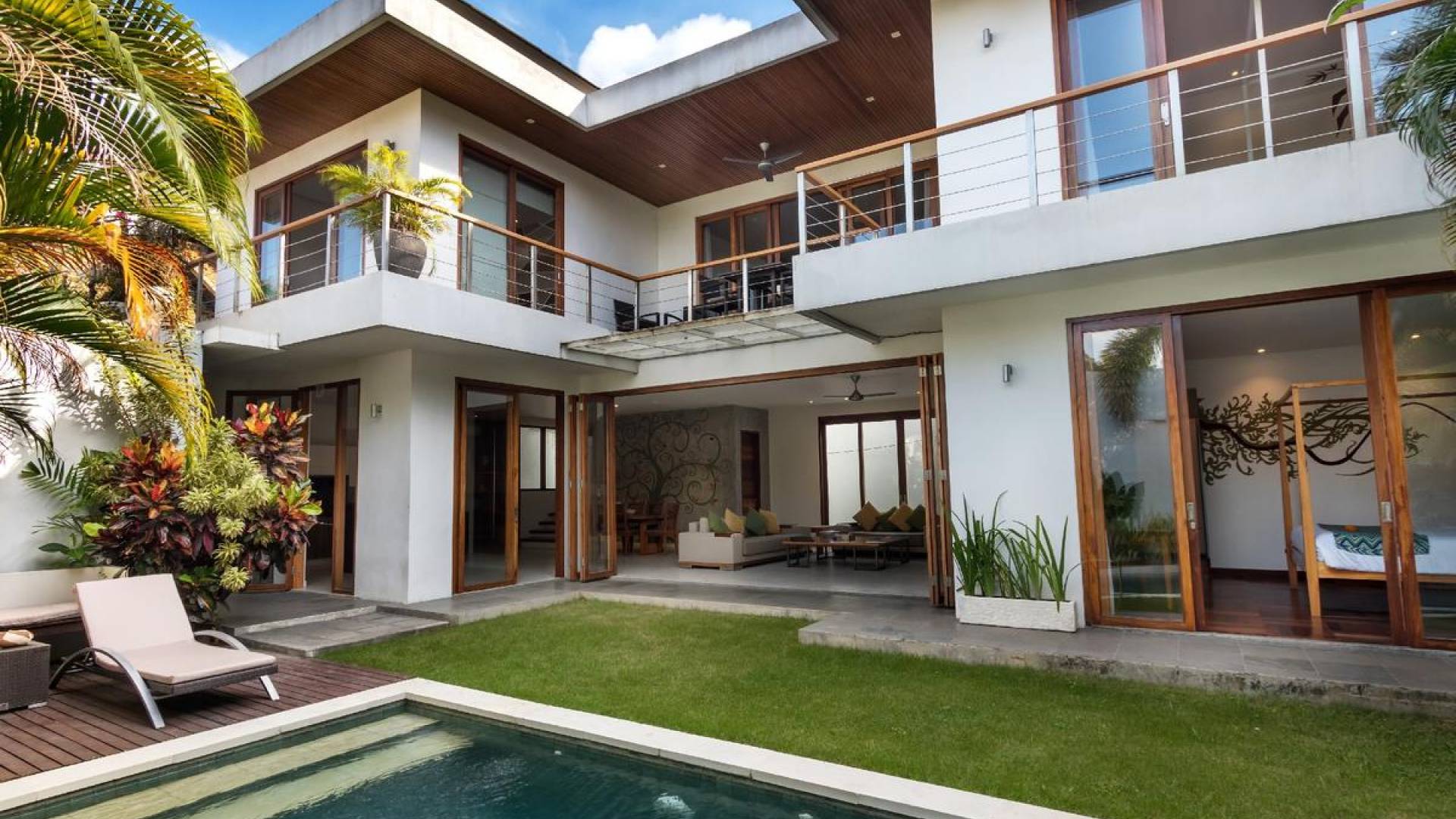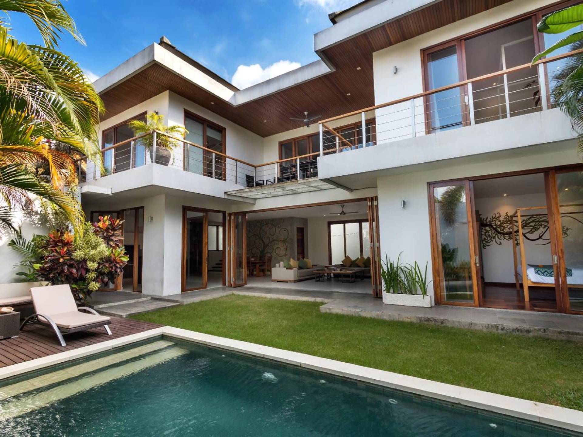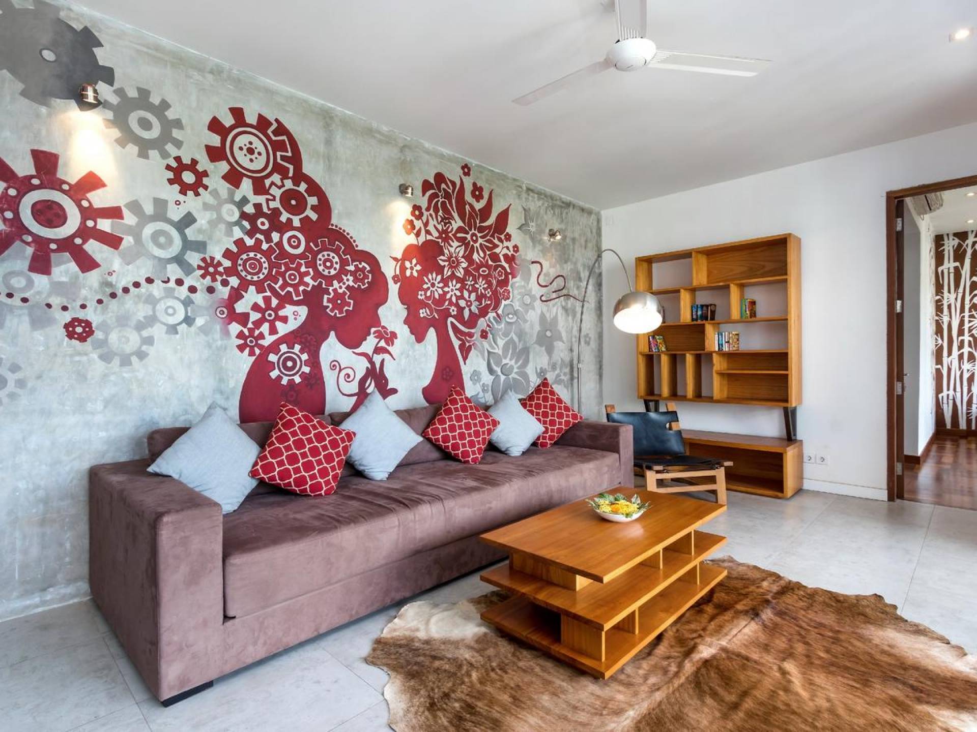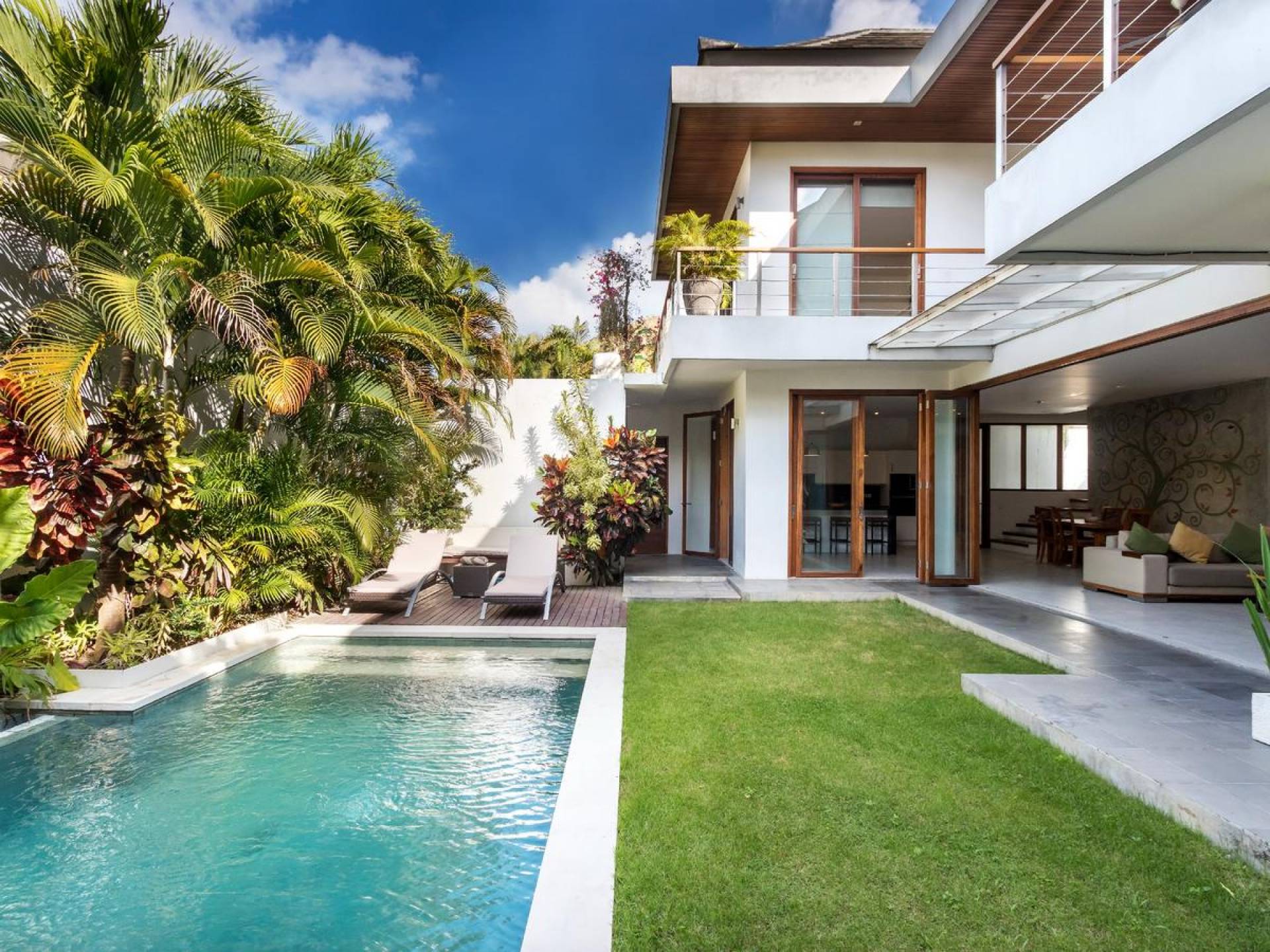 Villa Casa Cinta 1 Seminyak is a gorgeous 3-bedroom luxury villa, located just meters away from the beach in Batu Belig, a quiet area located strategically in between Seminyak and Canggu. The villa features a grand, modern, double-storey pavilion with a spacious, air-conditioned living room and three comfy villa suites. The most striking thing about Villa Casa Cinta 1 are the beautiful wall paintings made by Italian artists. They are handmade, unique and they give this villa character a unique character.