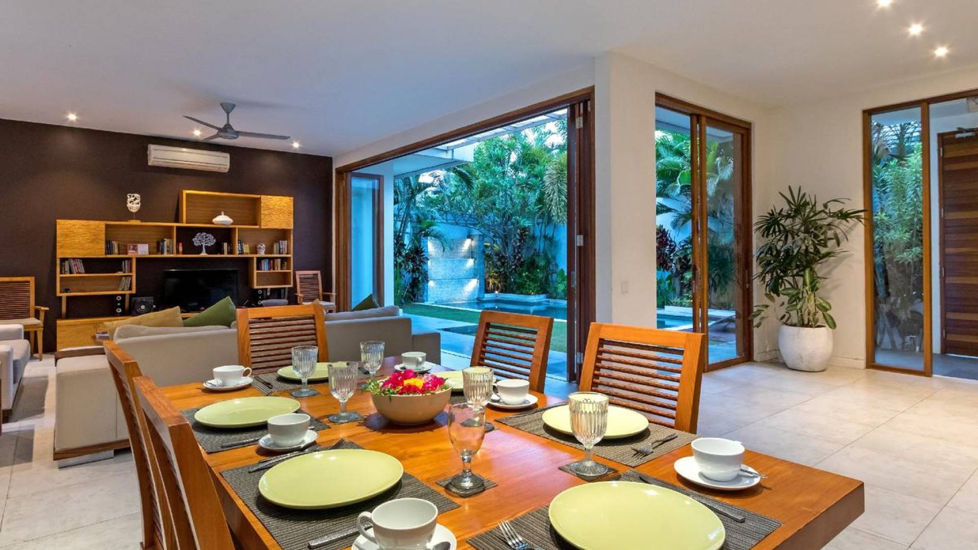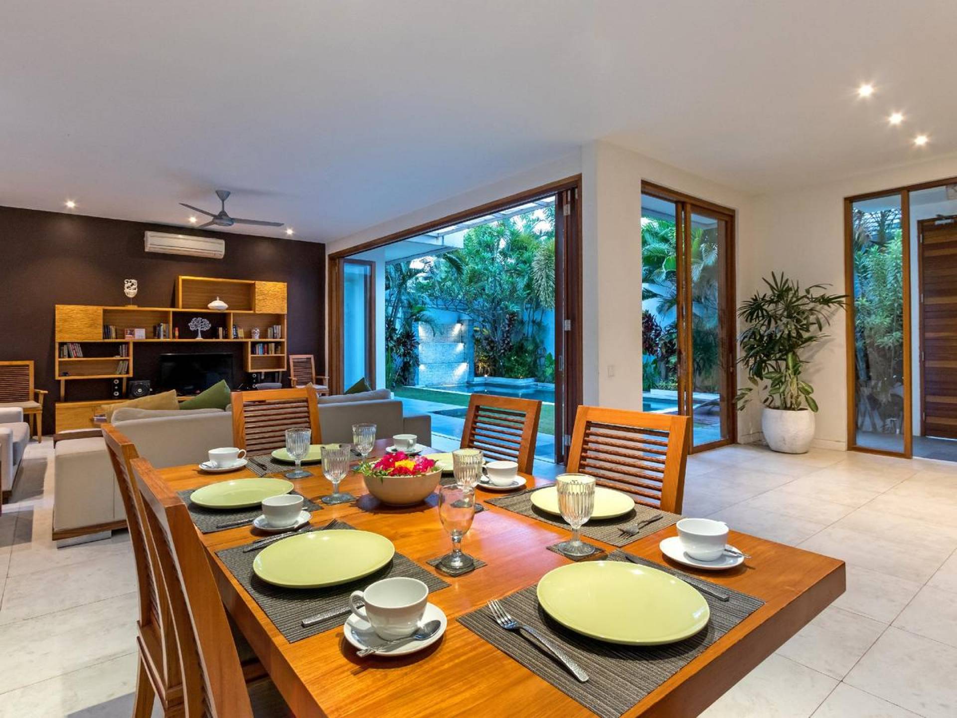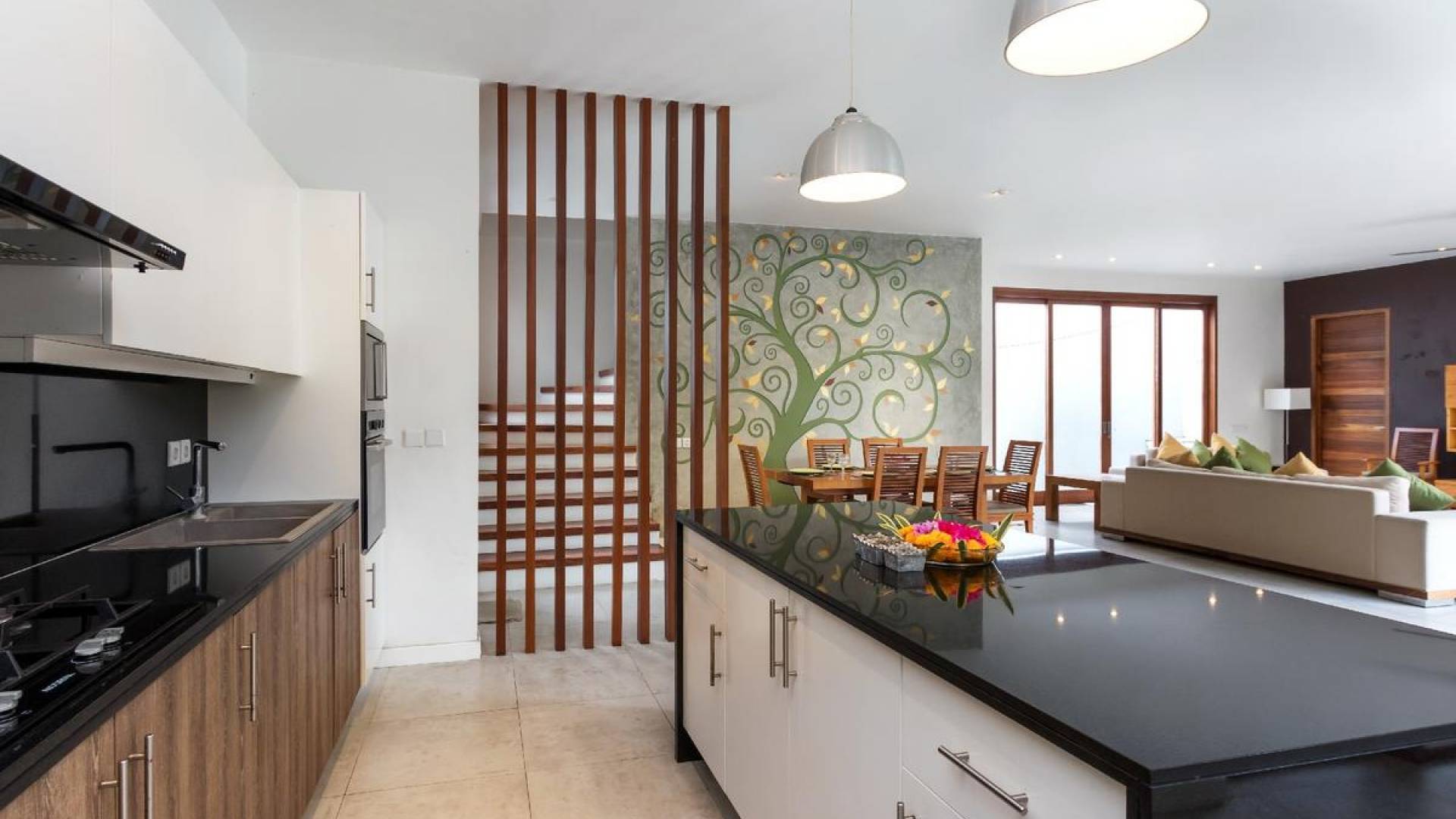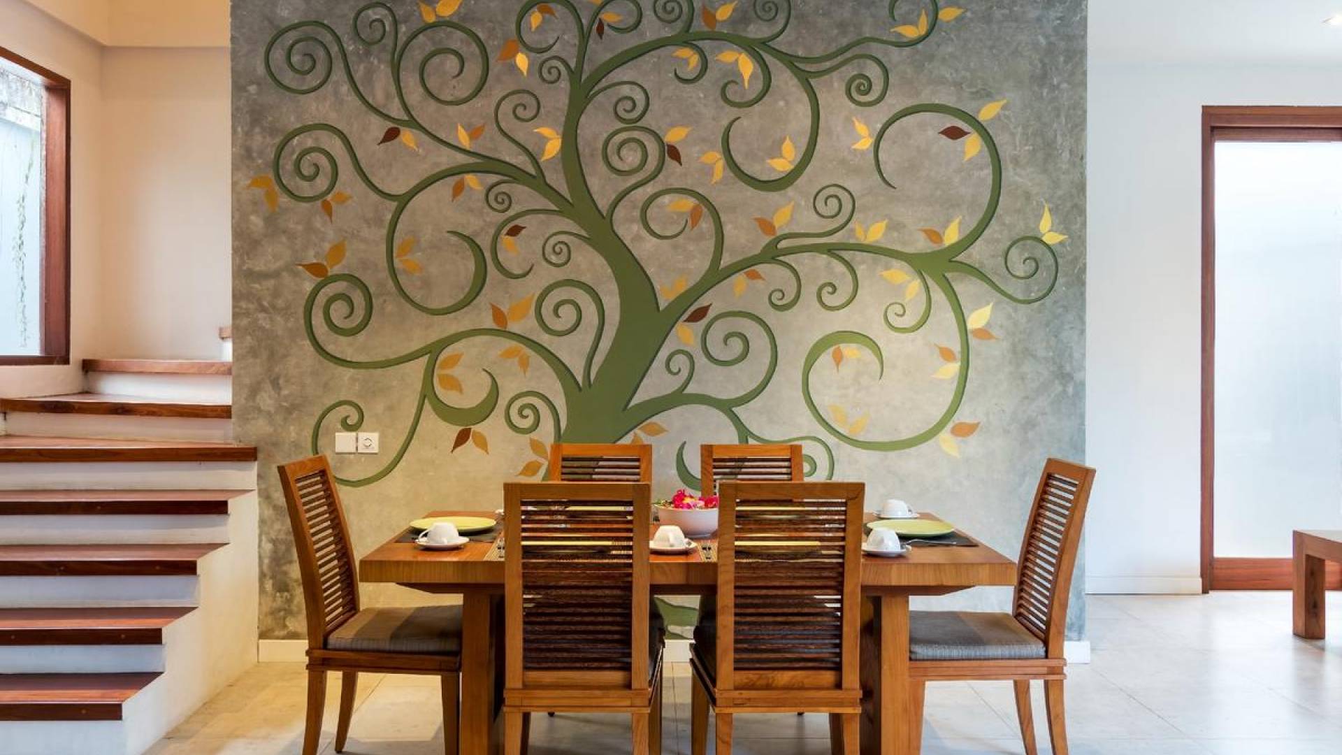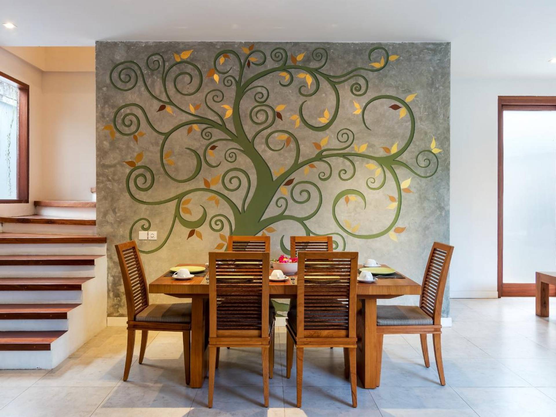 Next door, you will find Villa Casa Cinta 2 - the 3-bedroom twin sister of Casa Cinta 1 and they can be rented out together for larger traveling groups. The interior design is of Villa Casa Cinta 1 is chic and contemporary. There is a lounge/entertainment corner, a dining area, and a well-equipped state-of-the-art kitchen. From the comfy cushioned sofas, you can sit back to enjoy the garden view (in air-conditioned comfort that is!), or you can watch movies on the flat-screen cable TV with 60 international channels. A stack of DVDs and board games are provided for endless family fun. The timber dining table for 6 stands on an oriental carpet, next to a floor-to-ceiling mural painting of a tree.