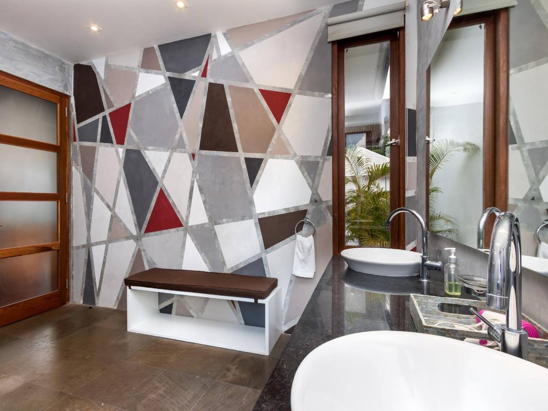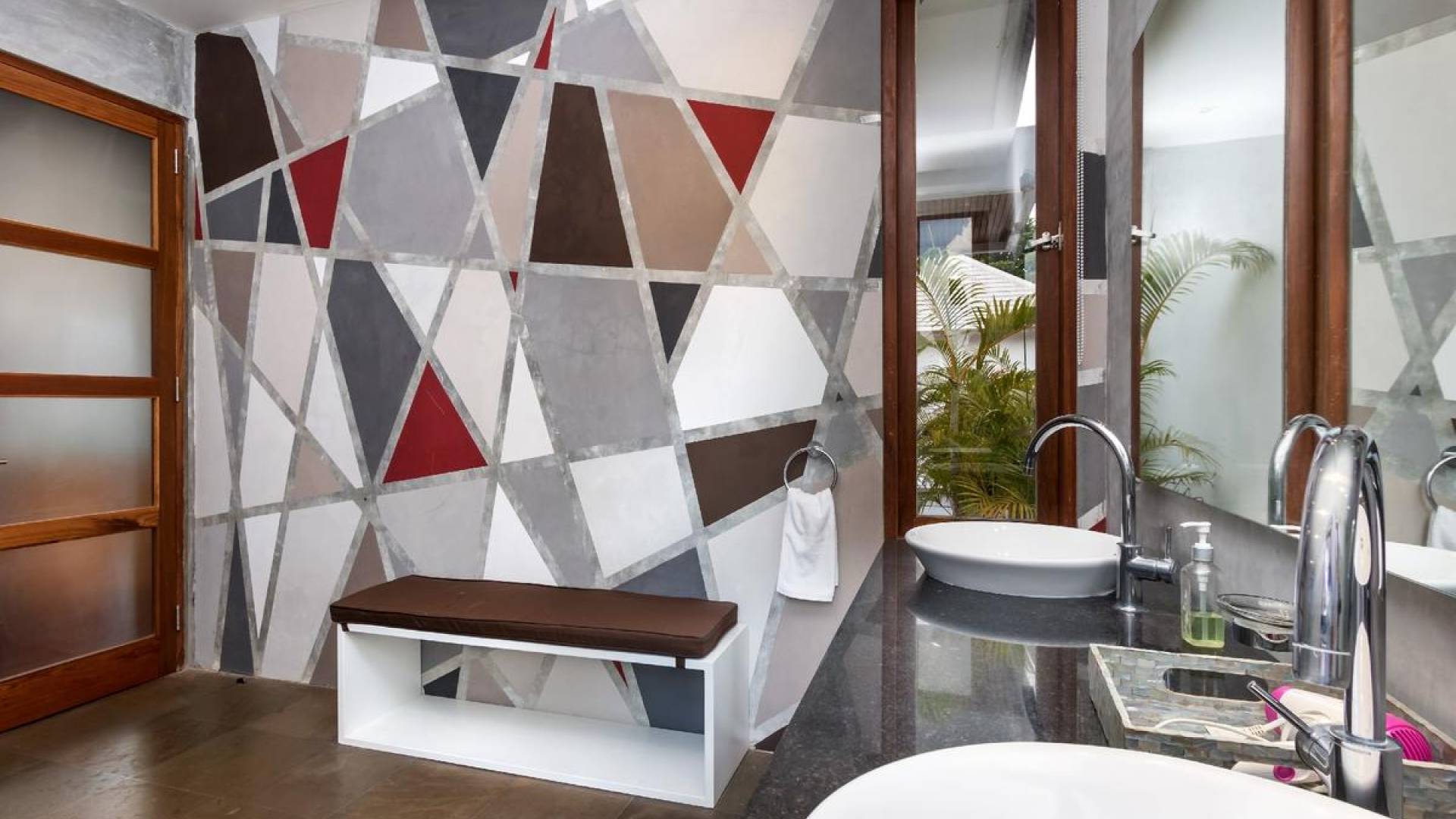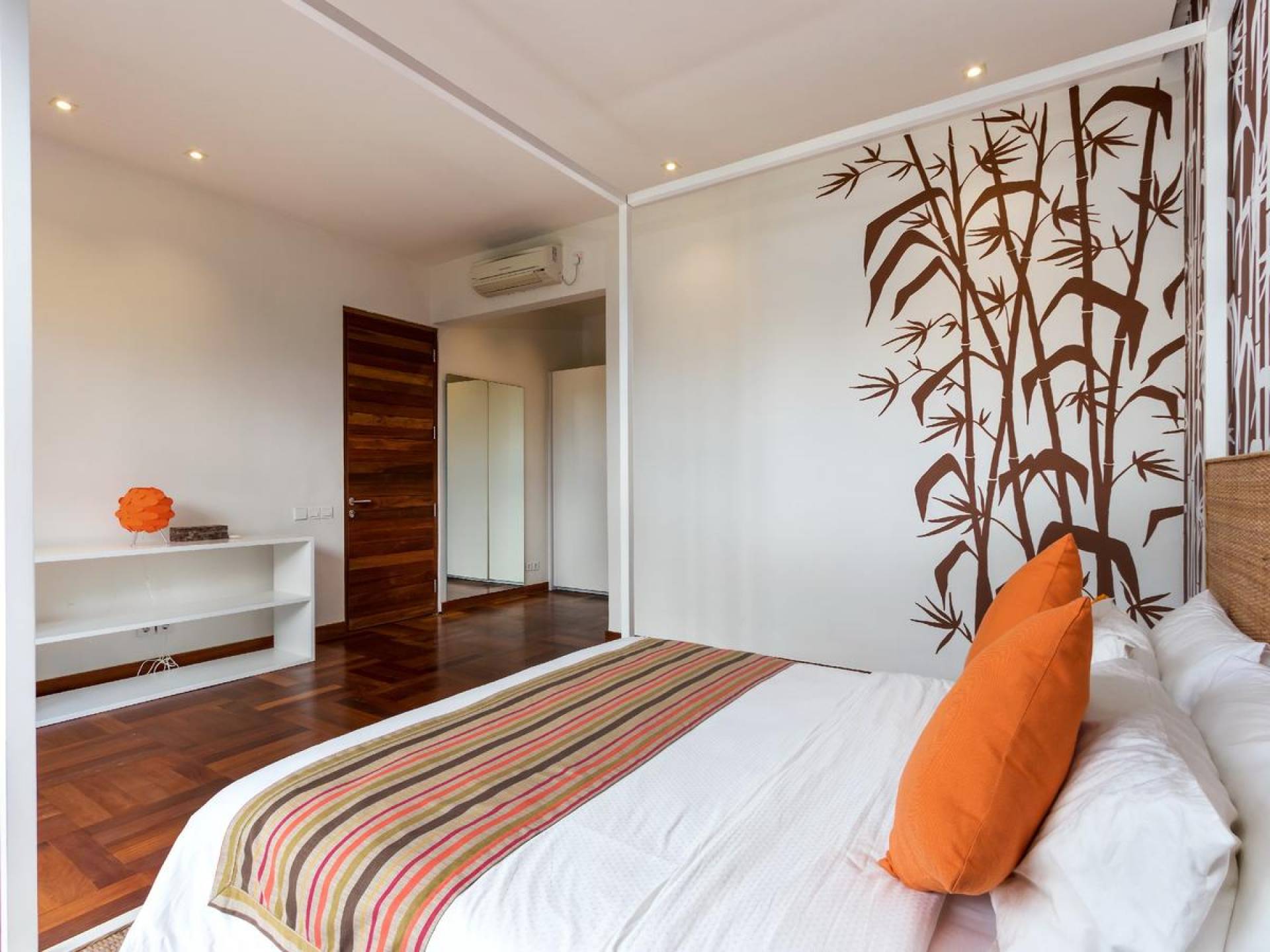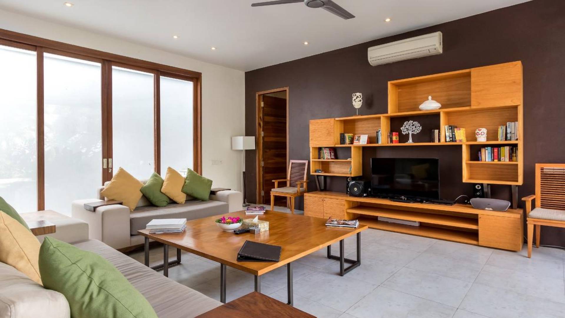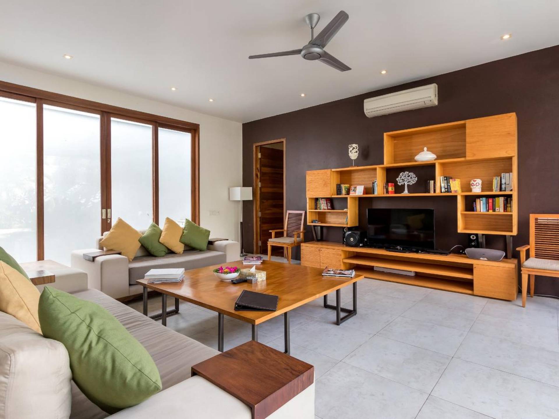 Next door, you will find Villa Casa Cinta 2 - the 3-bedroom twin sister of Casa Cinta 1 and they can be rented out together for larger traveling groups. The interior design is of Villa Casa Cinta 1 is chic and contemporary. There is a lounge/entertainment corner, a dining area, and a well-equipped state-of-the-art kitchen. From the comfy cushioned sofas, you can sit back to enjoy the garden view (in air-conditioned comfort that is!), or you can watch movies on the flat-screen cable TV with 60 international channels. A stack of DVDs and board games are provided for endless family fun. The timber dining table for 6 stands on an oriental carpet, next to a floor-to-ceiling mural painting of a tree.